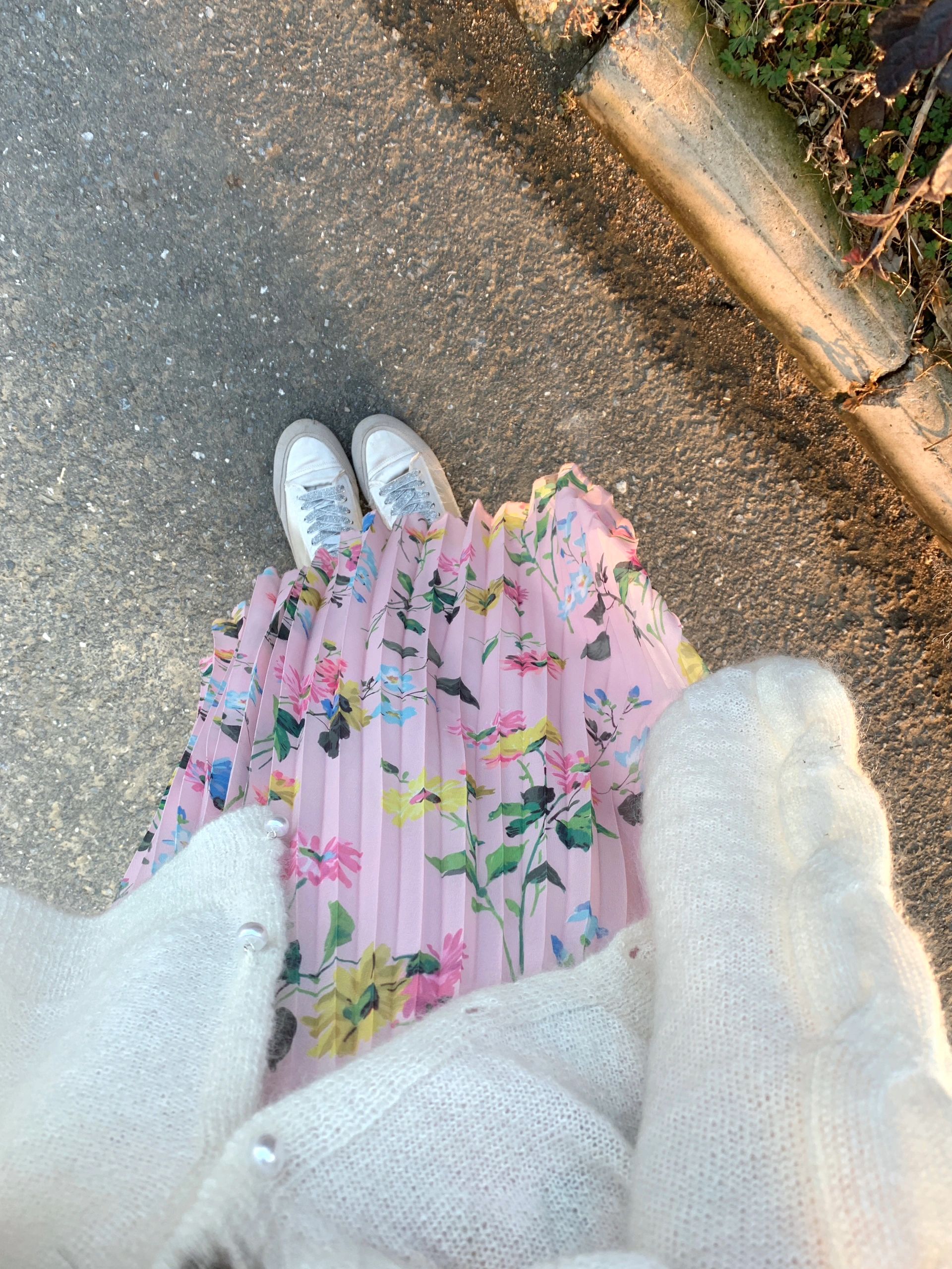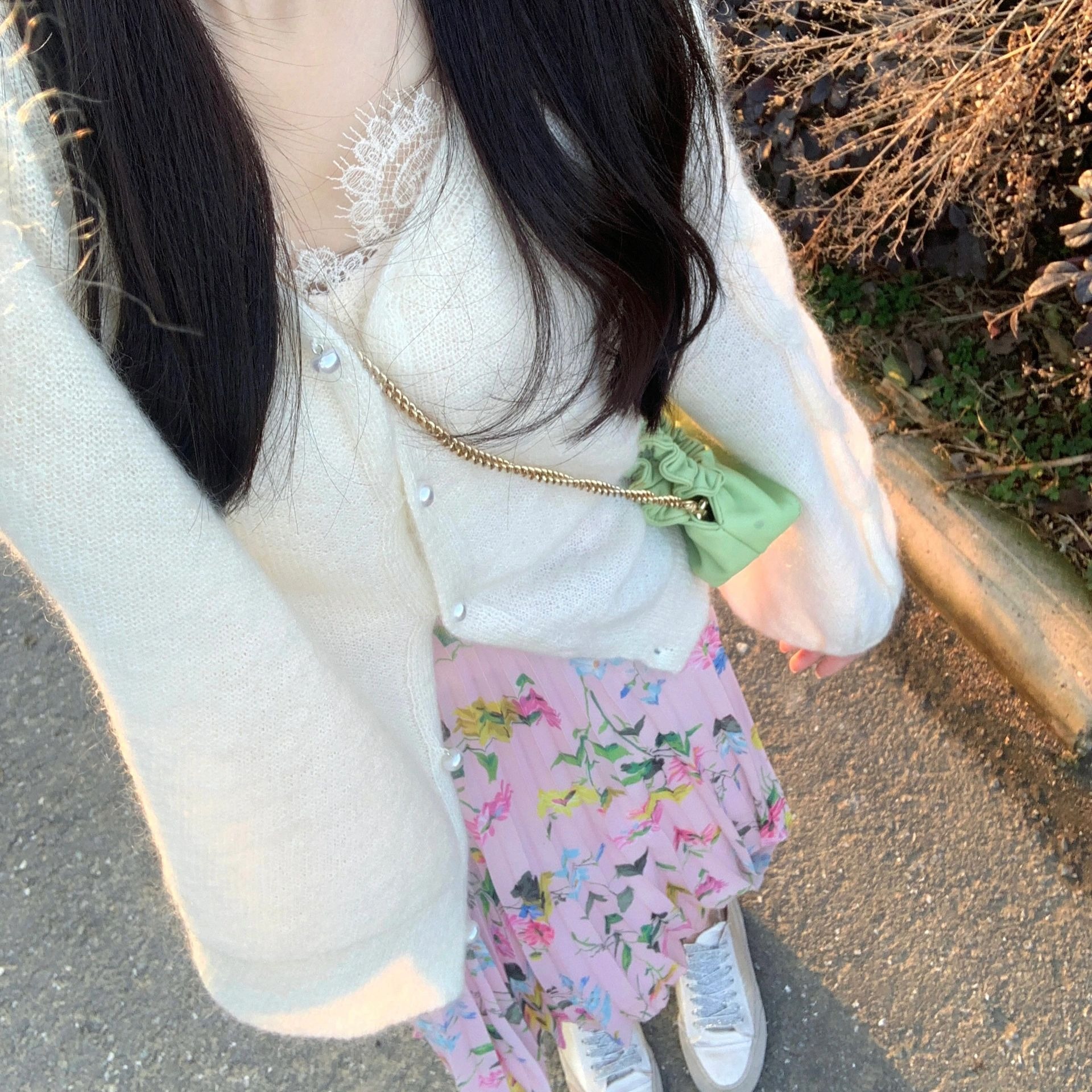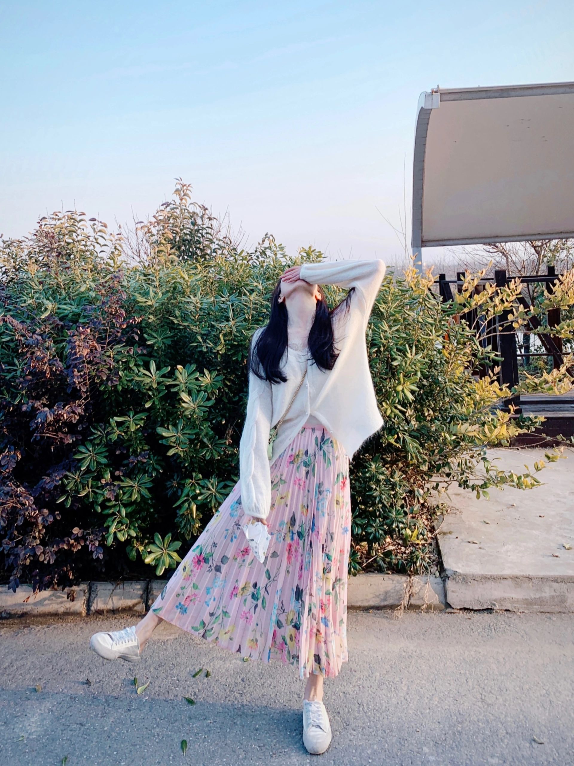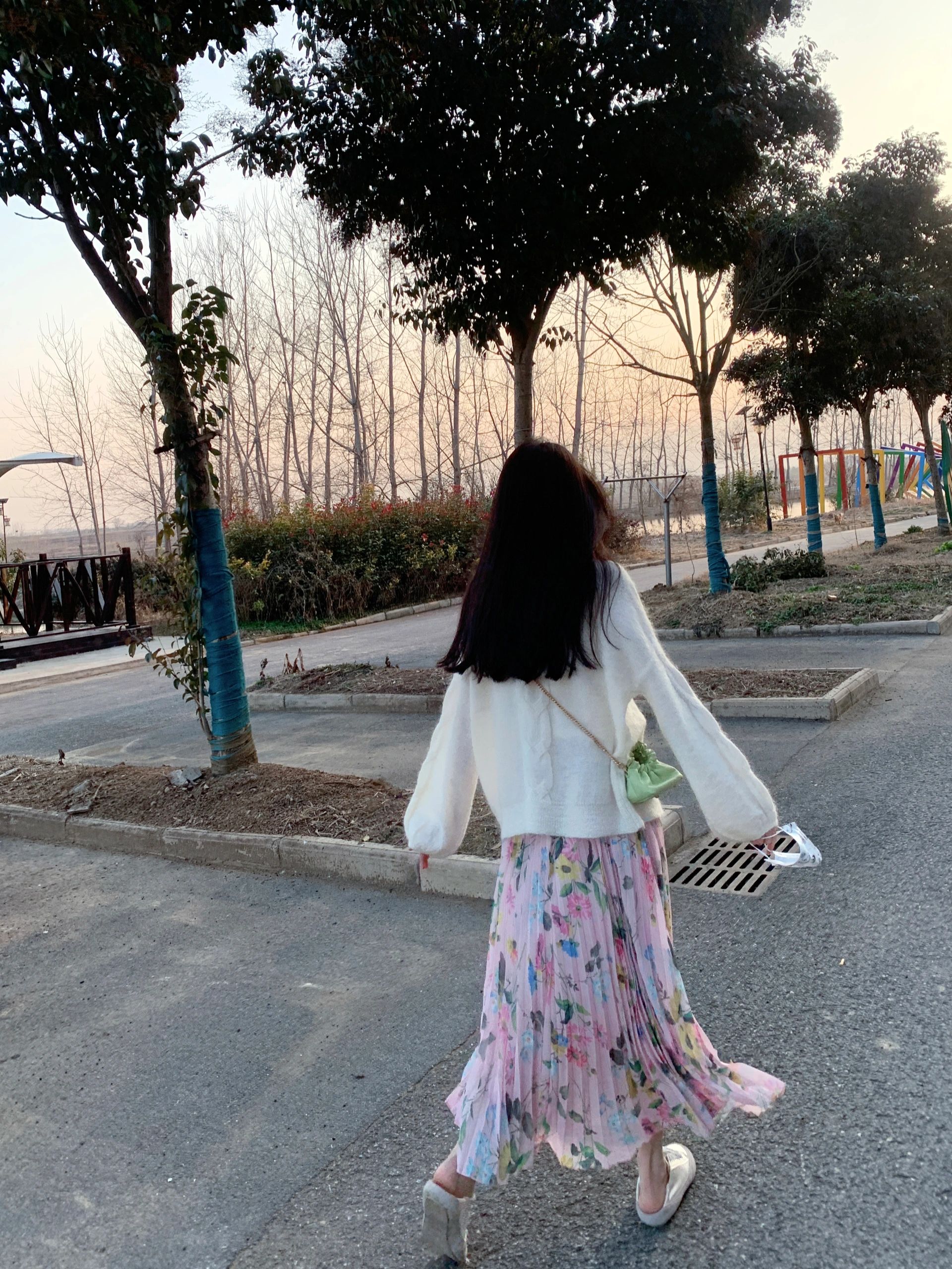 2025년 가을 트렌드는 아름다운 프랑스 스타일의 오프화이트 니트 탑과 플로럴 스커트로 구성된 투피스 세트를 선보입니다.