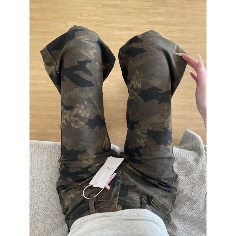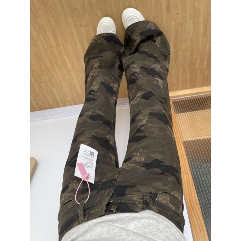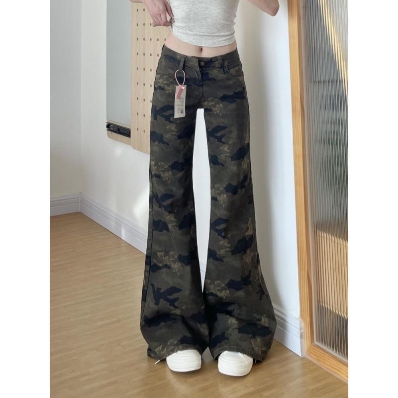 아담한 체형의 여성용 카무플라주 와이드 레그 플레어 진, 로우 웨이스트, 슬림핏, 루즈핏, 섹시한 스트레이트 레그 플레어 팬츠.