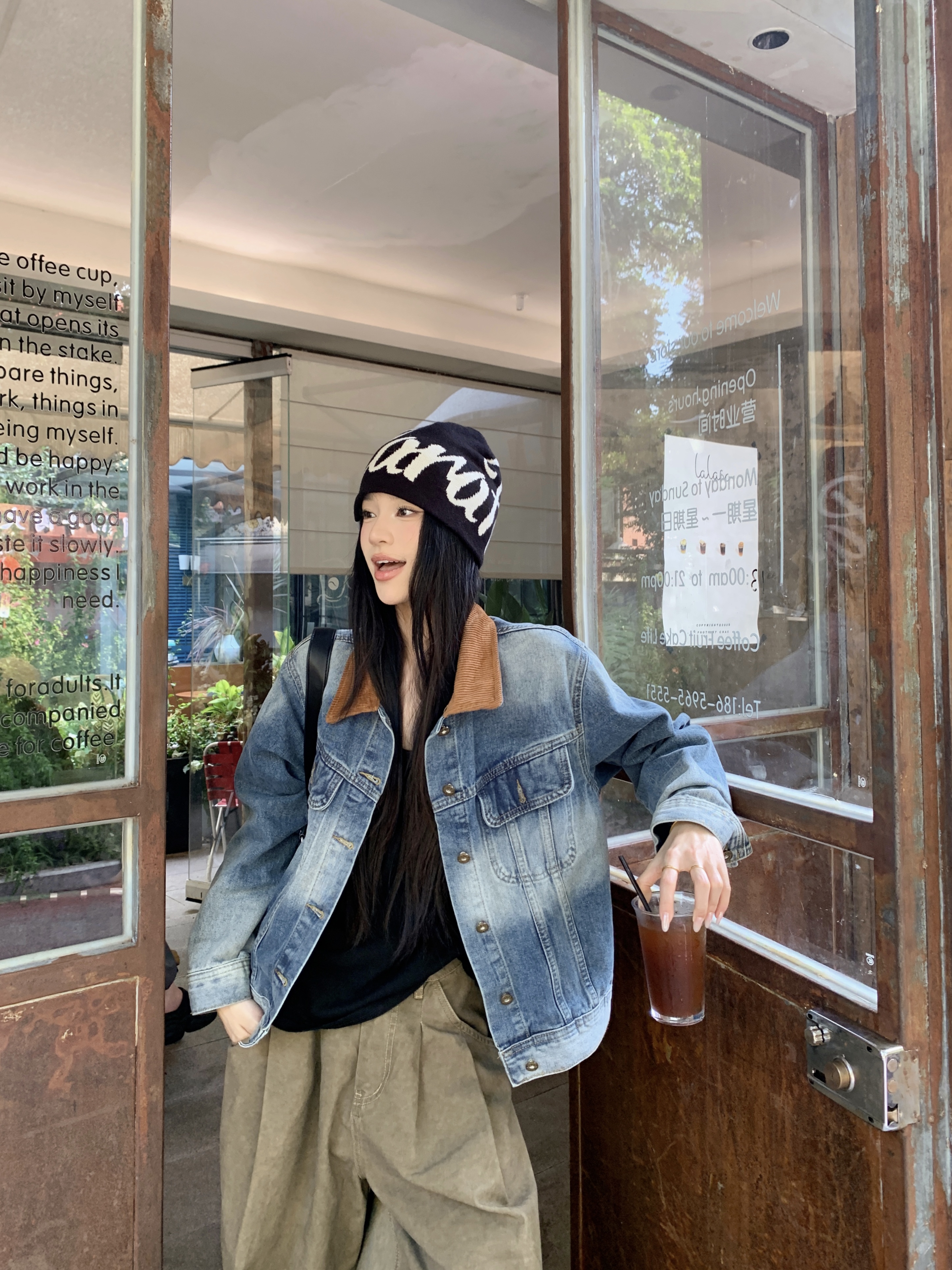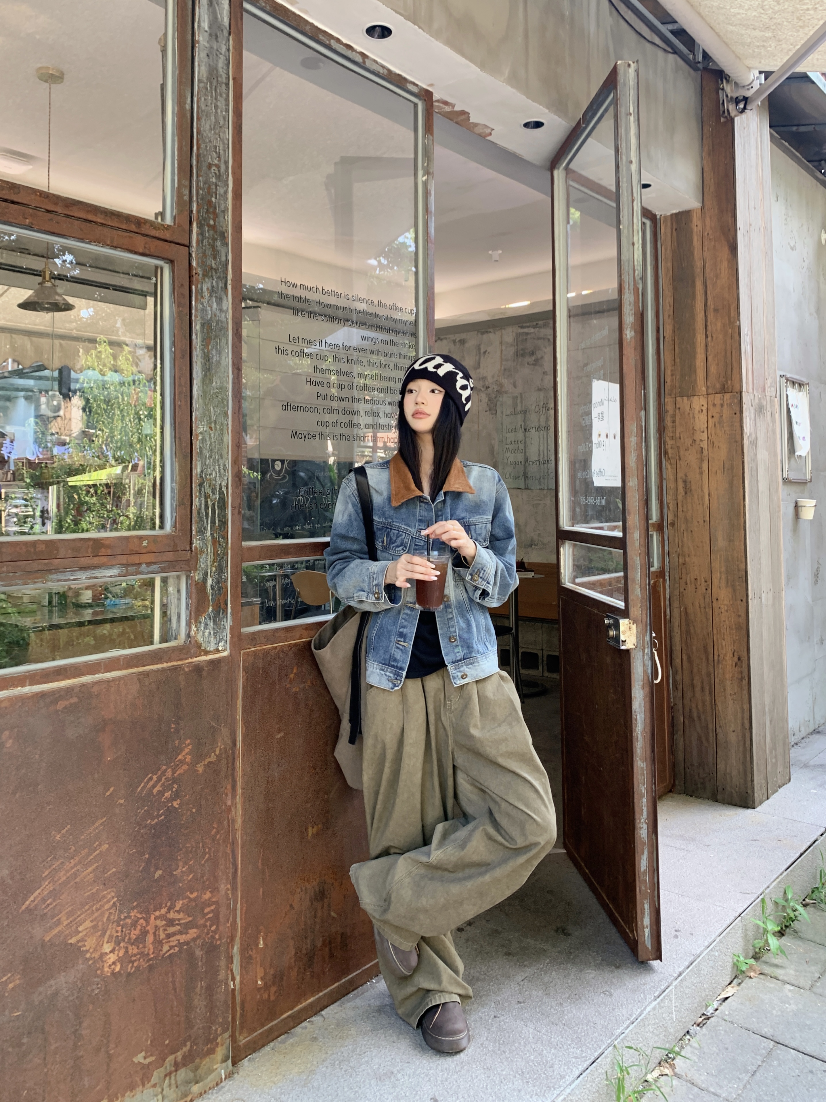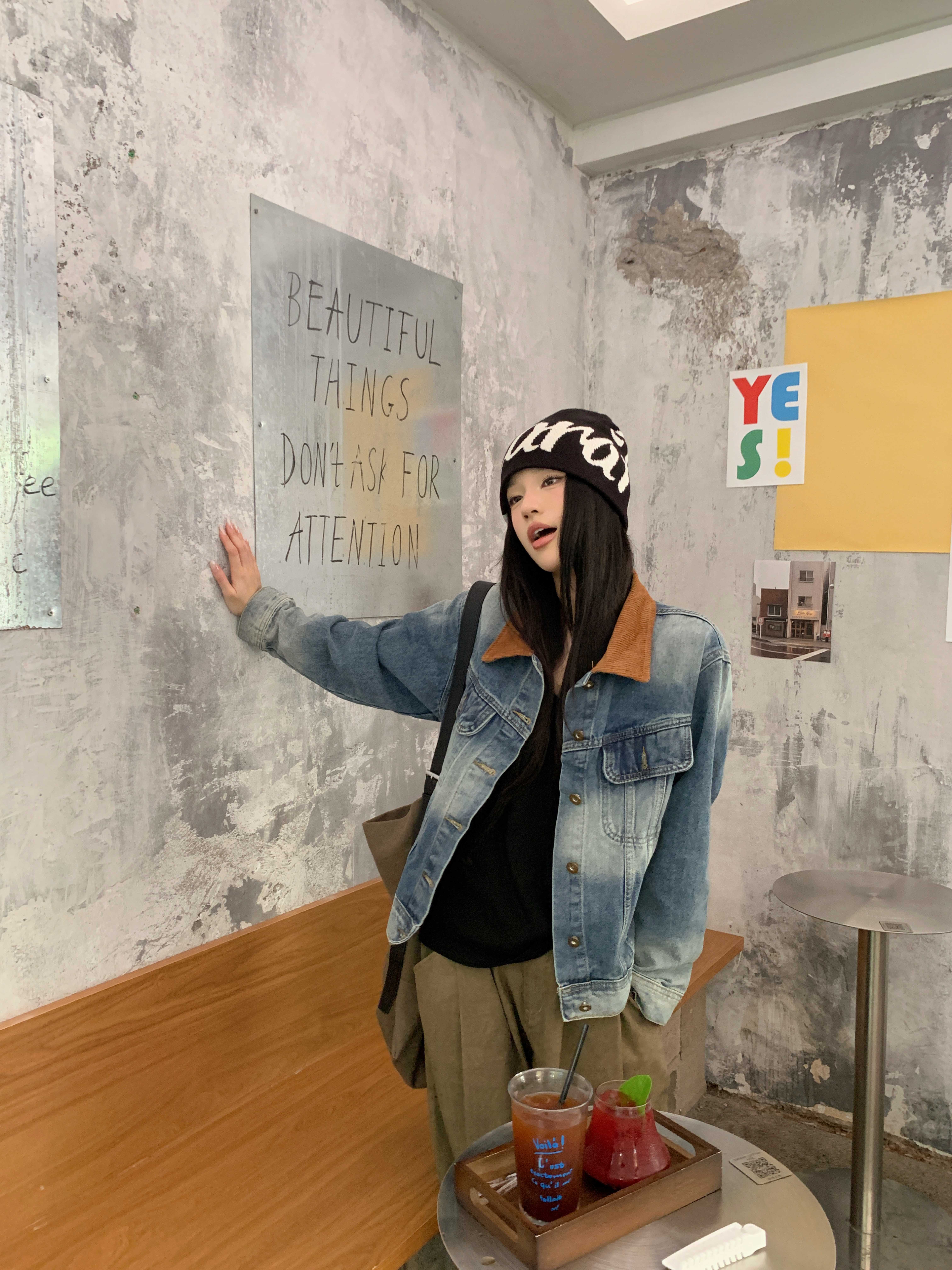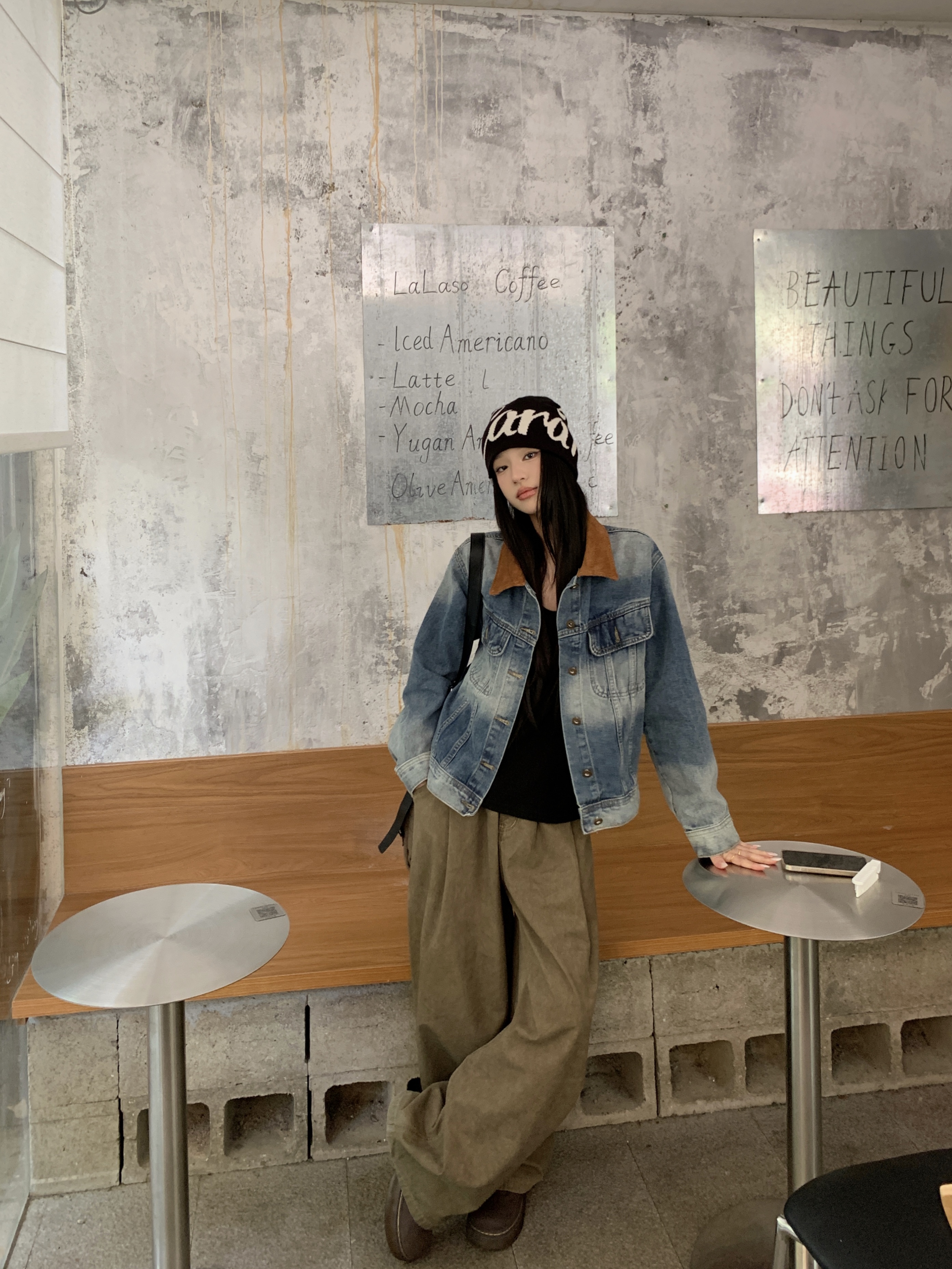 실제 사진: 레트로 스타일의 드롭 숄더 데님 재킷으로, 밝은 파란색 코듀로이 칼라가 특징이며, 스톰 라이더스(Storm Riders)를 오마주한 디자인입니다.