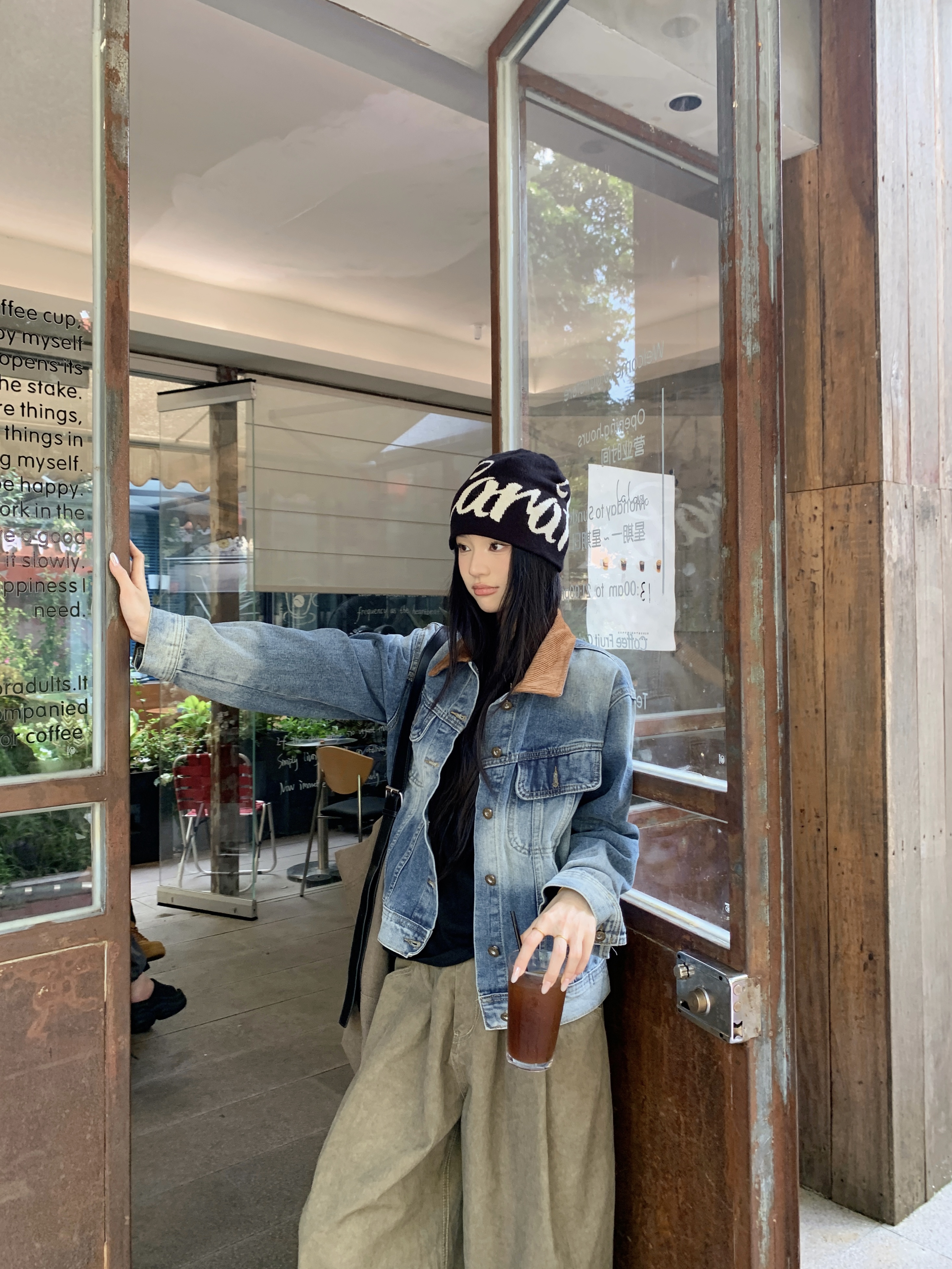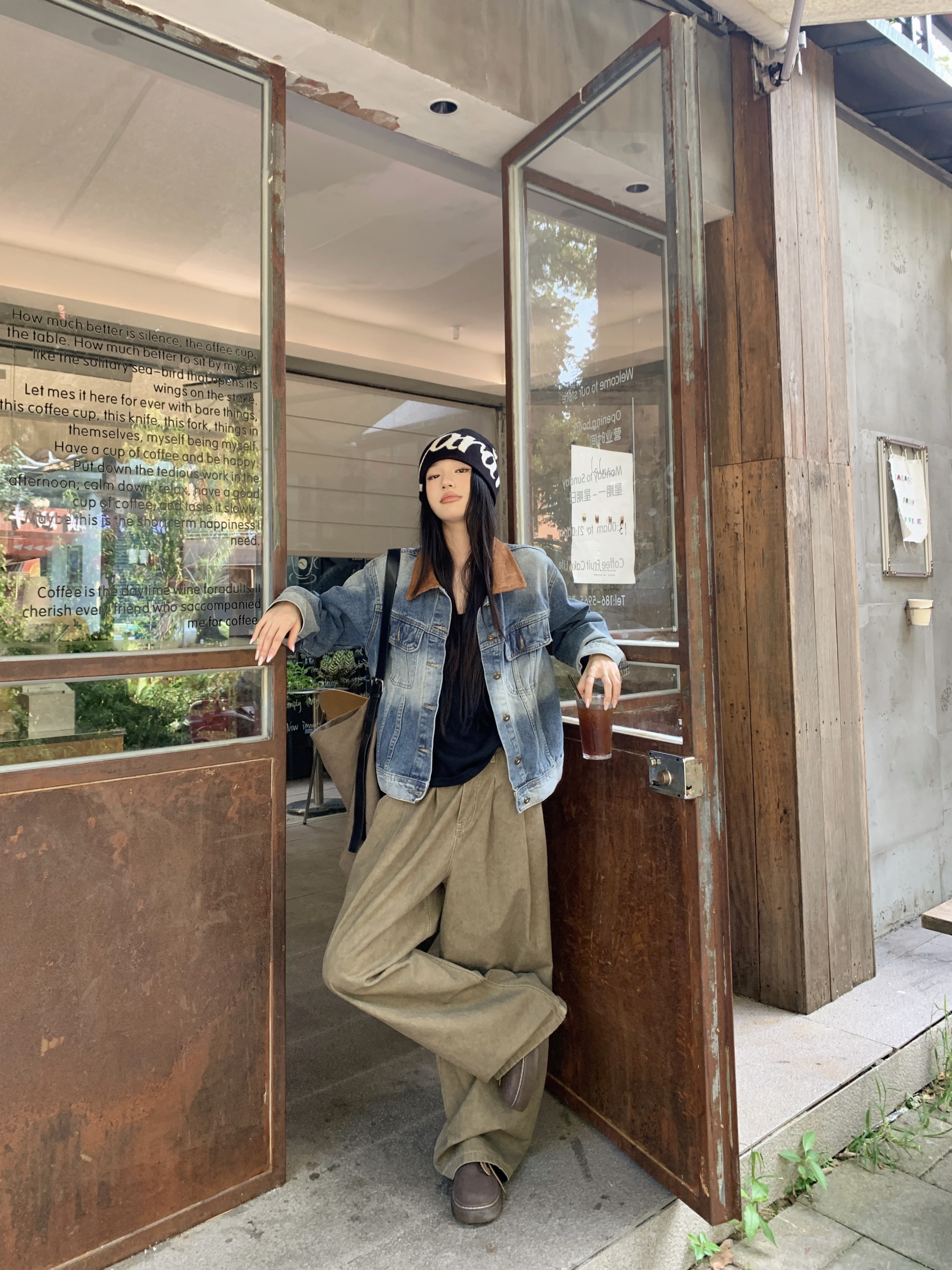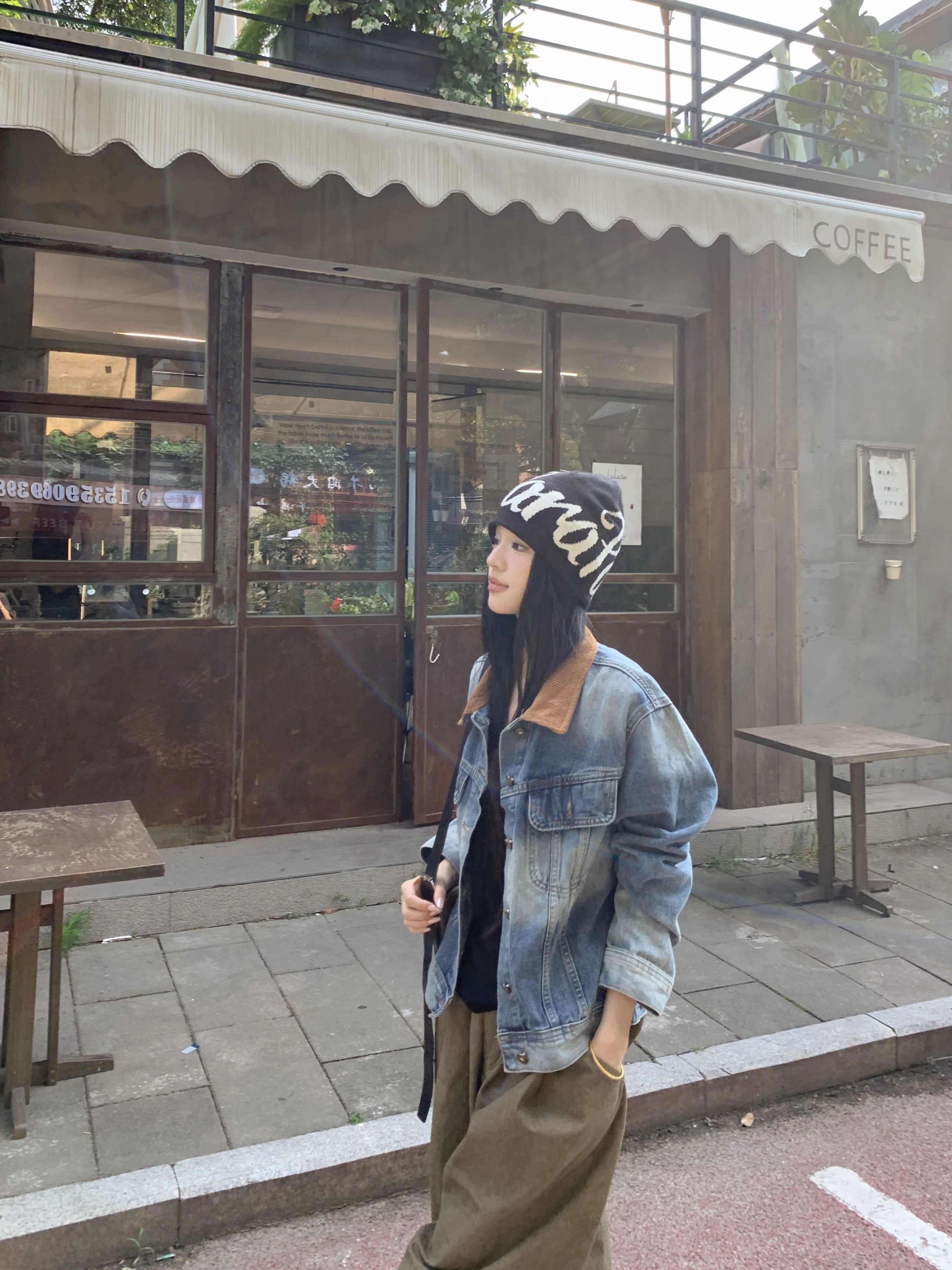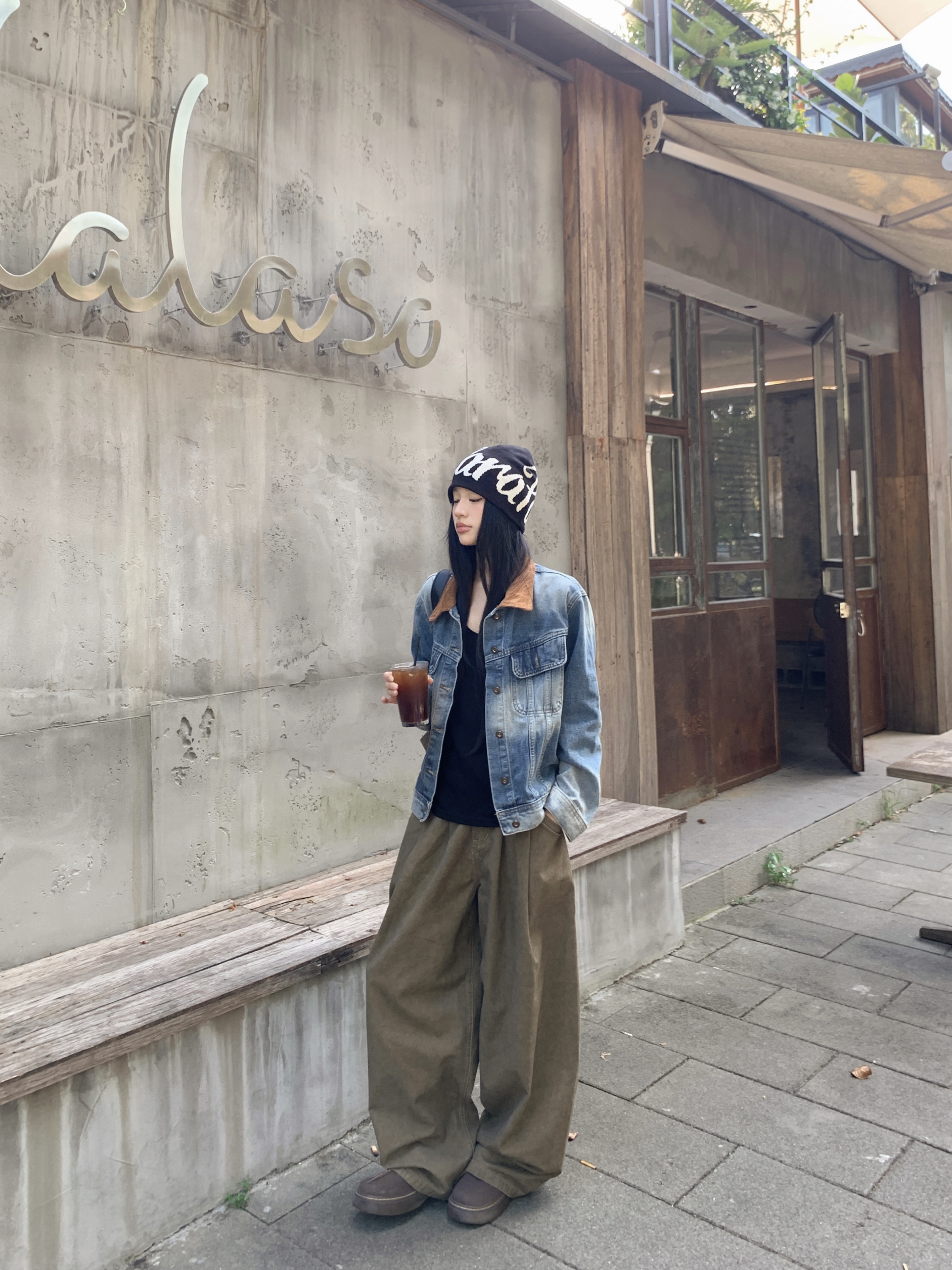 실제 사진: 레트로 스타일의 드롭 숄더 데님 재킷으로, 밝은 파란색 코듀로이 칼라가 특징이며, 스톰 라이더스(Storm Riders)를 오마주한 디자인입니다.