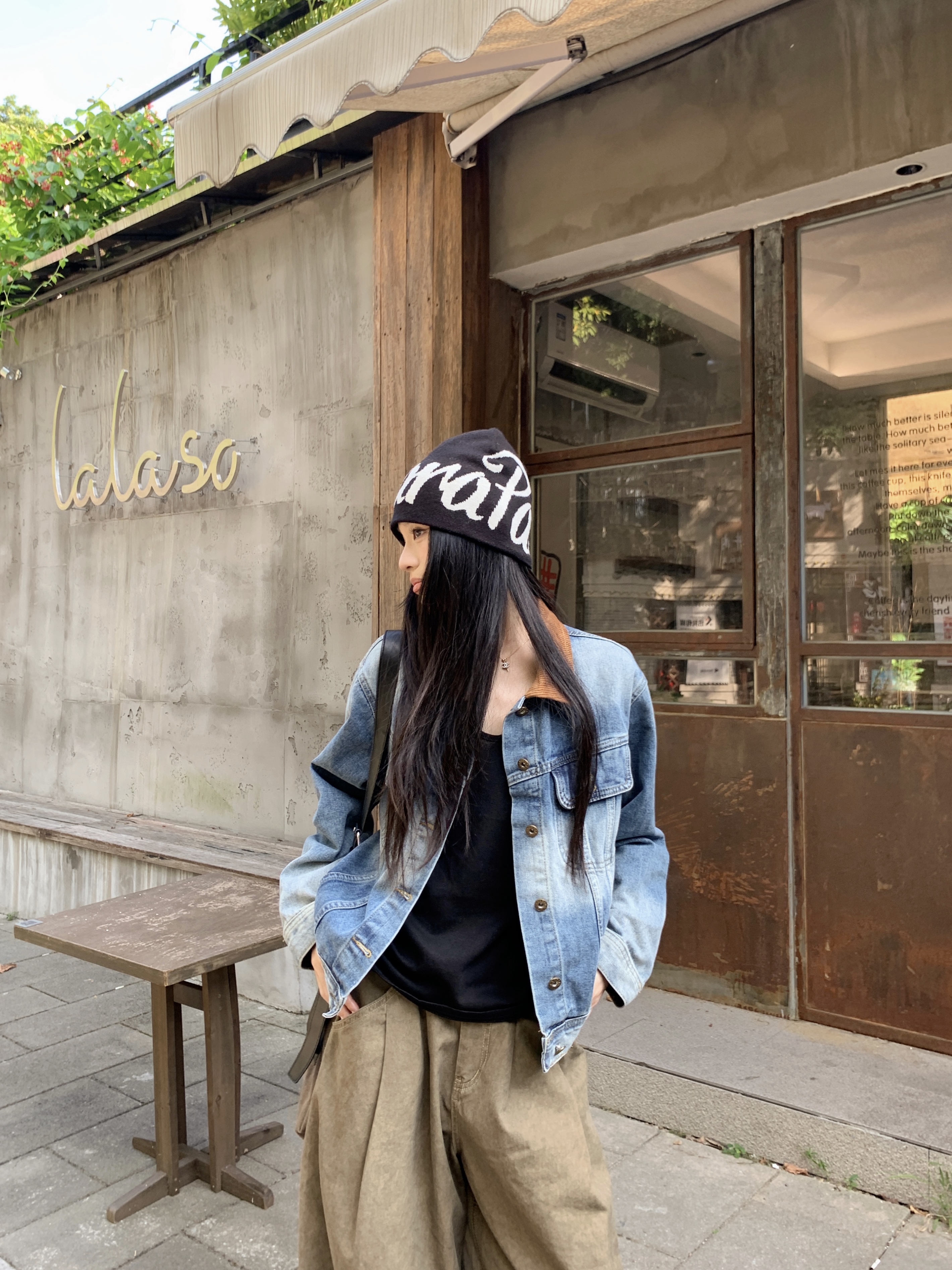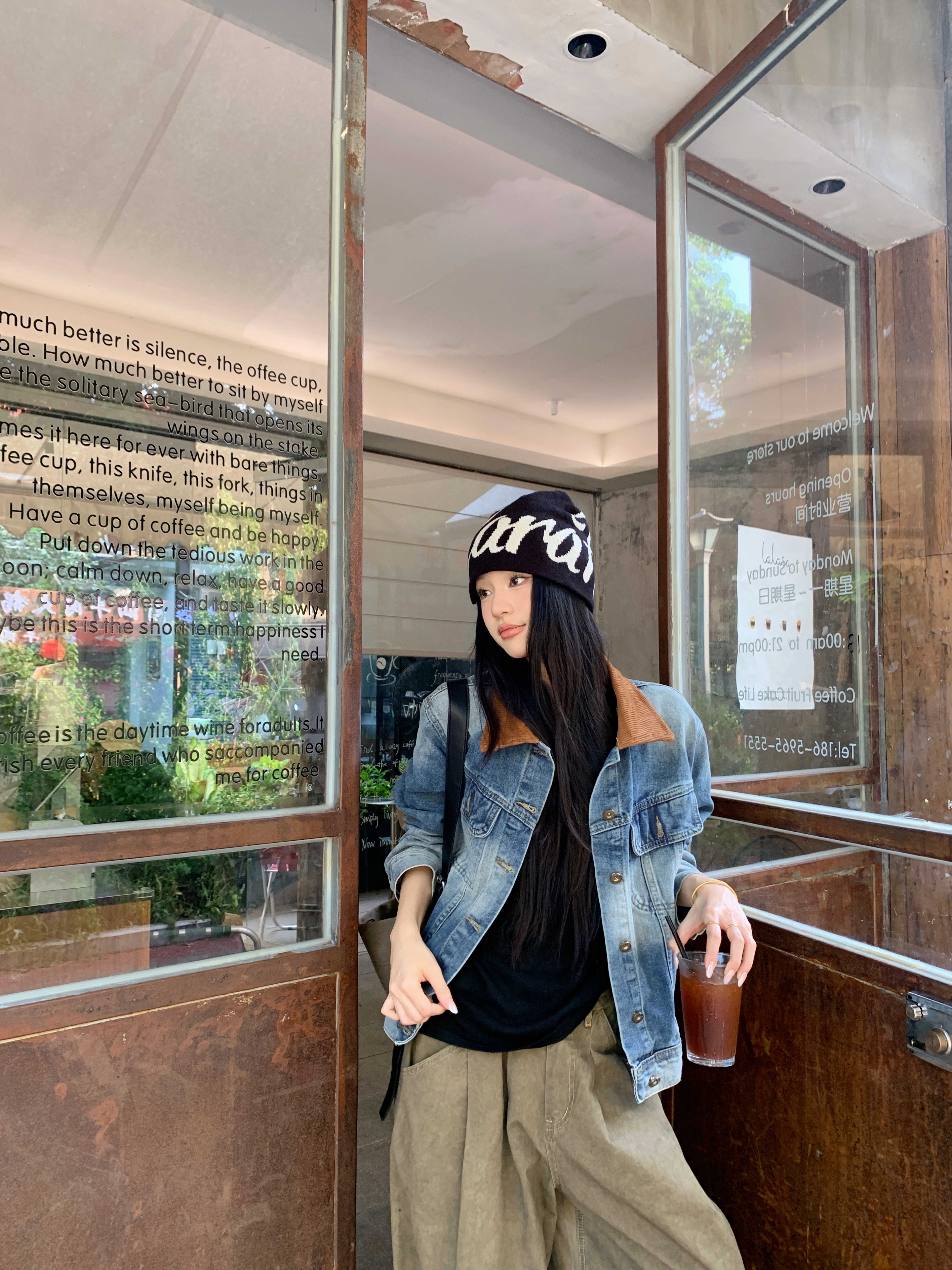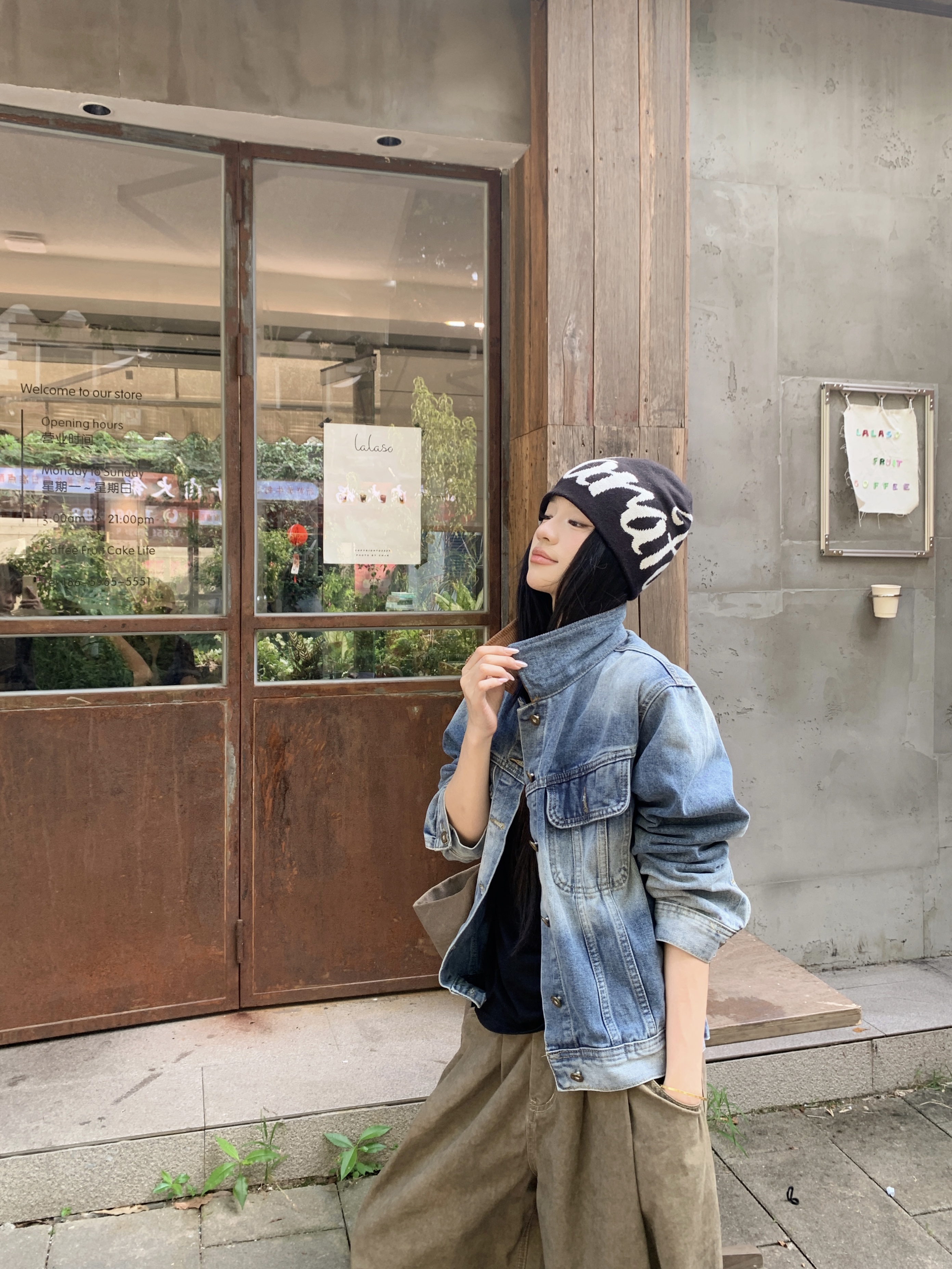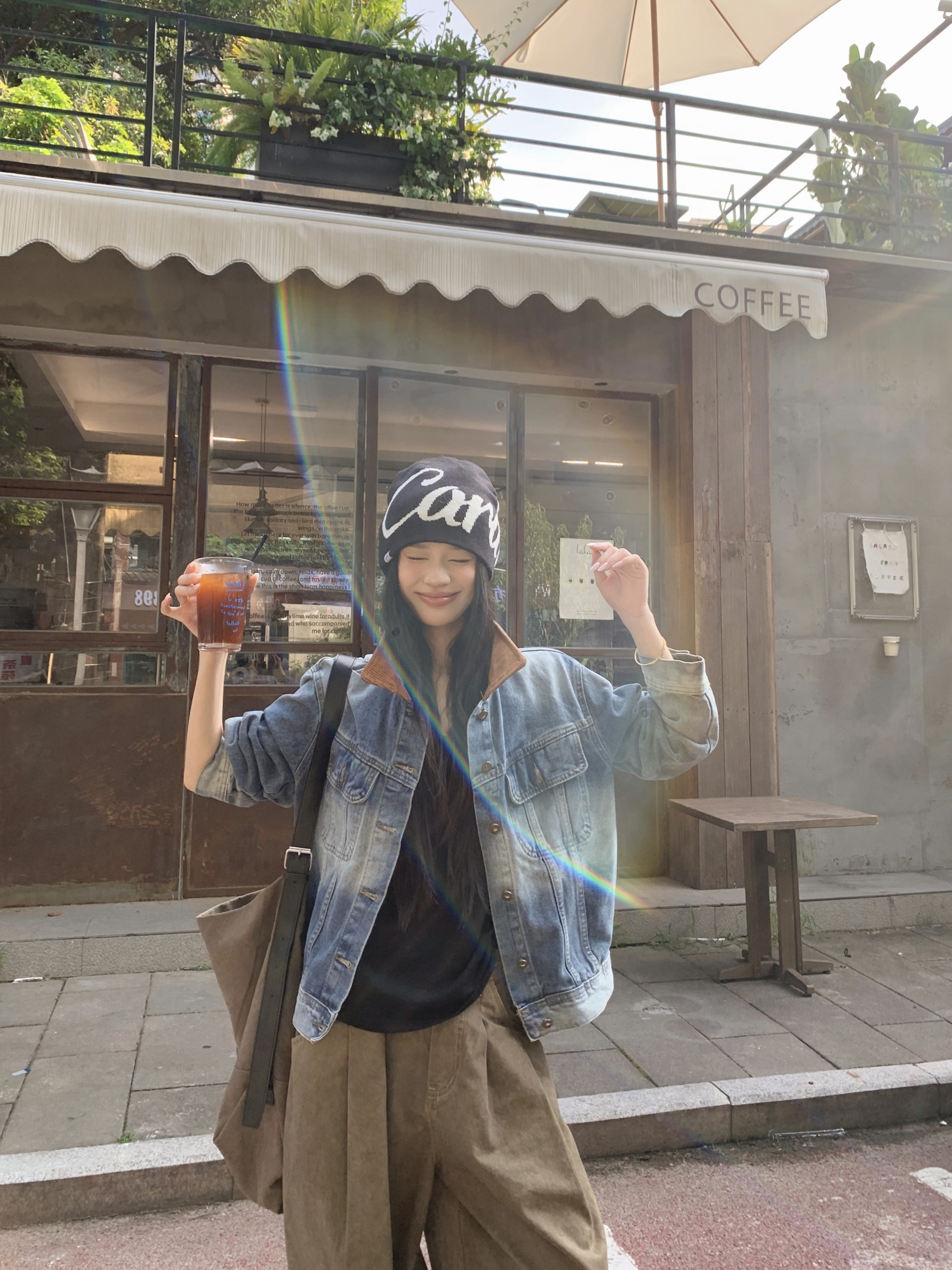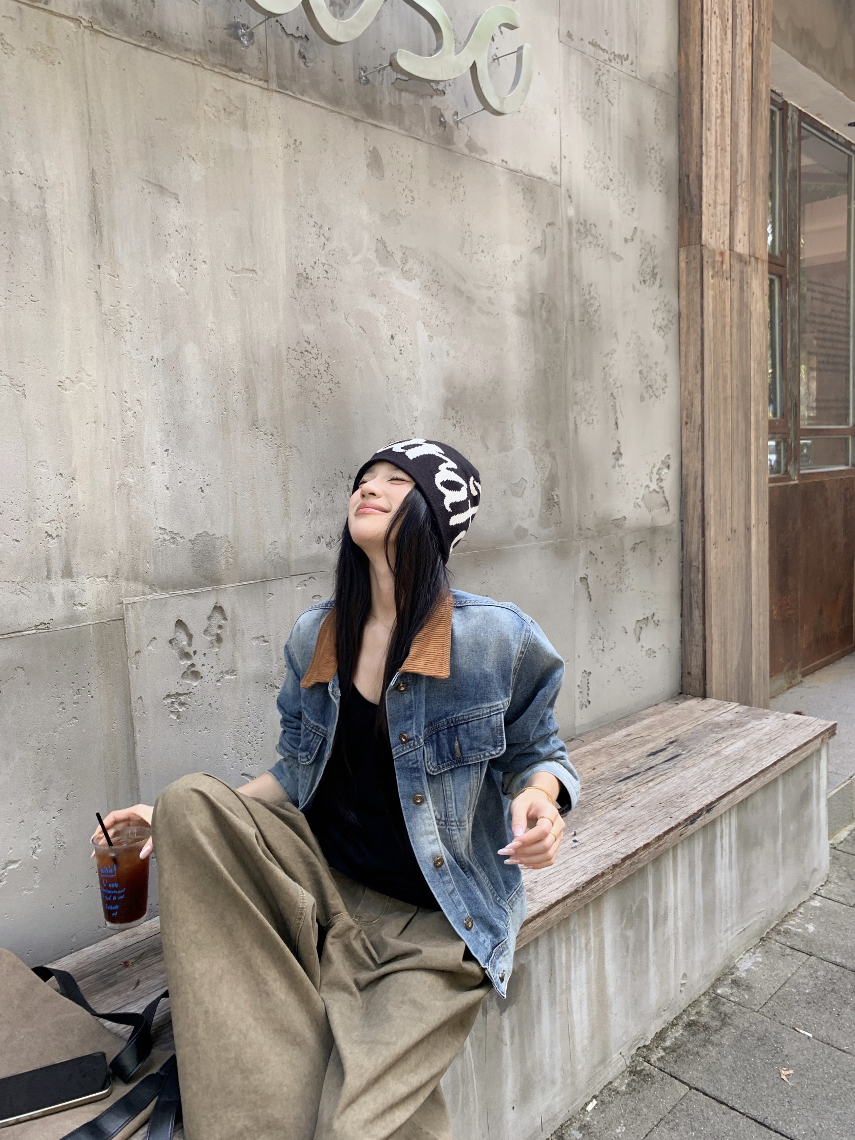 실제 사진: 레트로 스타일의 드롭 숄더 데님 재킷으로, 밝은 파란색 코듀로이 칼라가 특징이며, 스톰 라이더스(Storm Riders)를 오마주한 디자인입니다.