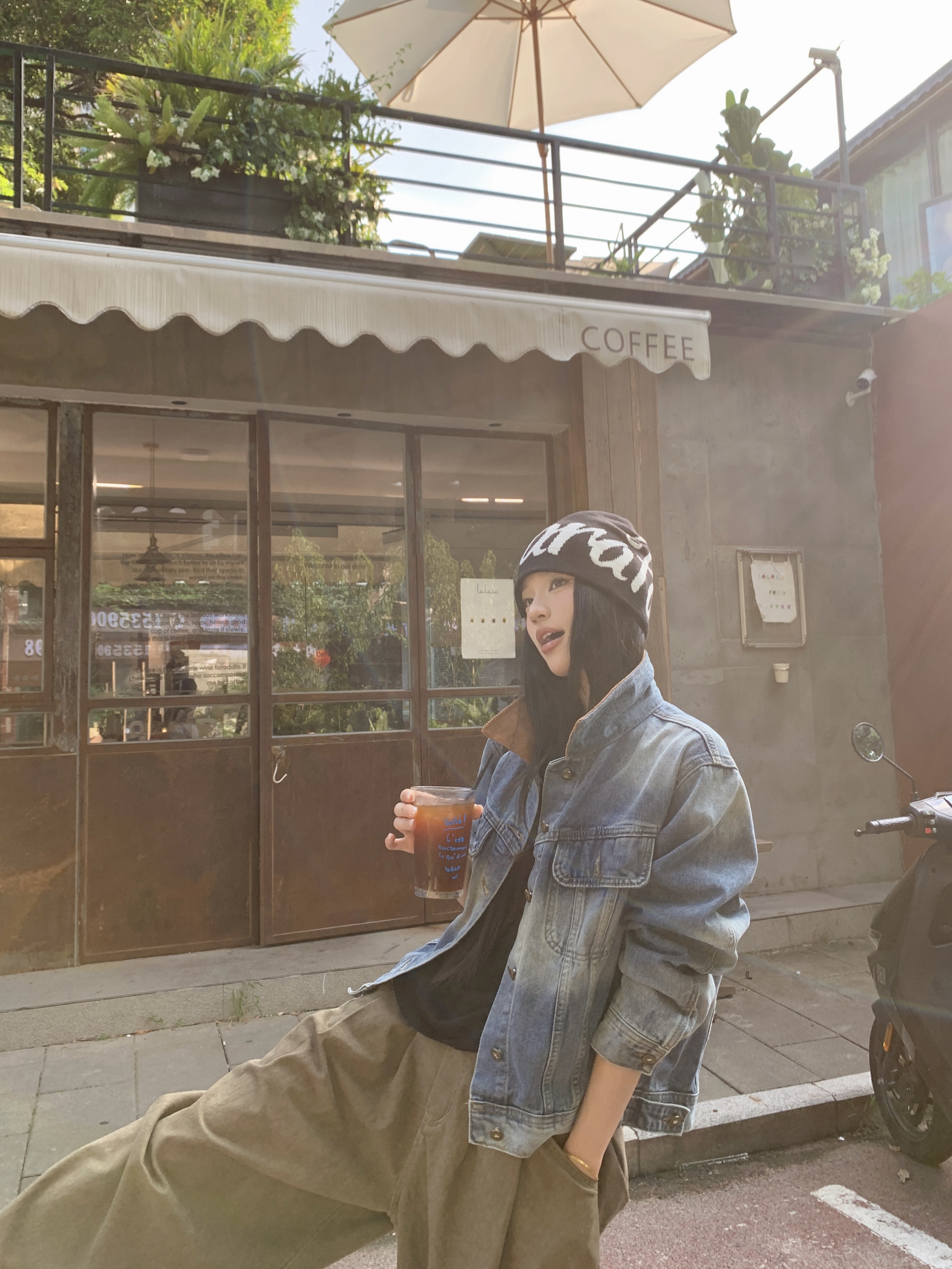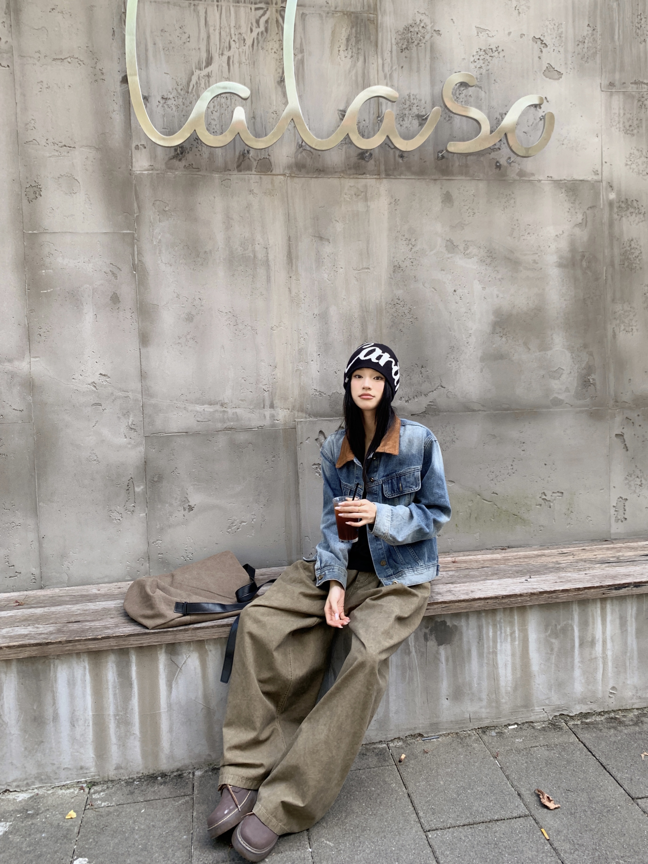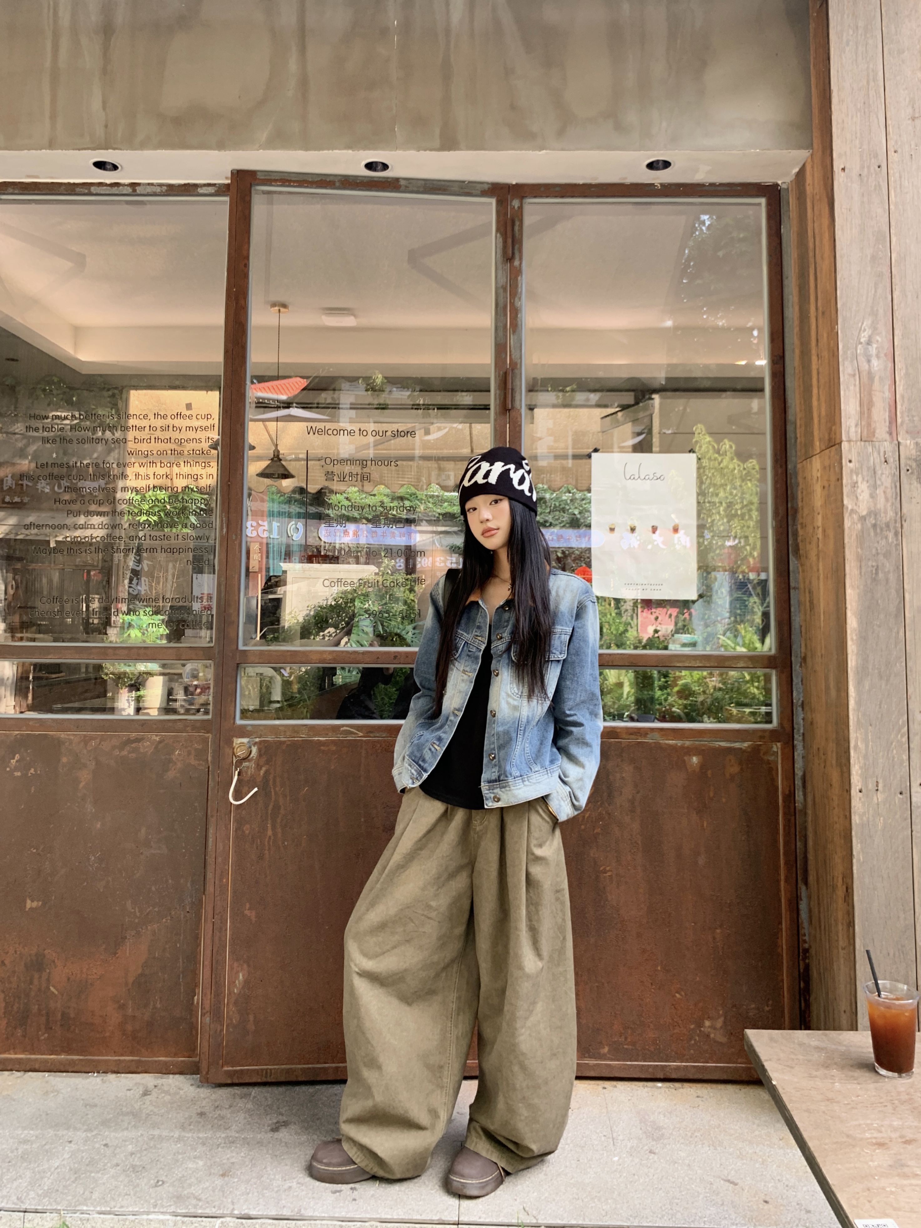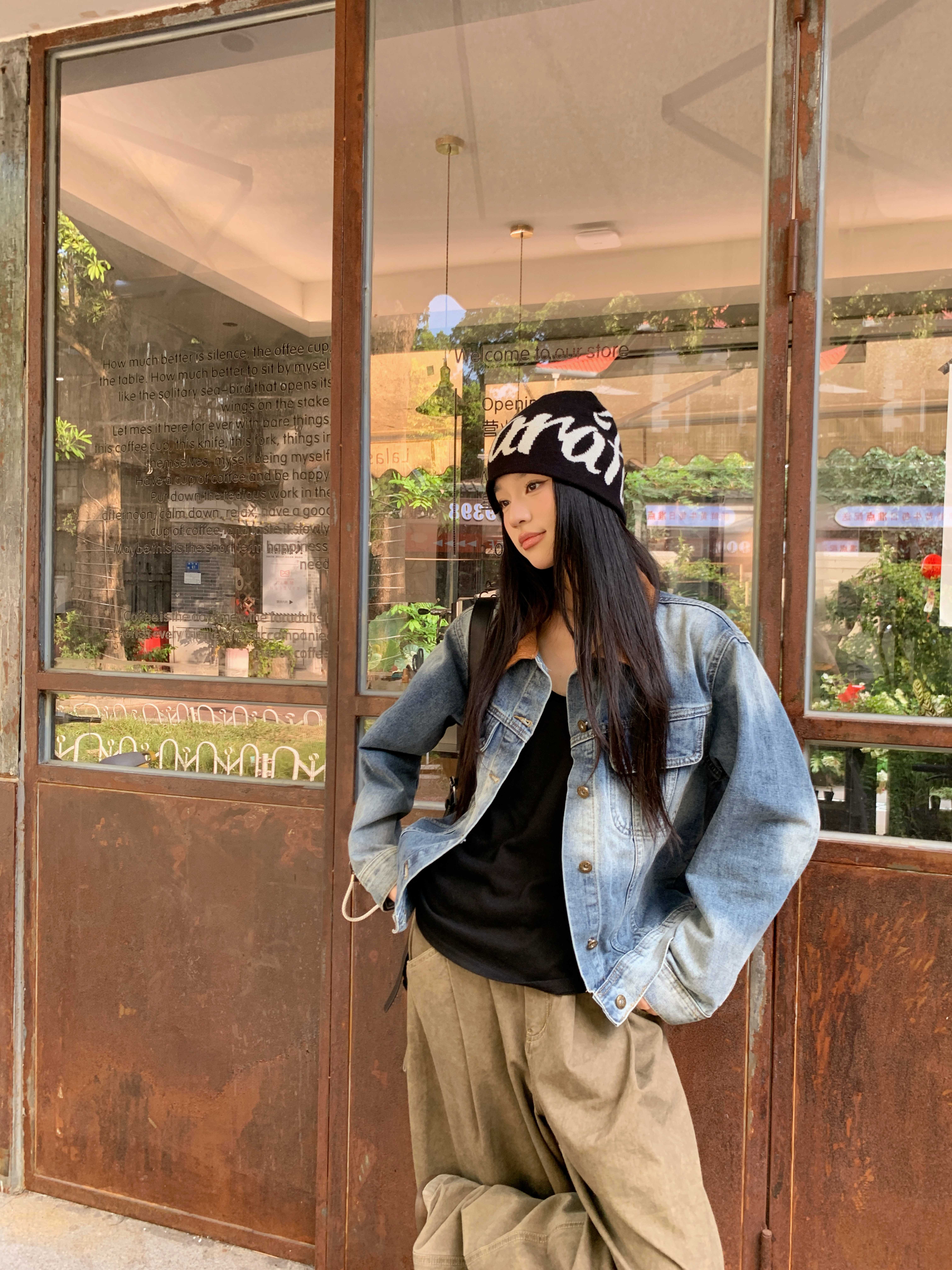 실제 사진: 레트로 스타일의 드롭 숄더 데님 재킷으로, 밝은 파란색 코듀로이 칼라가 특징이며, 스톰 라이더스(Storm Riders)를 오마주한 디자인입니다.