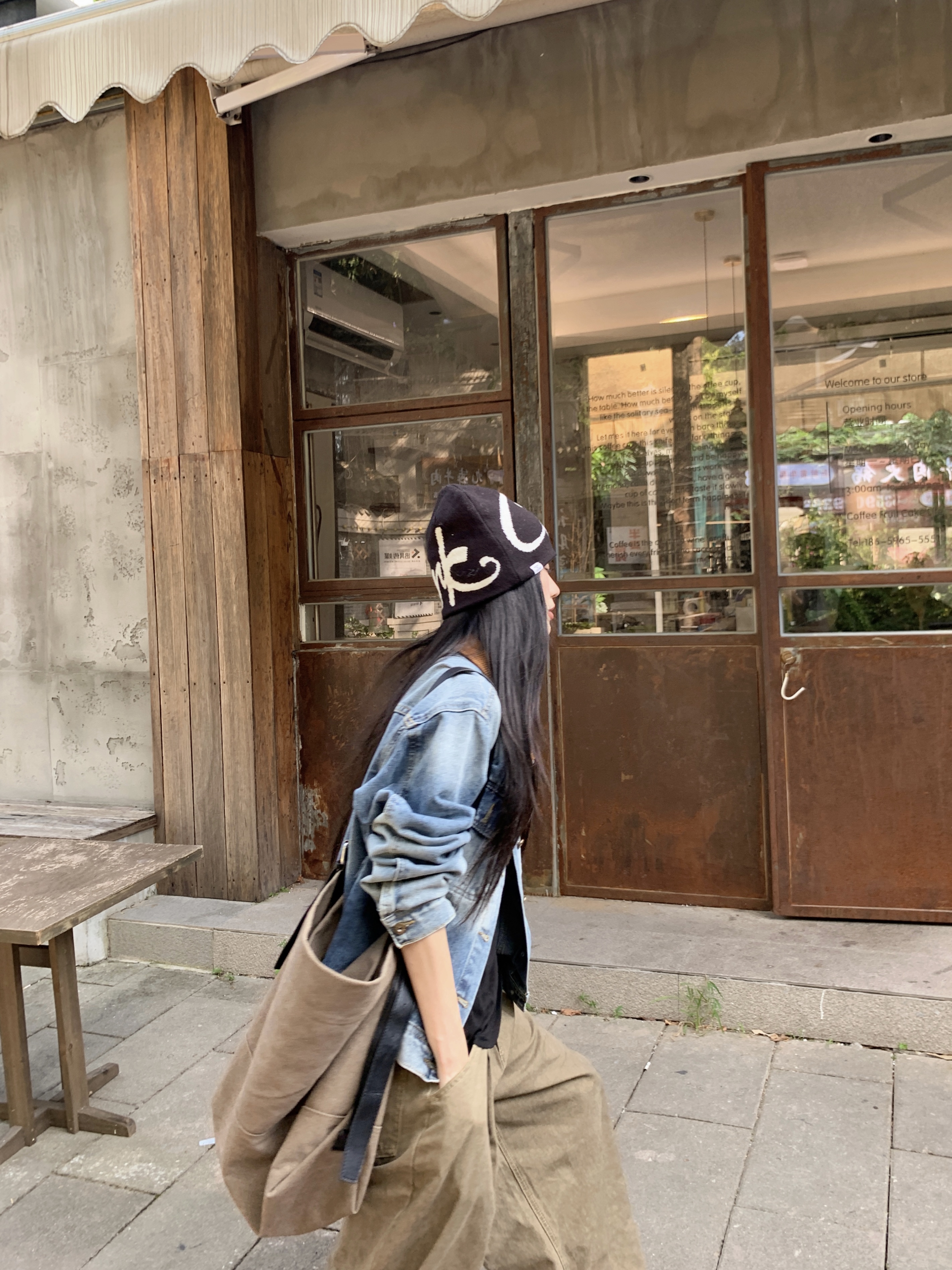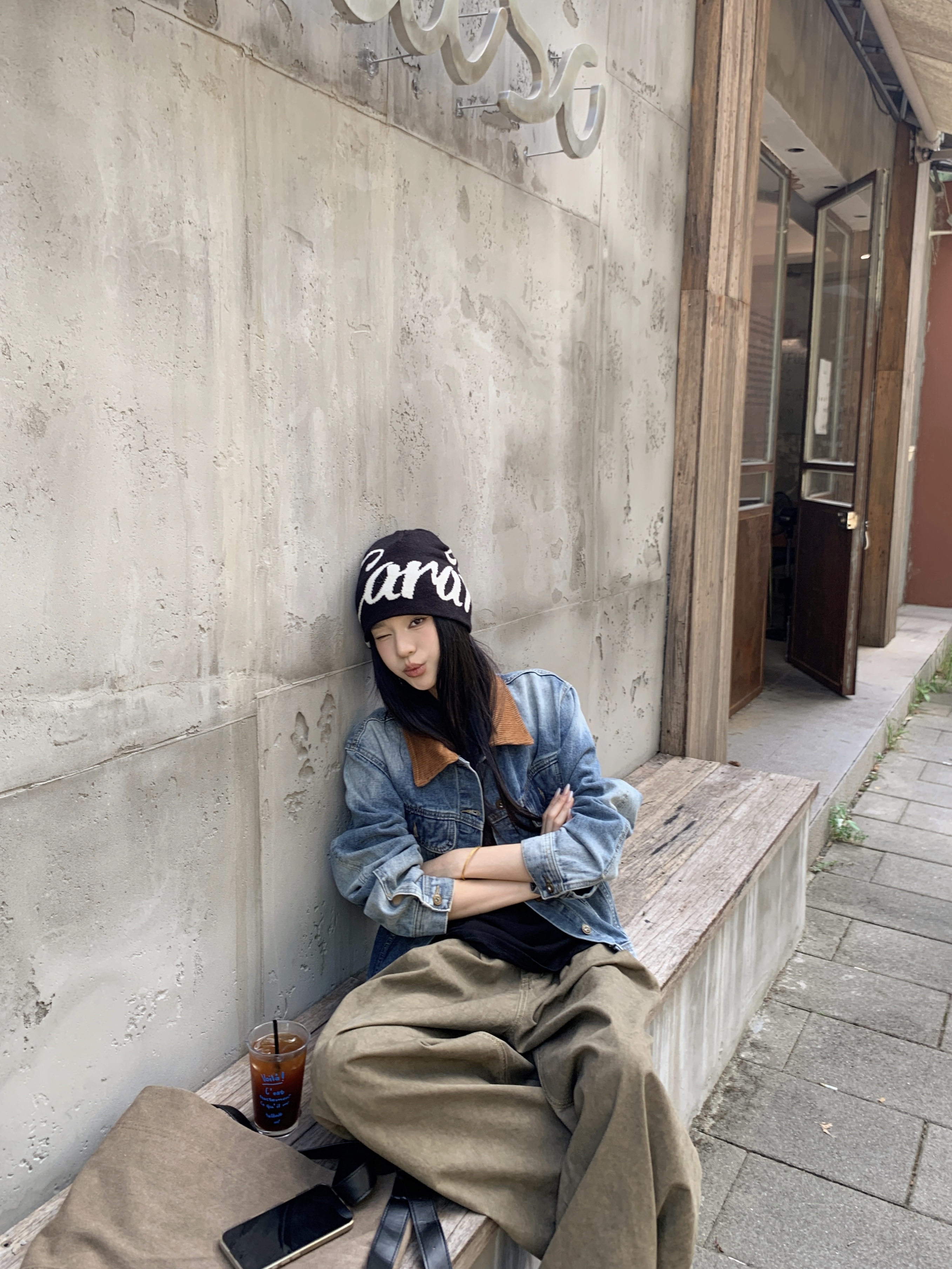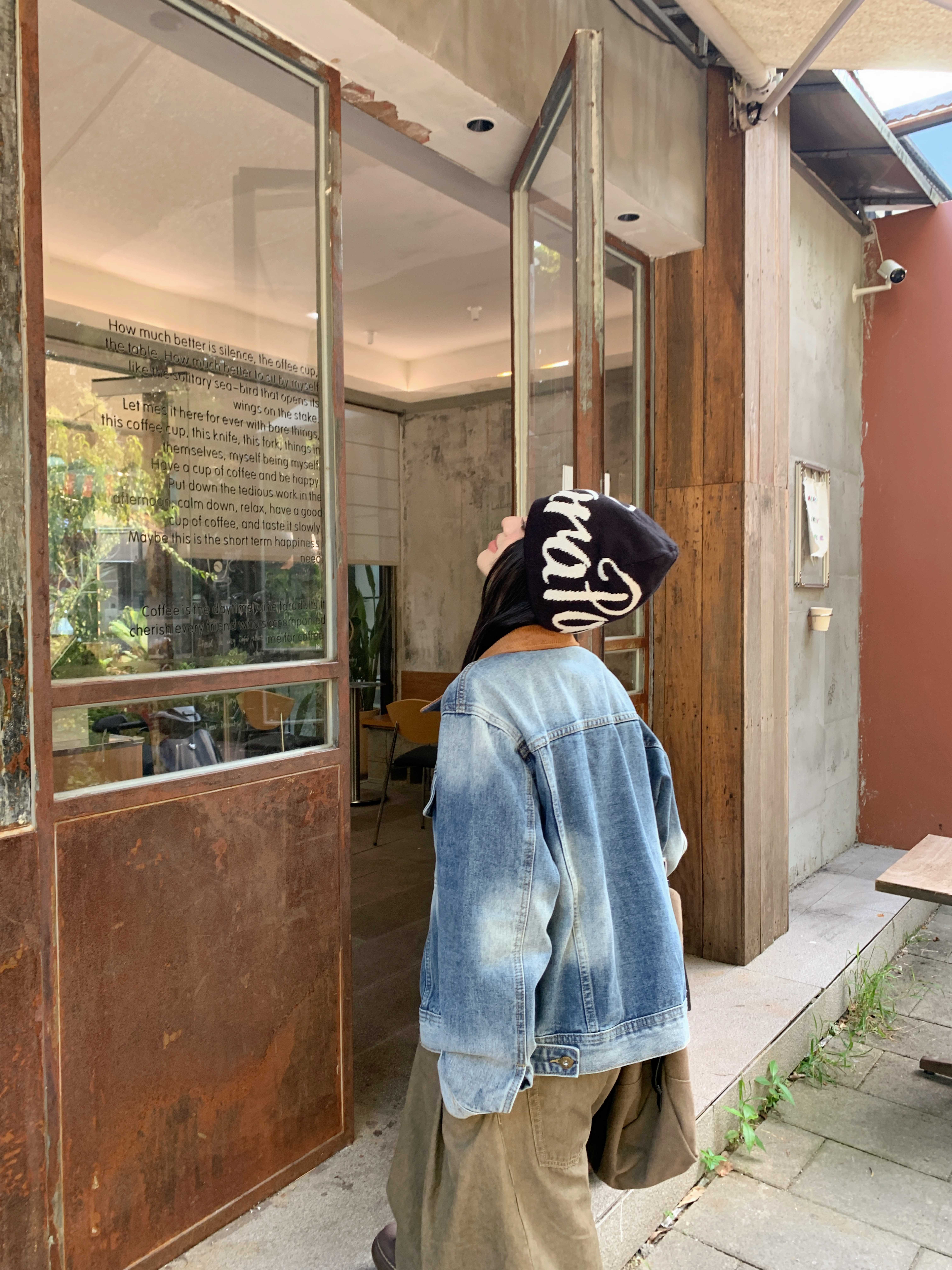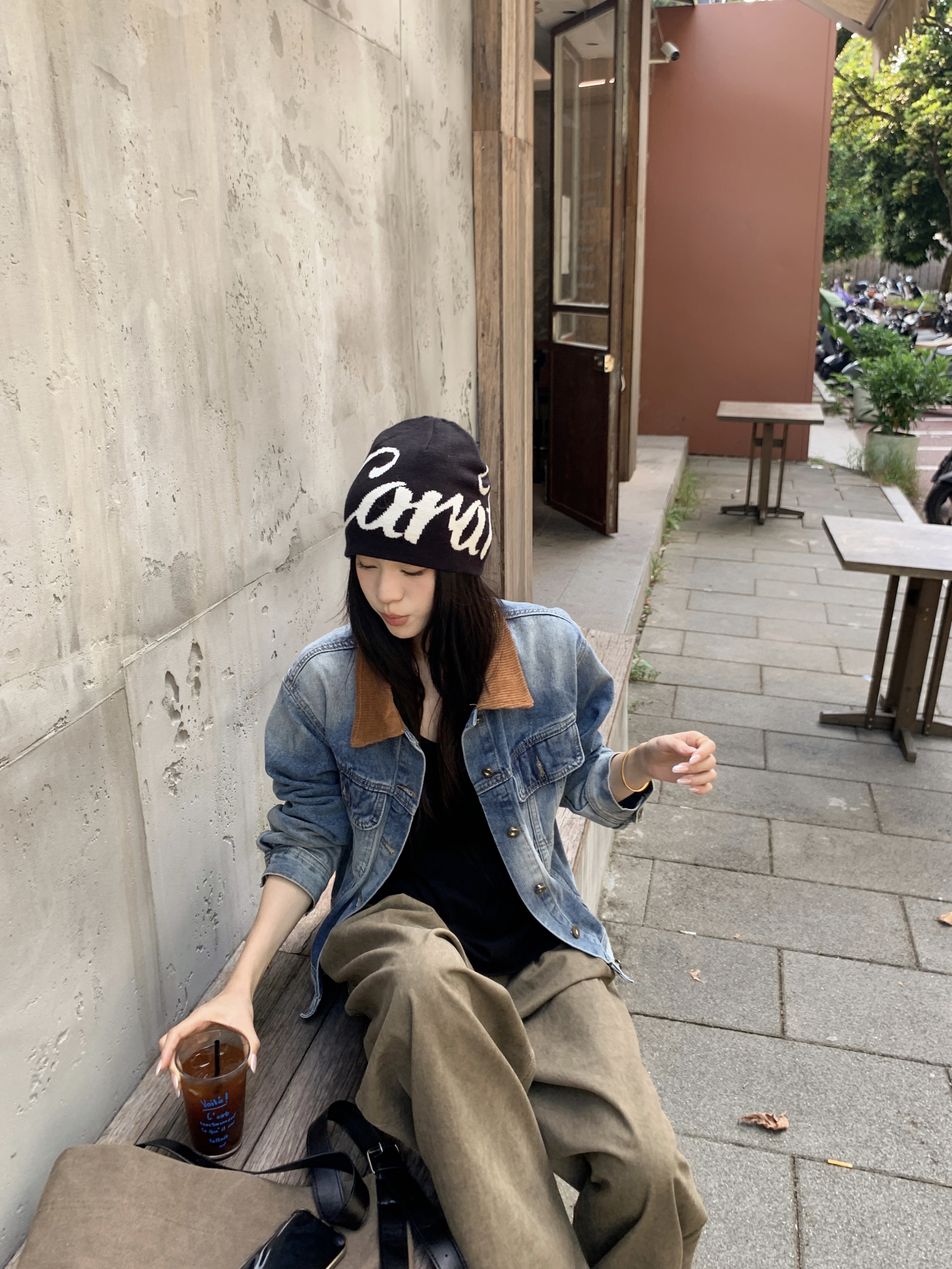 실제 사진: 레트로 스타일의 드롭 숄더 데님 재킷으로, 밝은 파란색 코듀로이 칼라가 특징이며, 스톰 라이더스(Storm Riders)를 오마주한 디자인입니다.