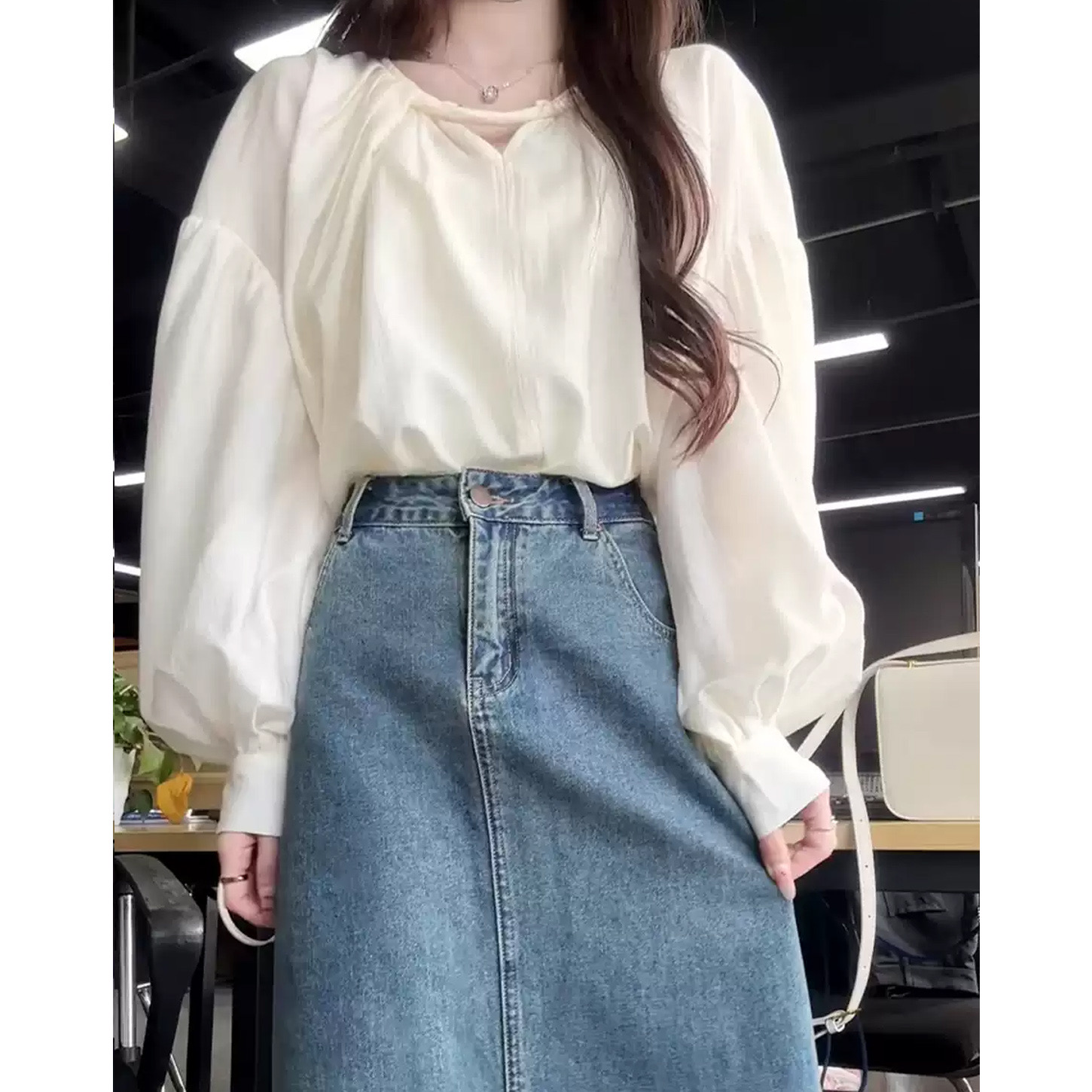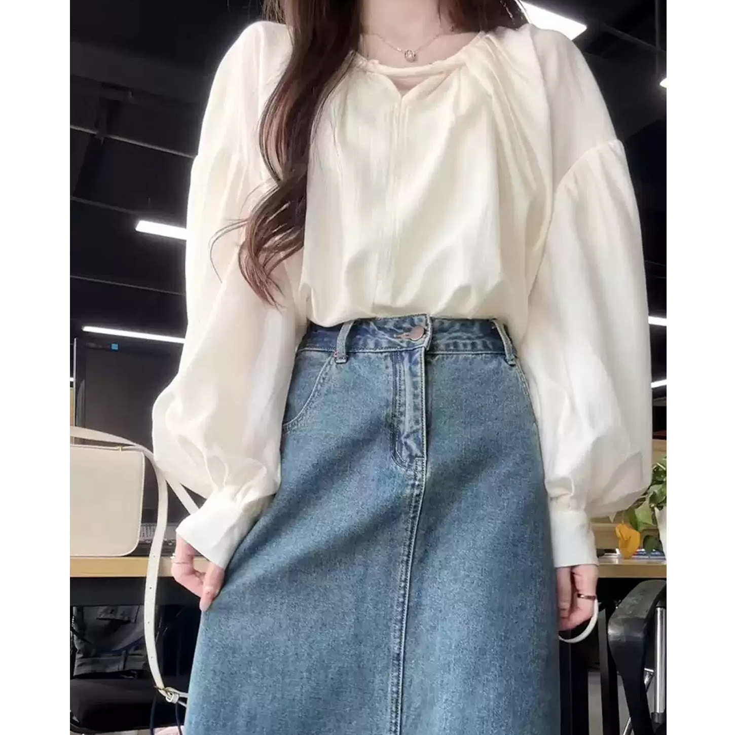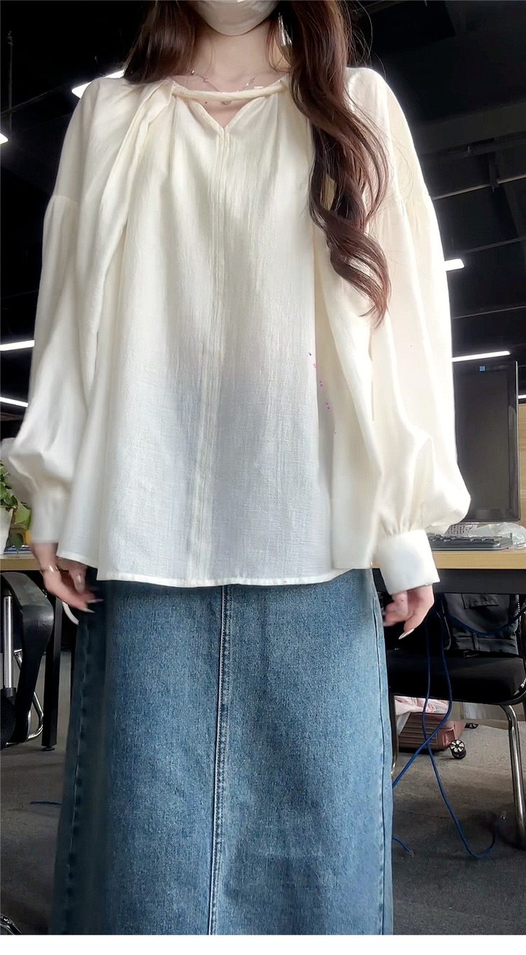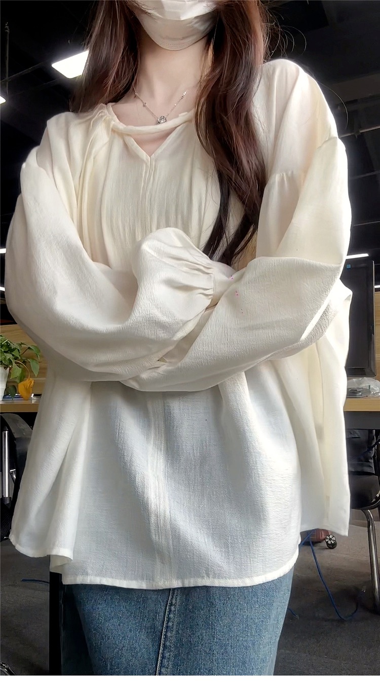 한국 스타일의 고급스러운 여성용 화이트 셔츠로, 프랑스 디자인과 독특한 루즈핏이 특징이며, 우아하고 세련된 핏으로 초가을에 제격입니다.