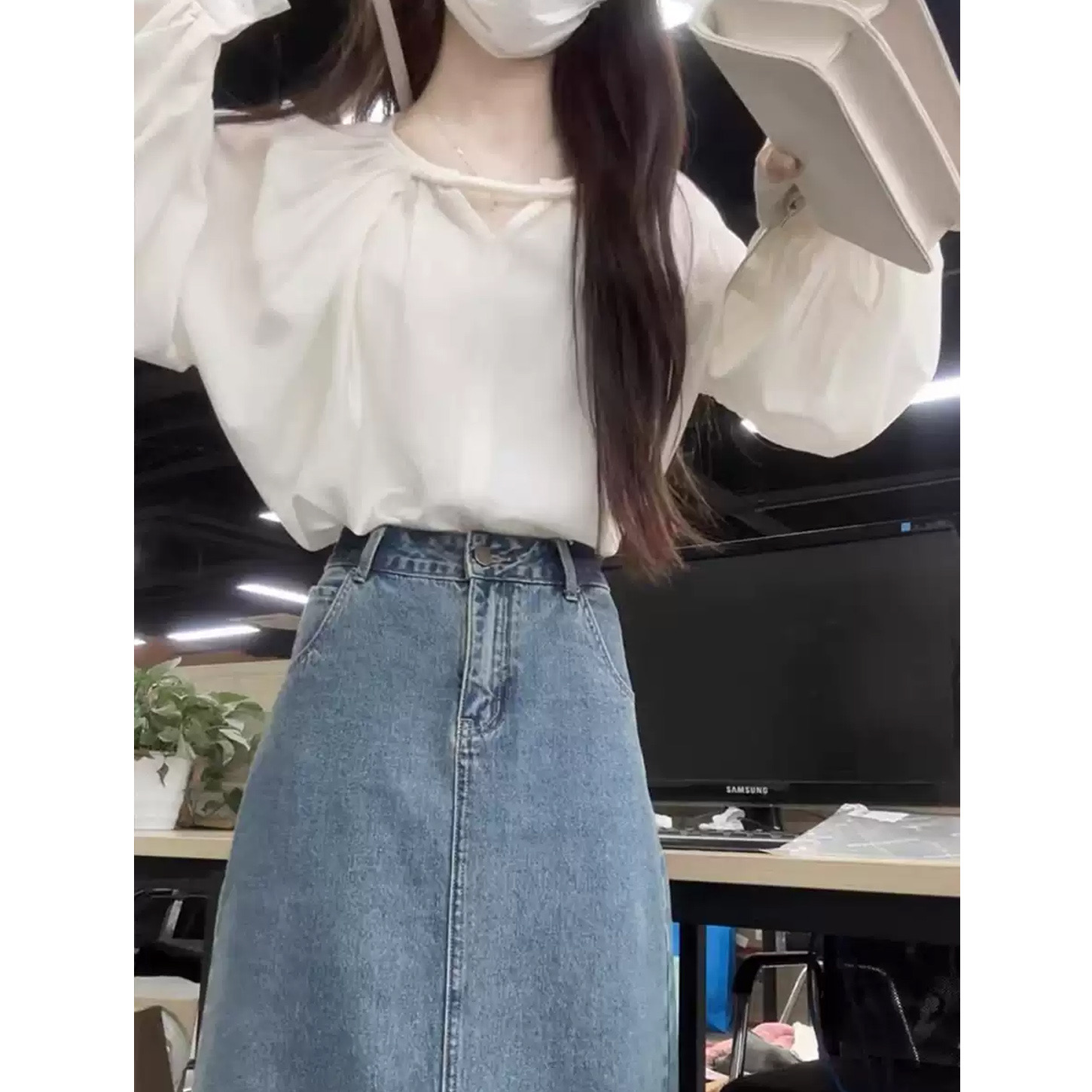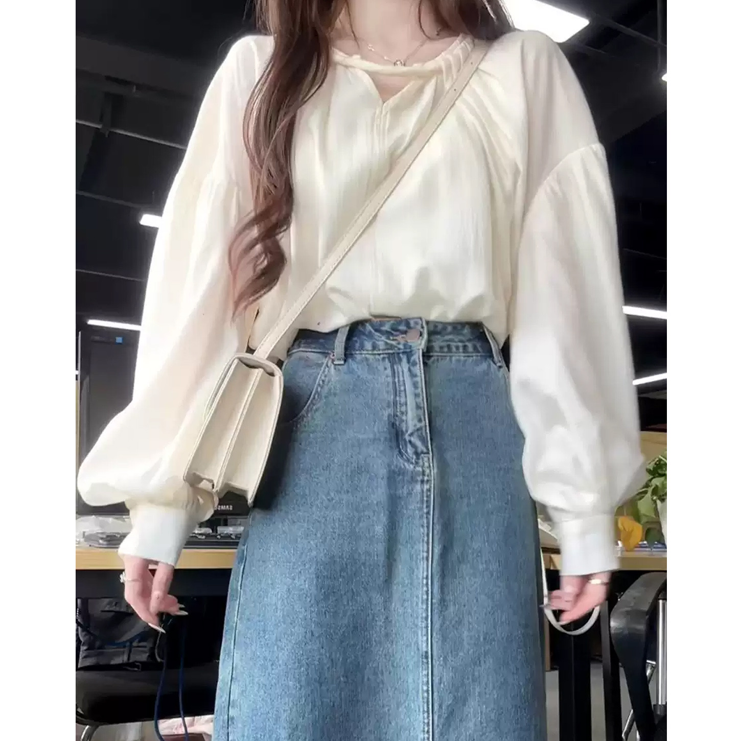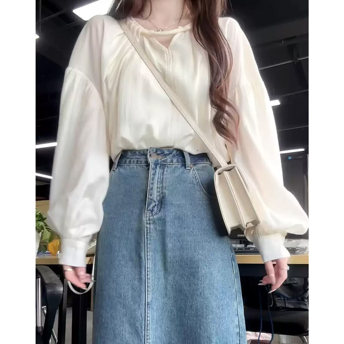 한국 스타일의 고급스러운 여성용 화이트 셔츠로, 프랑스 디자인과 독특한 루즈핏이 특징이며, 우아하고 세련된 핏으로 초가을에 제격입니다.
