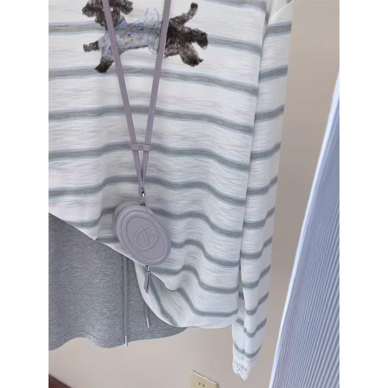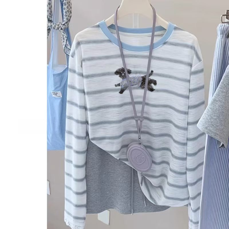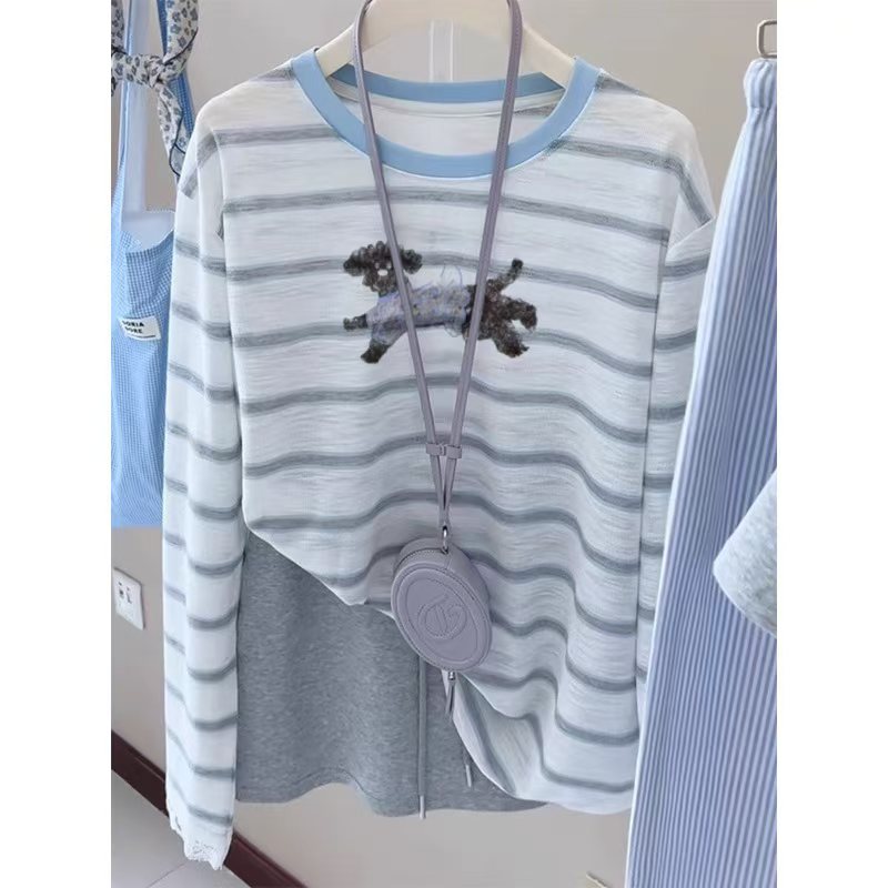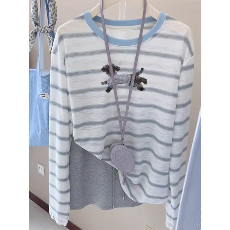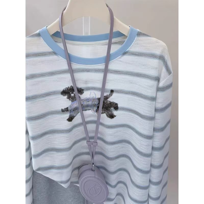 여성용 파란색 줄무늬 자수 자외선 차단 티셔츠, 초가을용 얇은 스타일, 에어컨 바람에 덮기 좋은 커버업, 2025년 신상 한국 스타일 루즈핏 상의.
