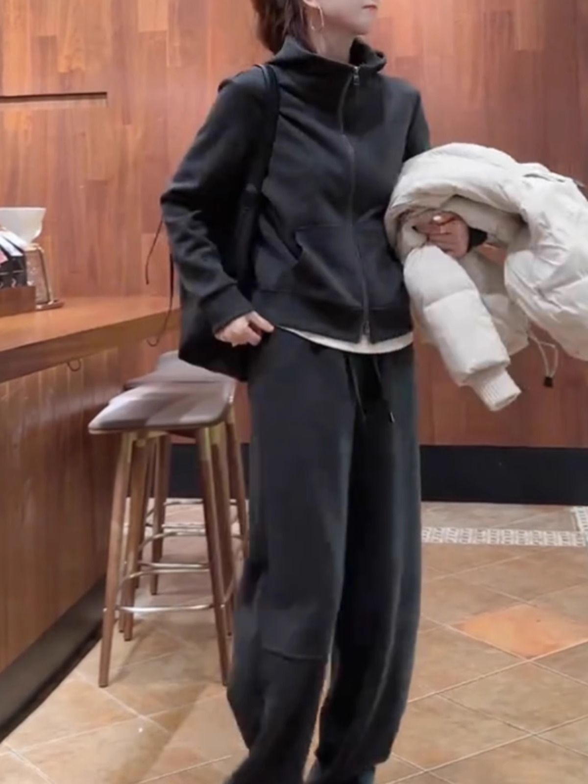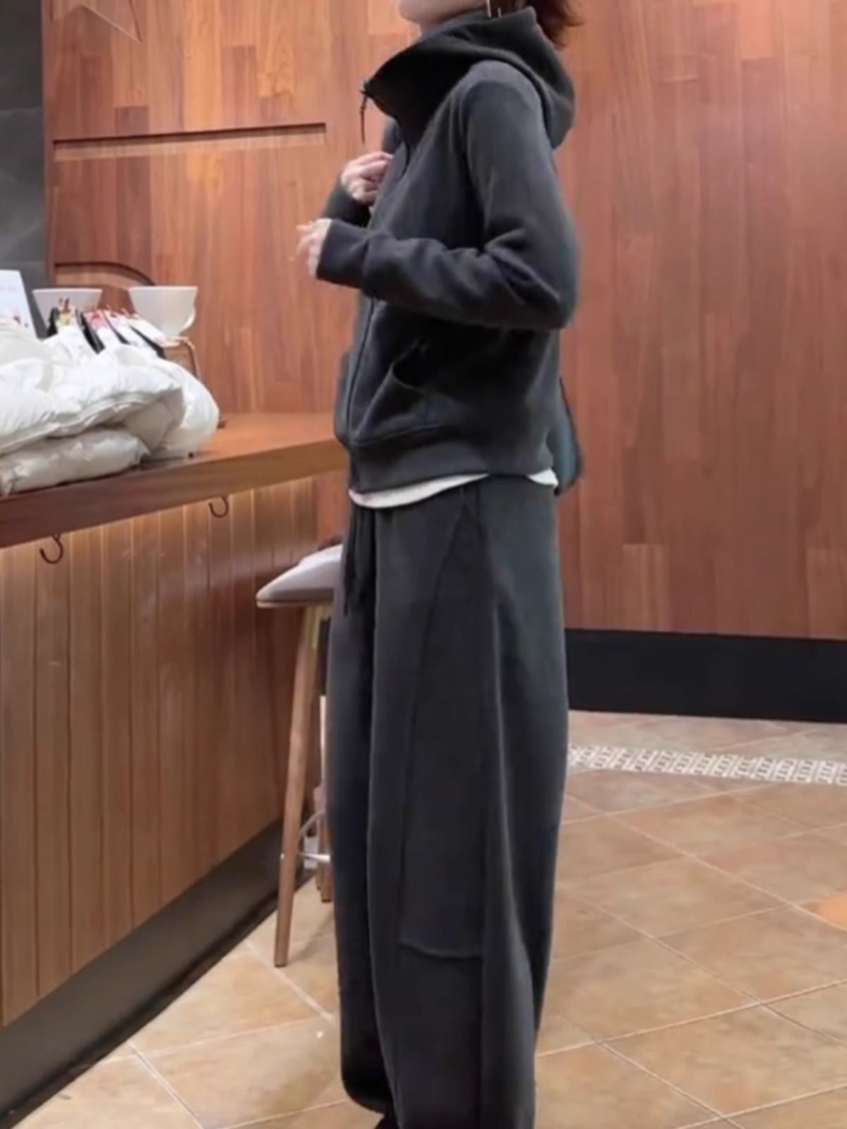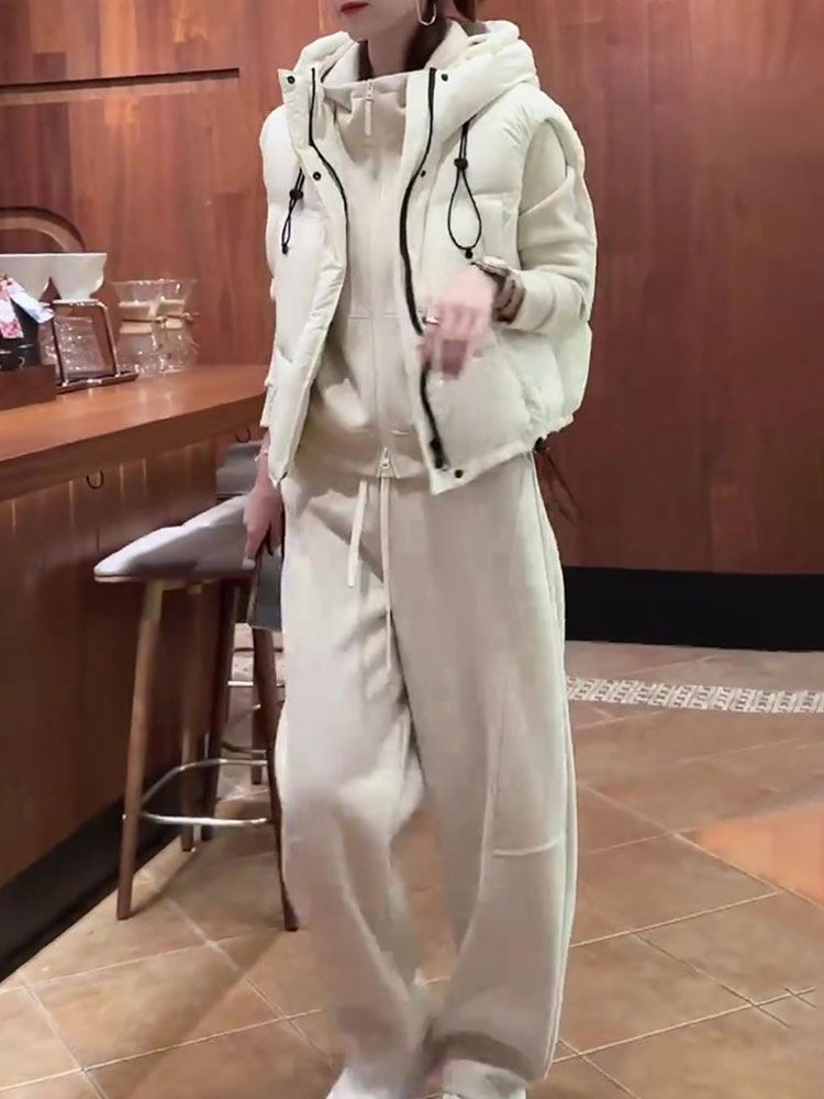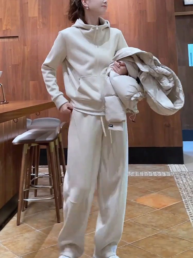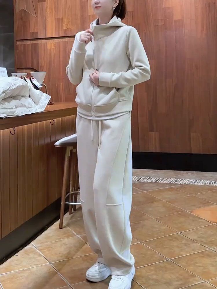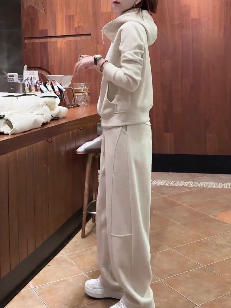 2025 가을/겨울 신상 투피스 세트: 우아하고 젊은 감각의 살구색 스웨트셔츠와 와이드 팬츠로 구성된 여성용 캐주얼 스포츠웨어 세트
