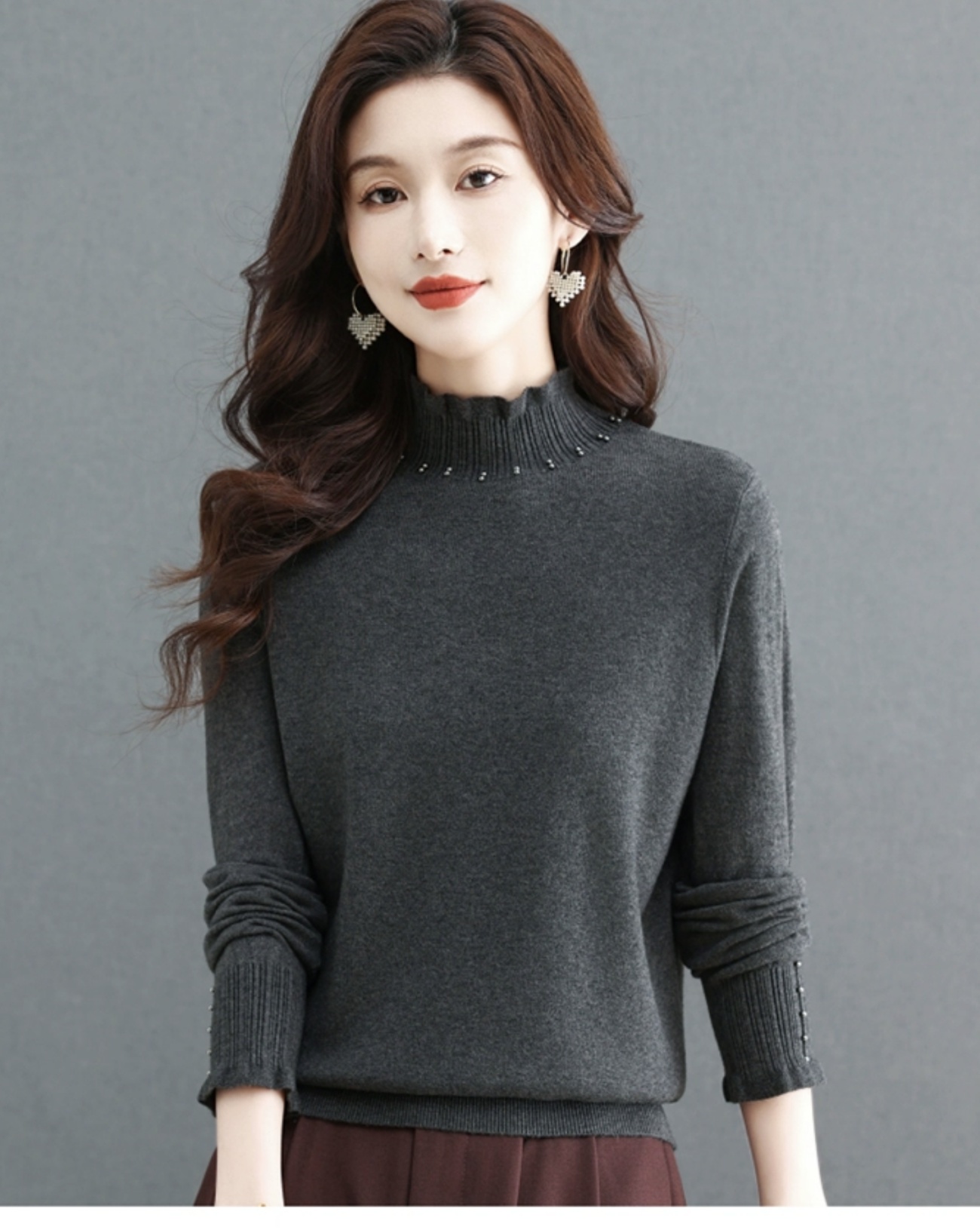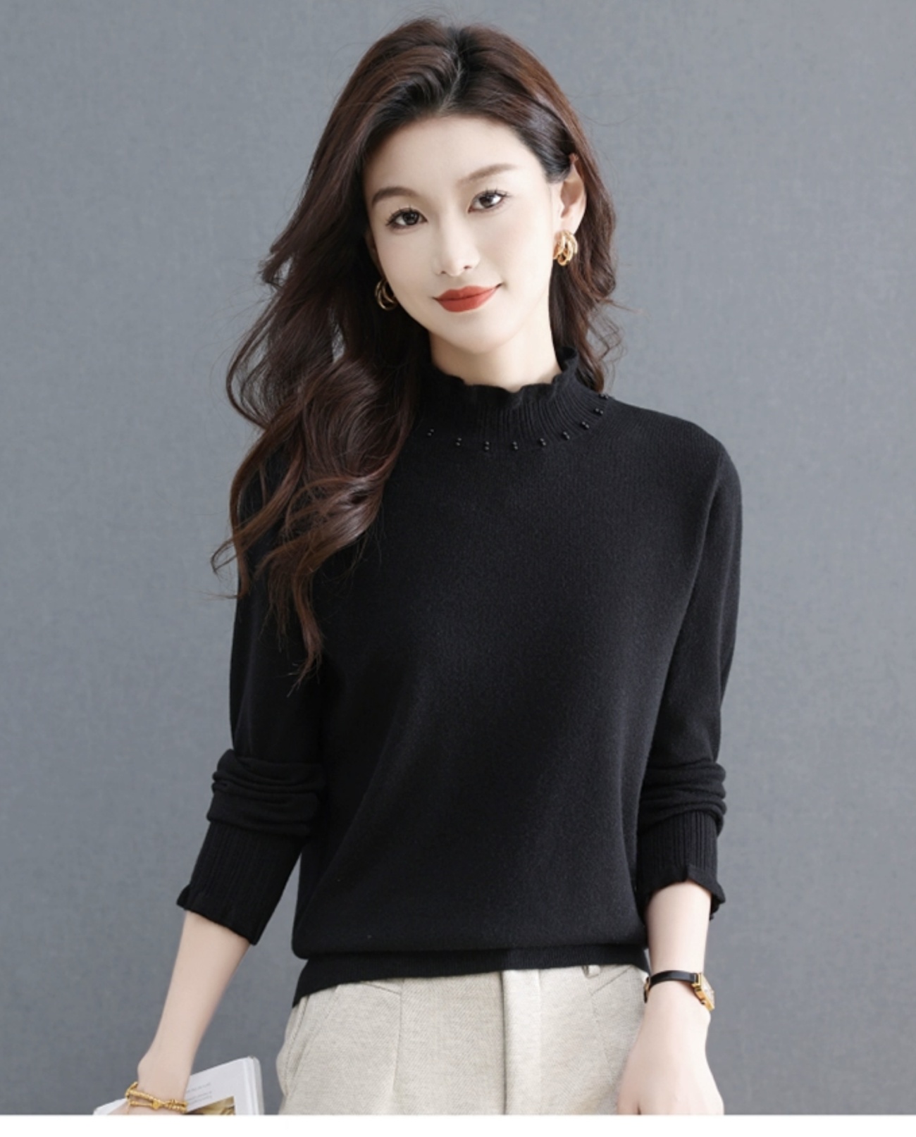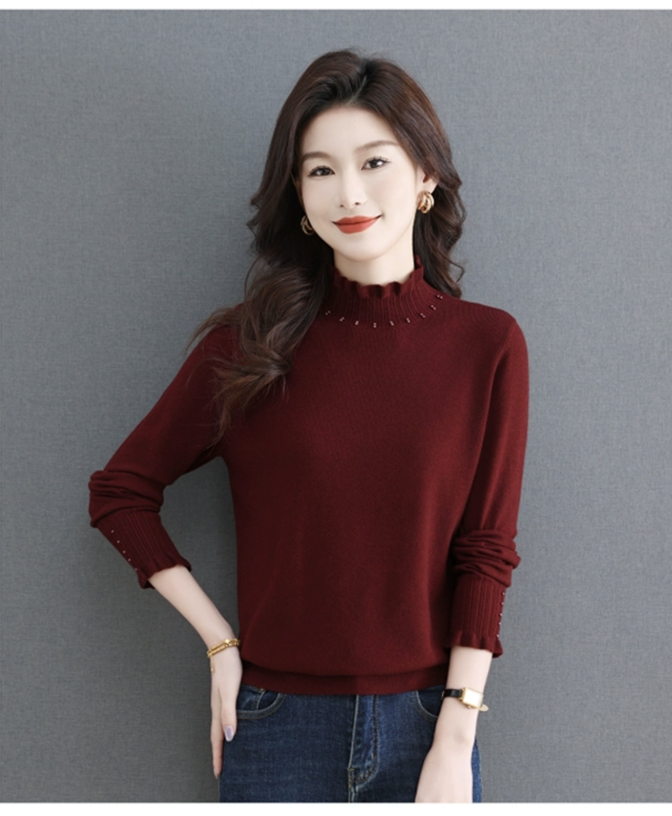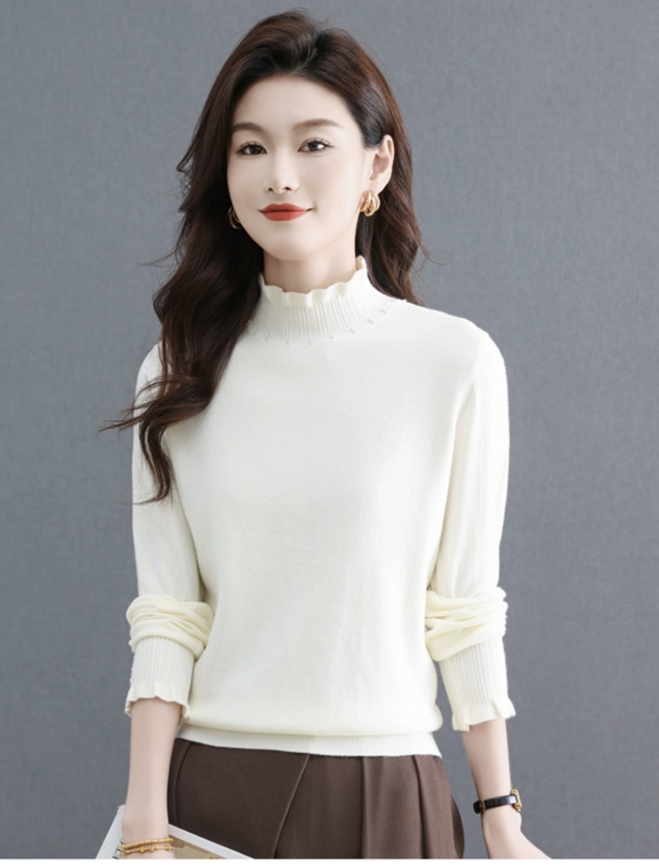 중년 엄마들을 위한 봄/가을용 프릴 칼라 스웨터, 넉넉한 플러스 사이즈 울 스웨터, 스타일리시한 탑, 얇은 니트 이너 레이어
