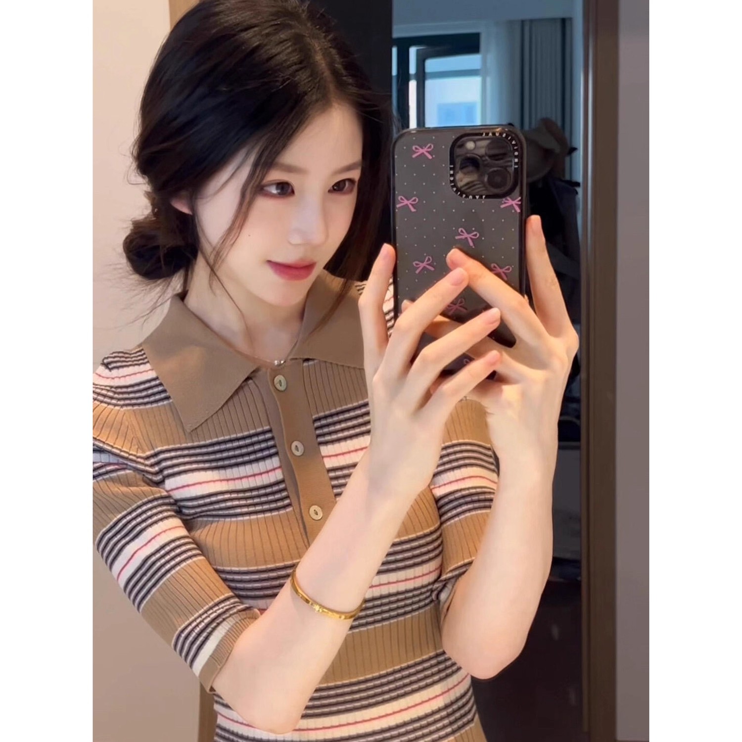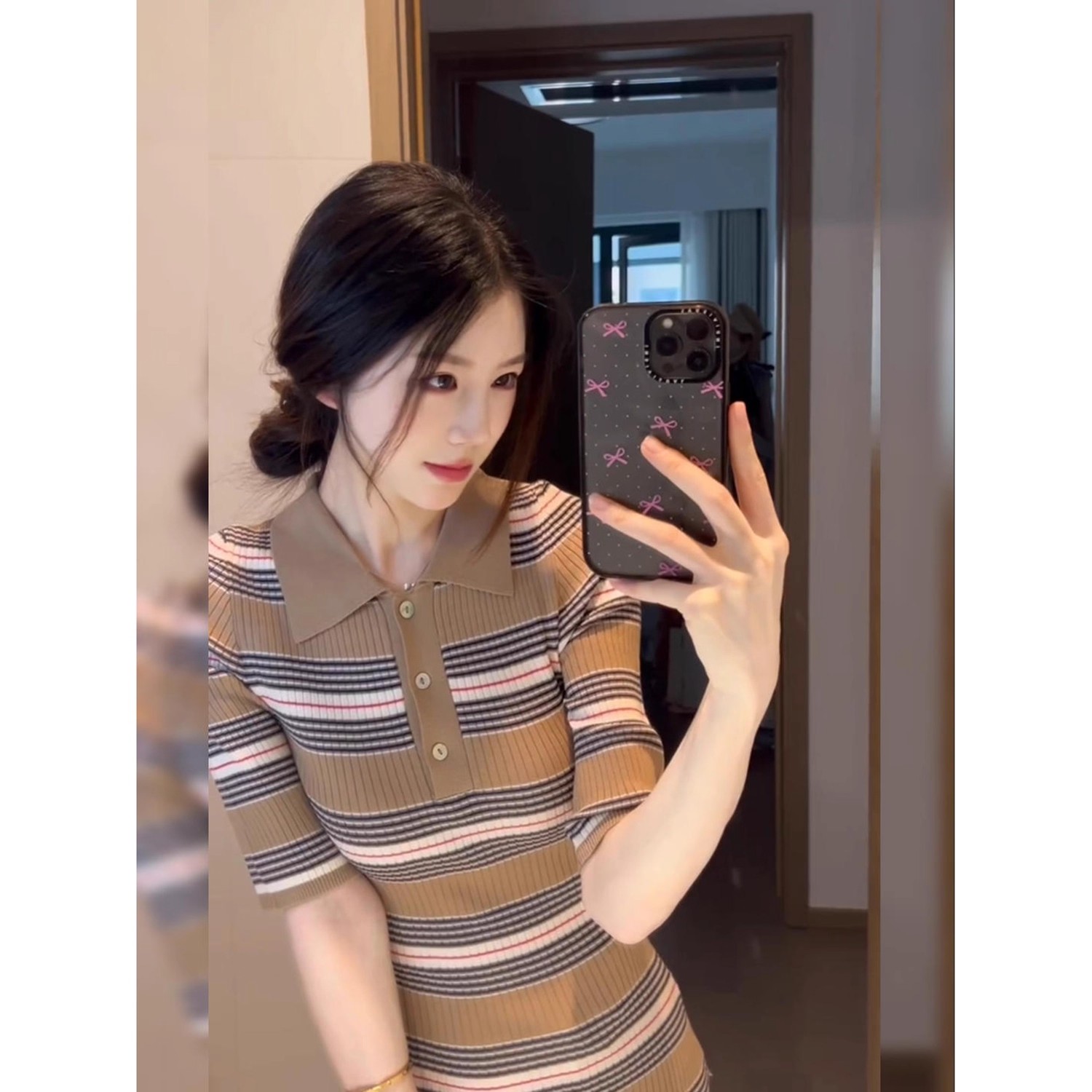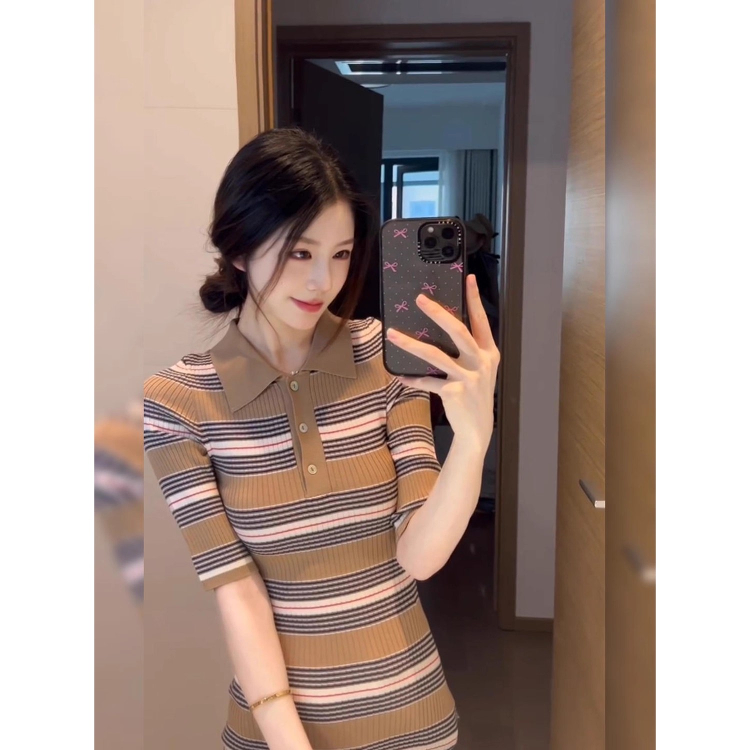 배송 완료. 여성용 편안한 스타일의 스트라이프 컬러 블록 반팔 니트 드레스. 라펠, 버튼 3개, 슬림핏, 바디콘 스커트 디자인.