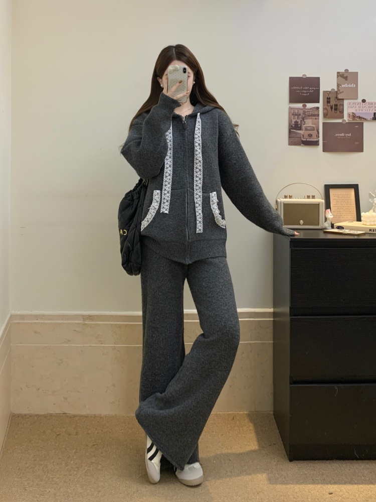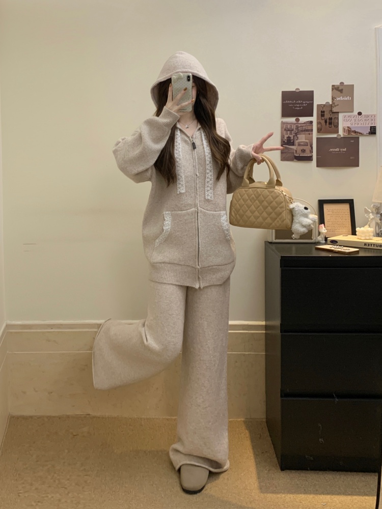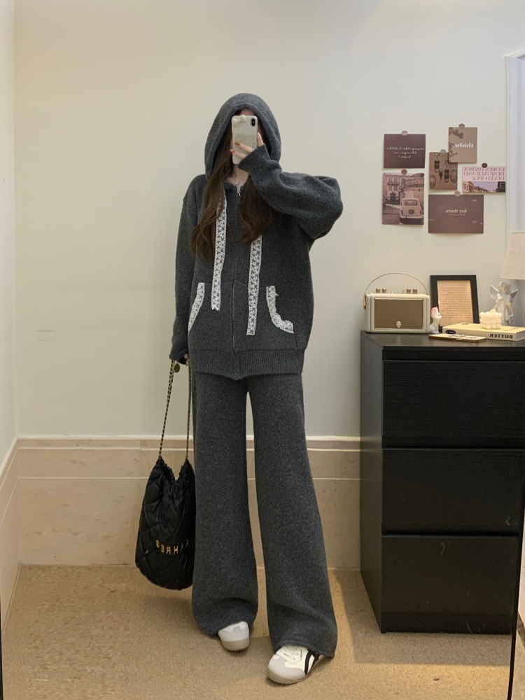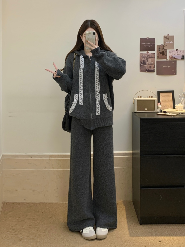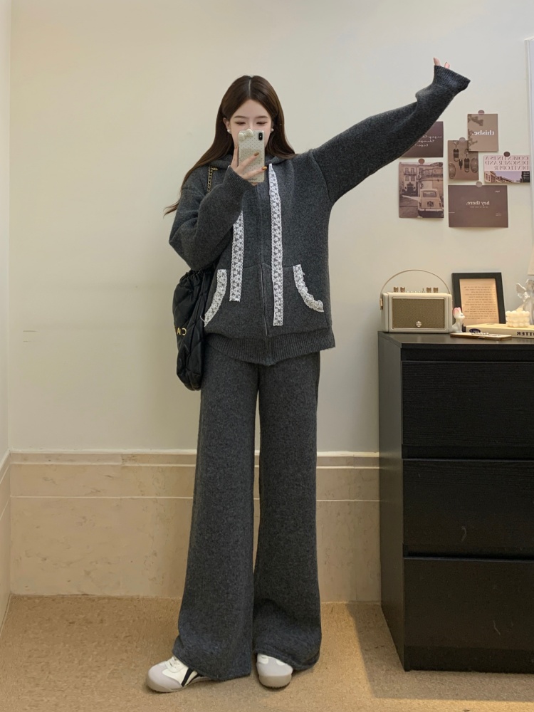 플러스 사이즈 여성을 위한 활용도 높은 가을/겨울 패션, 레이스 트리밍 후드 니트 스웨터 가디건과 와이드 팬츠 투피스 세트의 실제 사진입니다.