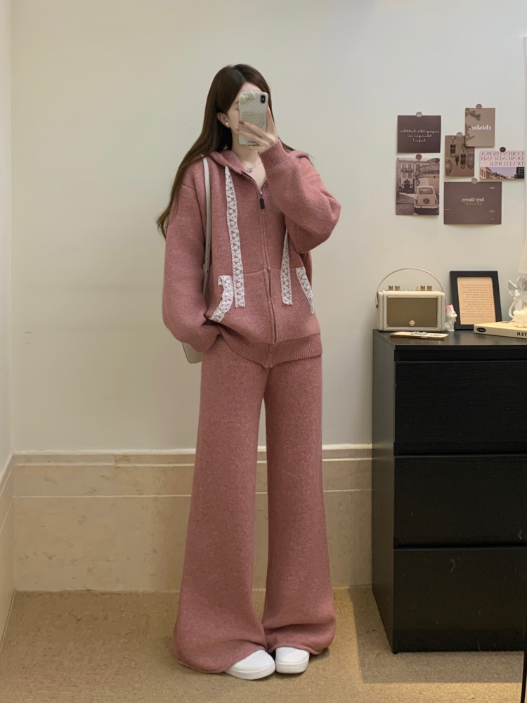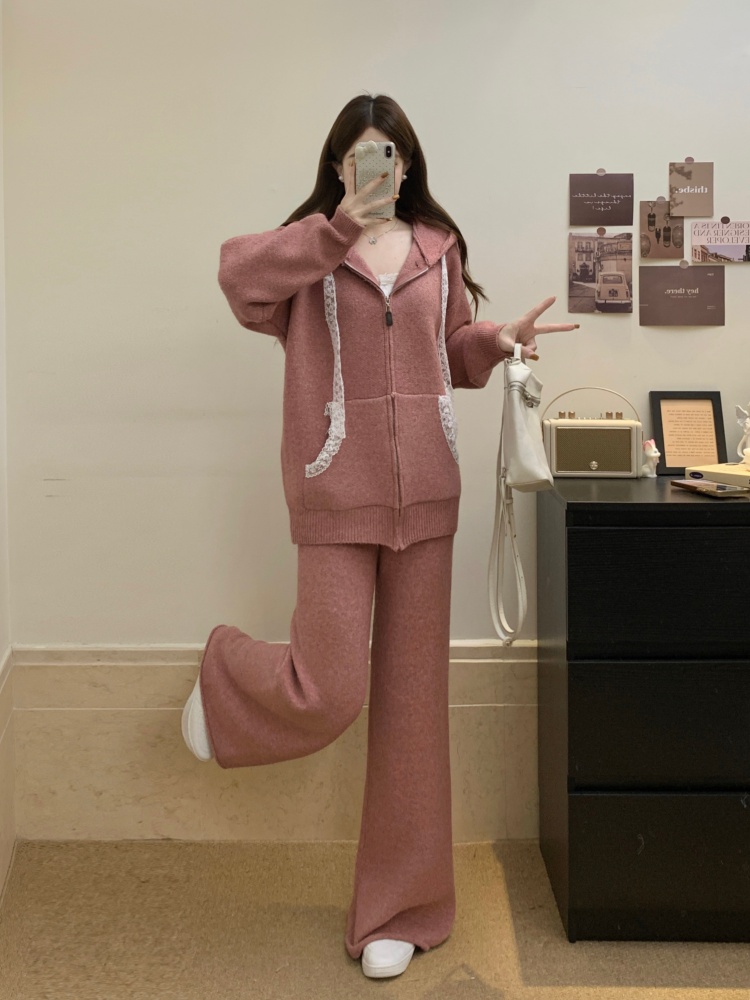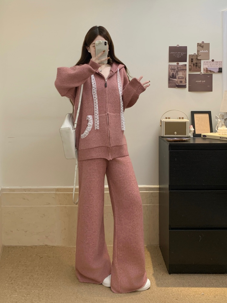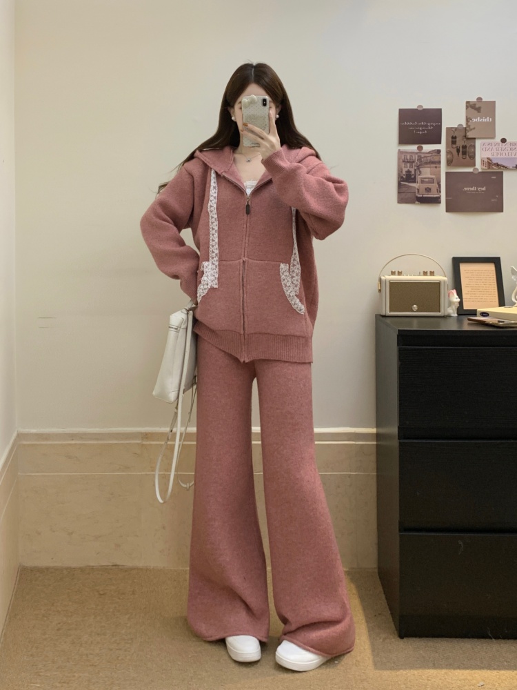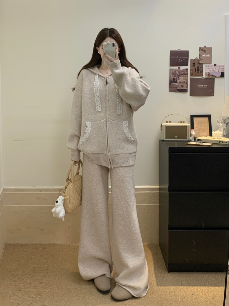 플러스 사이즈 여성을 위한 활용도 높은 가을/겨울 패션, 레이스 트리밍 후드 니트 스웨터 가디건과 와이드 팬츠 투피스 세트의 실제 사진입니다.