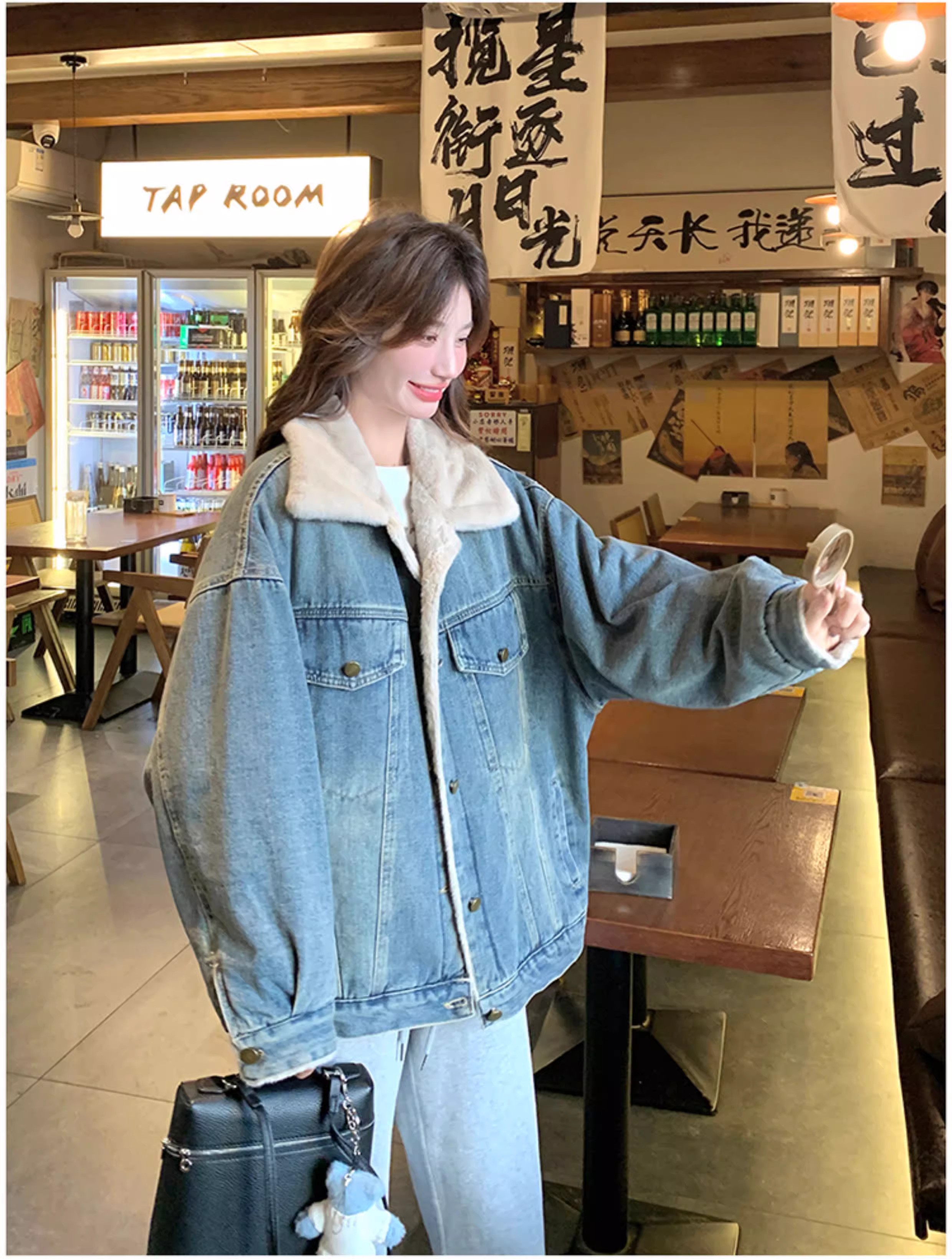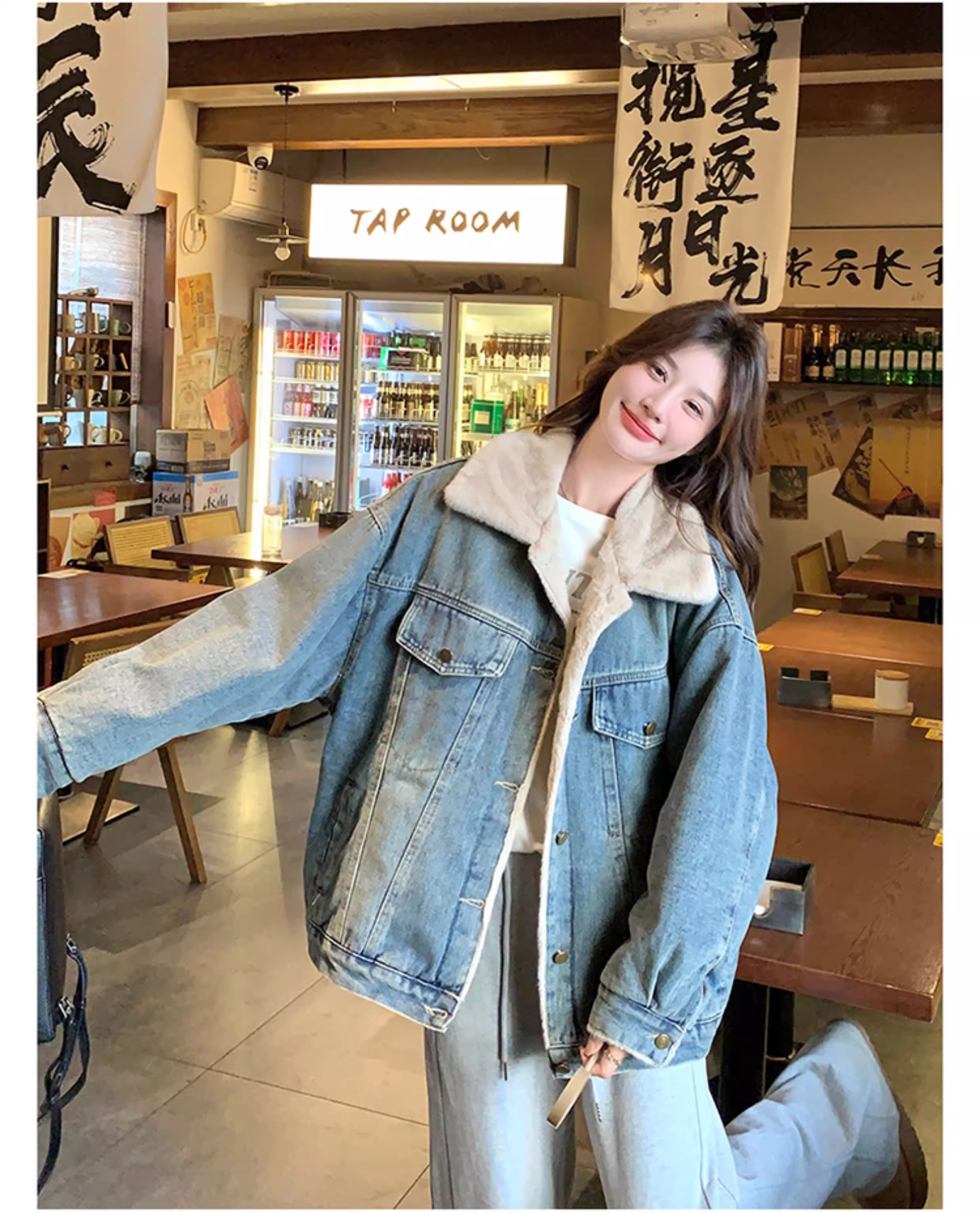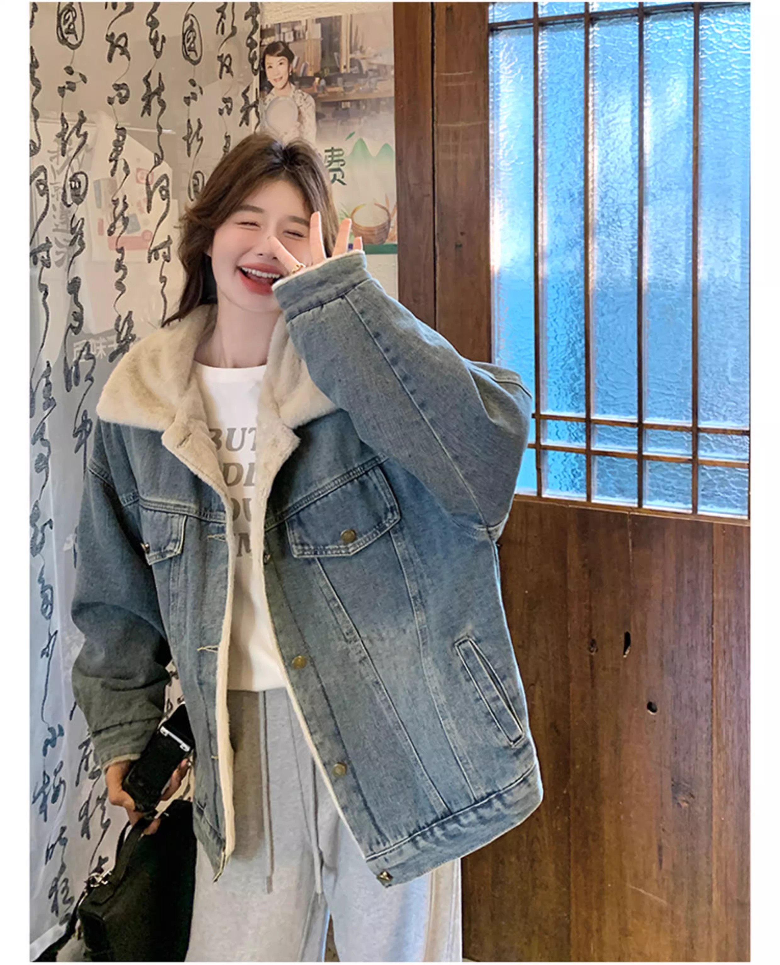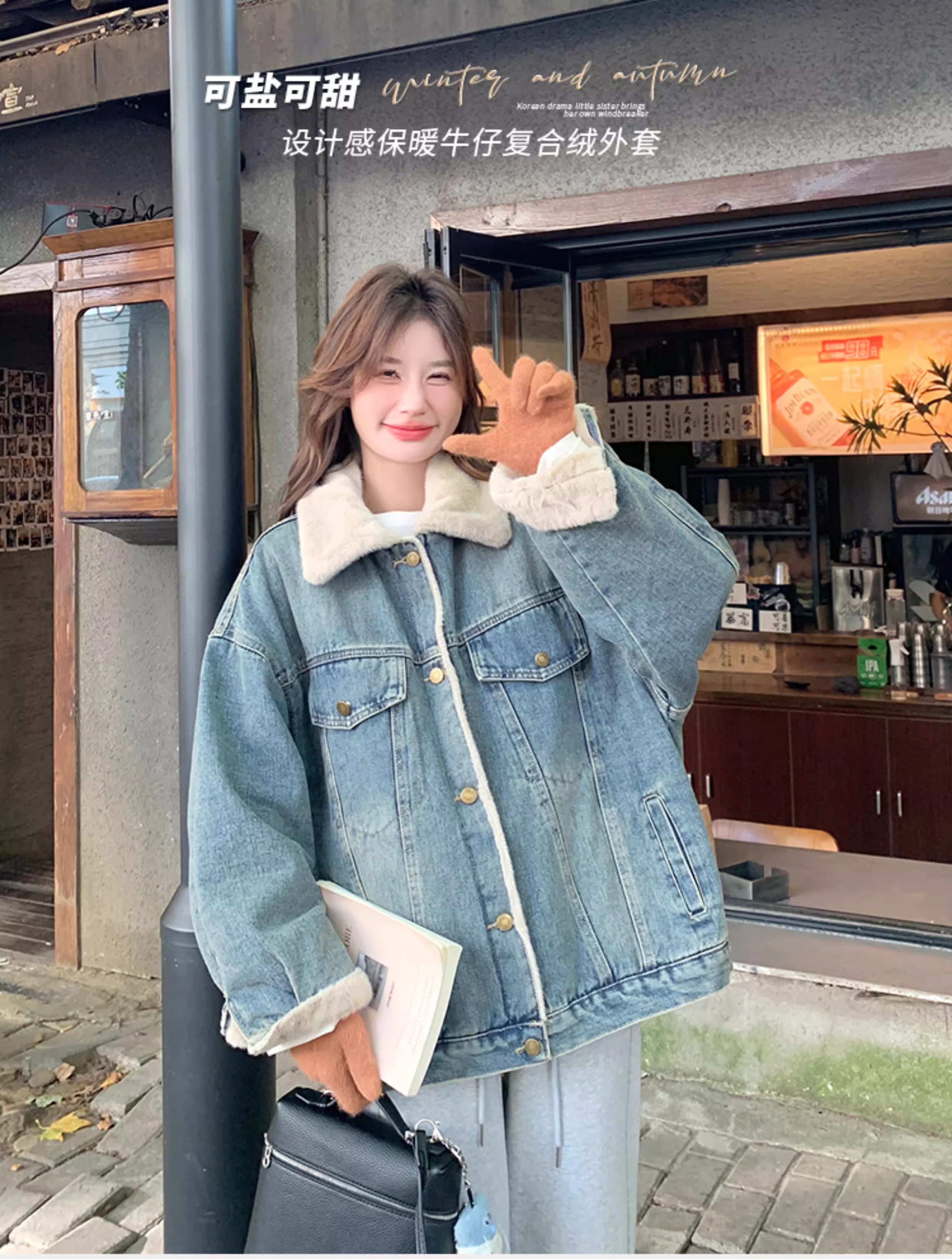여성용 2025년 겨울 신상 플리스 안감 두꺼운 데님 시어링 코트, 짧은 파카 코트