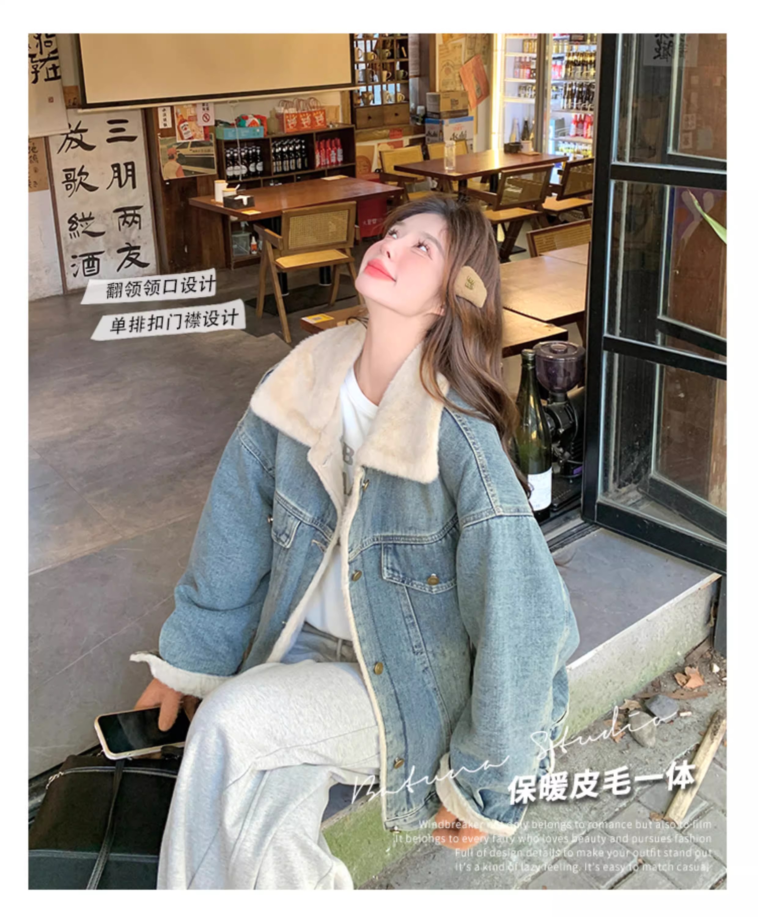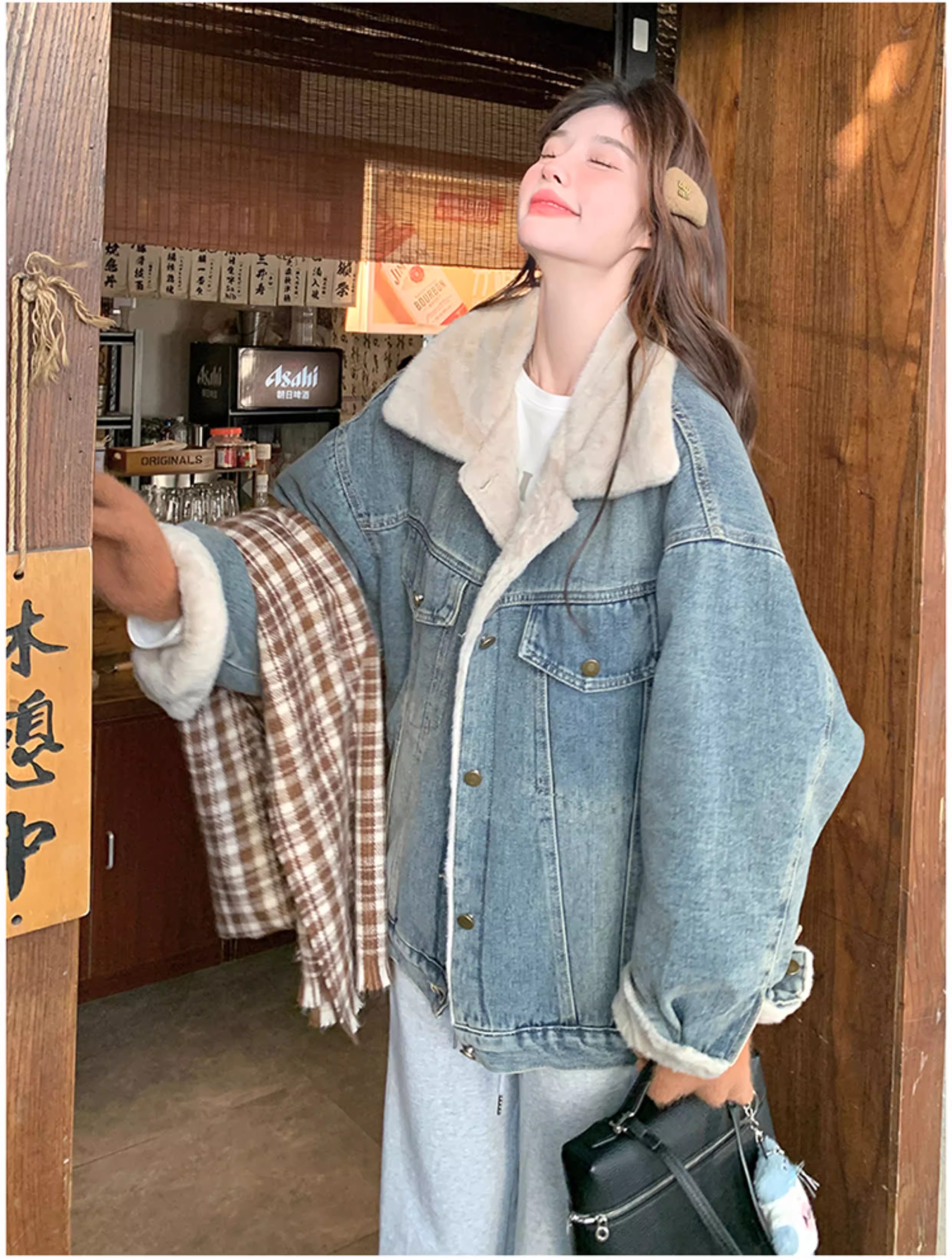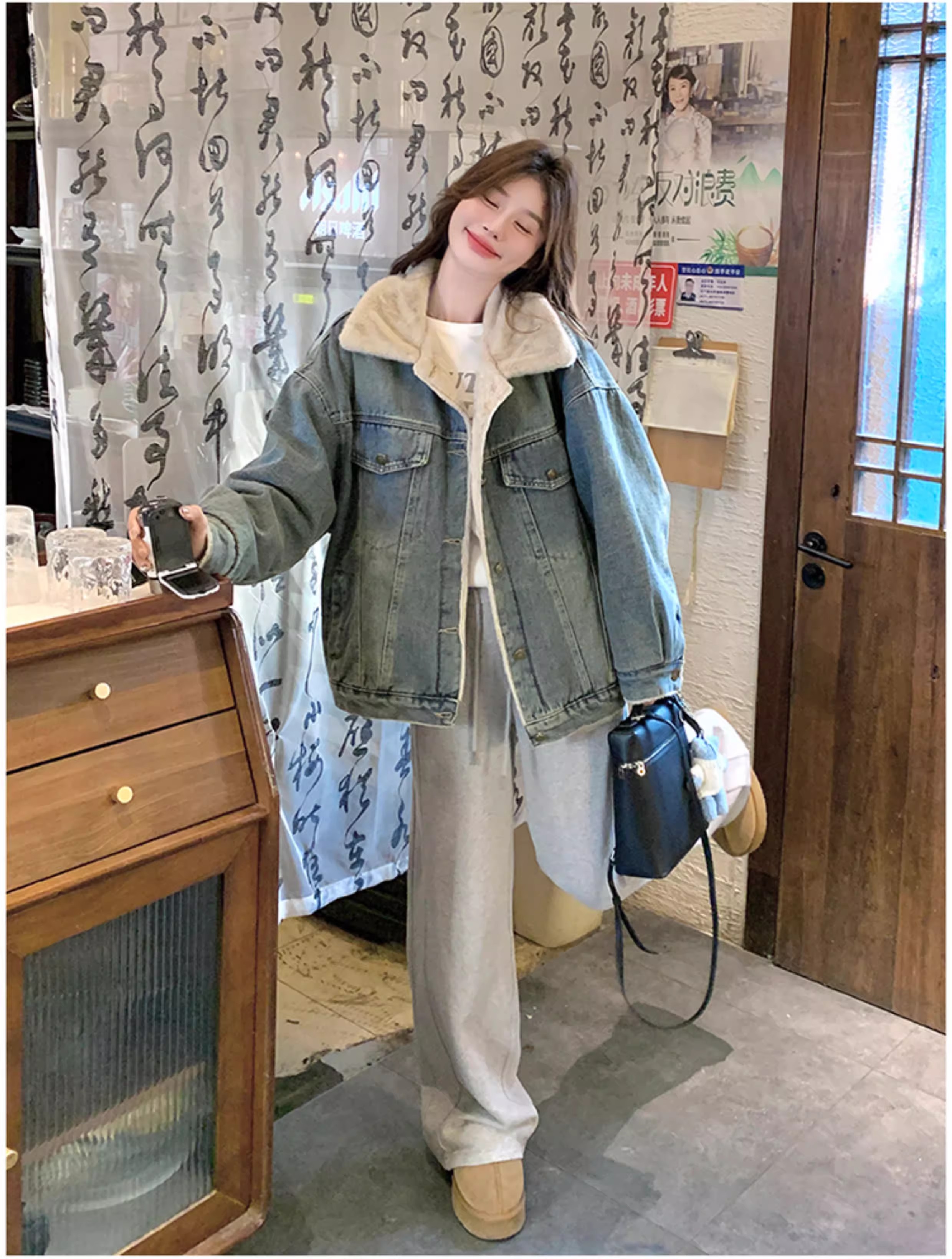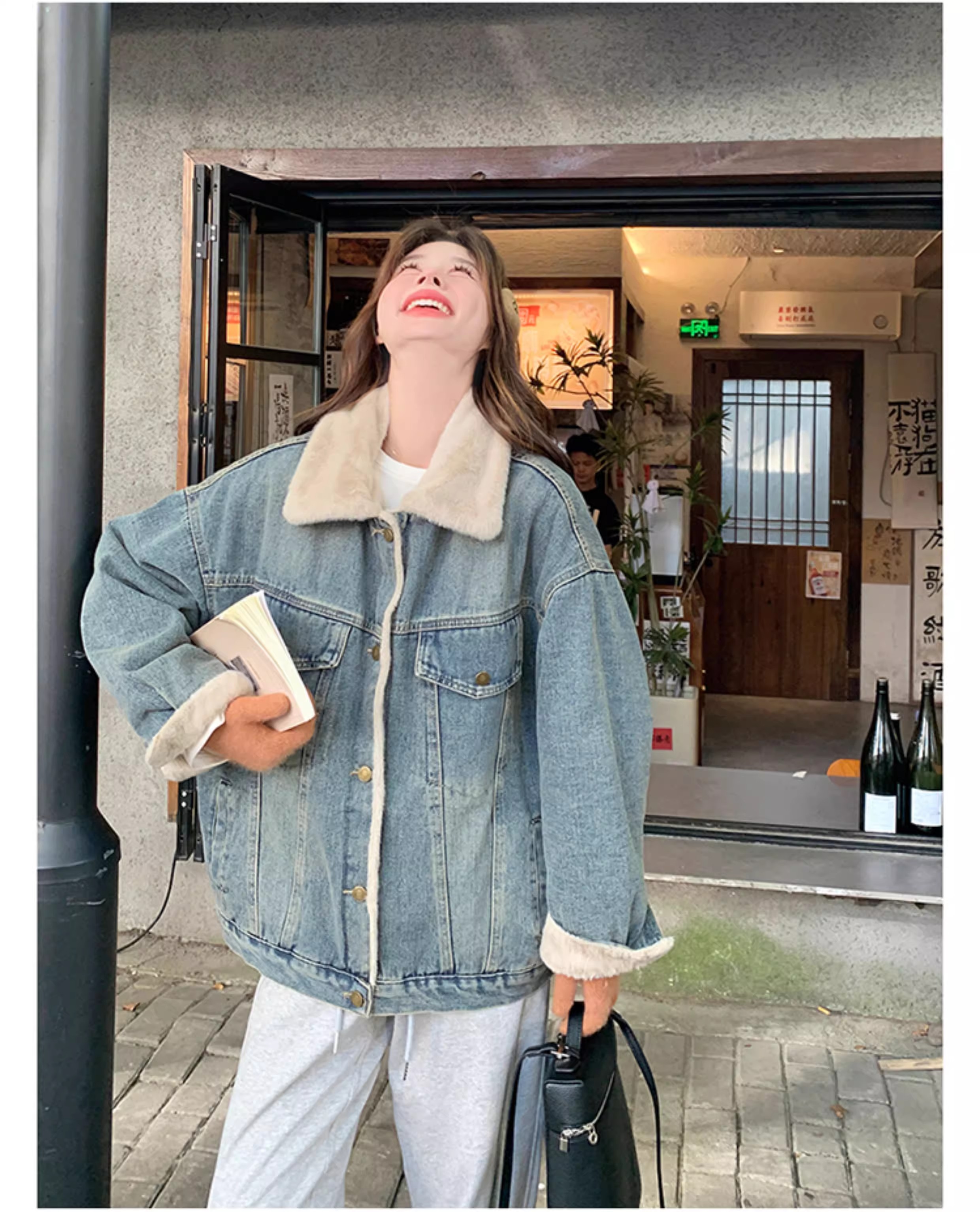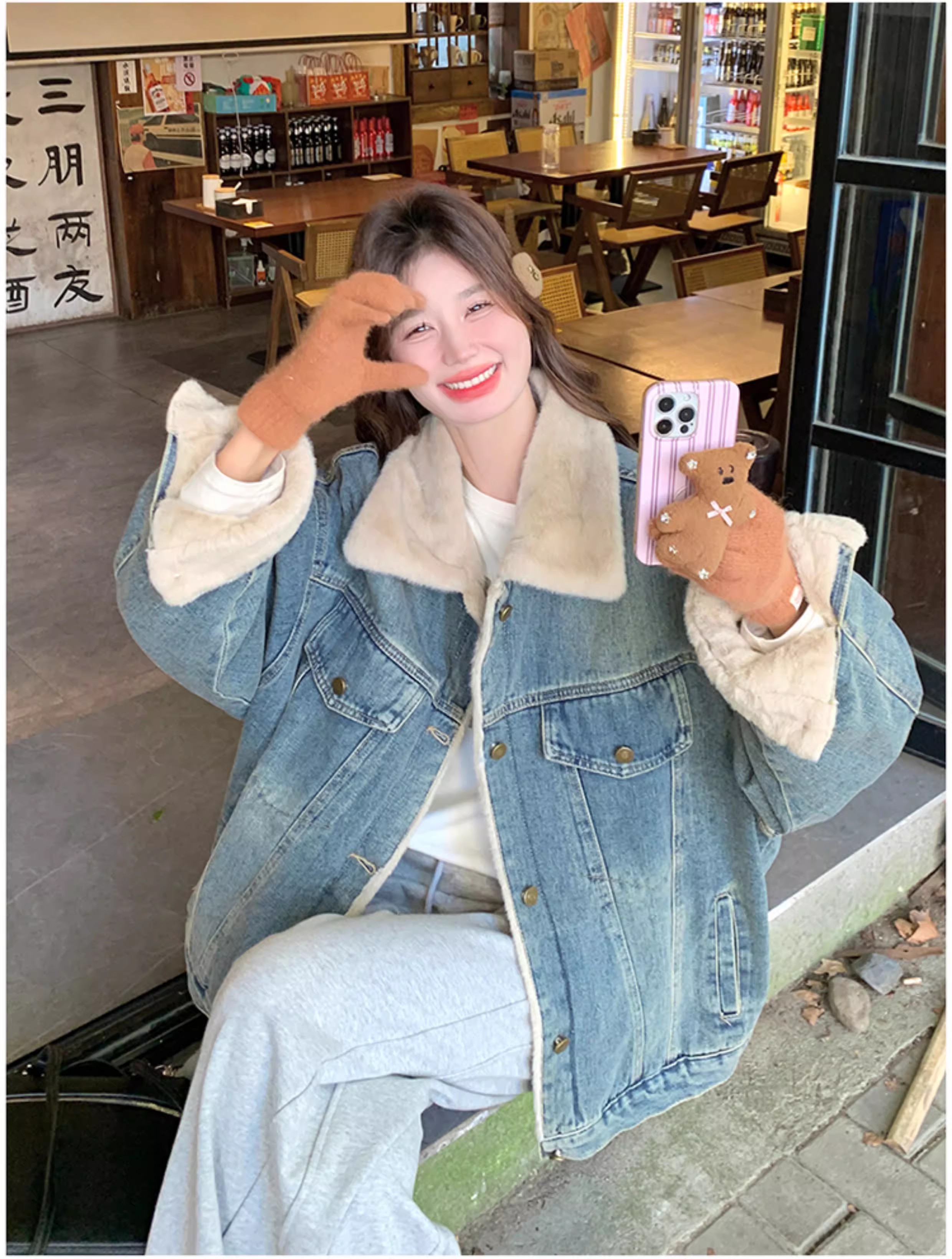 여성용 2025년 겨울 신상 플리스 안감 두꺼운 데님 시어링 코트, 짧은 파카 코트