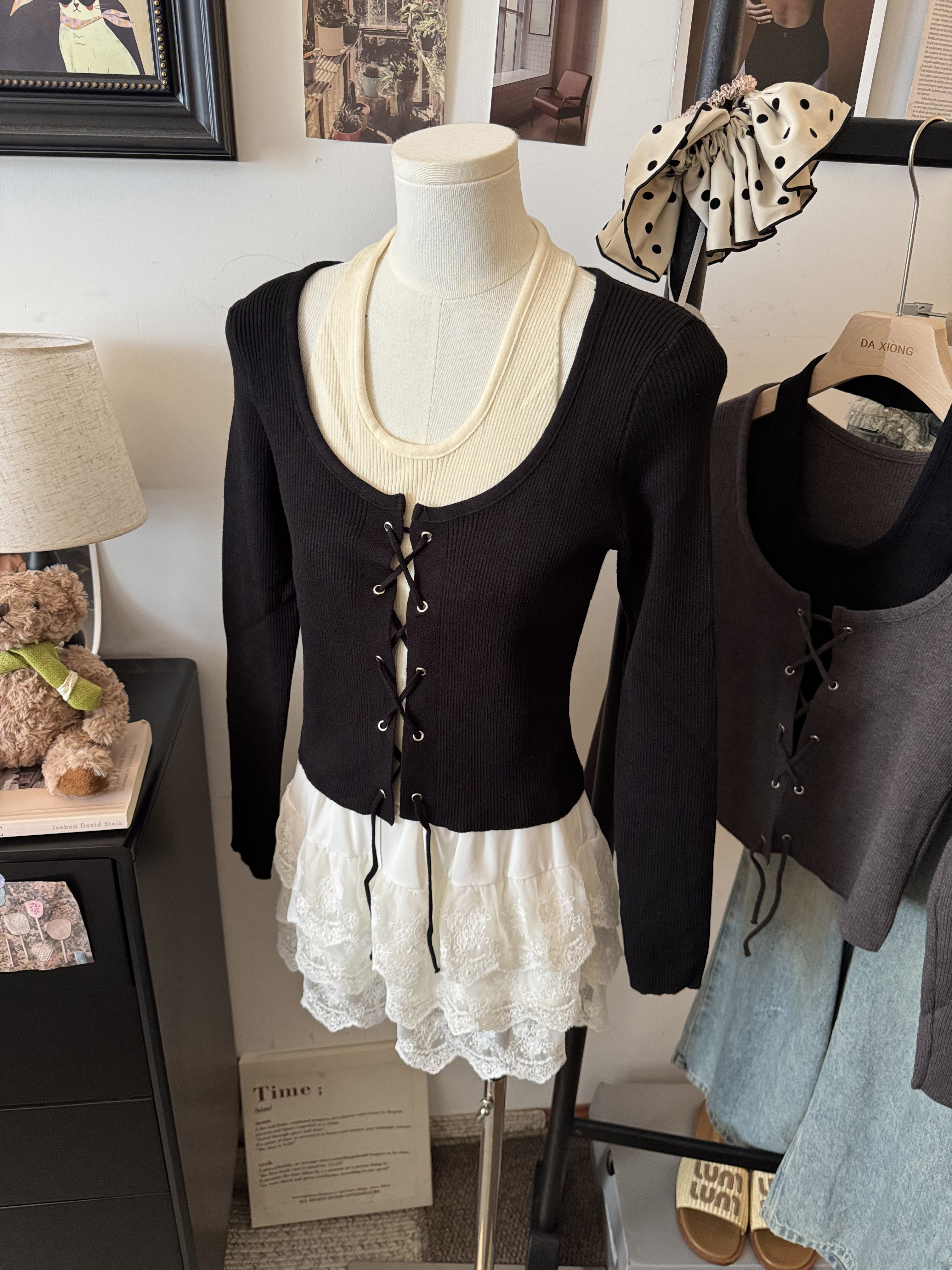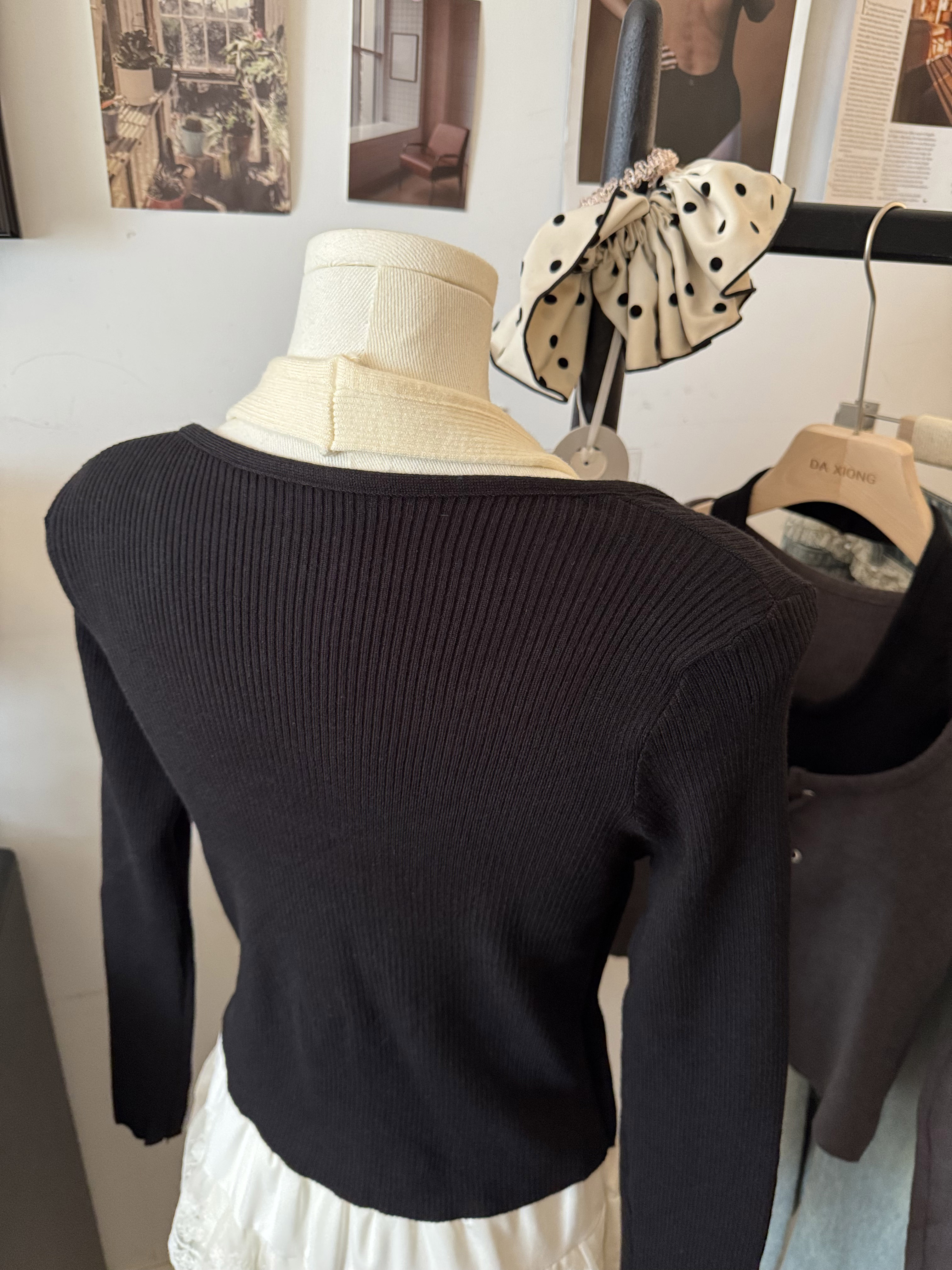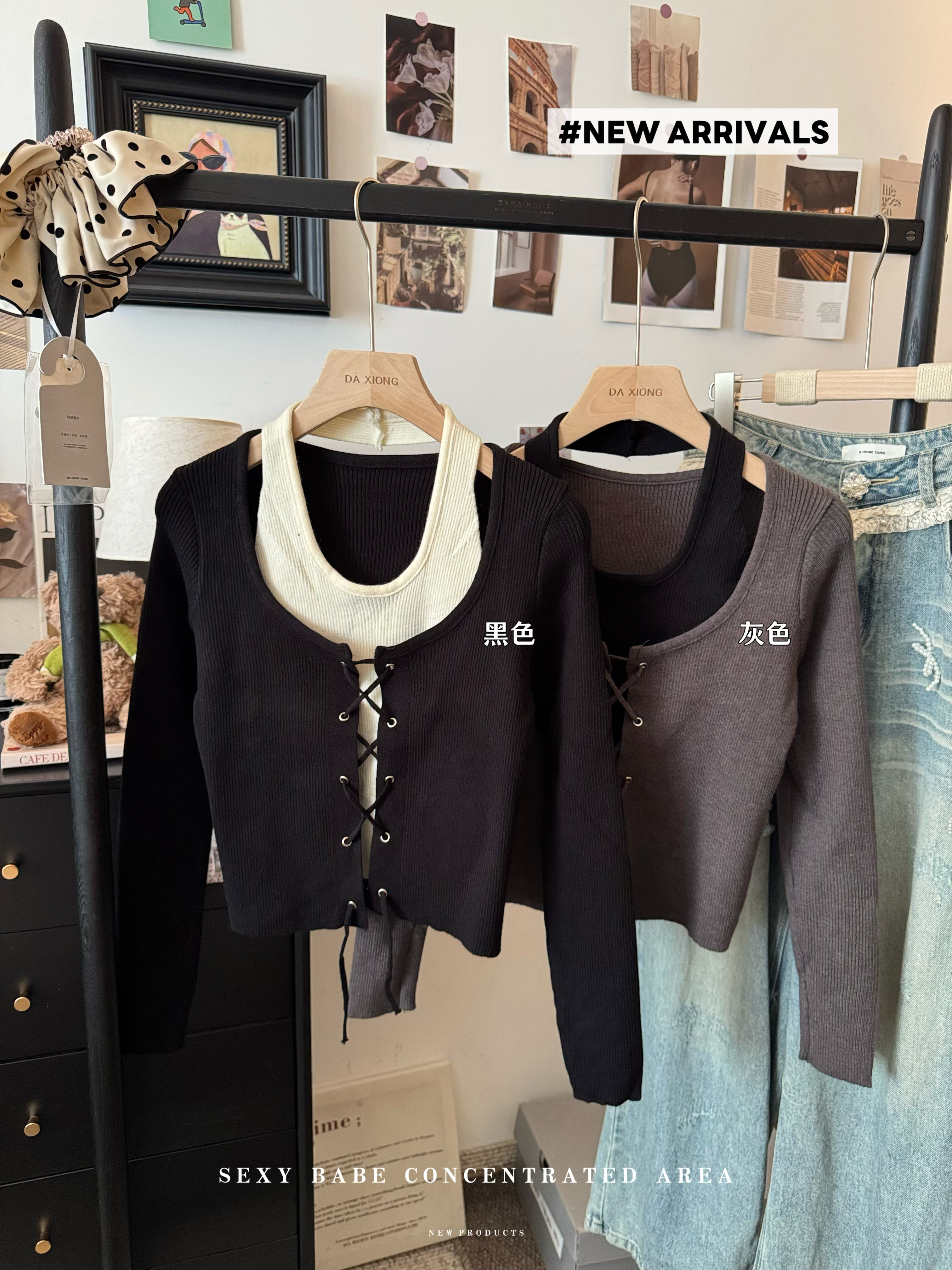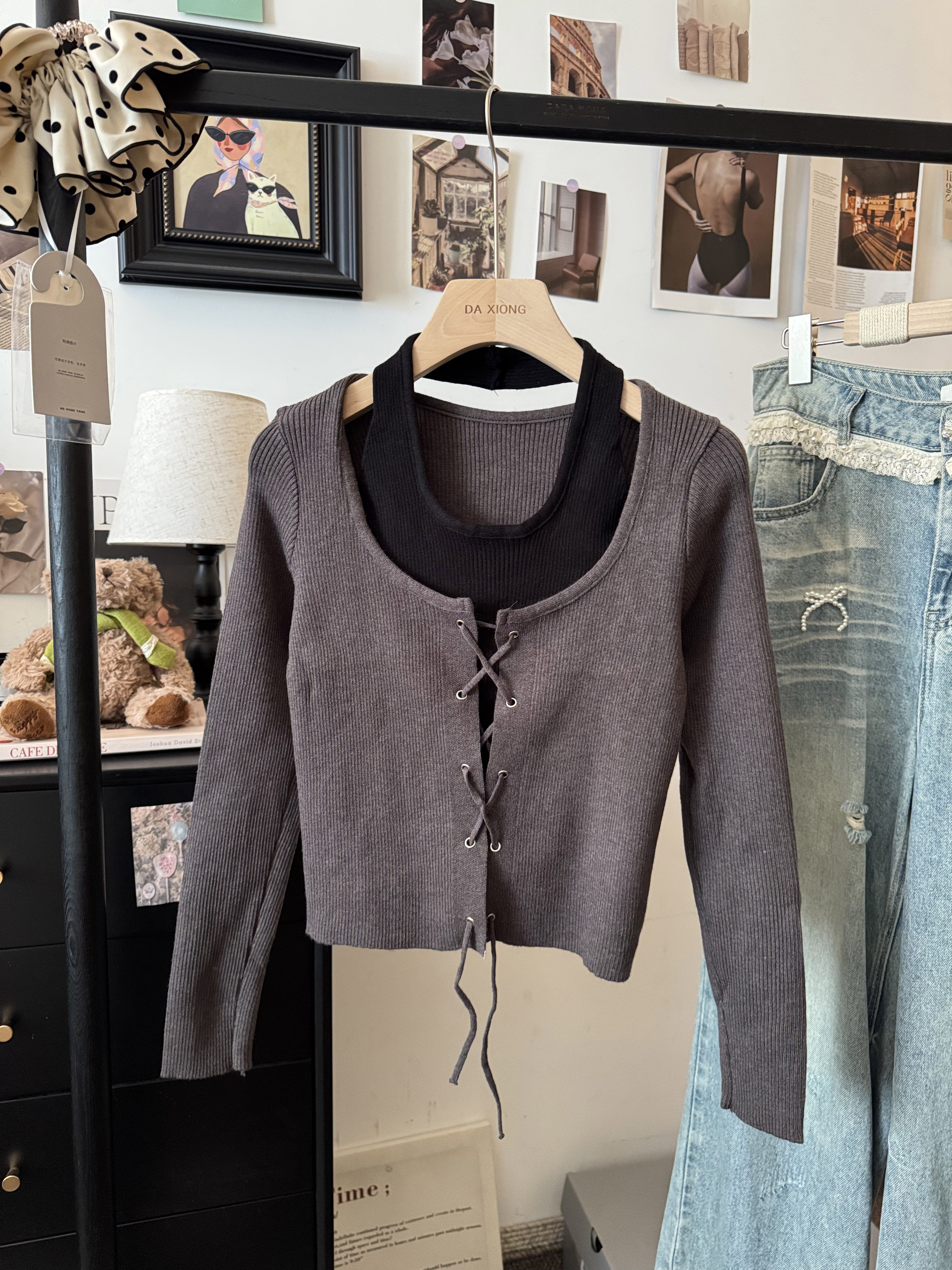 실제 사진~ 홀터넥, 오프숄더, 끈 조절, 투피스처럼 보이는 니트 긴팔 탑, 새로운 가을 스타일, 활용도 높은 이너탑