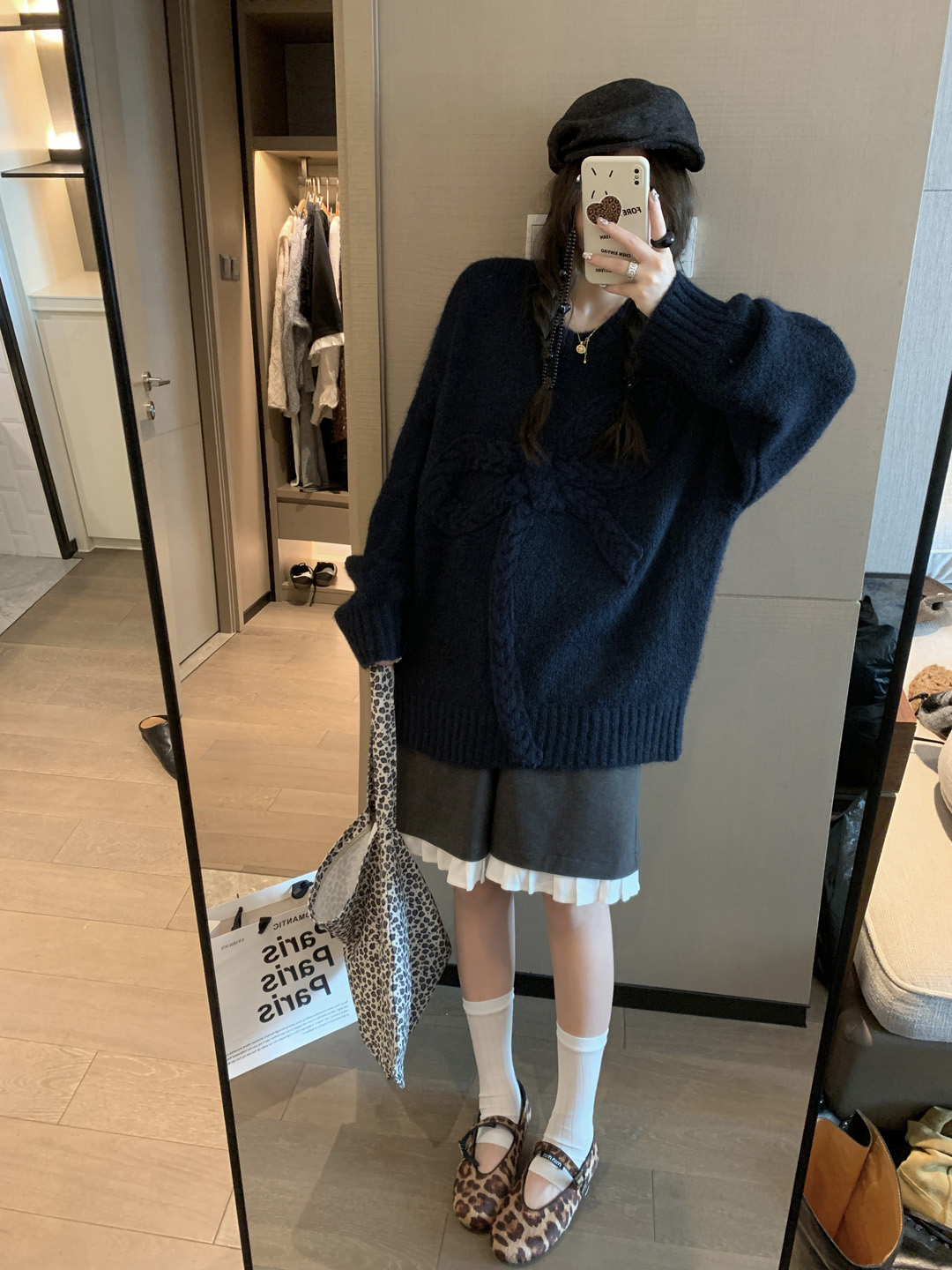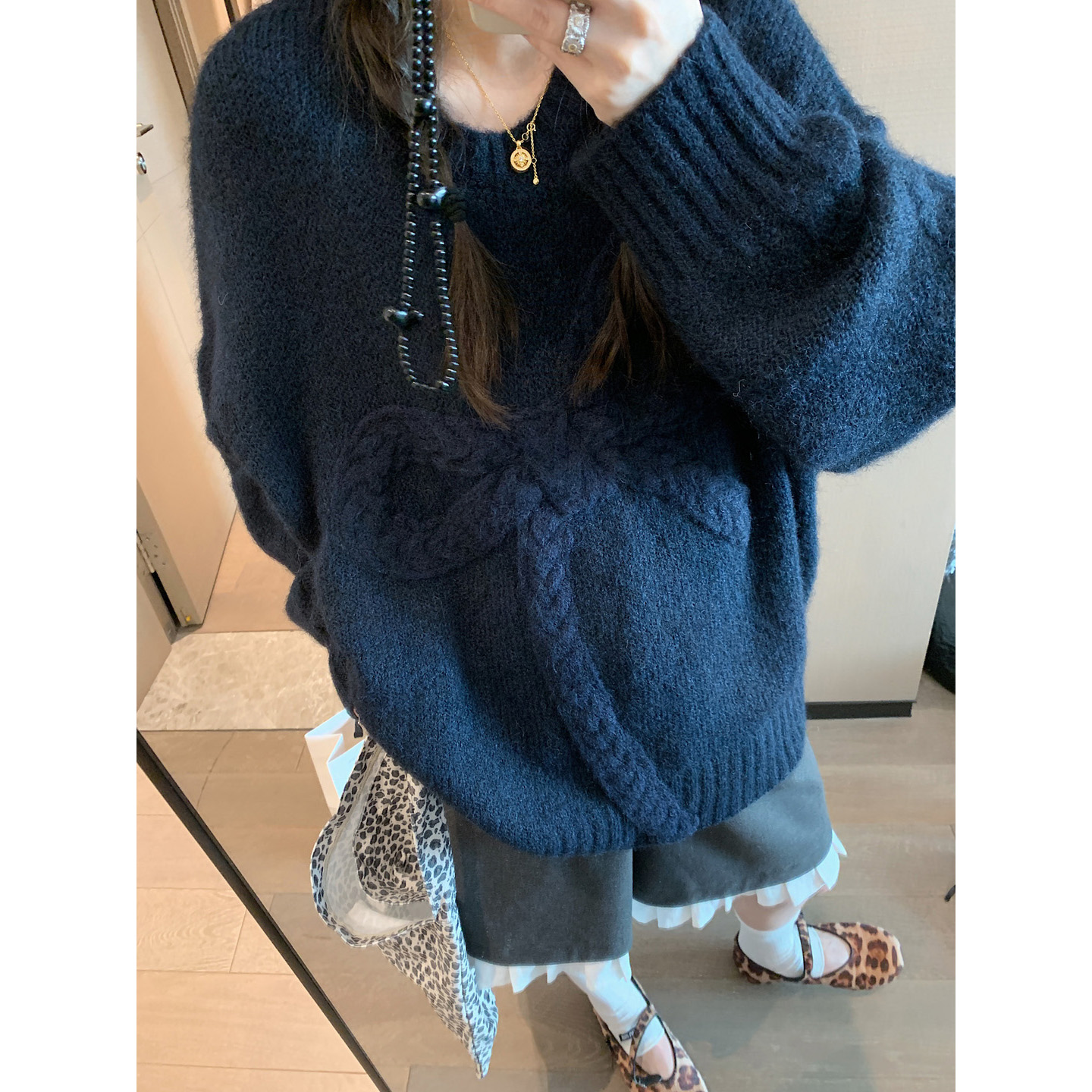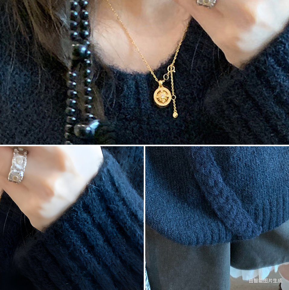 여성용 네이비 블루 3D 리본 스웨터, 2025 가을/겨울 신상, 넉넉하고 편안한 라운드넥, 부드럽고 포근한 니트 소재의 캐주얼 탑.