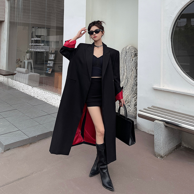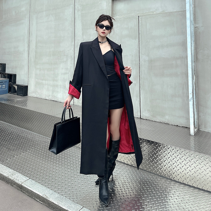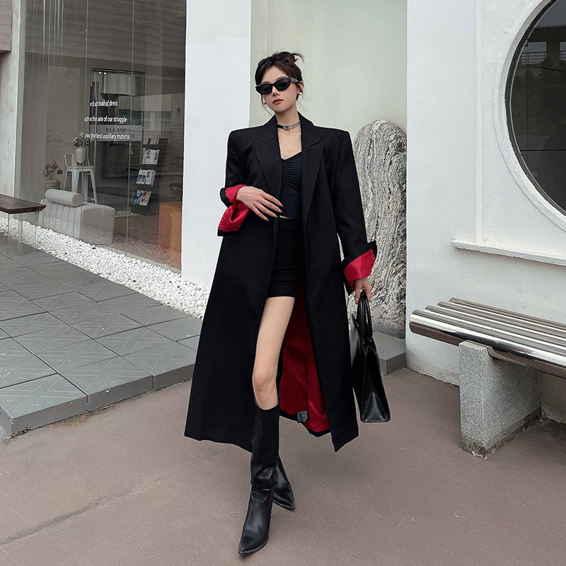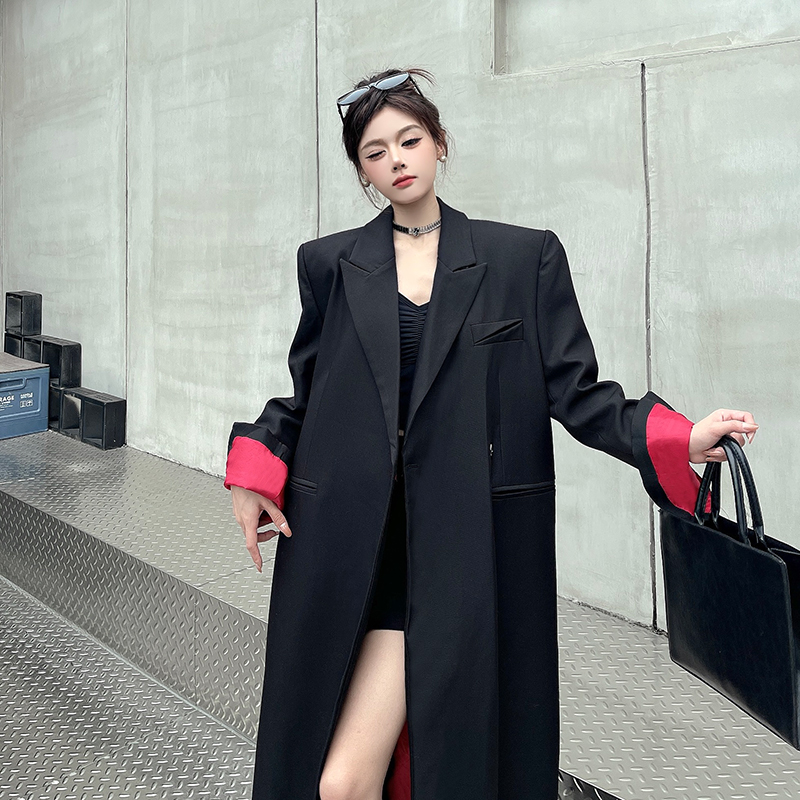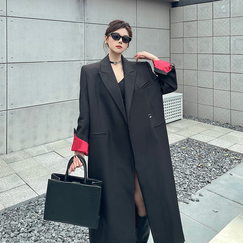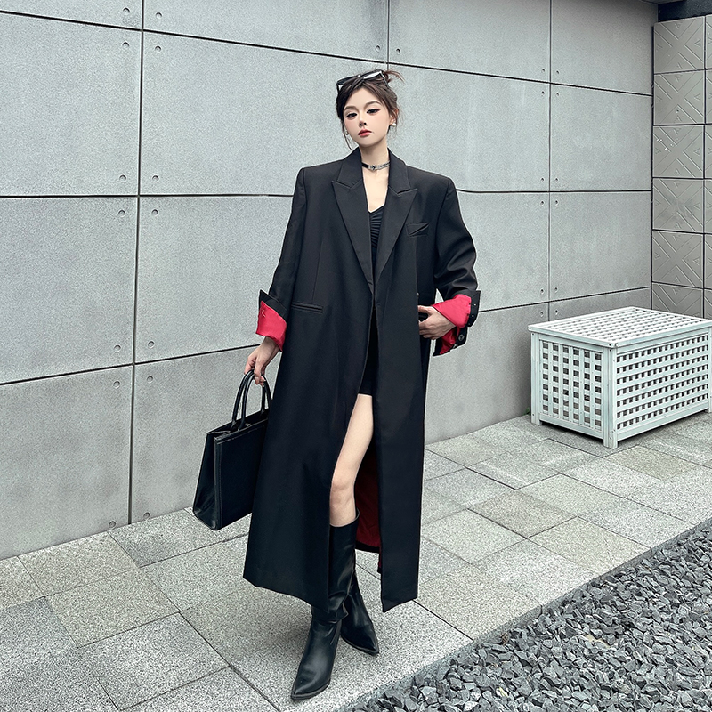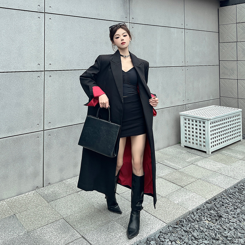 实拍实价黑色红内衬长款西装外套女秋冬加厚高级气场宽松西服大衣