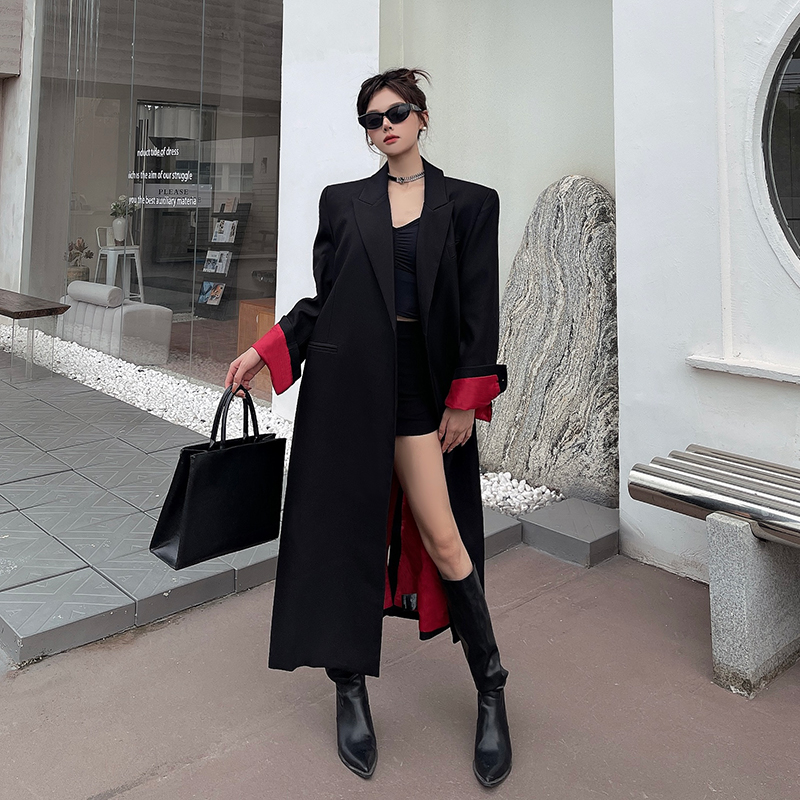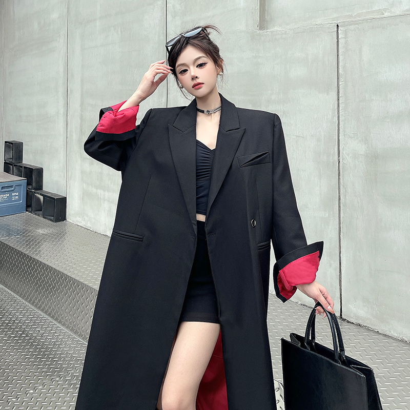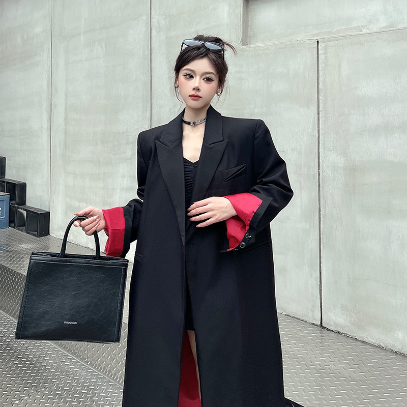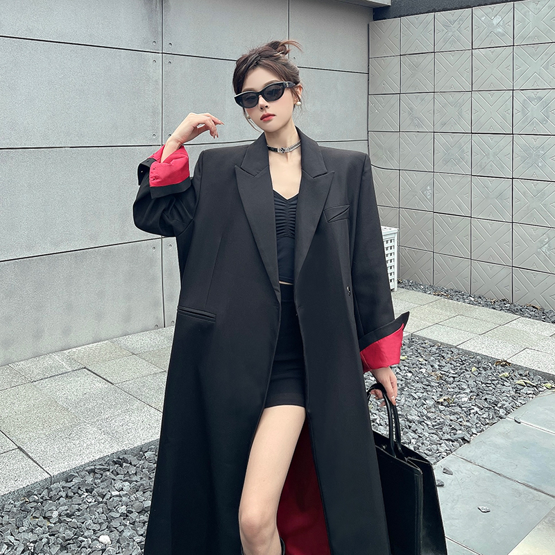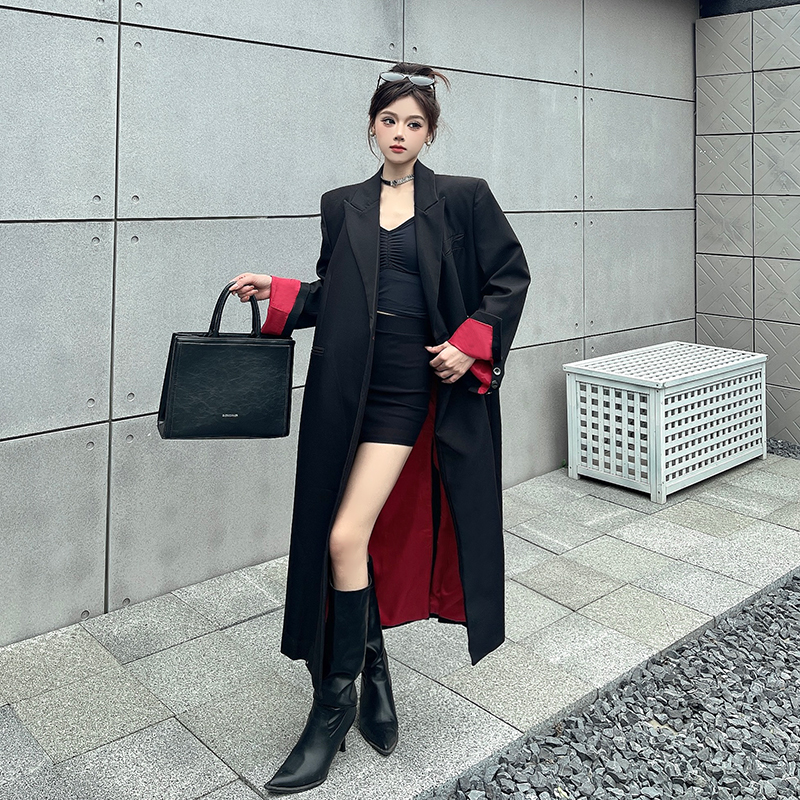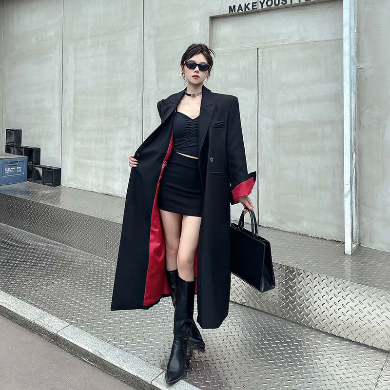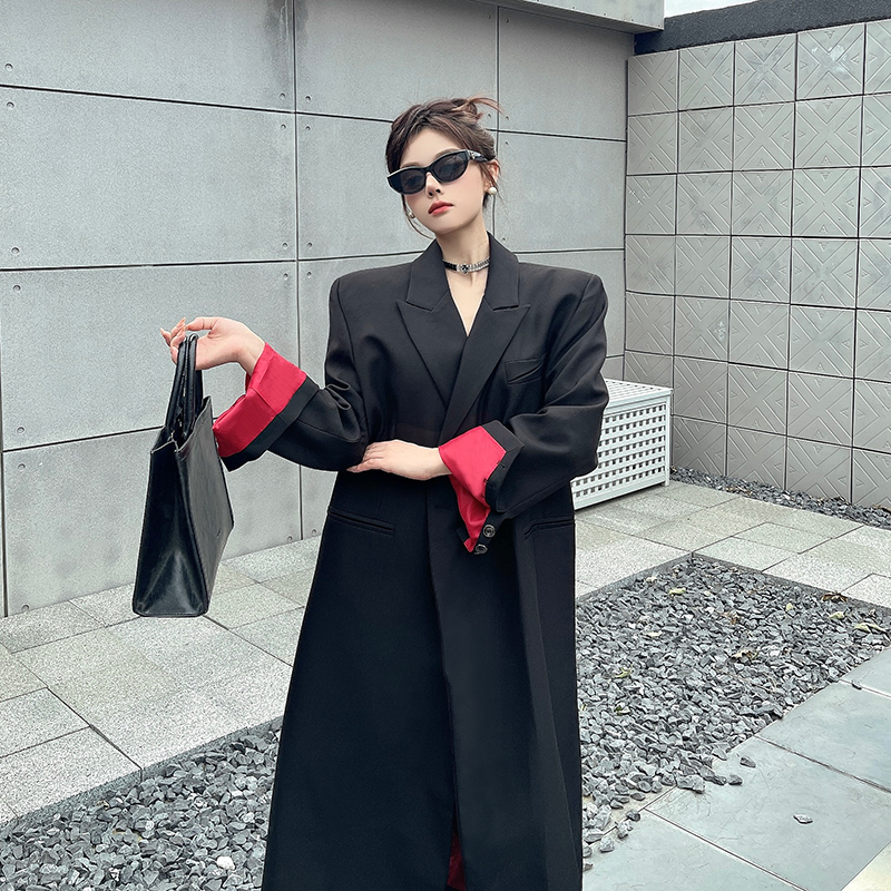 实拍实价黑色红内衬长款西装外套女秋冬加厚高级气场宽松西服大衣