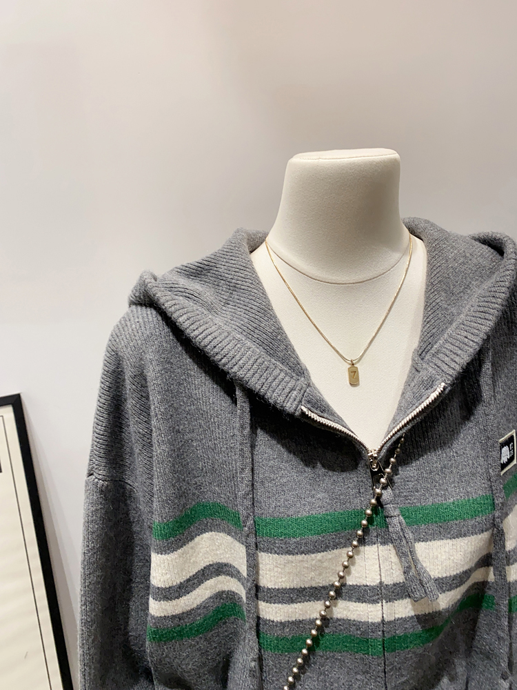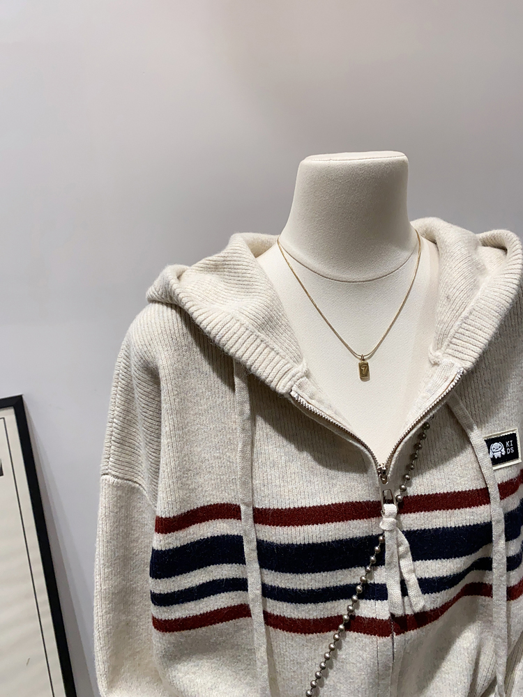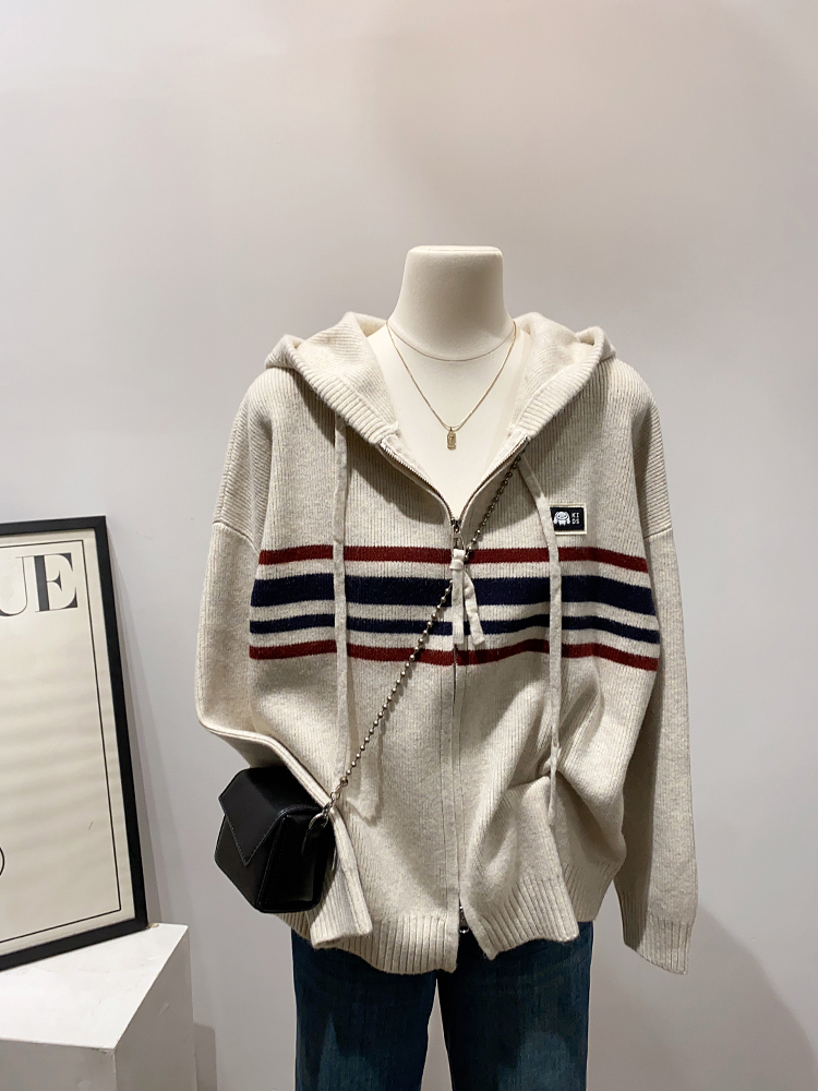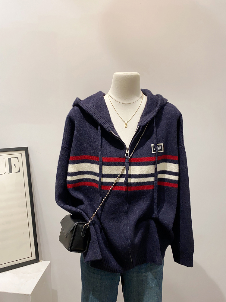 2025년 신상 슬림핏 한국 스타일 스트라이프 후드 니트 가디건 (여성용), 가을/겨울 디자인, 지퍼 포함, 두툼한 코트