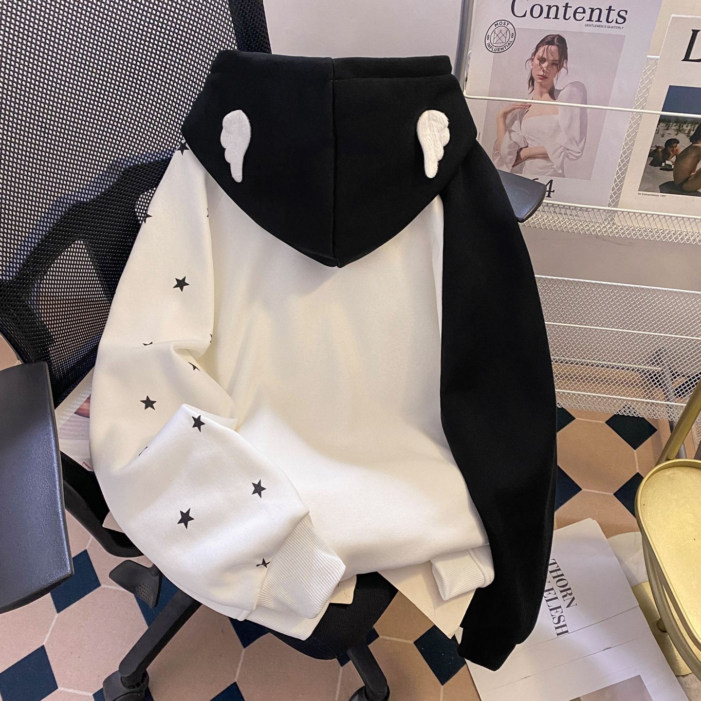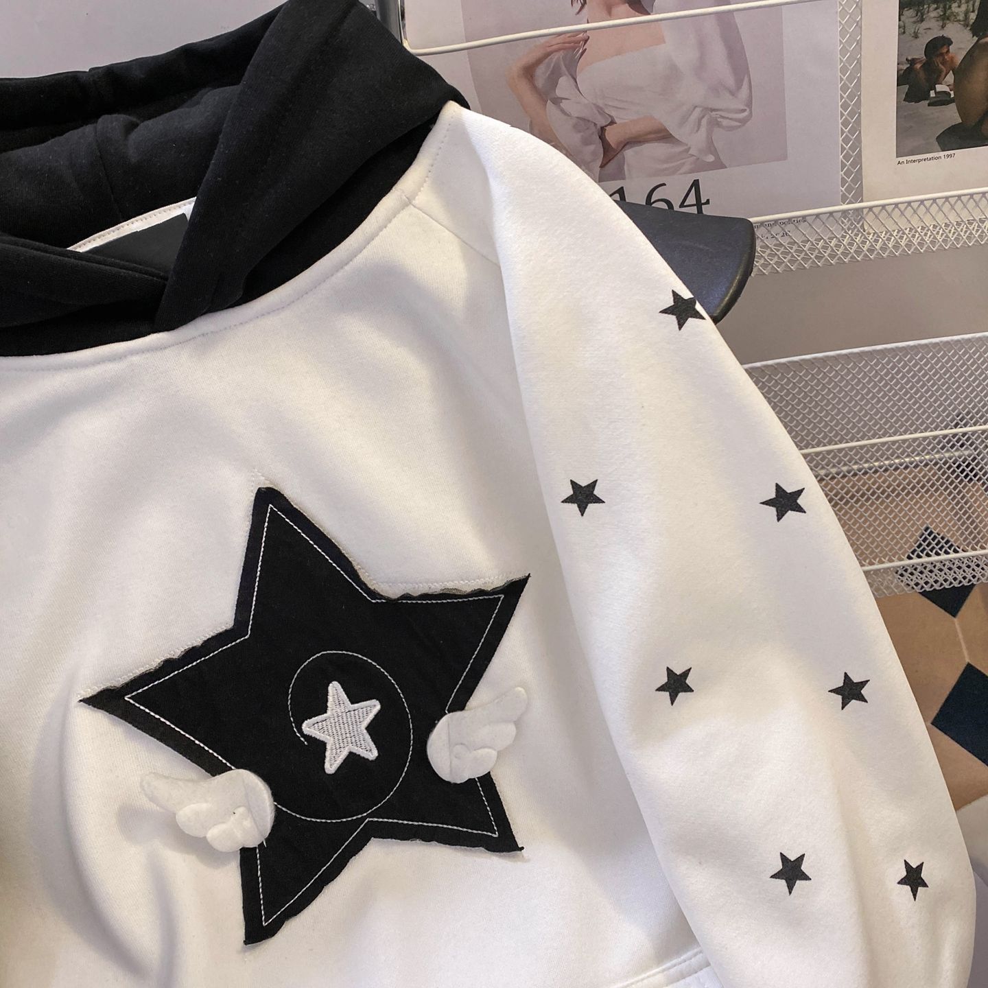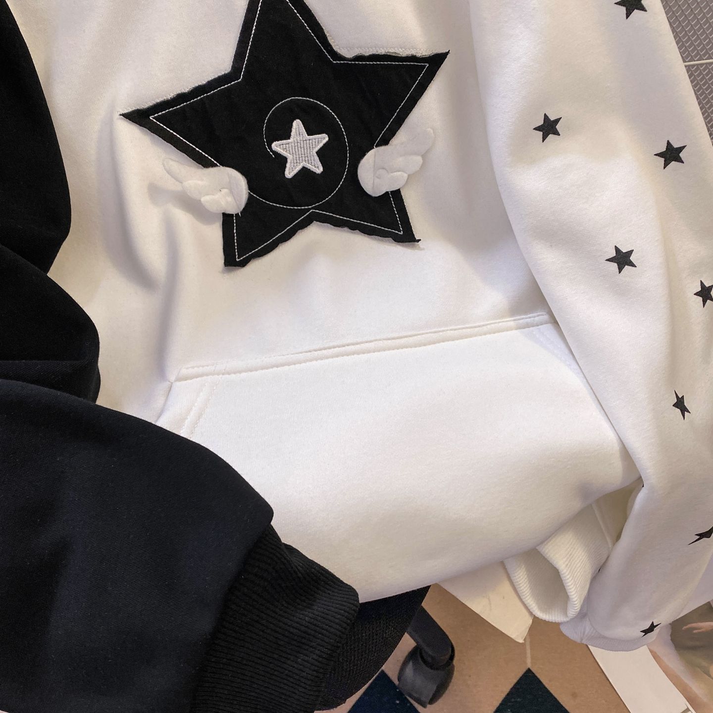 실제 사진입니다. 특별 가격, 오리지널 자수. 화미안 순면 혼방 밀크 실크 소재, 330g. 별과 날개 무늬 스웨트셔츠.