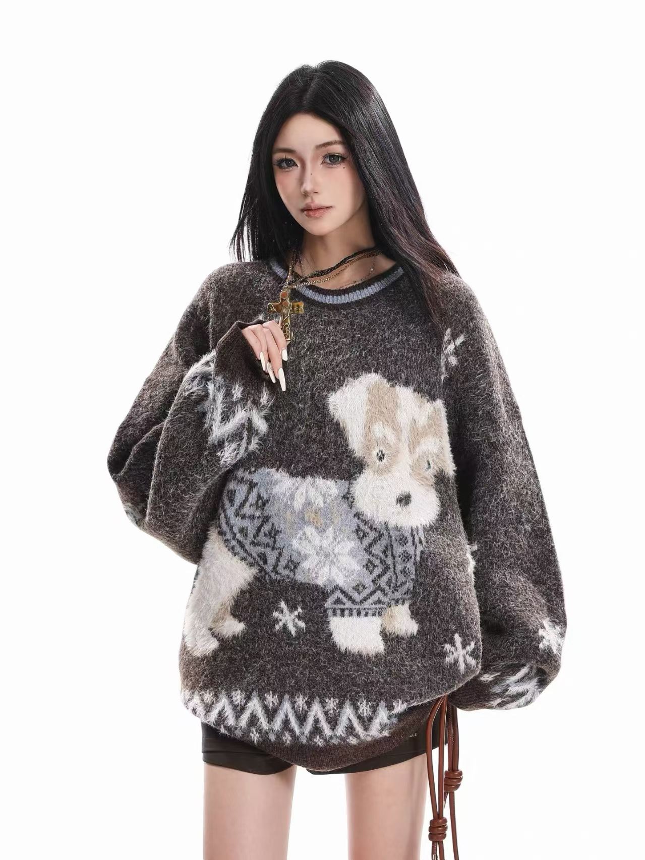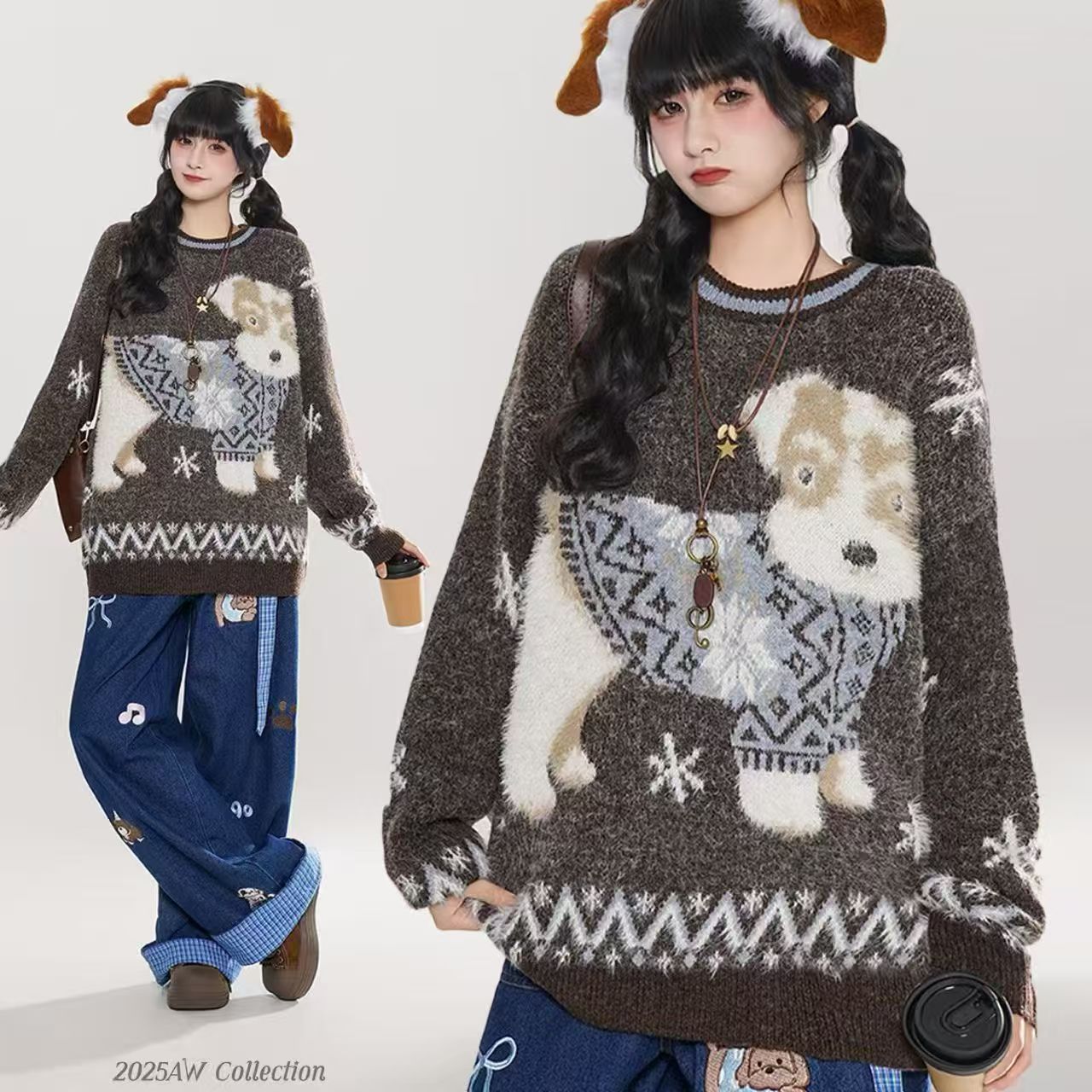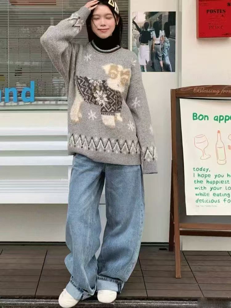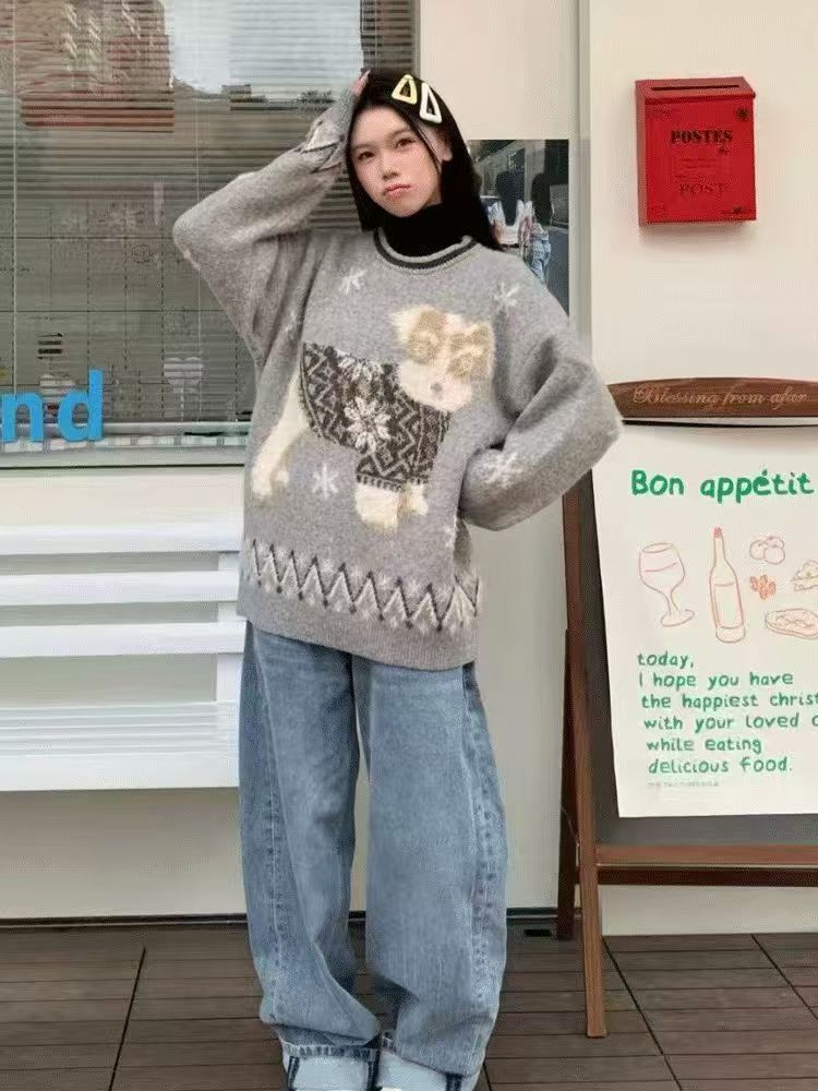 复古小狗提花套头毛衣女秋冬慵懒风显瘦宽松保暖针织上衣