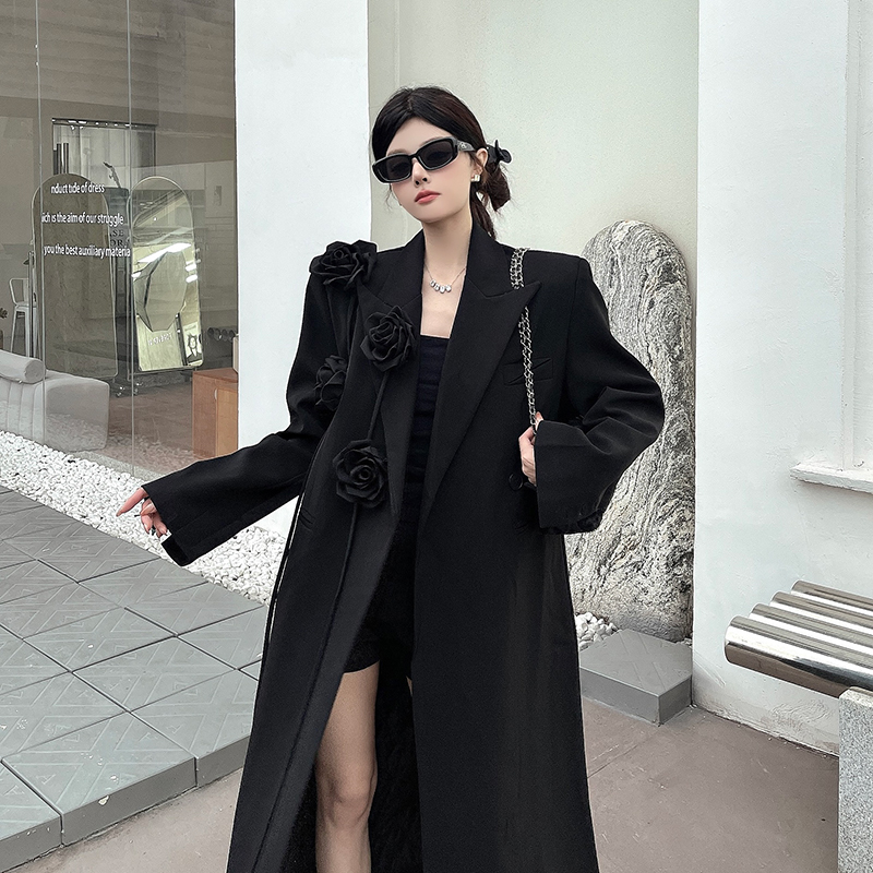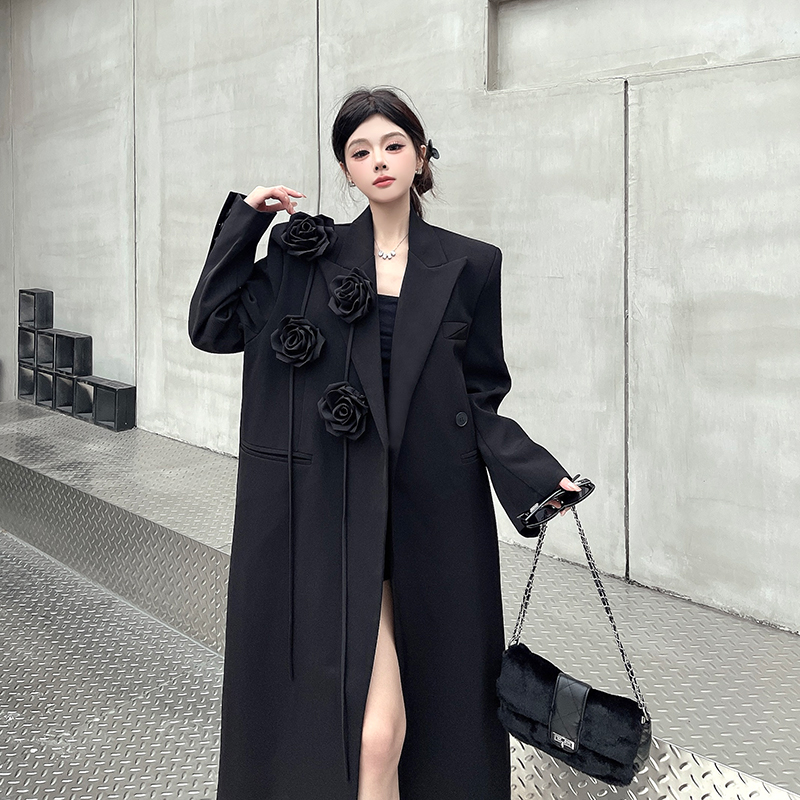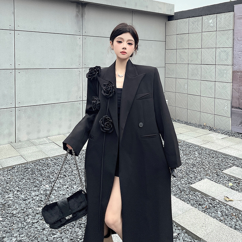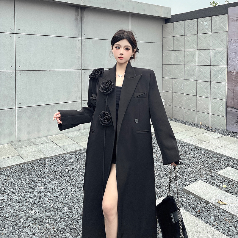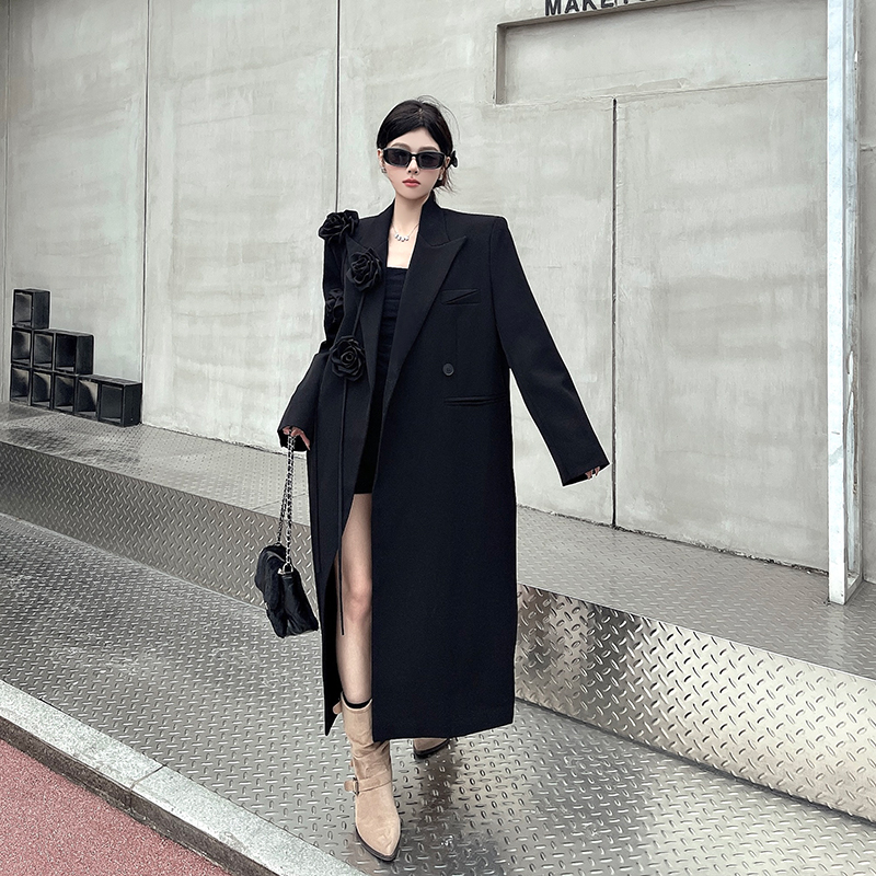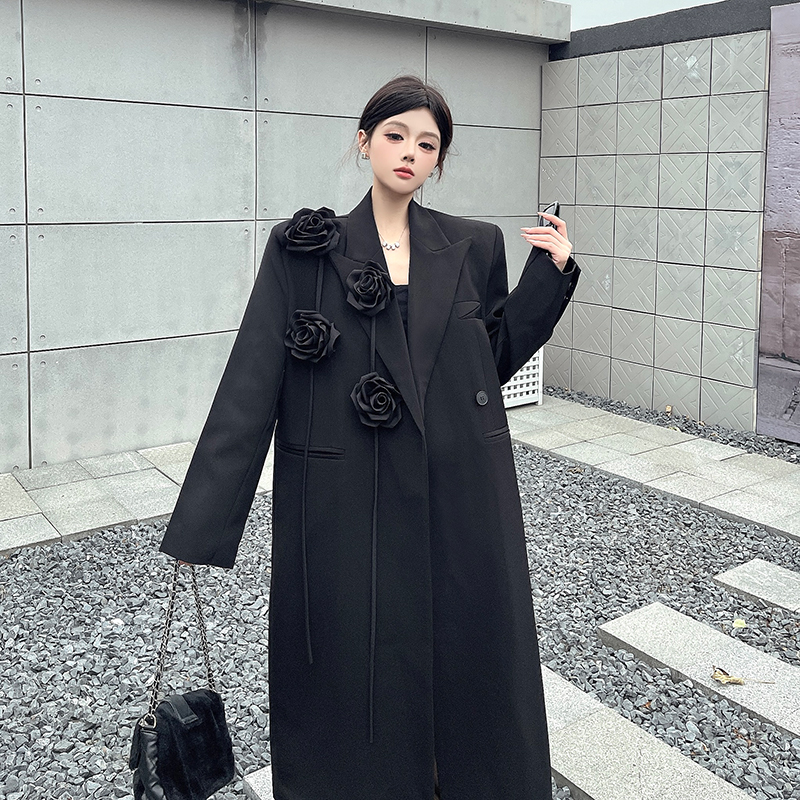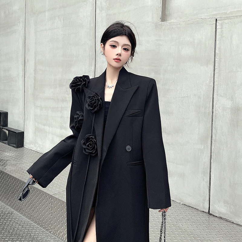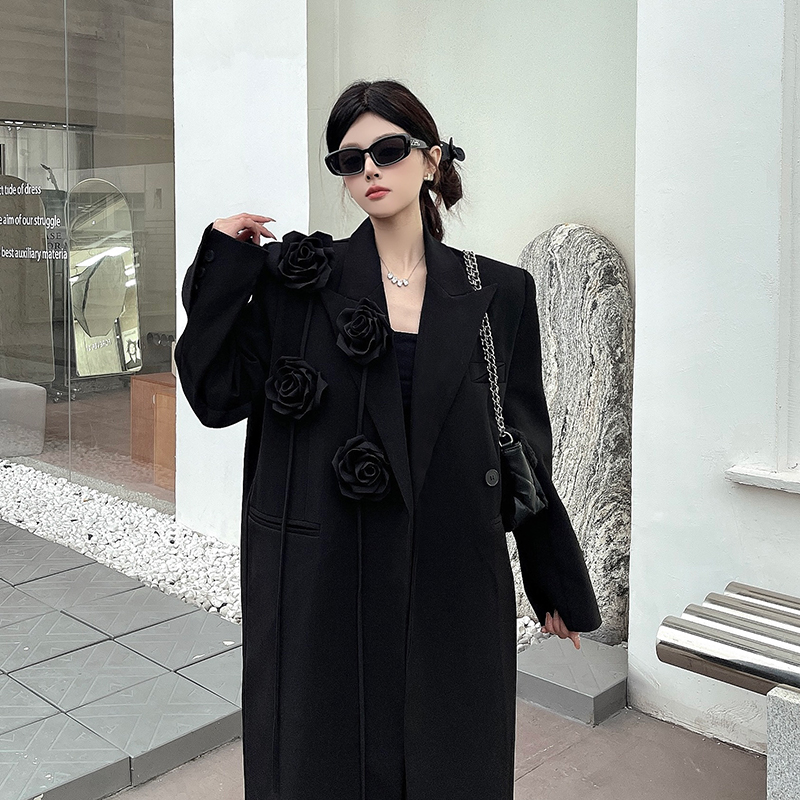 실제 사진, 실제 가격, 여성용 블랙 롱 수트 재킷, 고급스럽고 넉넉한 핏, 도톰한 소재, 입체적인 꽃무늬 패턴의 헤비듀티 수트 코트.