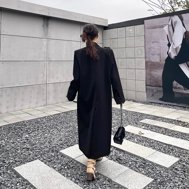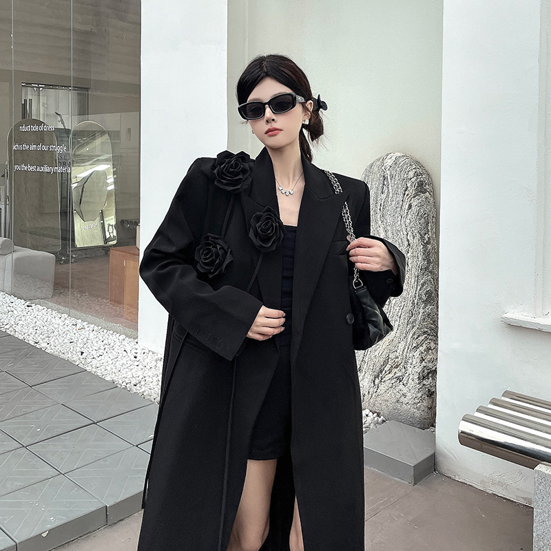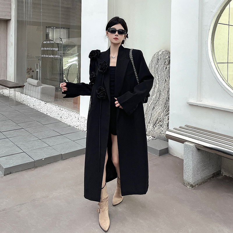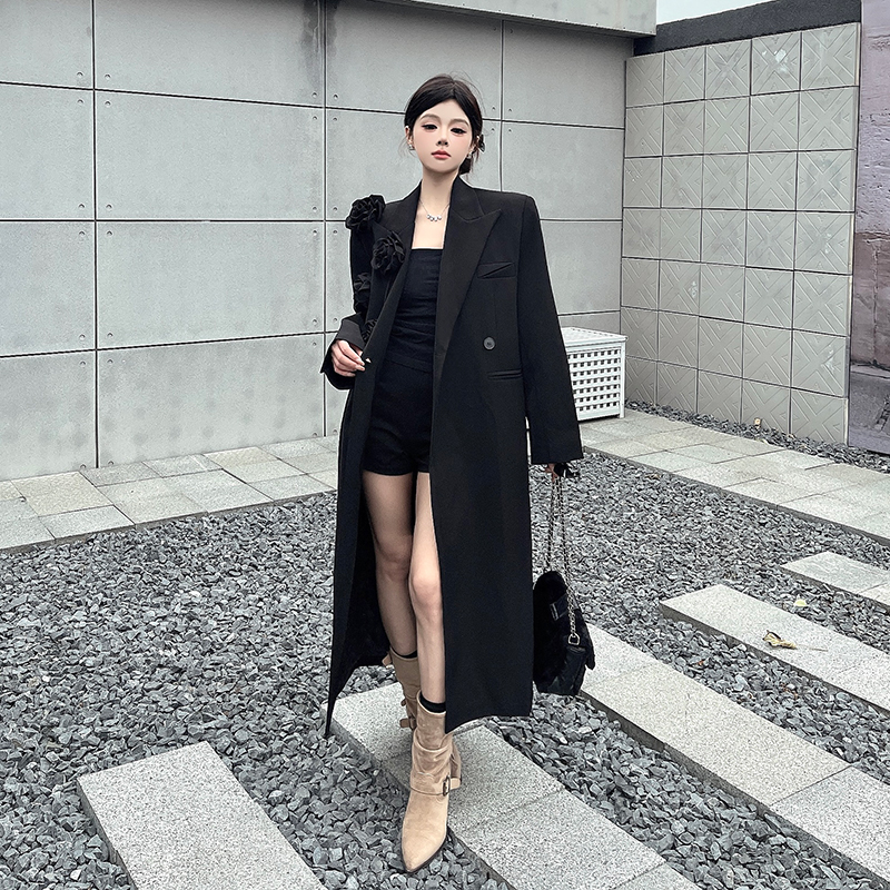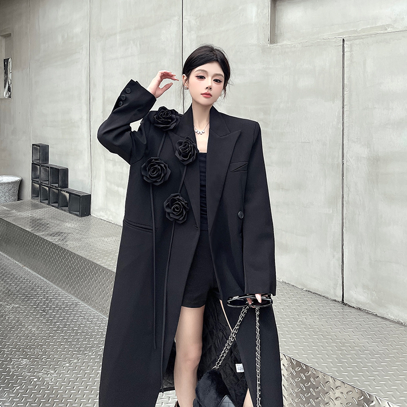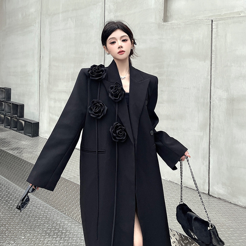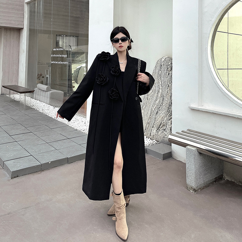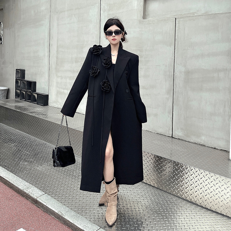 실제 사진, 실제 가격, 여성용 블랙 롱 수트 재킷, 고급스럽고 넉넉한 핏, 도톰한 소재, 입체적인 꽃무늬 패턴의 헤비듀티 수트 코트.