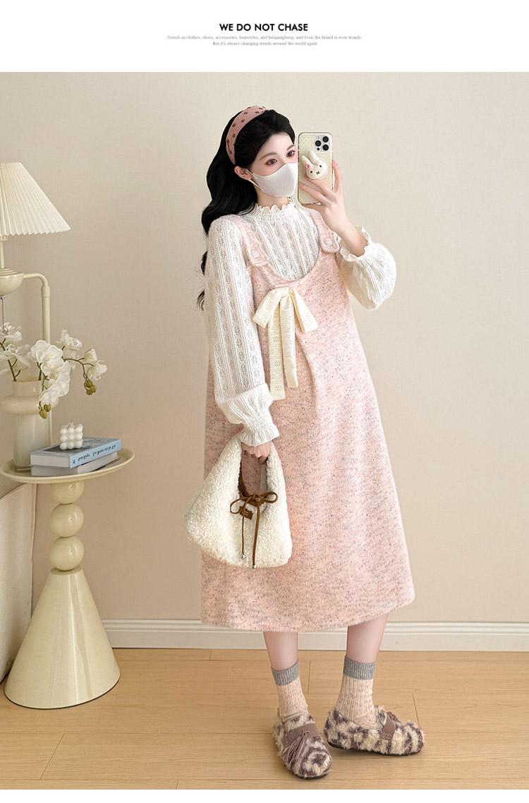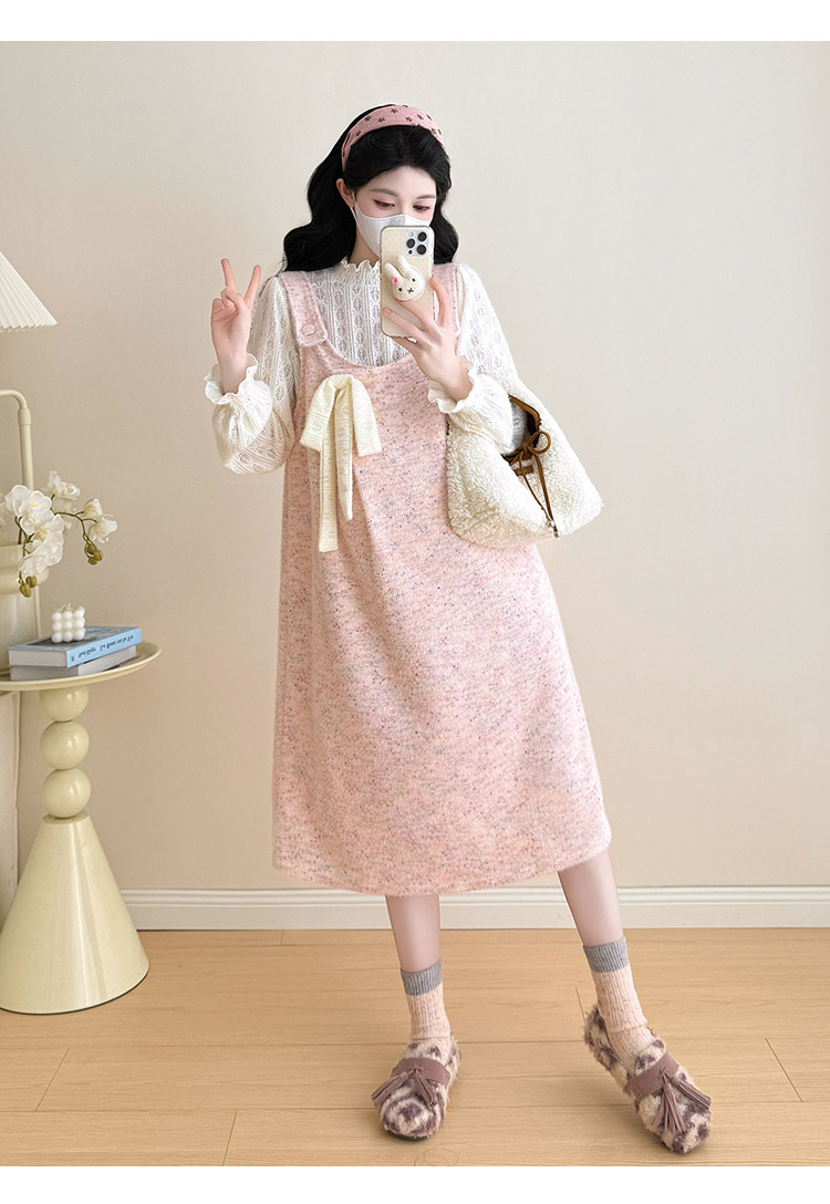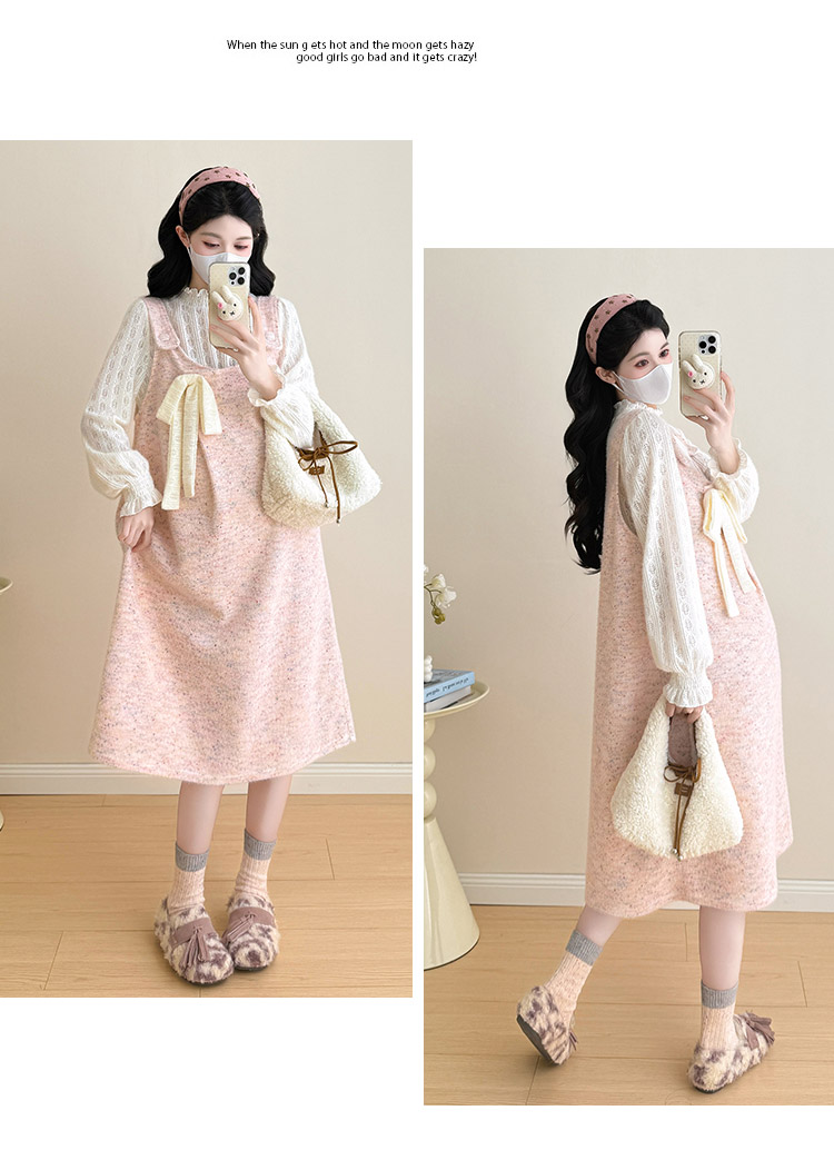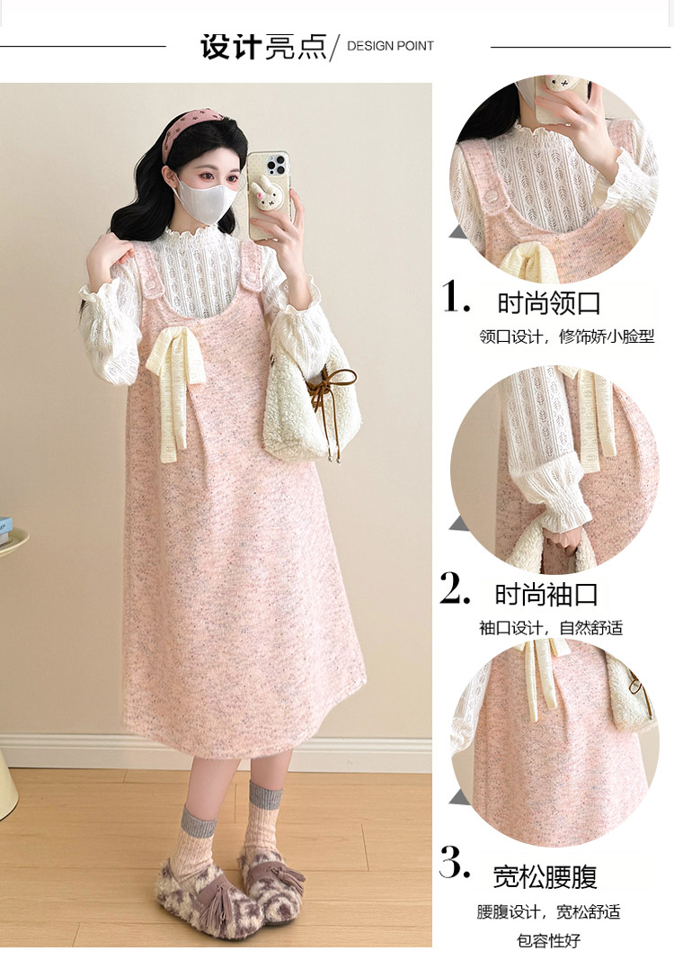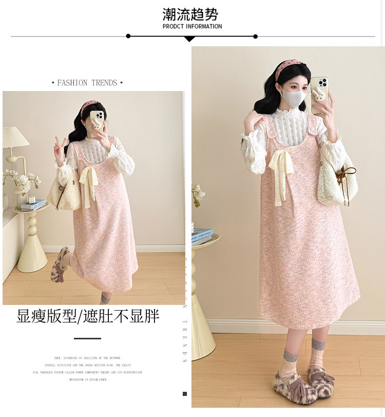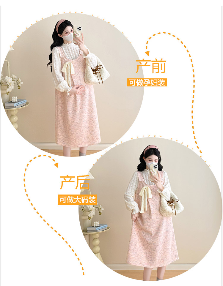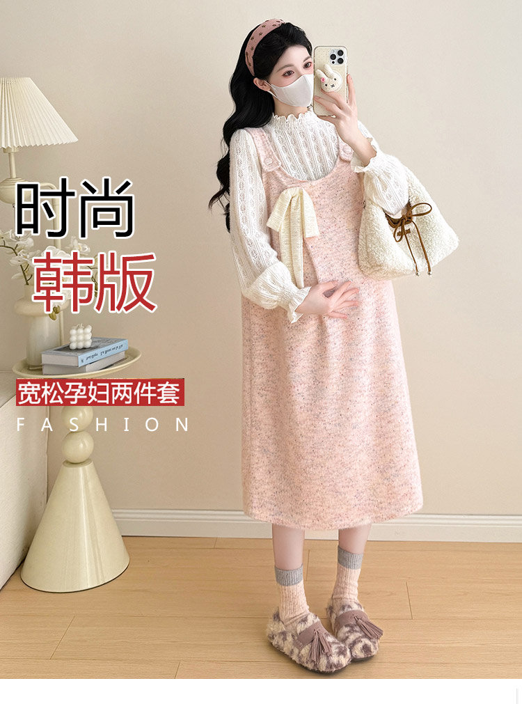 实拍2025秋冬新款孕妇装蕾丝打底上衣+蝴蝶结粉色减龄背带裙套装