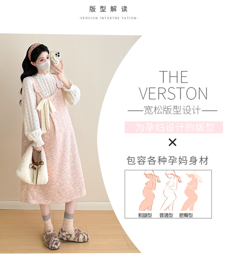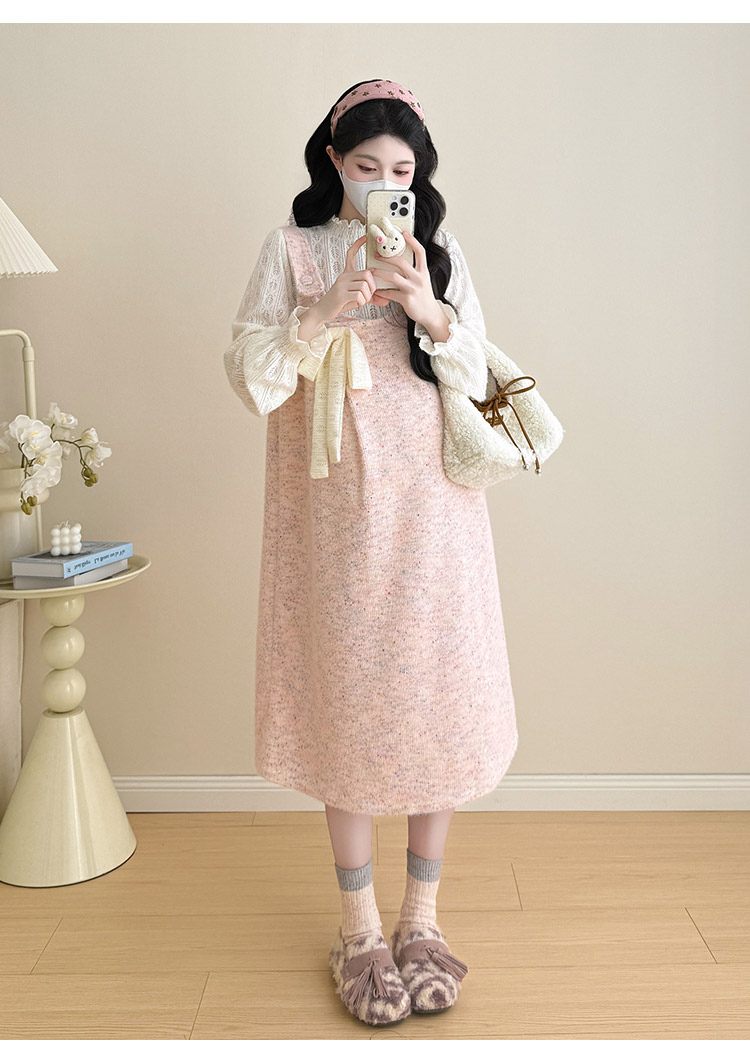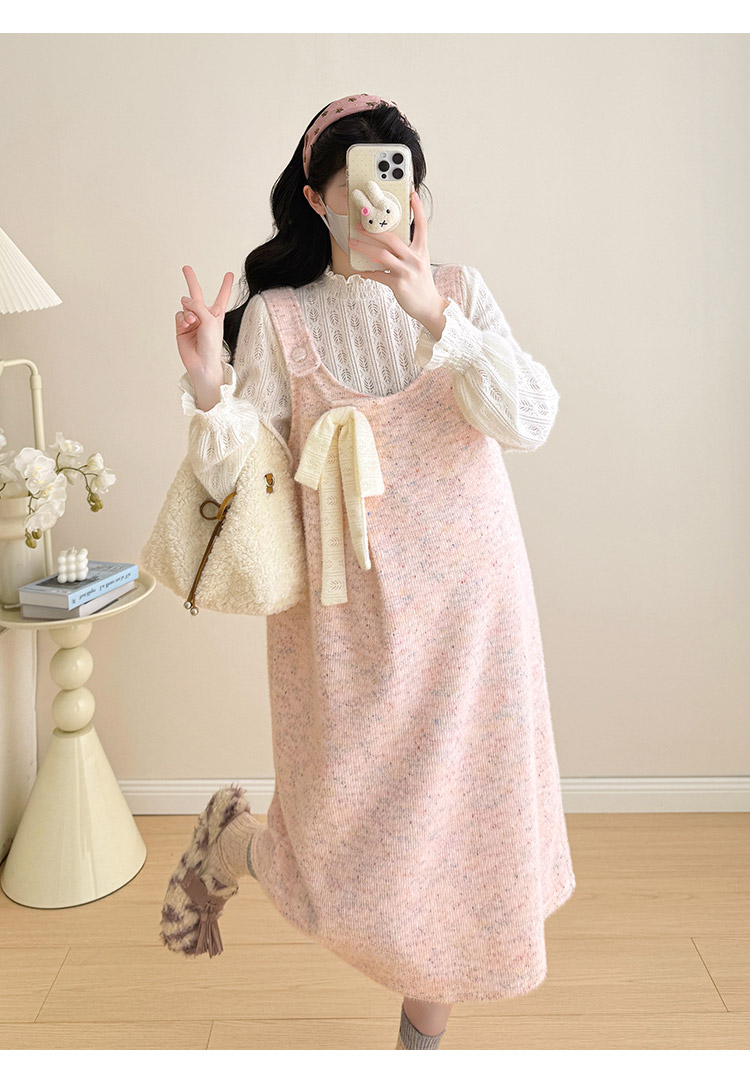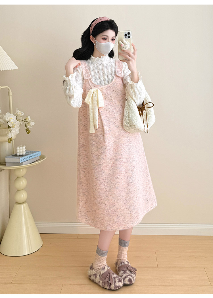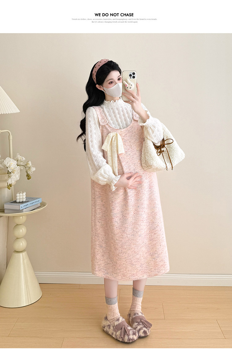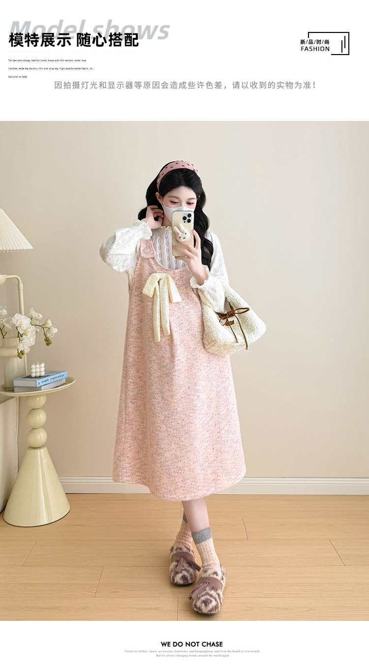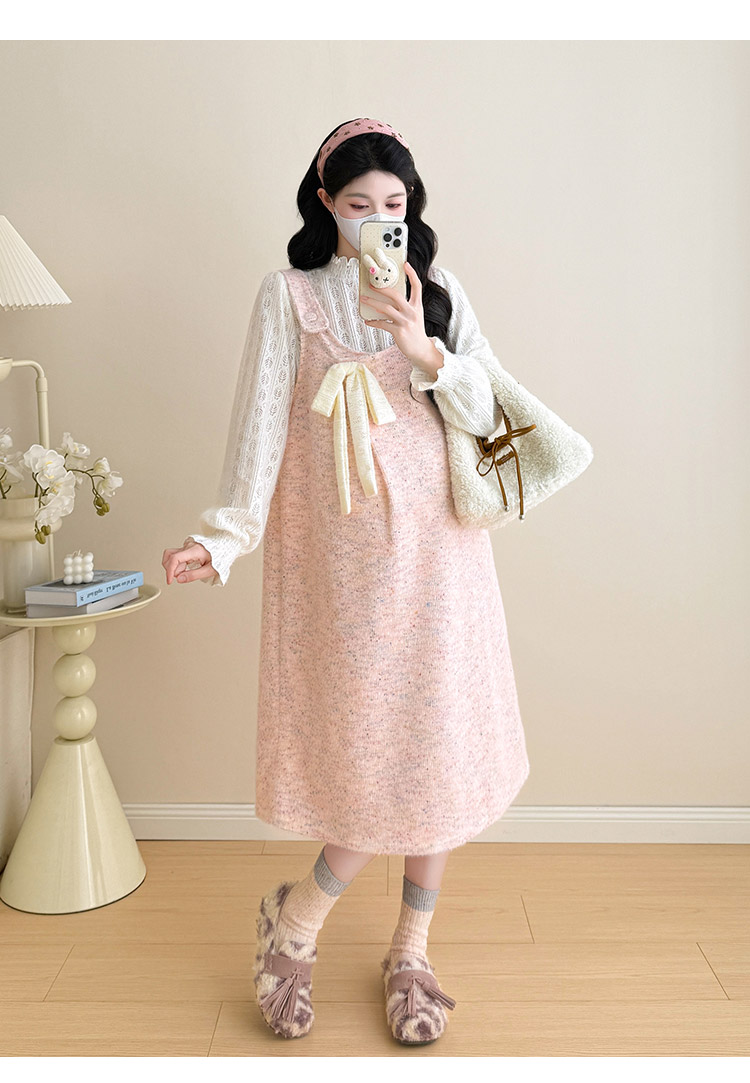 实拍2025秋冬新款孕妇装蕾丝打底上衣+蝴蝶结粉色减龄背带裙套装