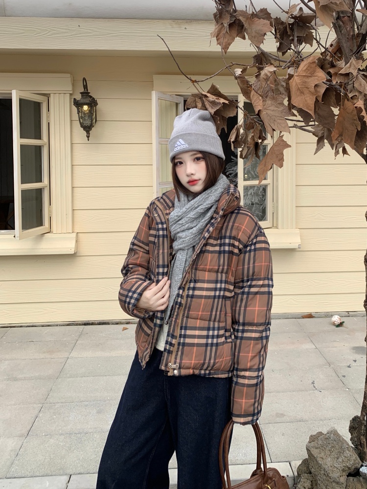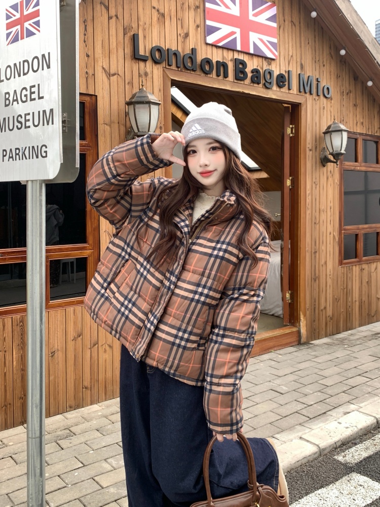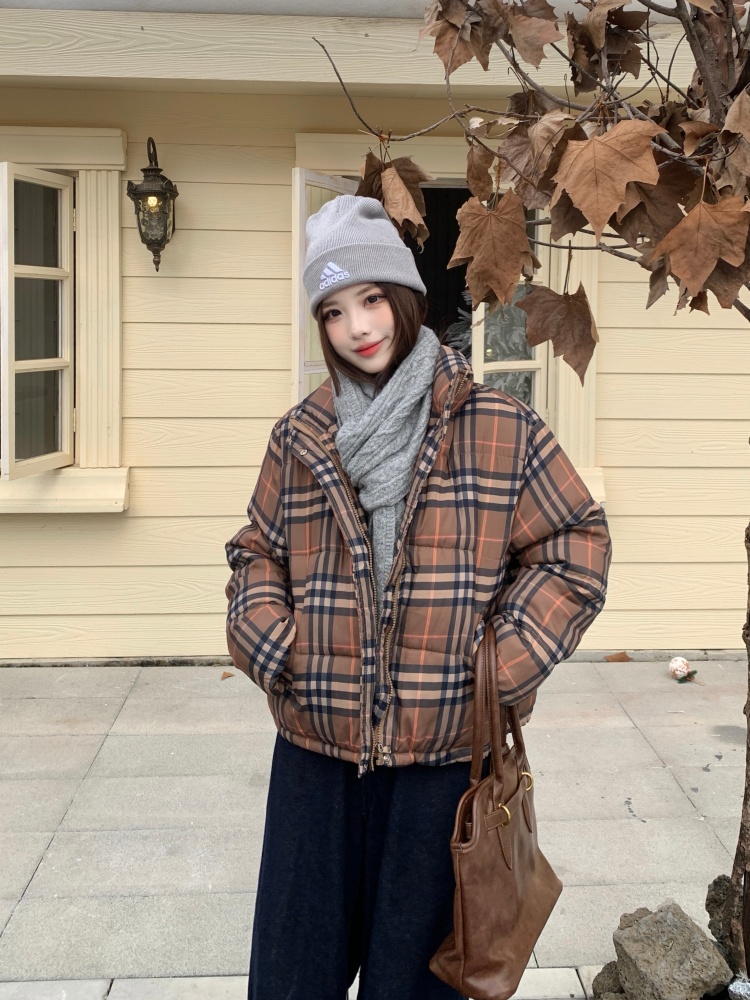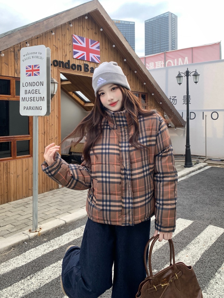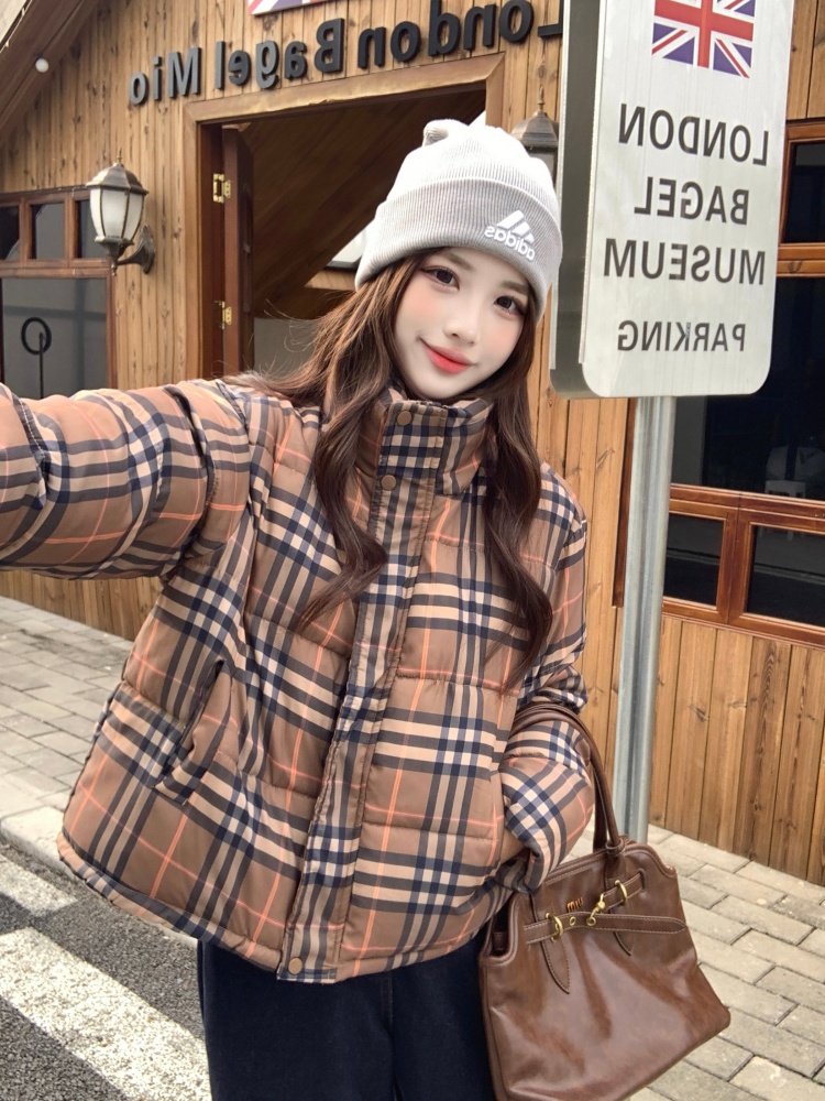 여성용 체크무늬 면 패딩 숏코트, 2025년 겨울 신상 한국 스타일, 갈색 패딩 코트, 스탠드 칼라, 루즈핏 패딩 재킷