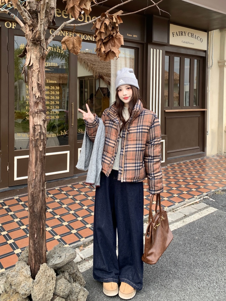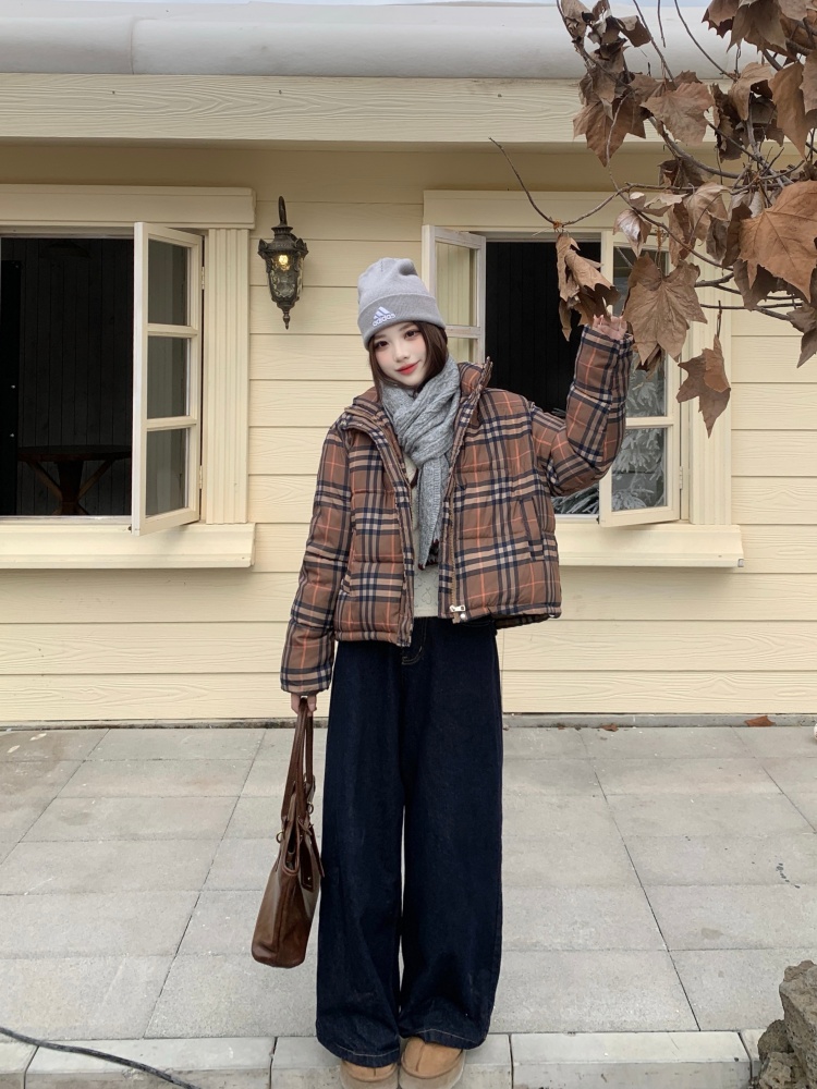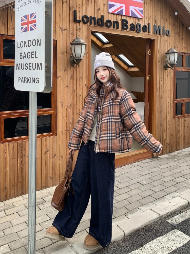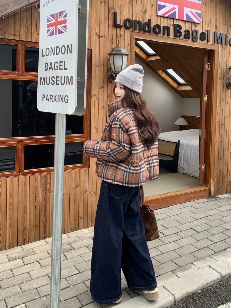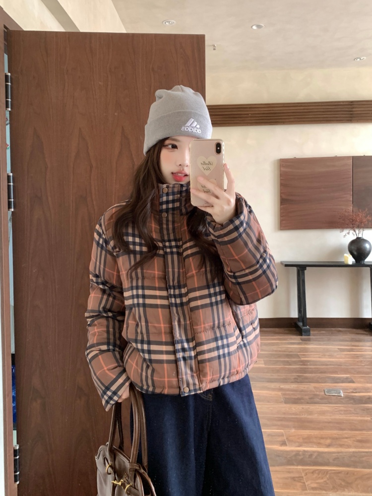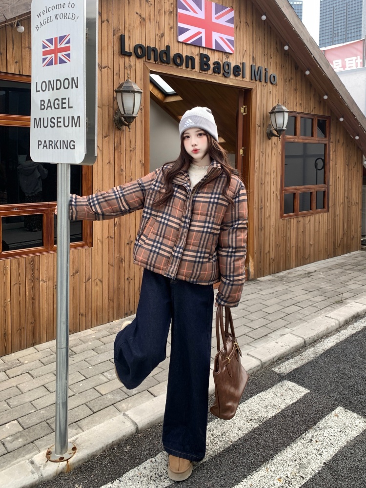 여성용 체크무늬 면 패딩 숏코트, 2025년 겨울 신상 한국 스타일, 갈색 패딩 코트, 스탠드 칼라, 루즈핏 패딩 재킷