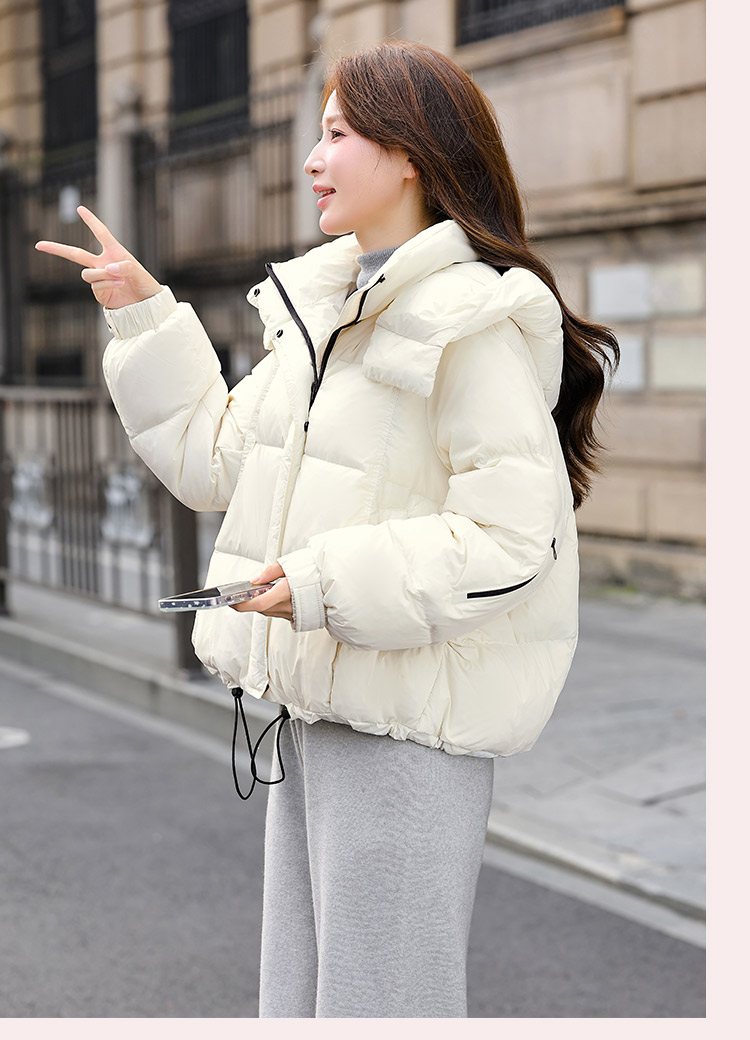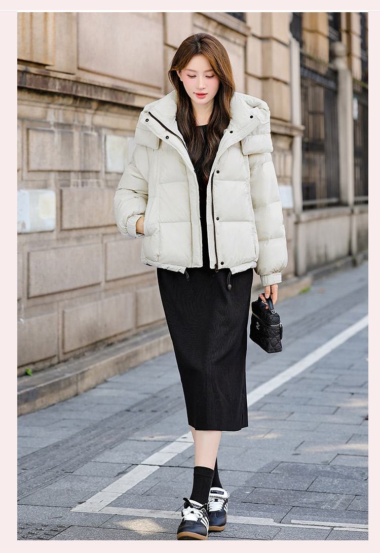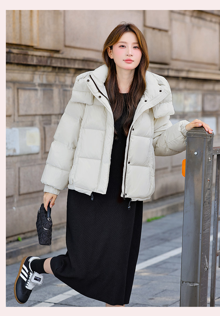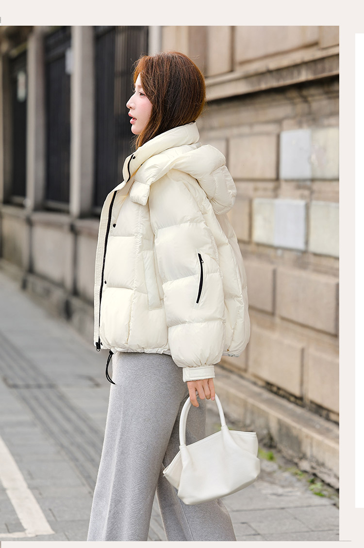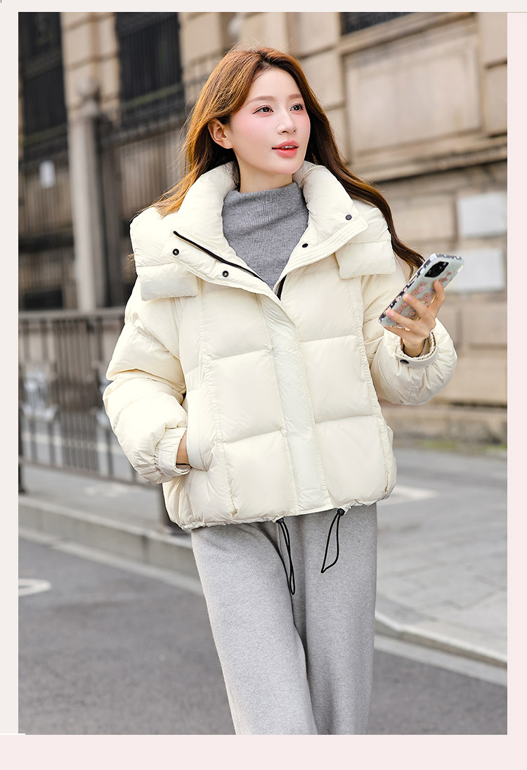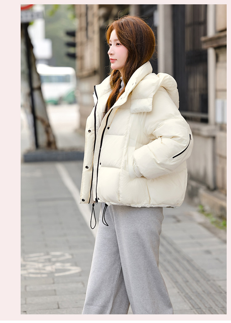 두툼하고 폭신한 소매에 작은 지퍼가 달린 2025년 신상 여성용 화이트 덕다운 재킷입니다. 두툼하고 넉넉한 핏으로 활용도 높은 아우터입니다.