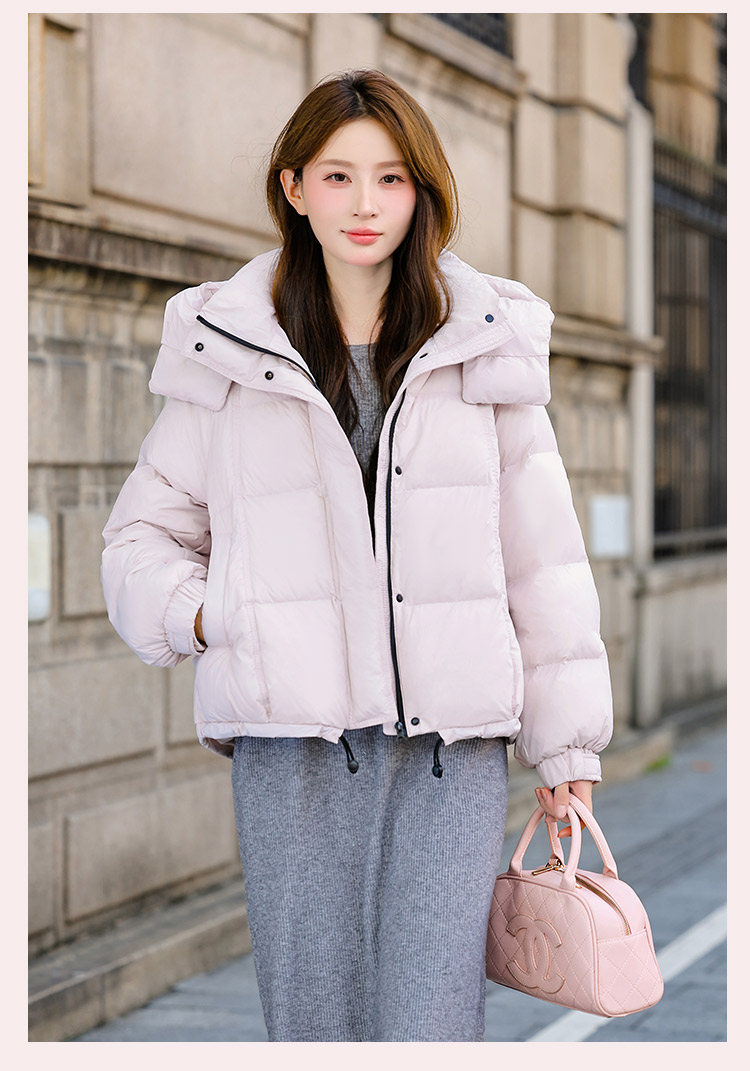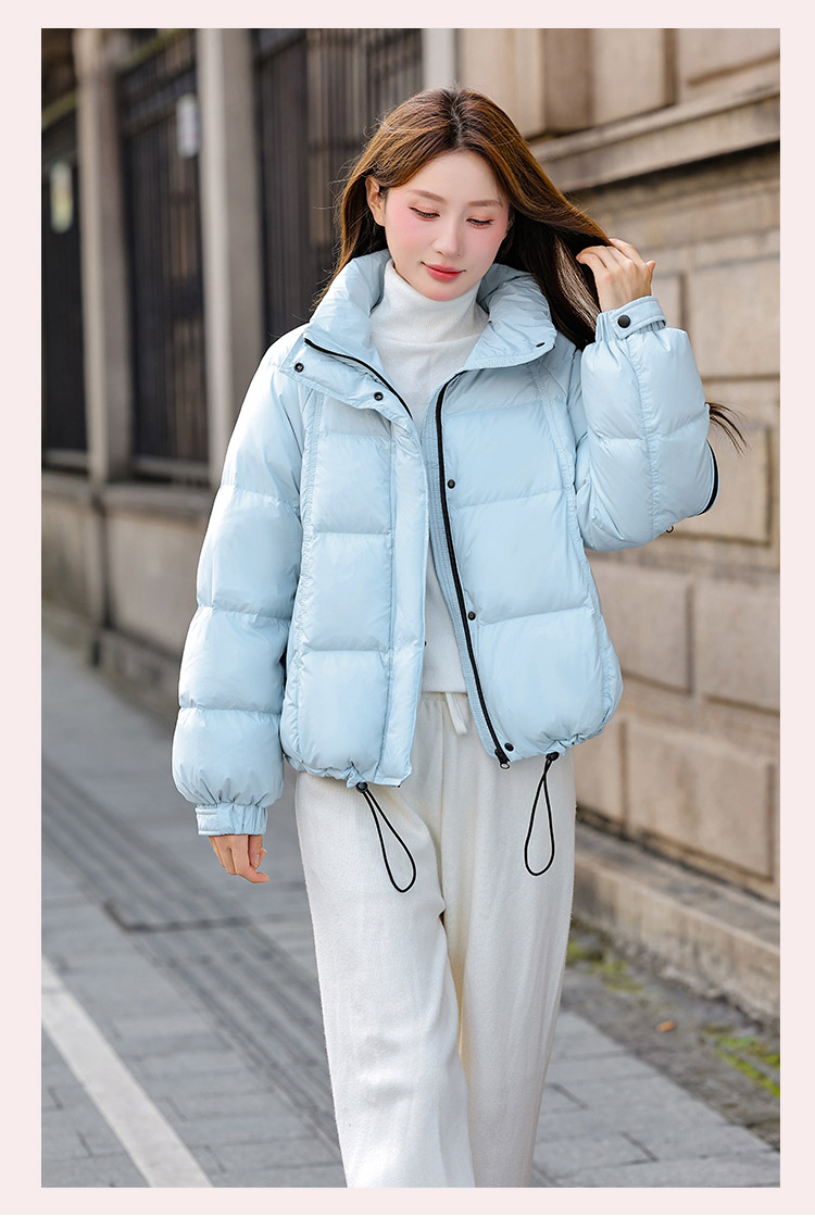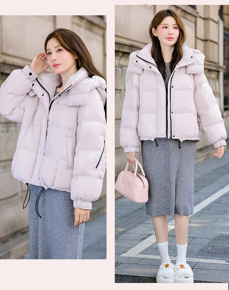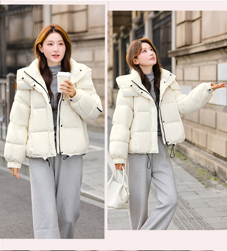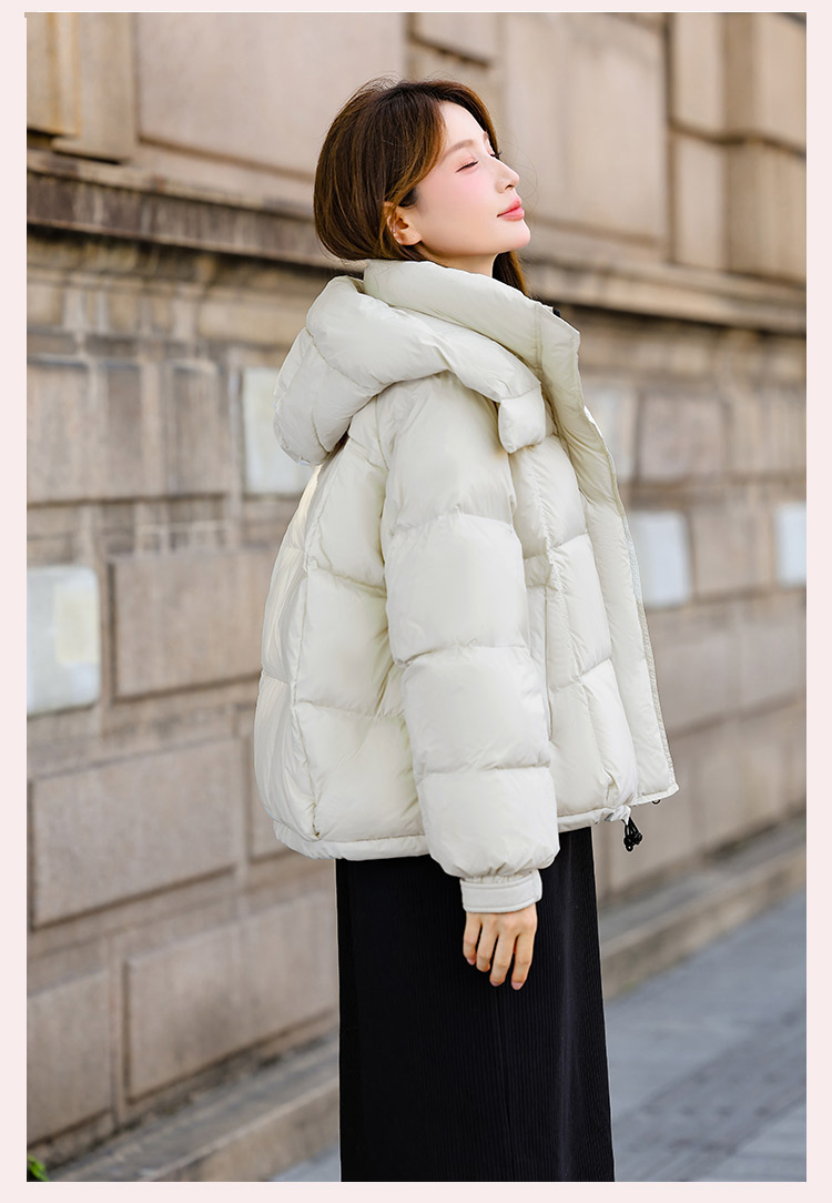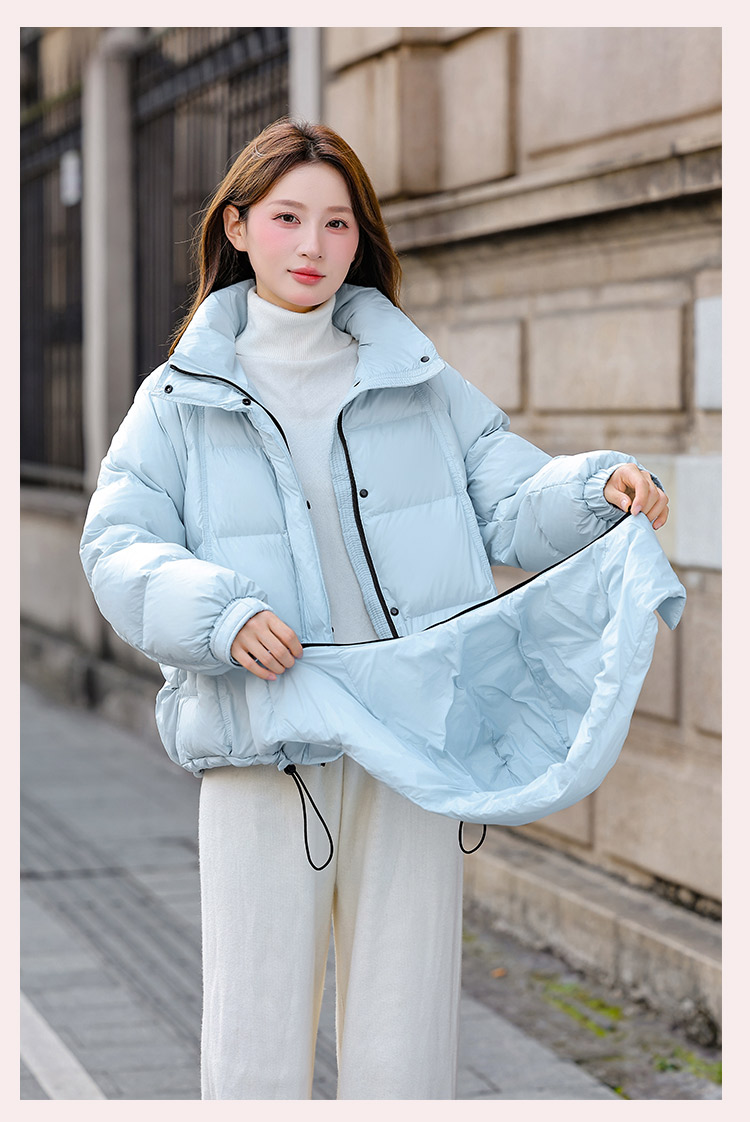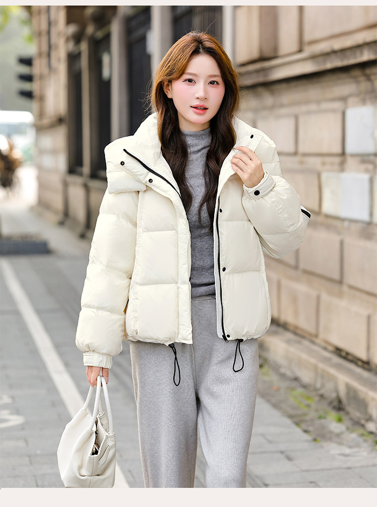 두툼하고 폭신한 소매에 작은 지퍼가 달린 2025년 신상 여성용 화이트 덕다운 재킷입니다. 두툼하고 넉넉한 핏으로 활용도 높은 아우터입니다.