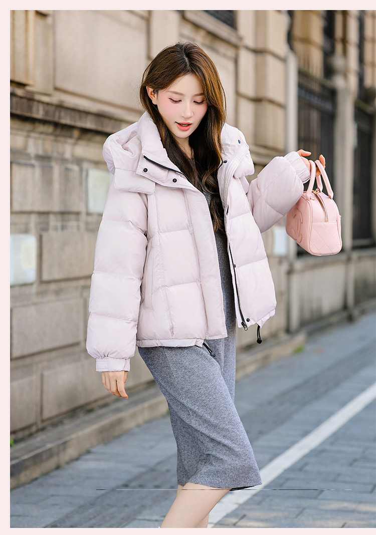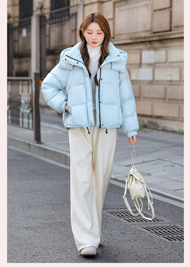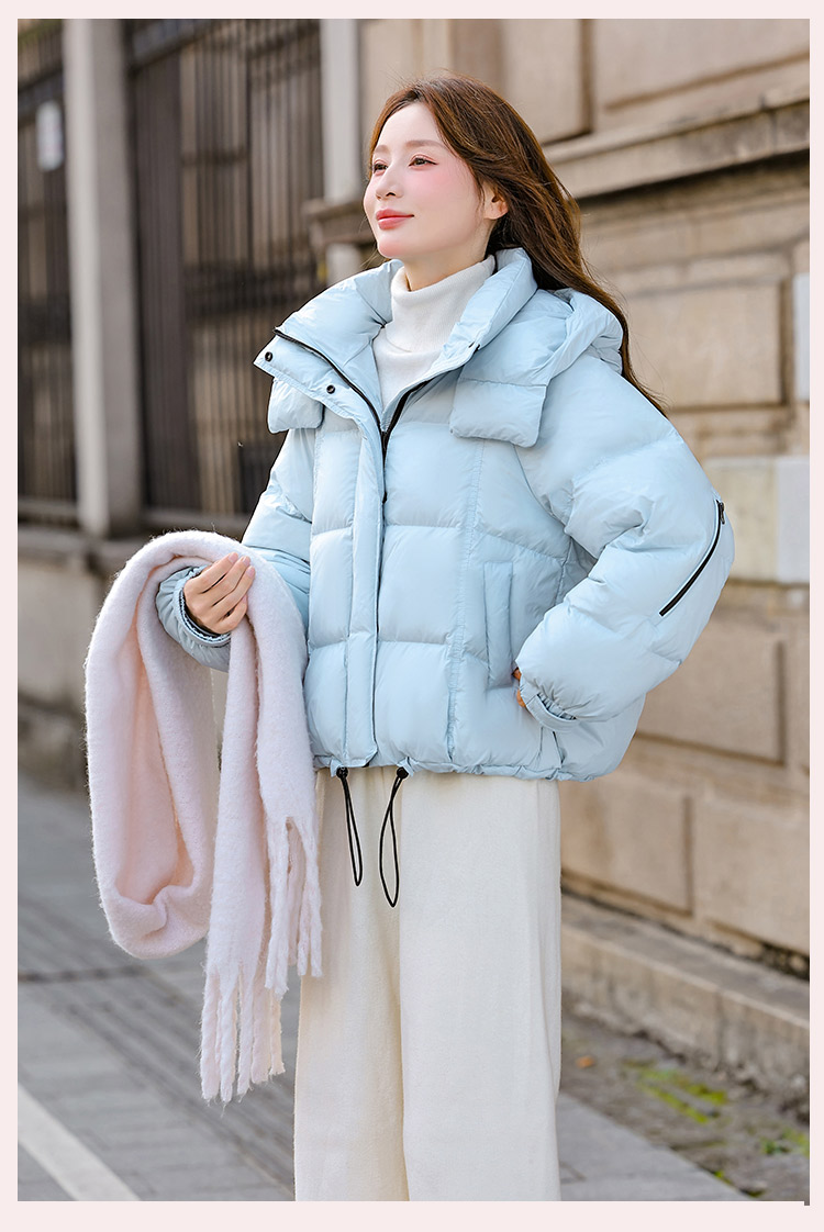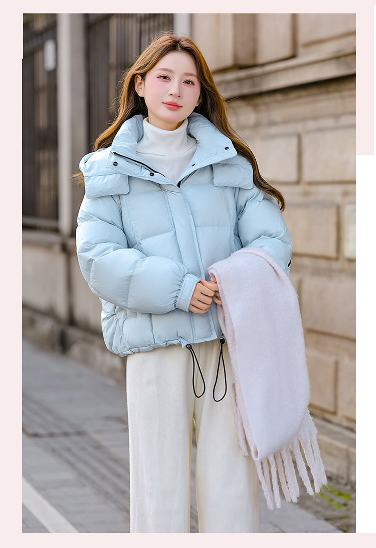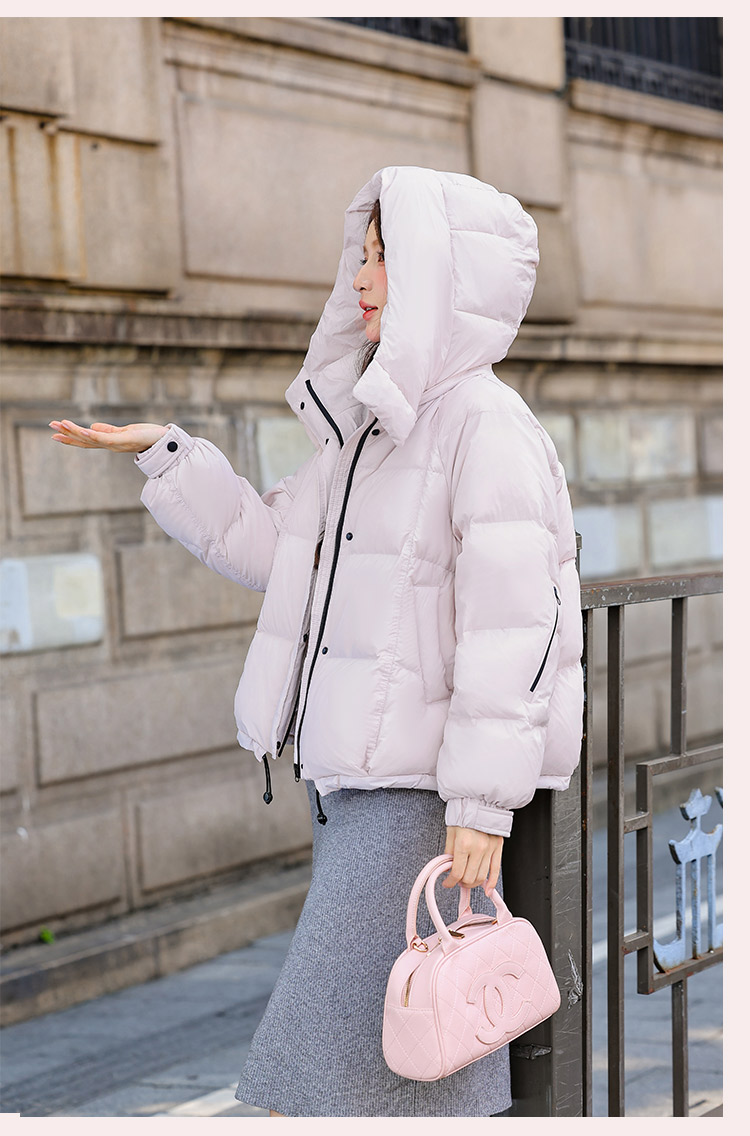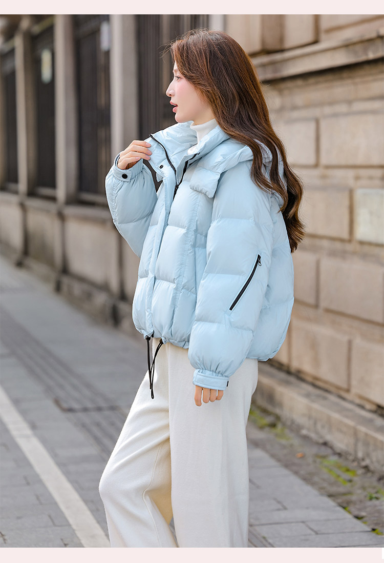 두툼하고 폭신한 소매에 작은 지퍼가 달린 2025년 신상 여성용 화이트 덕다운 재킷입니다. 두툼하고 넉넉한 핏으로 활용도 높은 아우터입니다.