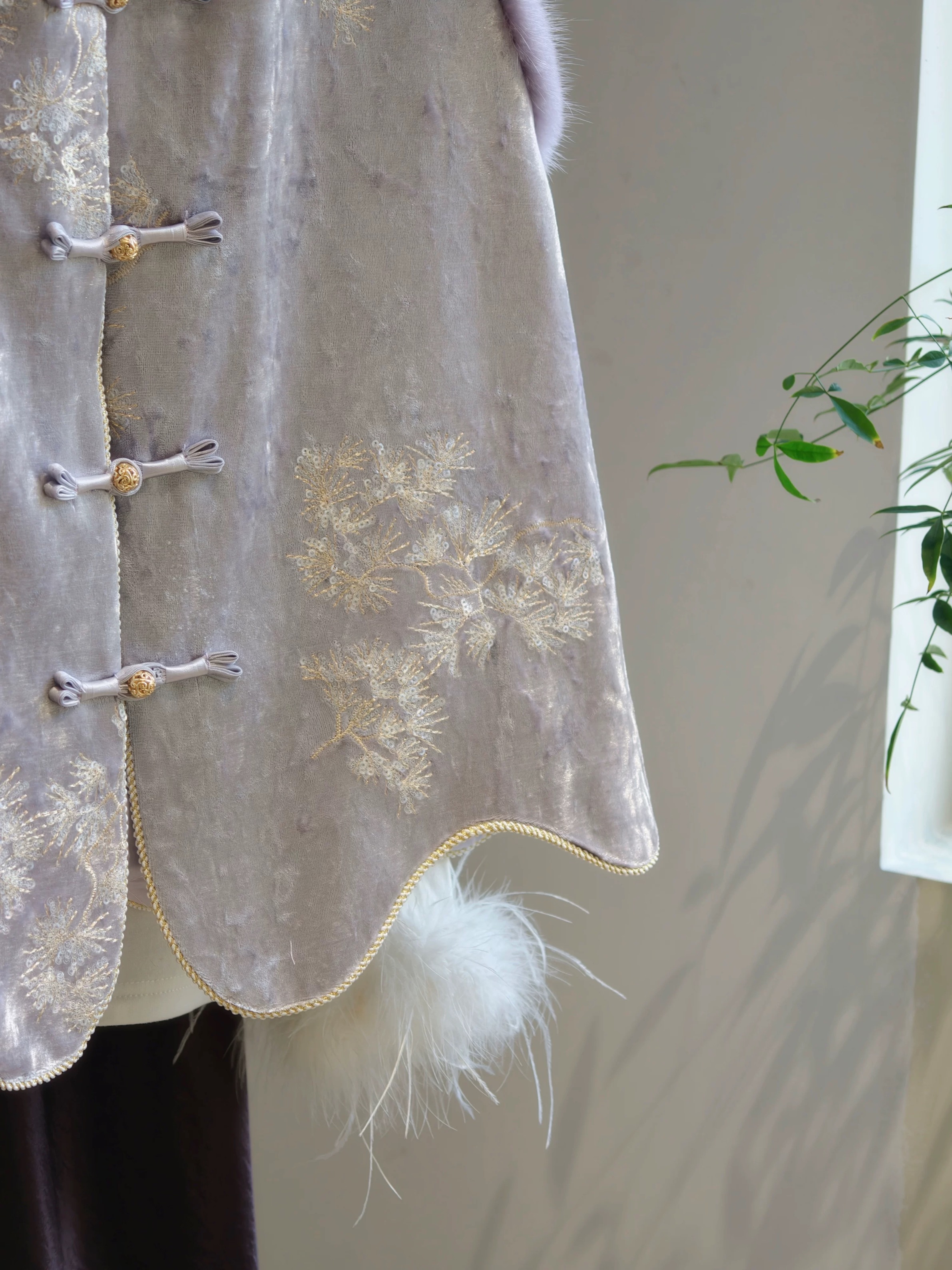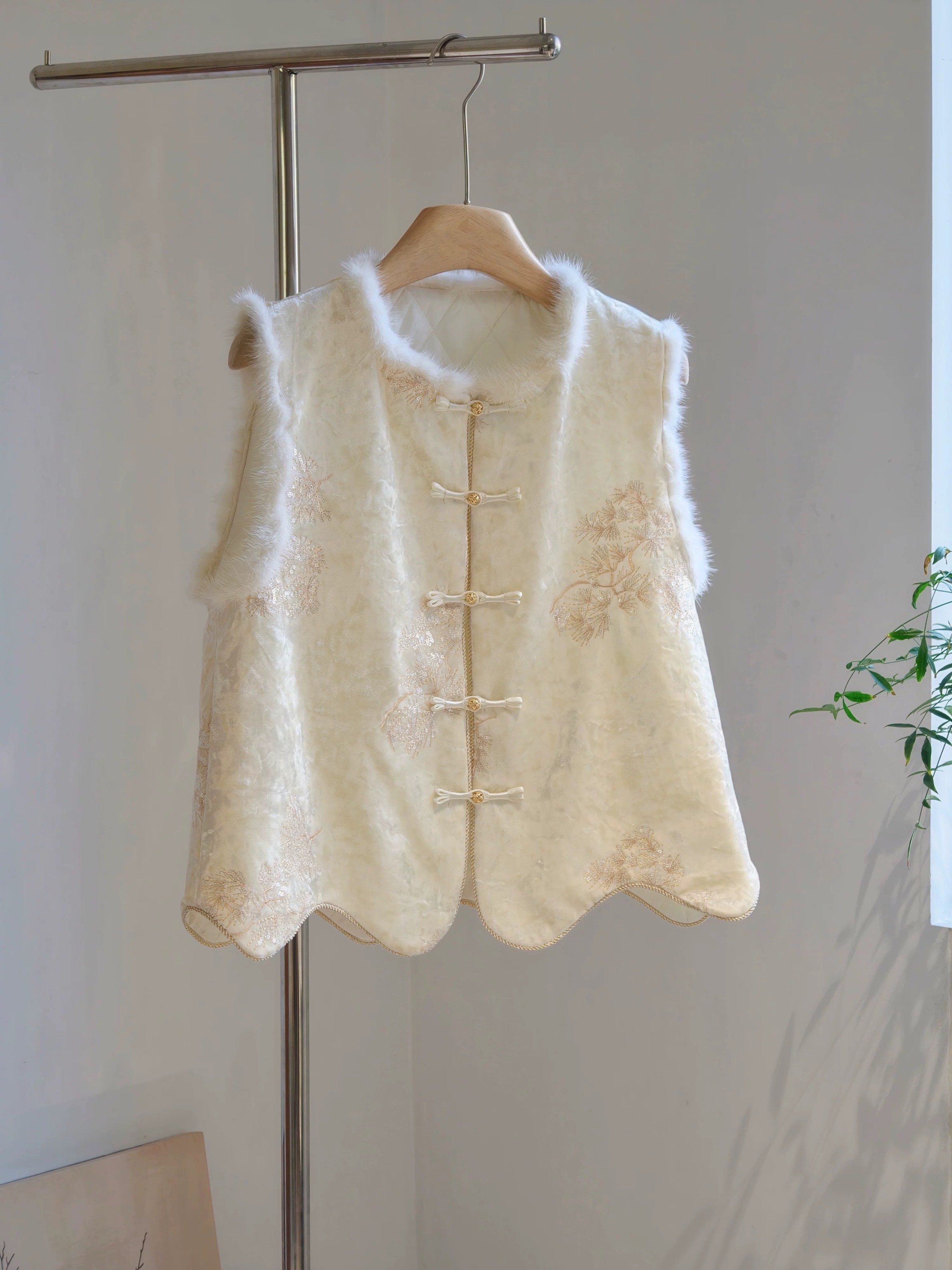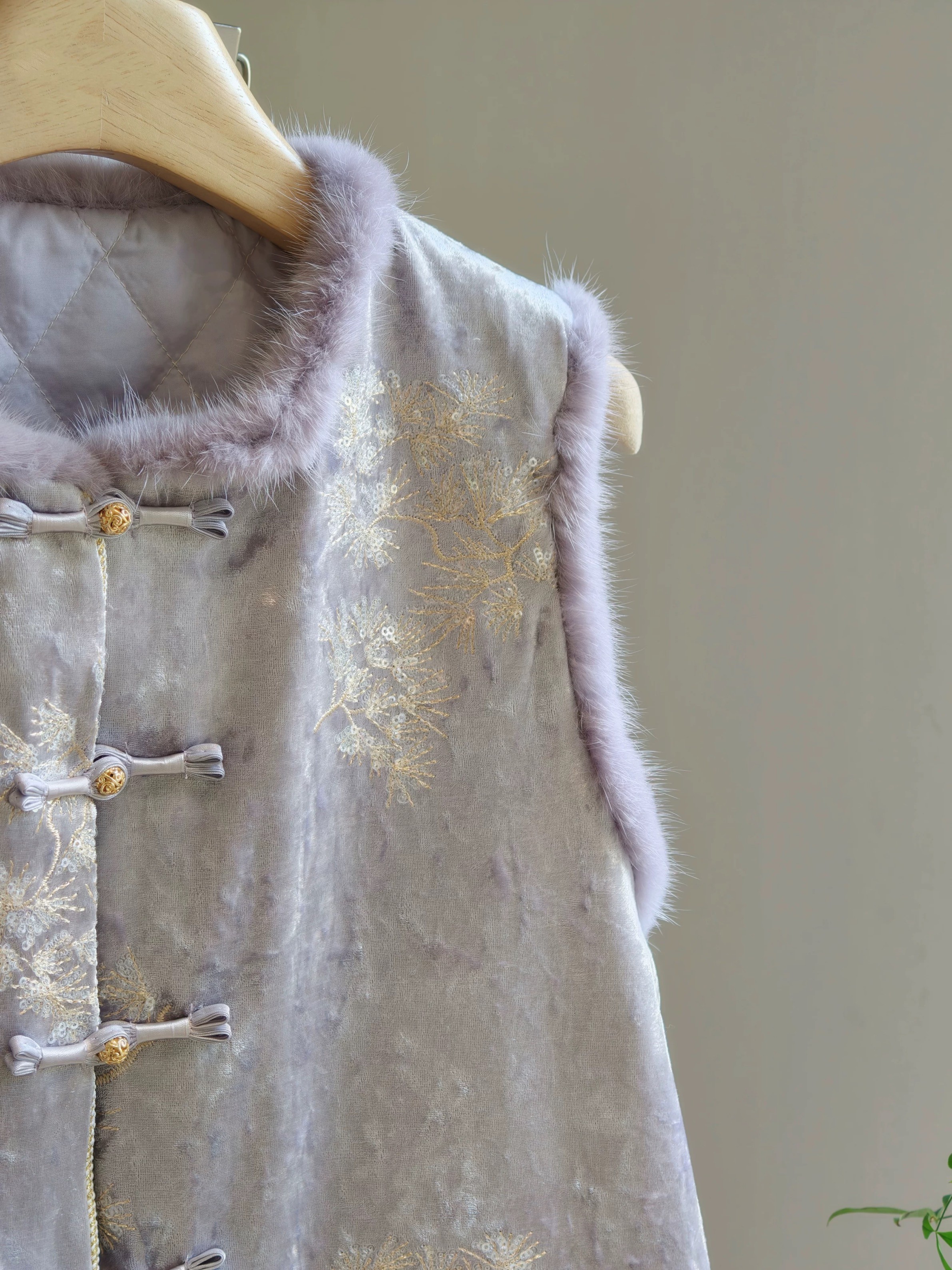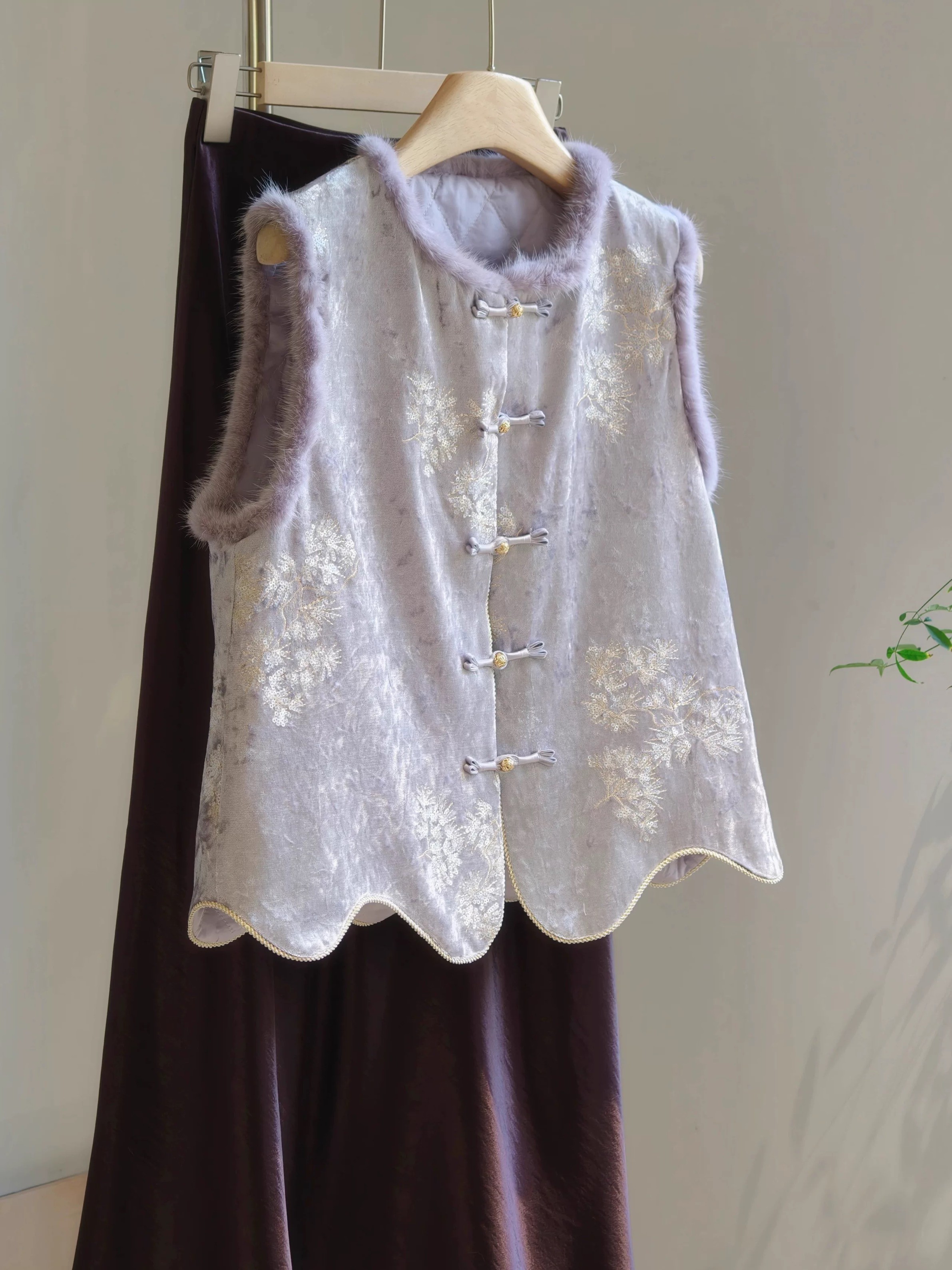 젊고 세련된 느낌을 주는 모던한 중국풍 보라색 벨벳 조끼로, 밍크 퍼 누빔 디자인, 앞트임, 중국식 단추가 특징입니다.