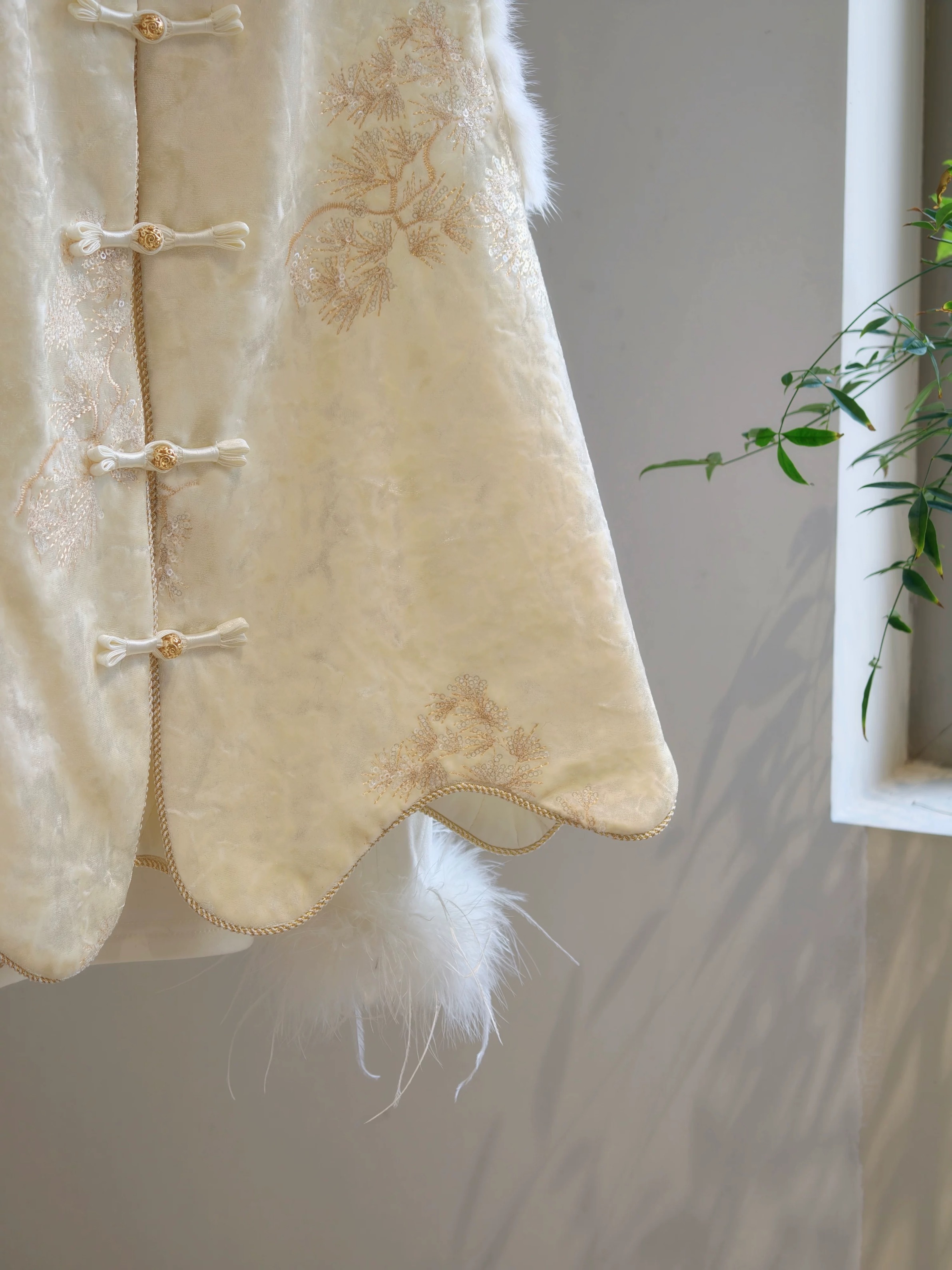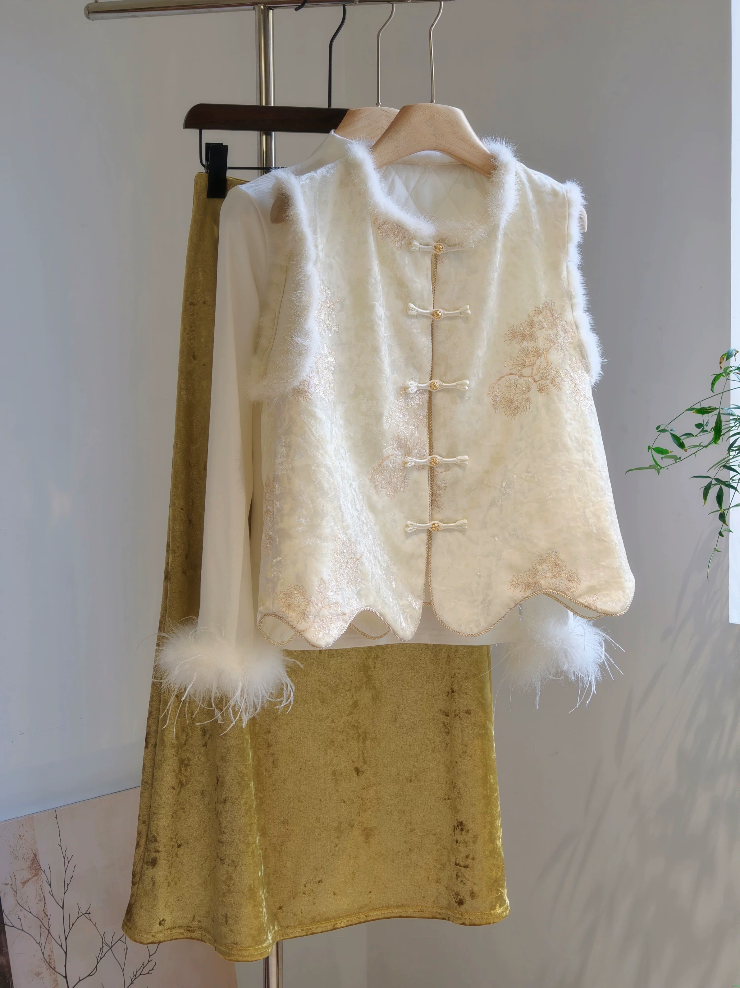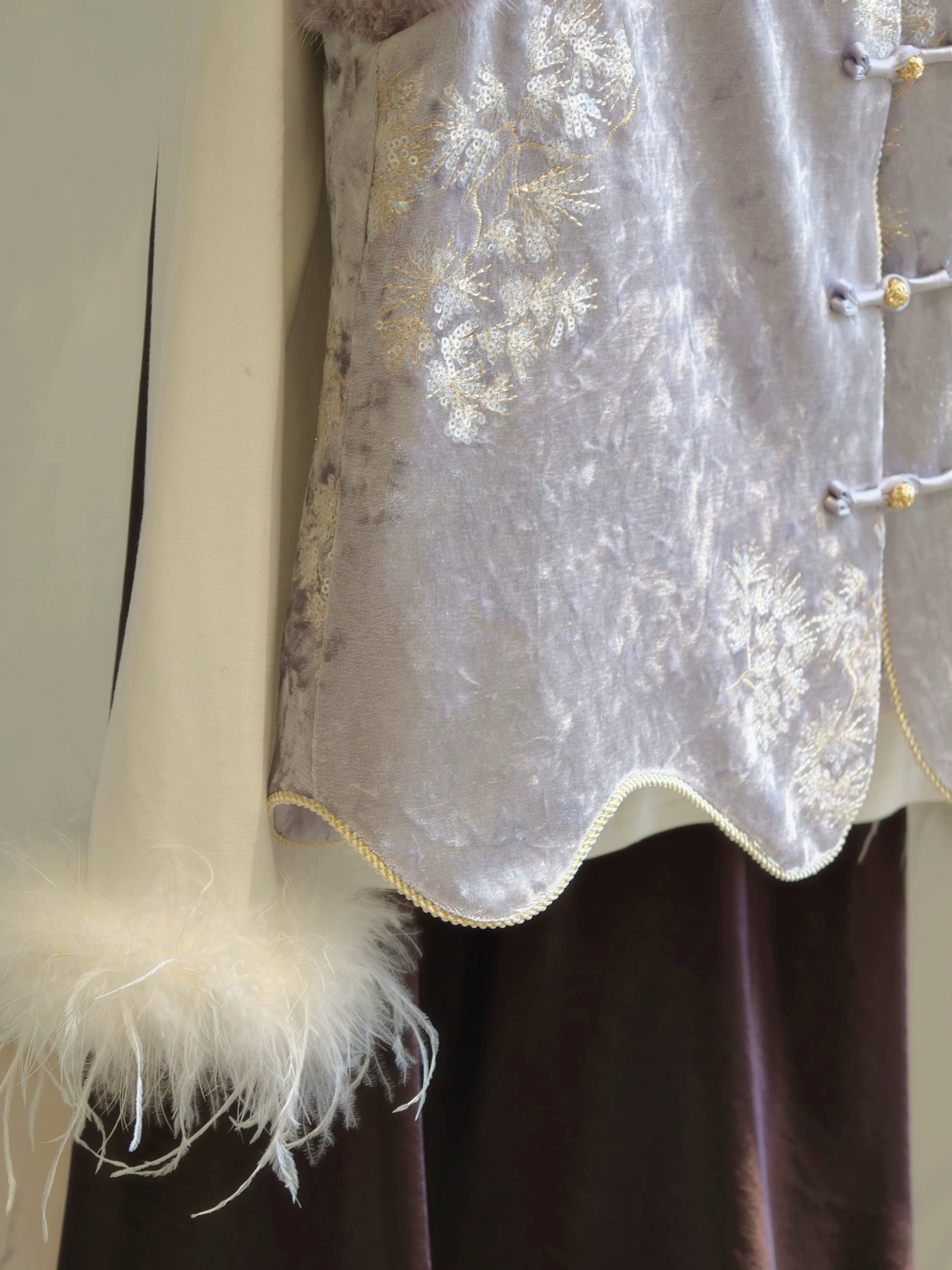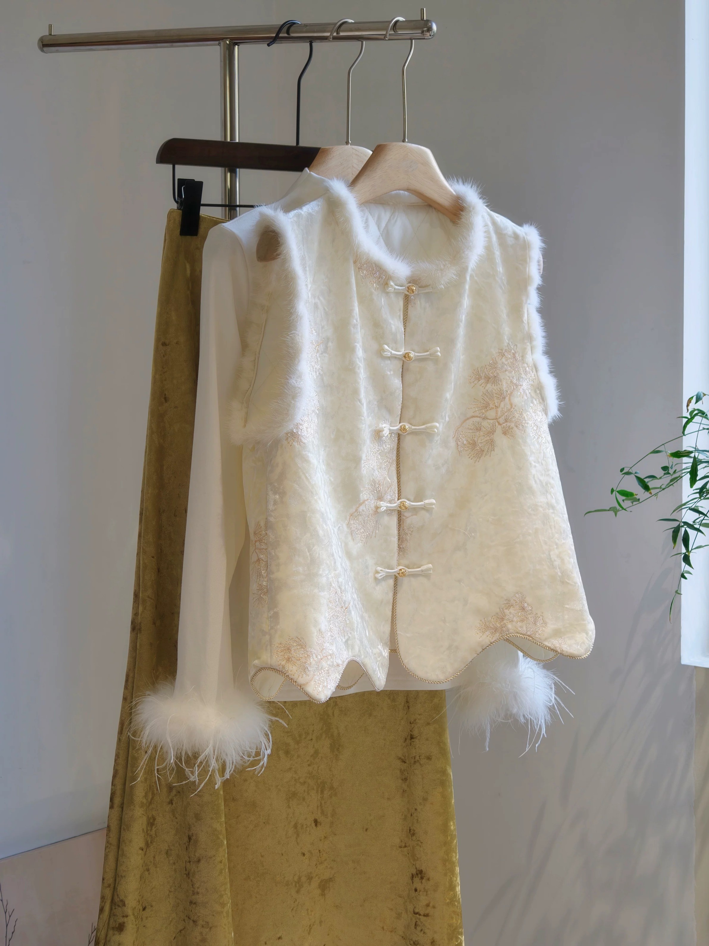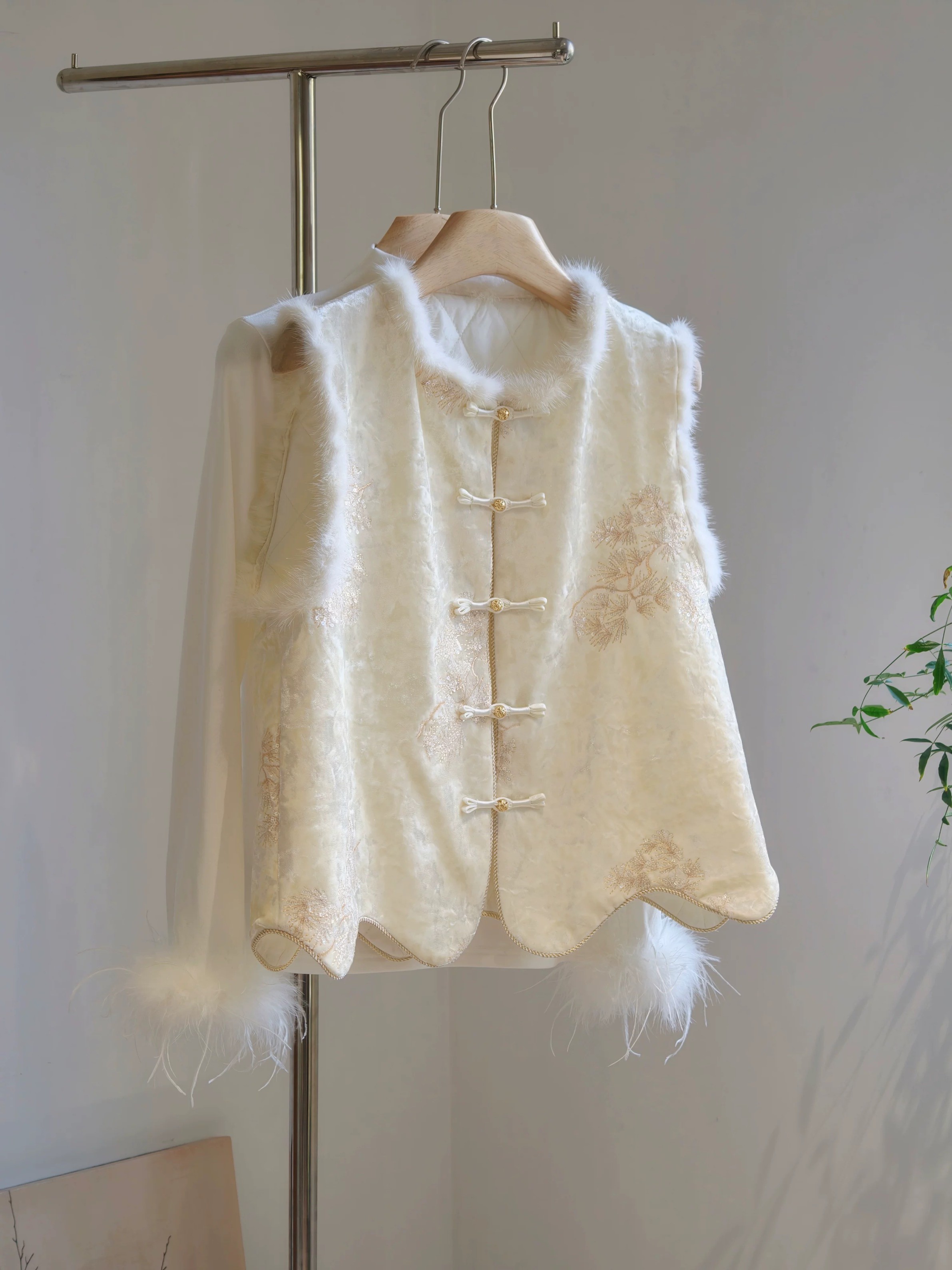 젊고 세련된 느낌을 주는 모던한 중국풍 보라색 벨벳 조끼로, 밍크 퍼 누빔 디자인, 앞트임, 중국식 단추가 특징입니다.