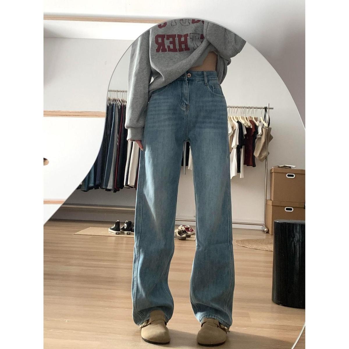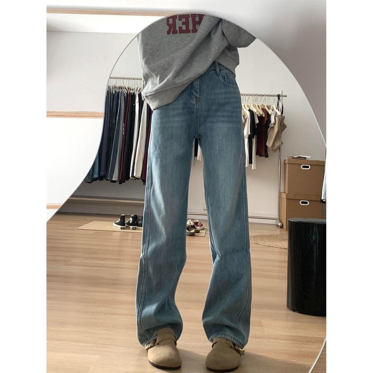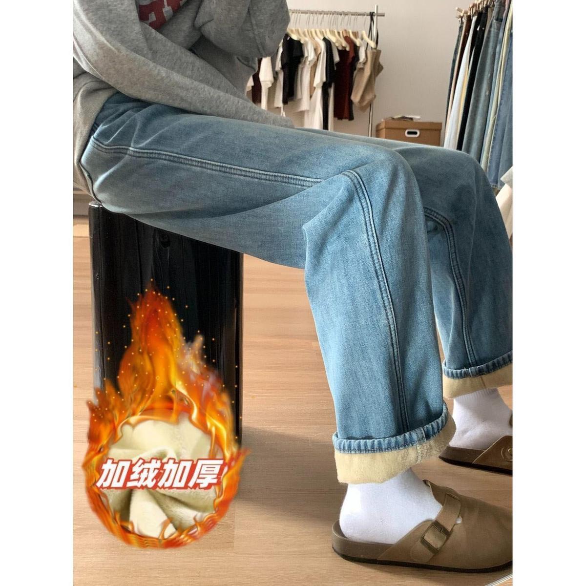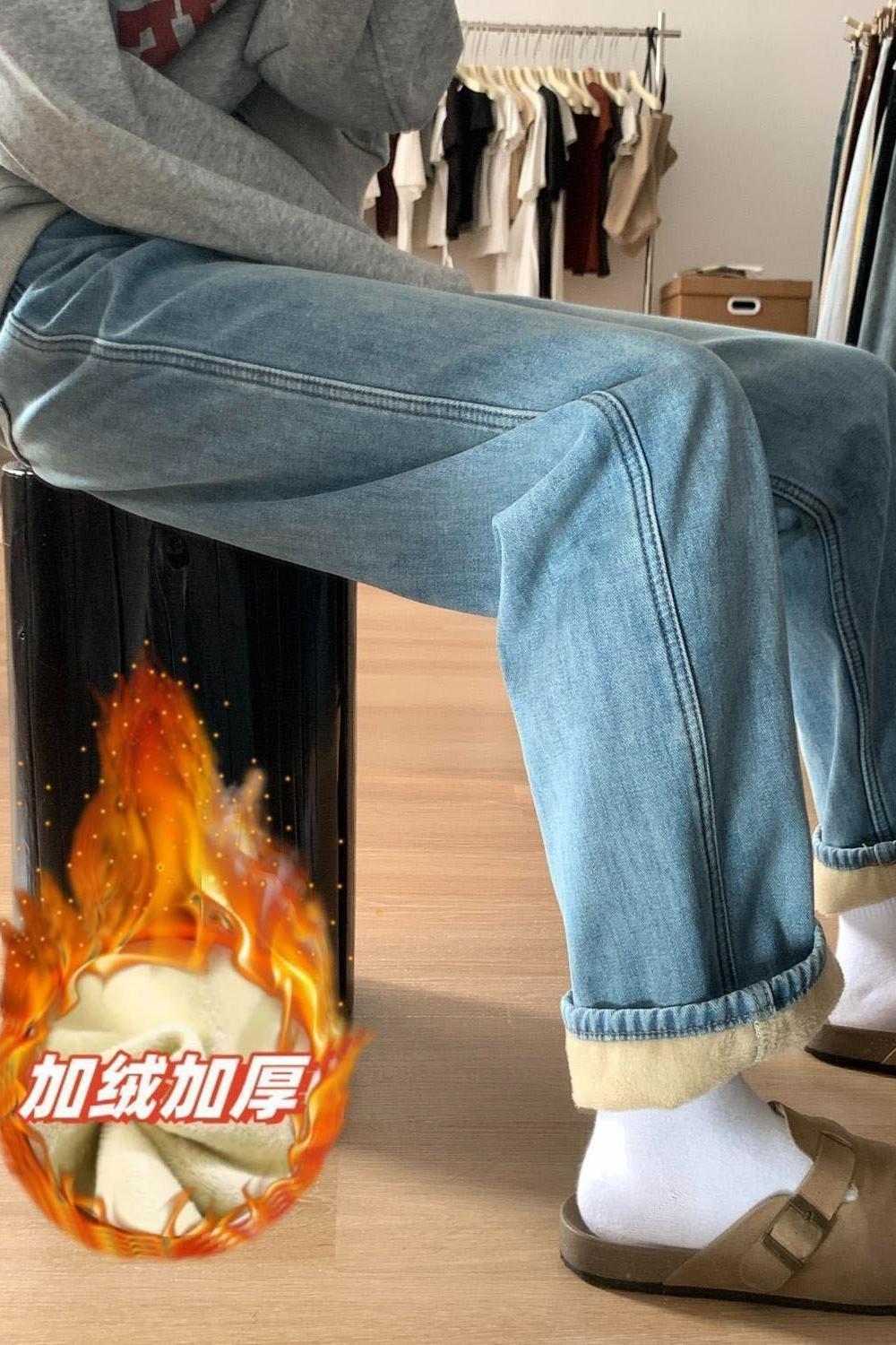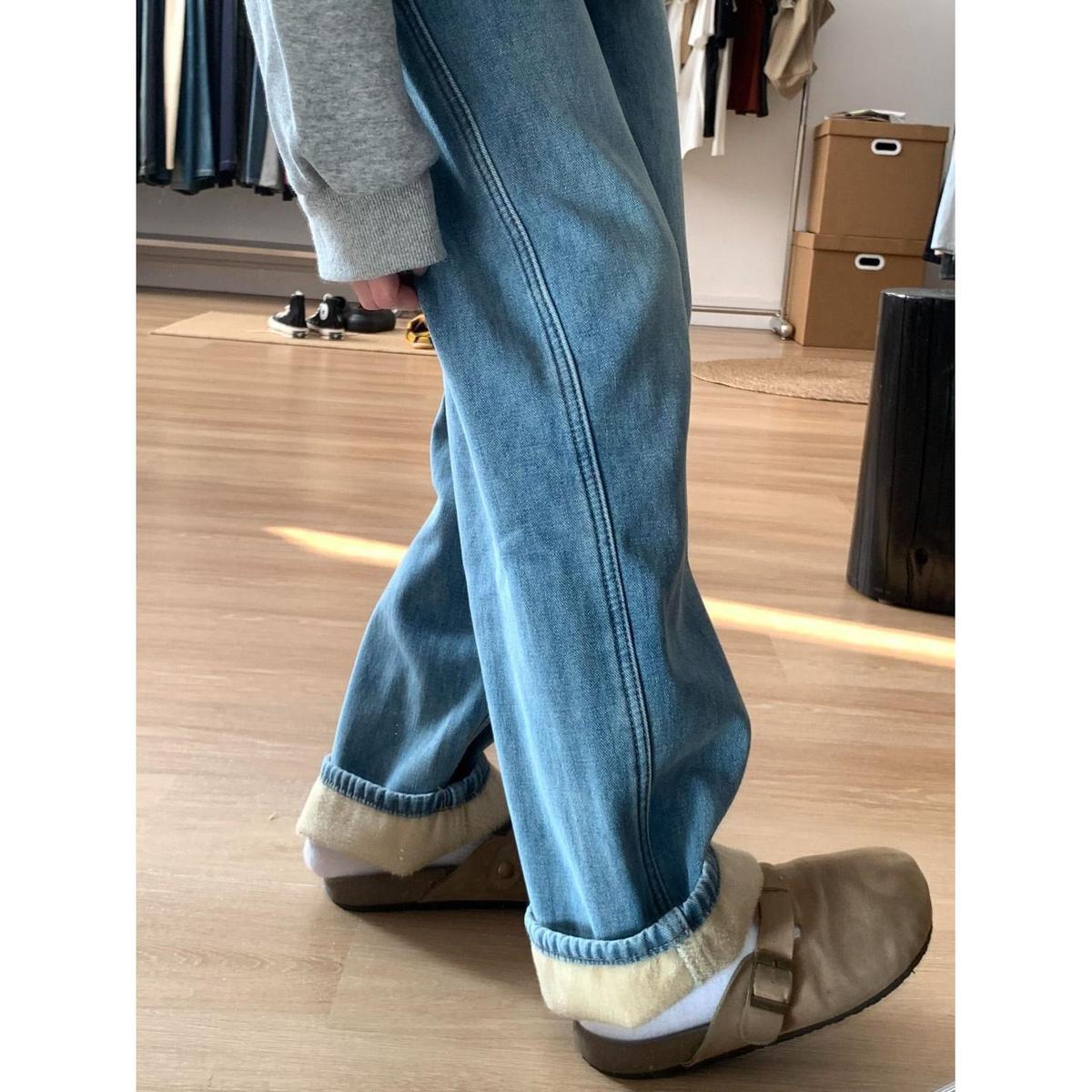 여성용 연한 파란색 플리스 안감 와이드 팬츠, 2025년 가을/겨울 신상, 루즈핏, 슬림핏, 도톰한 소재, 발목까지 오는 일자형 팬츠.