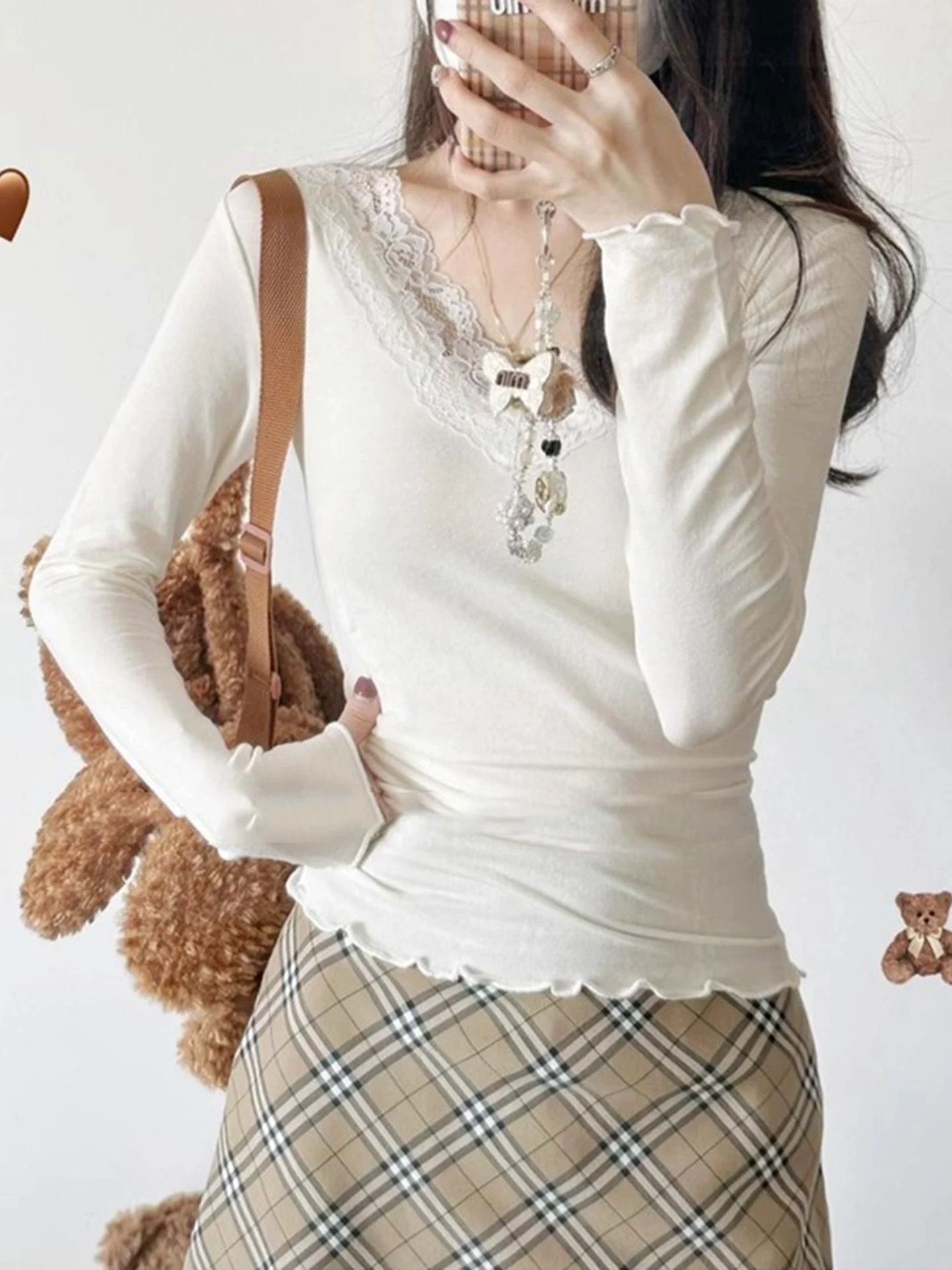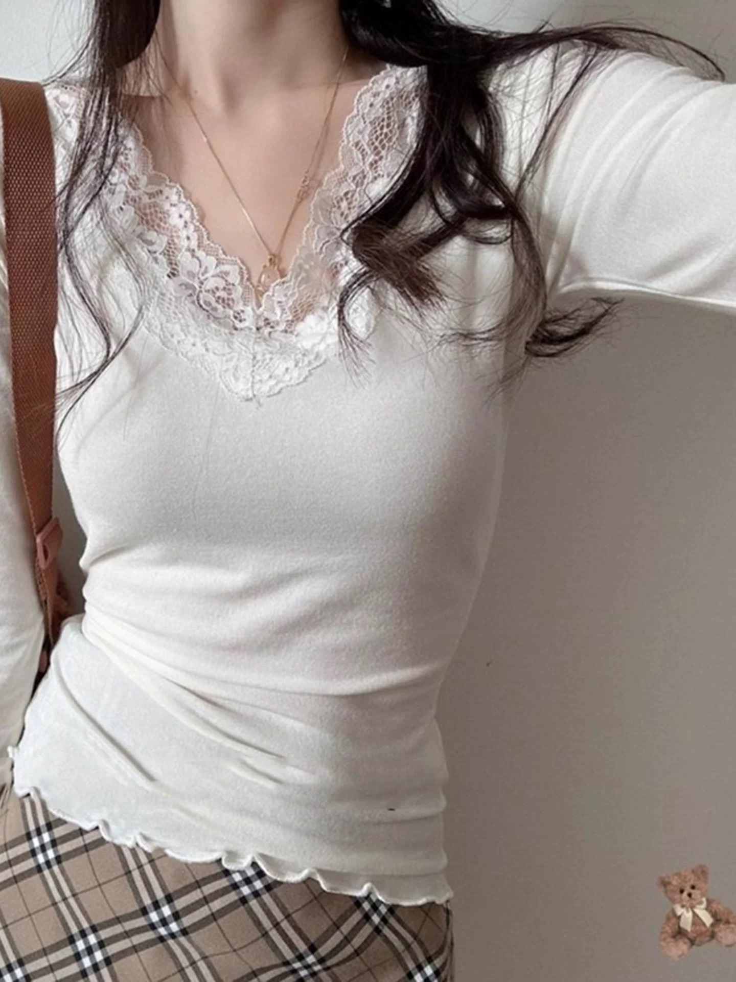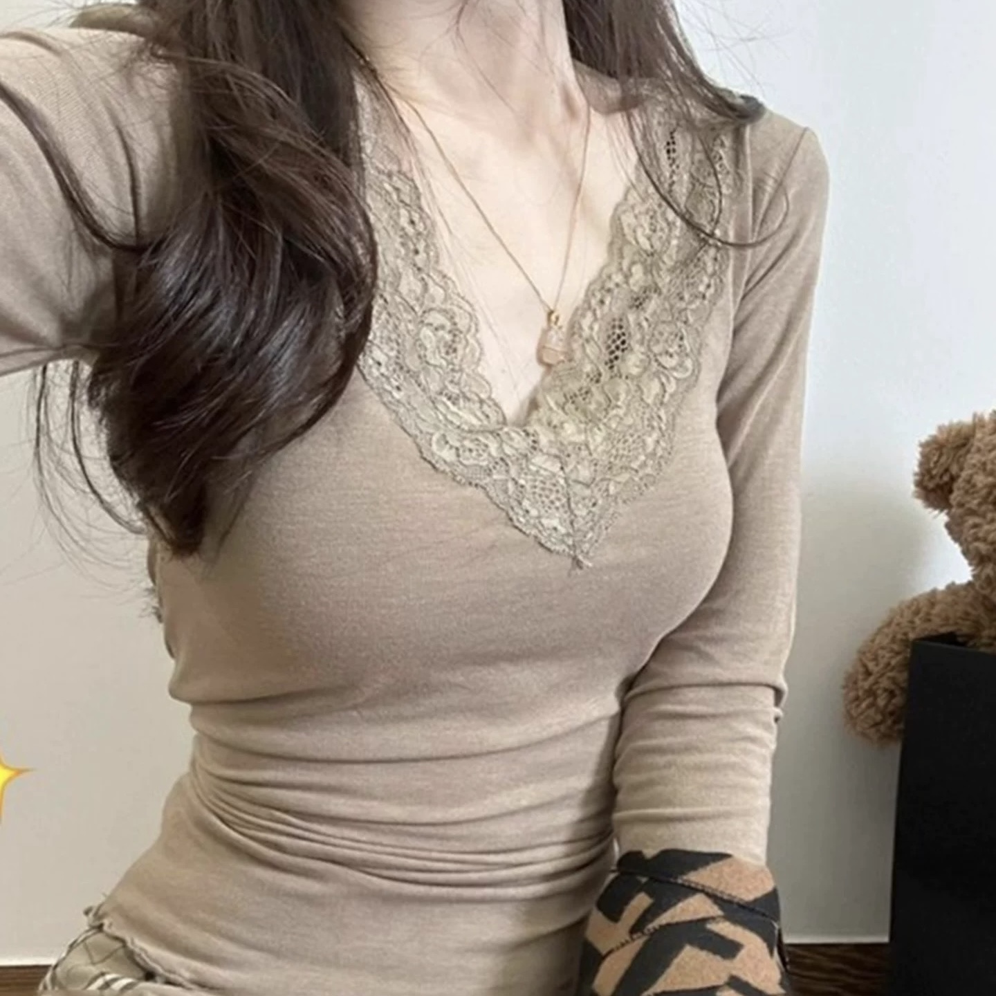 黑色蕾丝低V领打底衫女秋冬2025新款茶艺风德绒纯欲内搭修身上衣