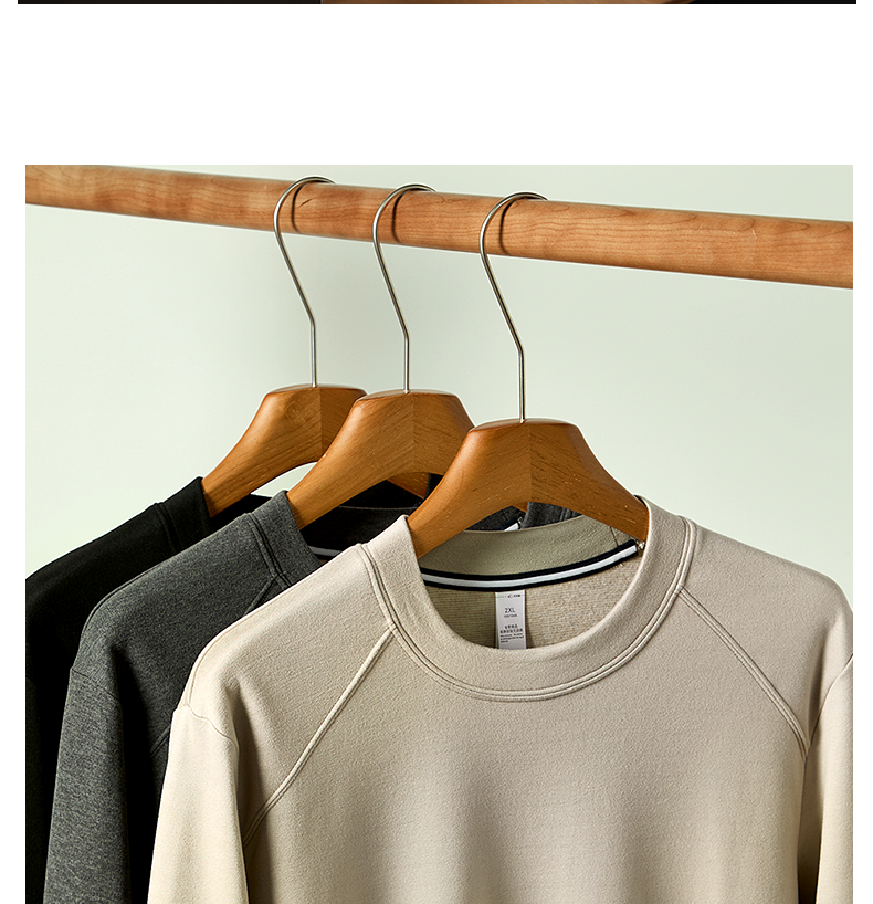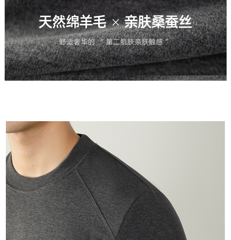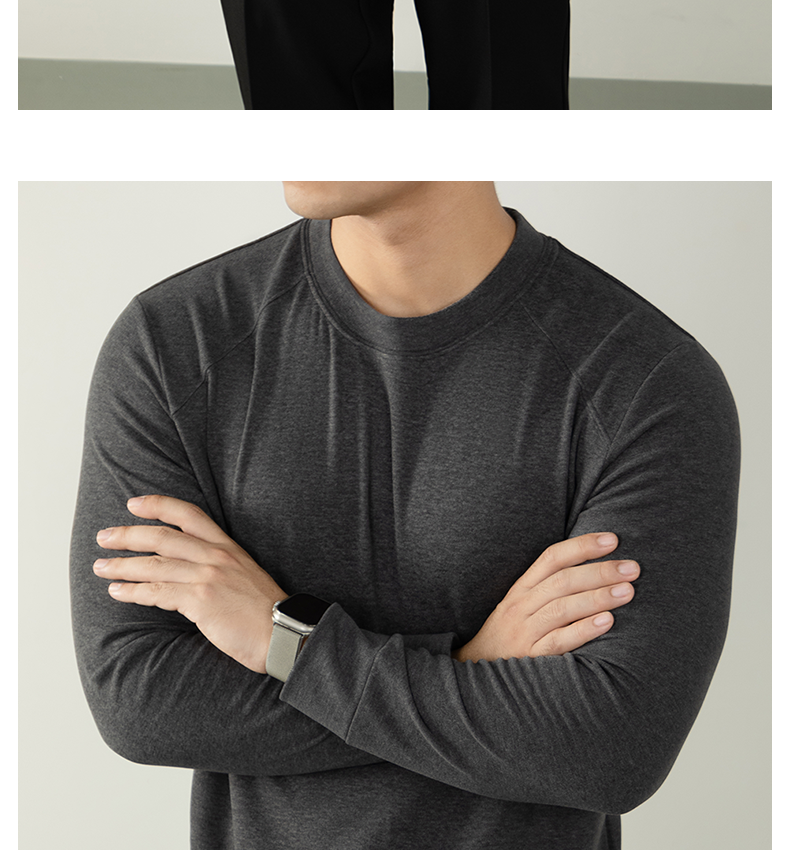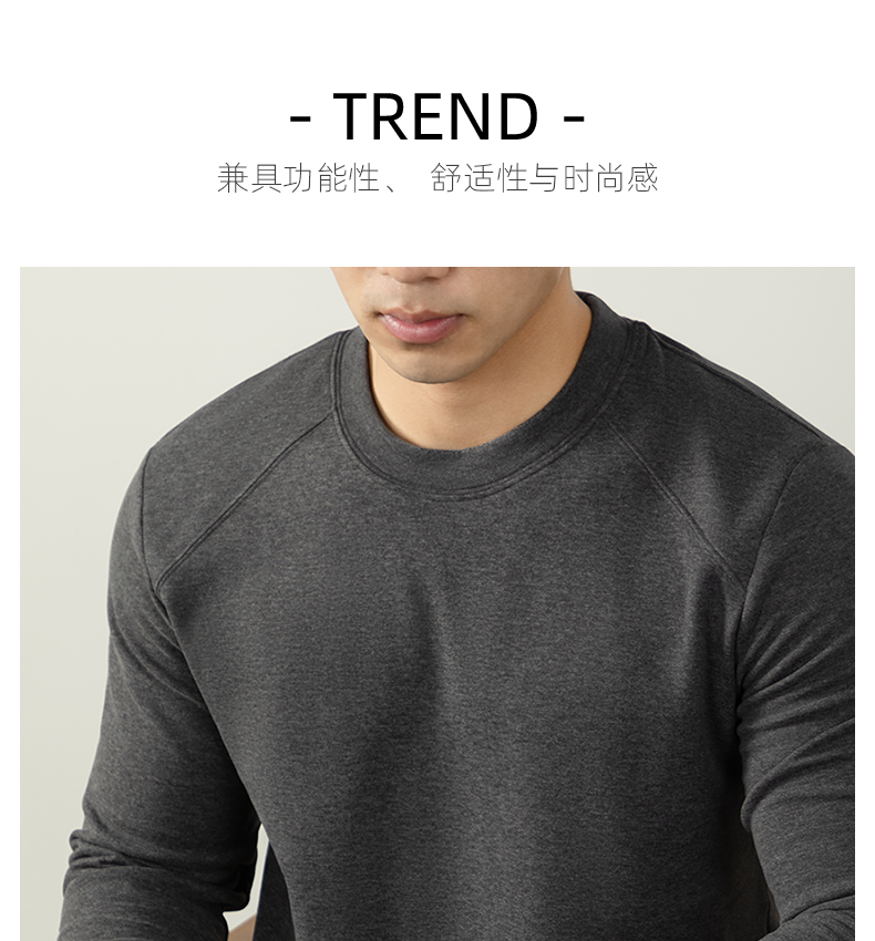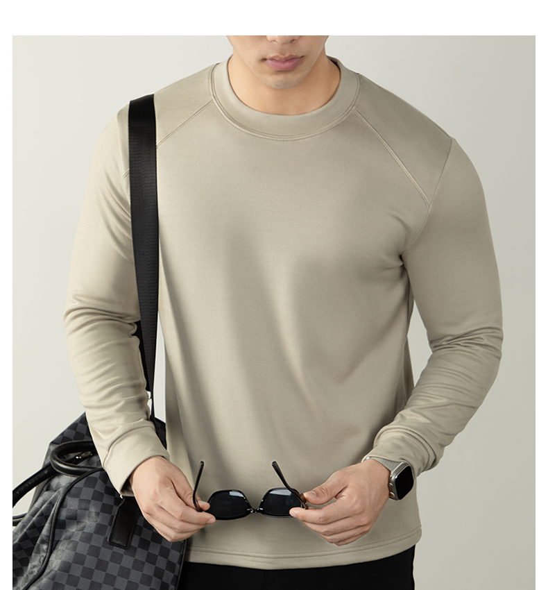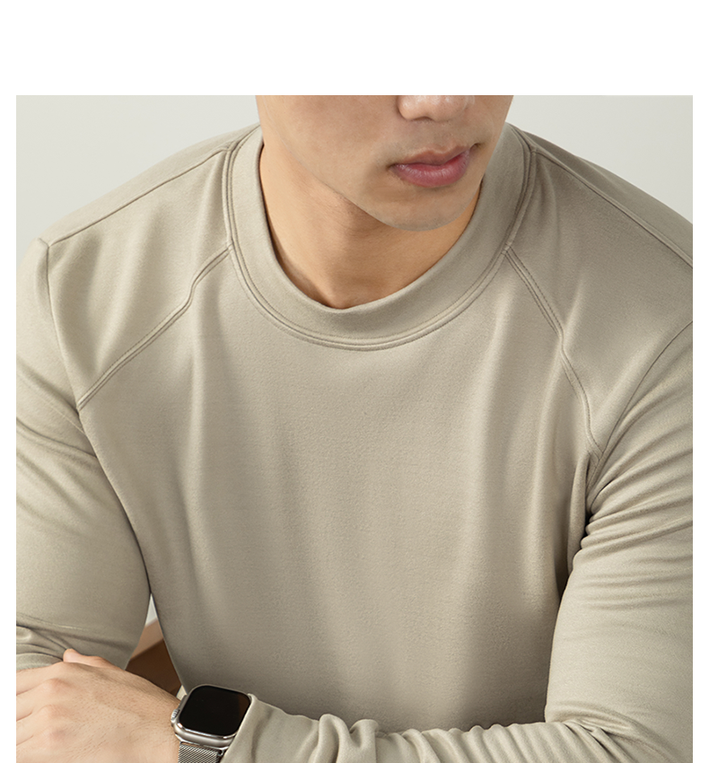 남성용 래글런 소매 긴팔 티셔츠로, 원적외선 발열 및 보온성을 제공하는 울과 실크 혼방 양면 플리스 소재로 제작되었습니다.