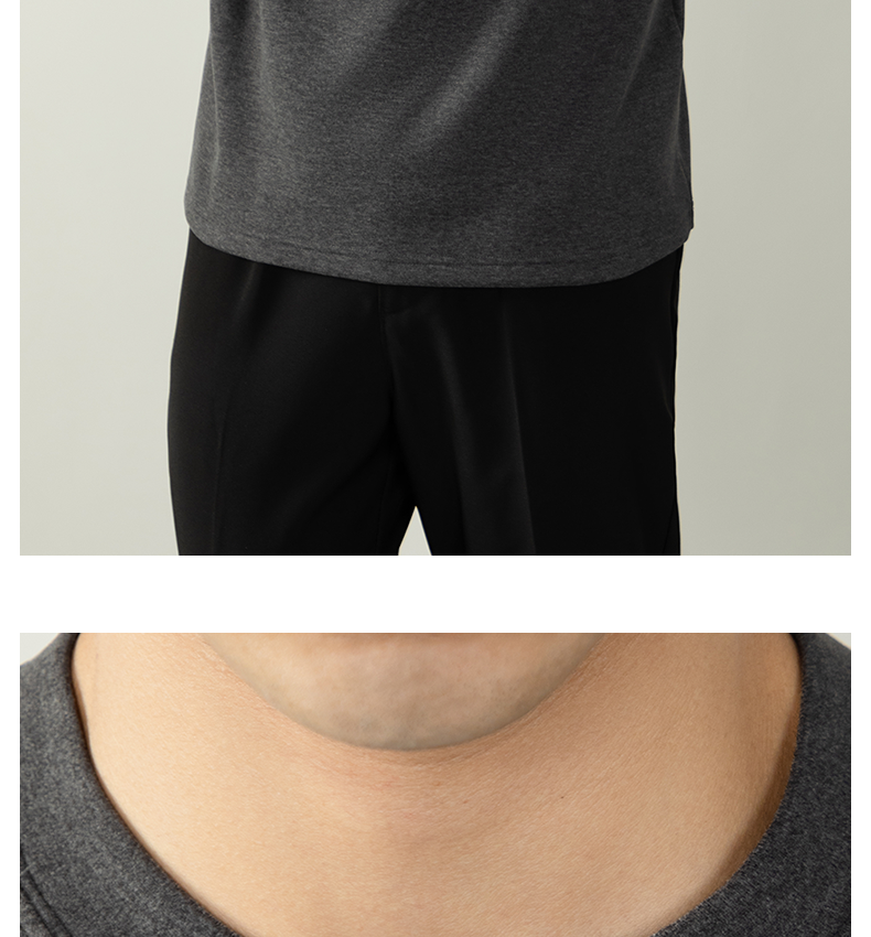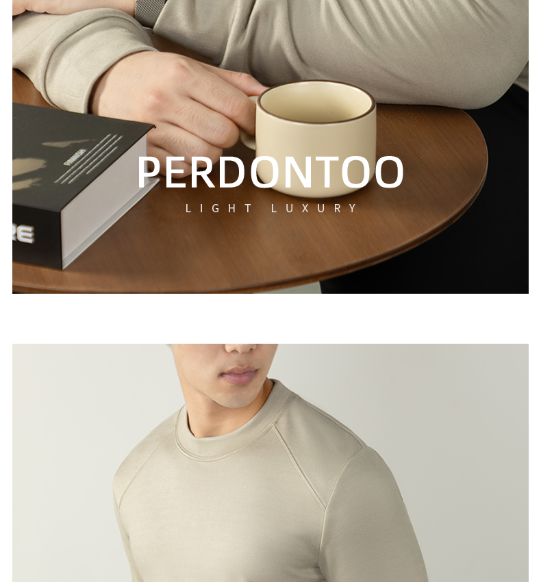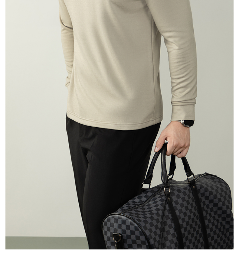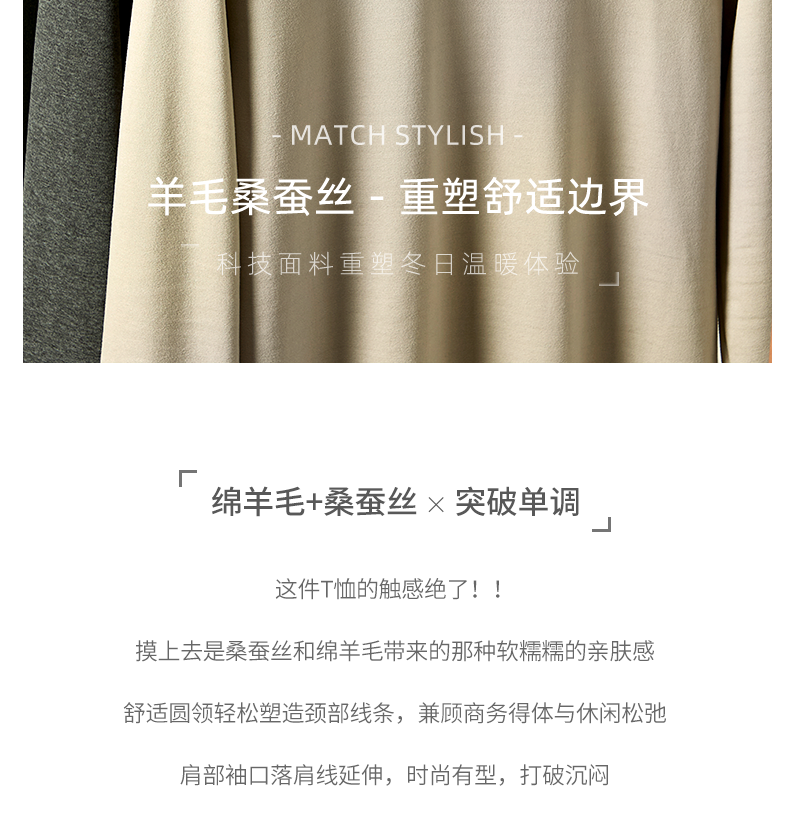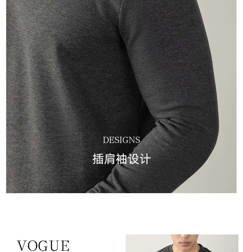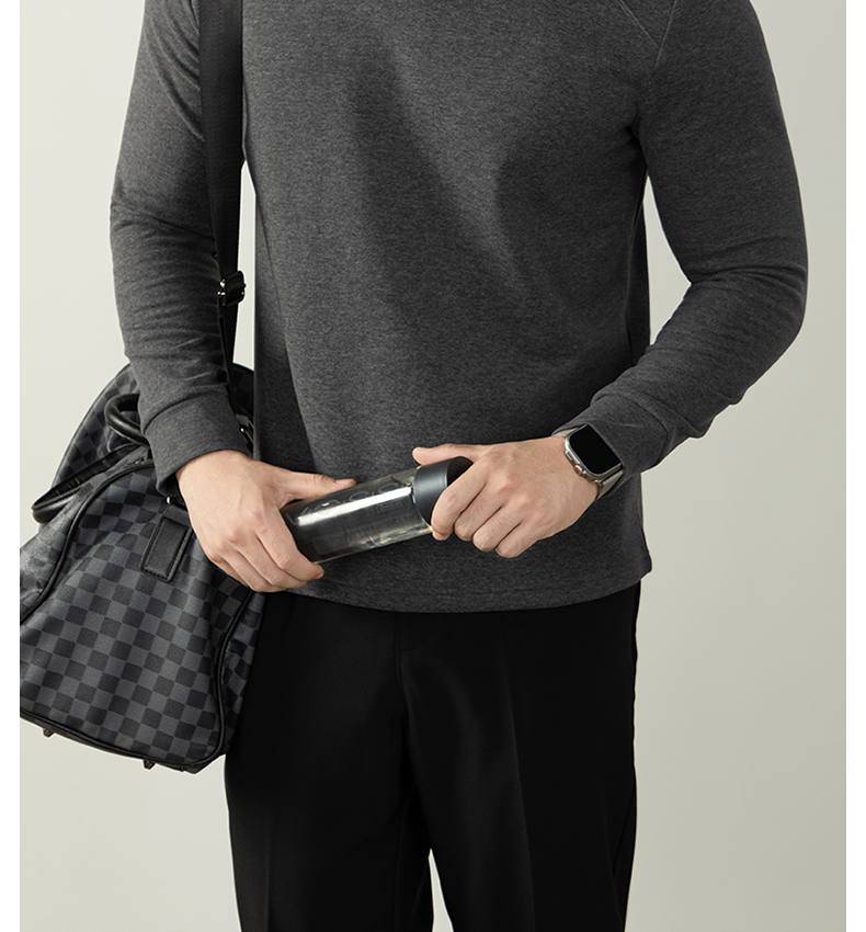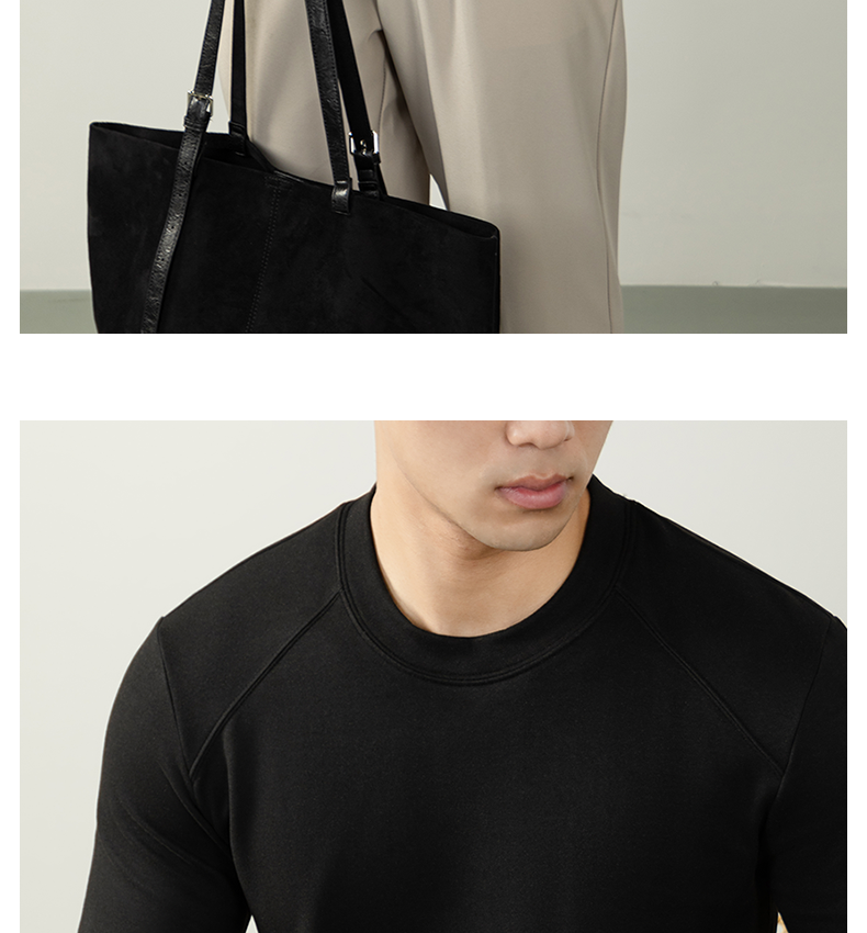 남성용 래글런 소매 긴팔 티셔츠로, 원적외선 발열 및 보온성을 제공하는 울과 실크 혼방 양면 플리스 소재로 제작되었습니다.