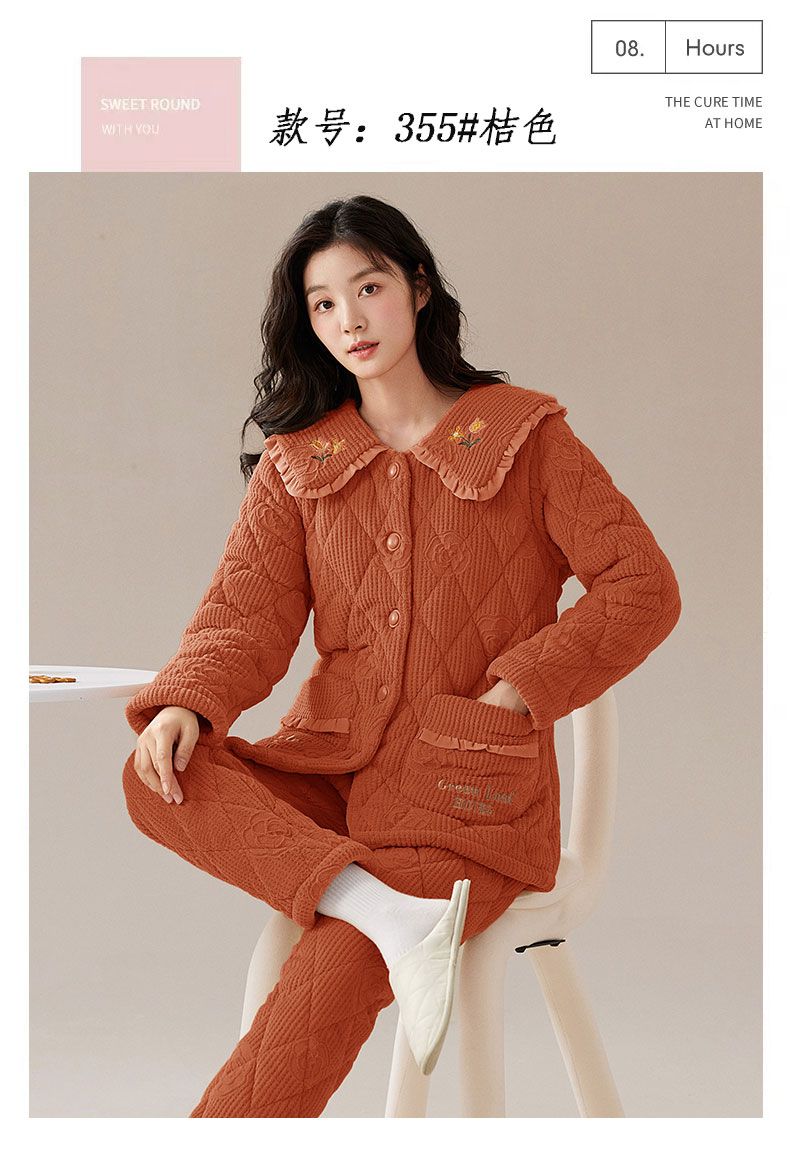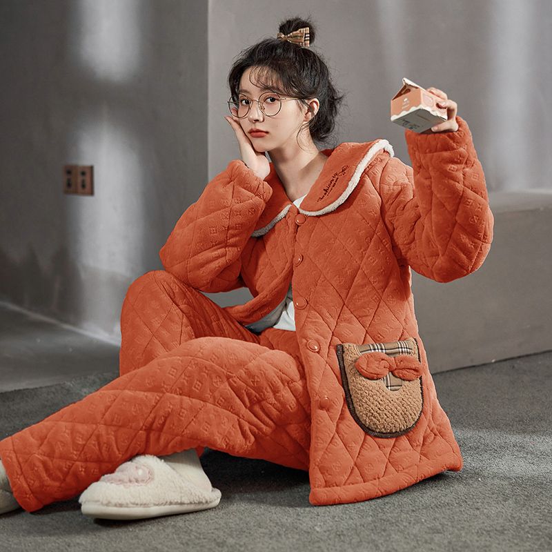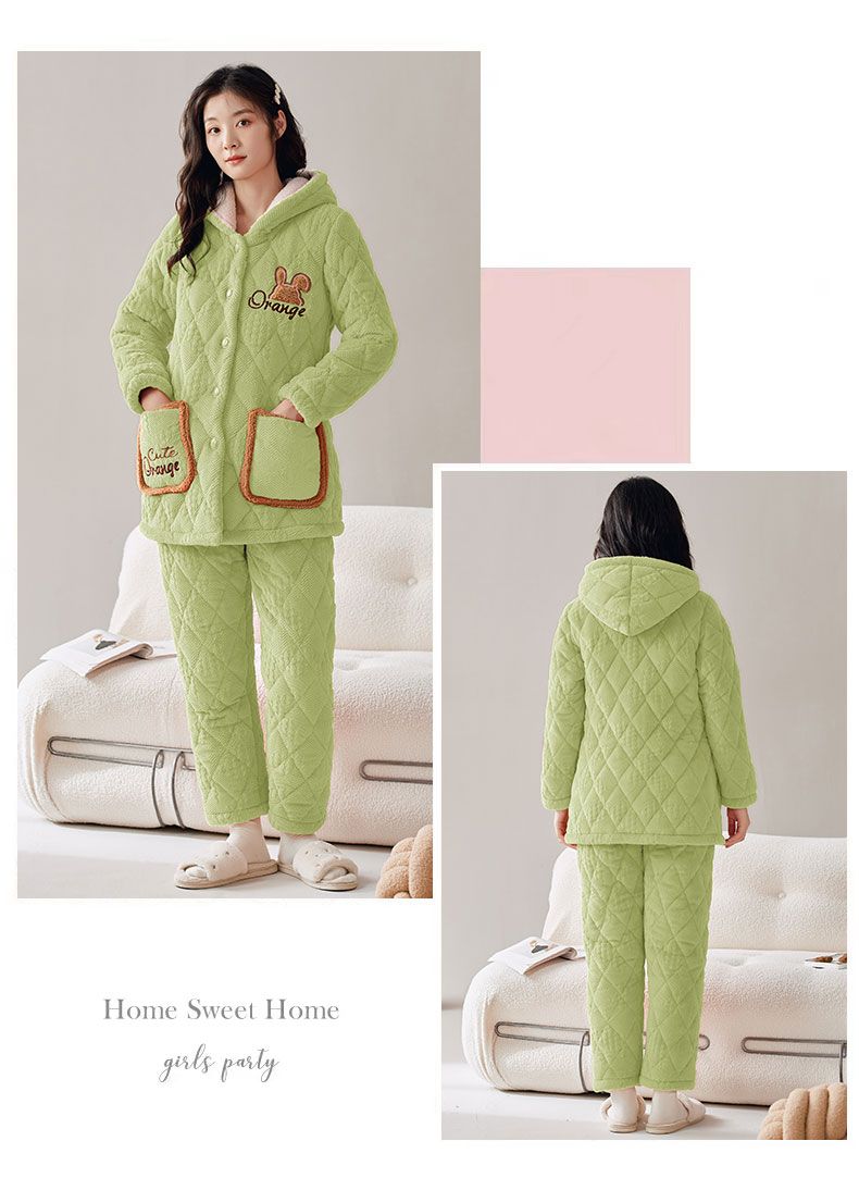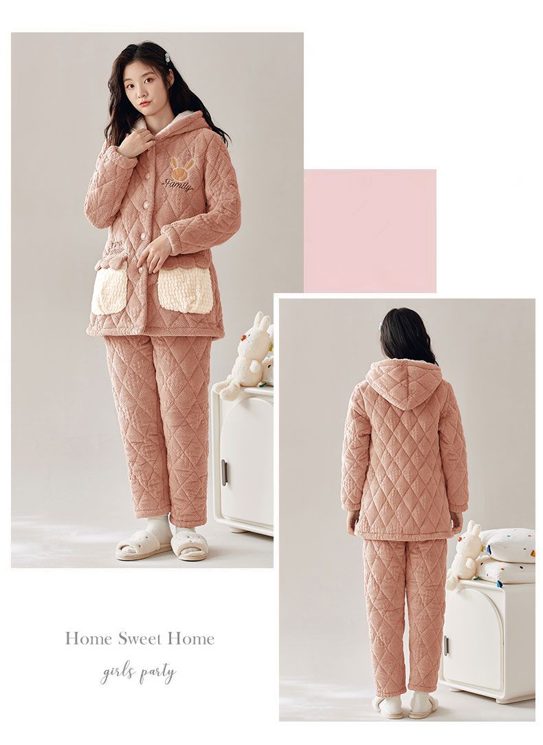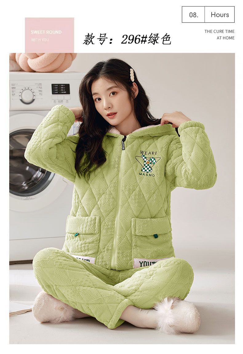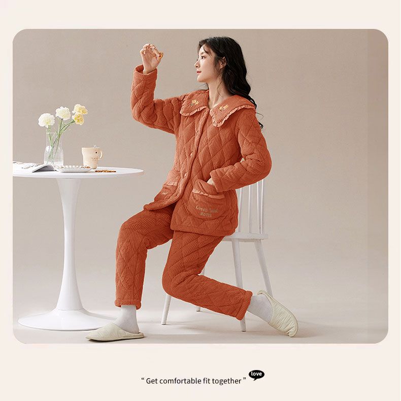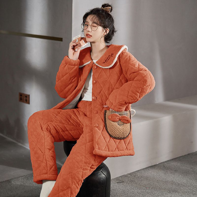 슈야 윈터 자카드 밀크 플리스 3겹 퀼팅 플리스 두툼한 여성용 보온 잠옷 세트
