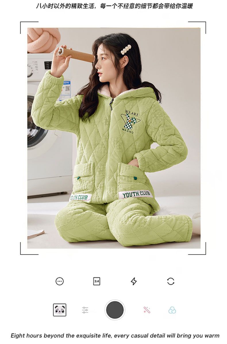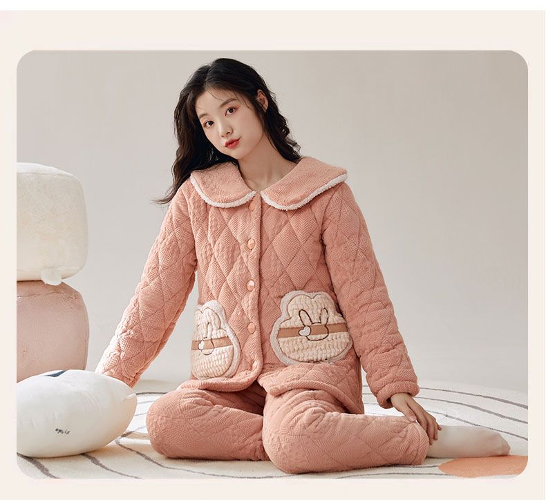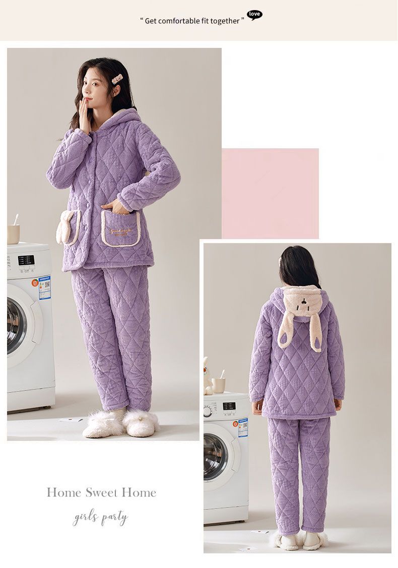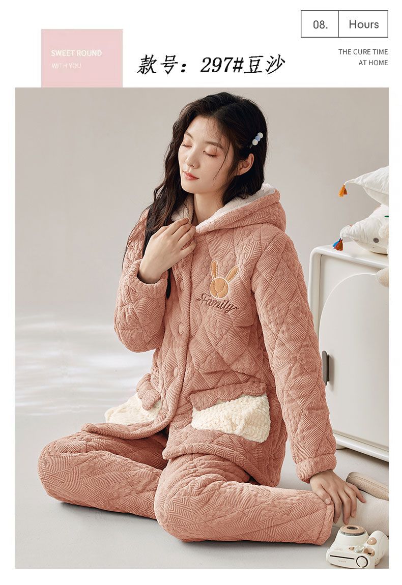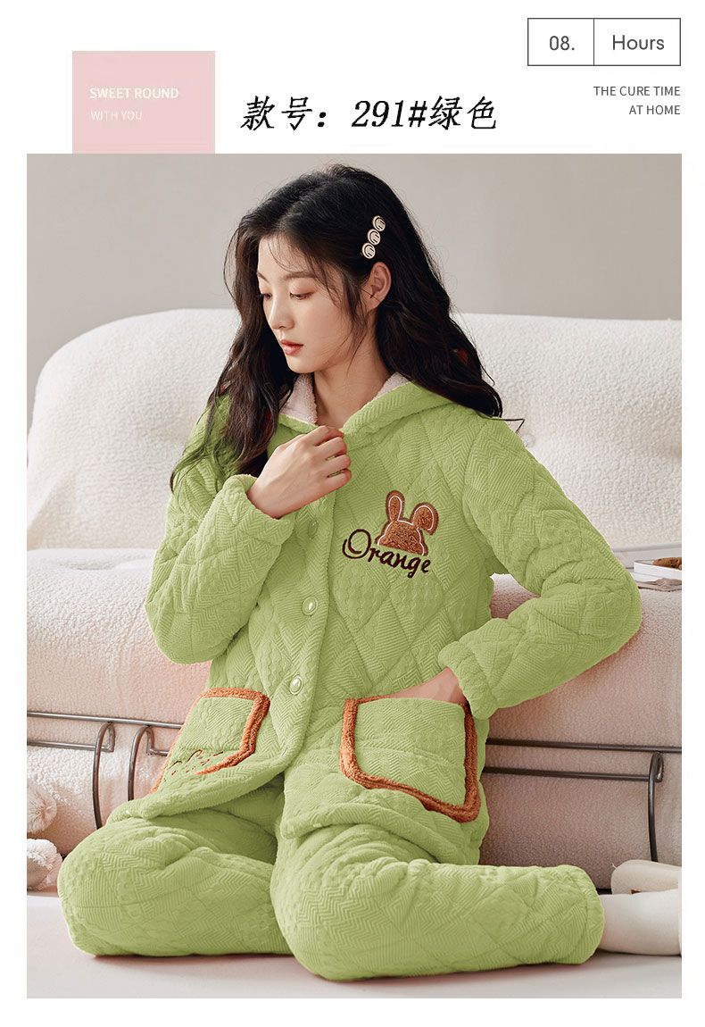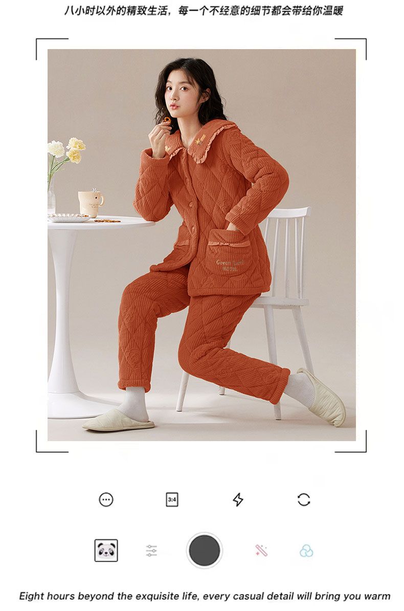 슈야 윈터 자카드 밀크 플리스 3겹 퀼팅 플리스 두툼한 여성용 보온 잠옷 세트
