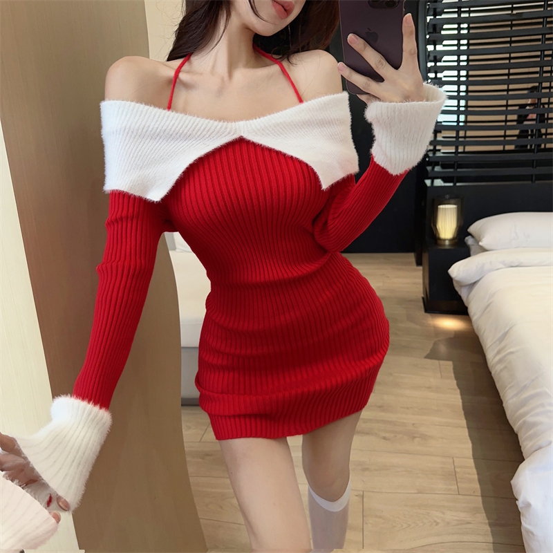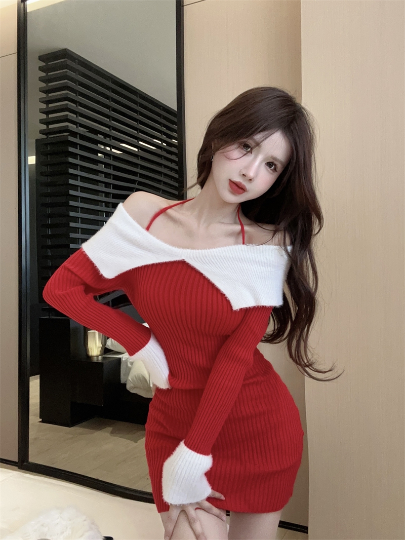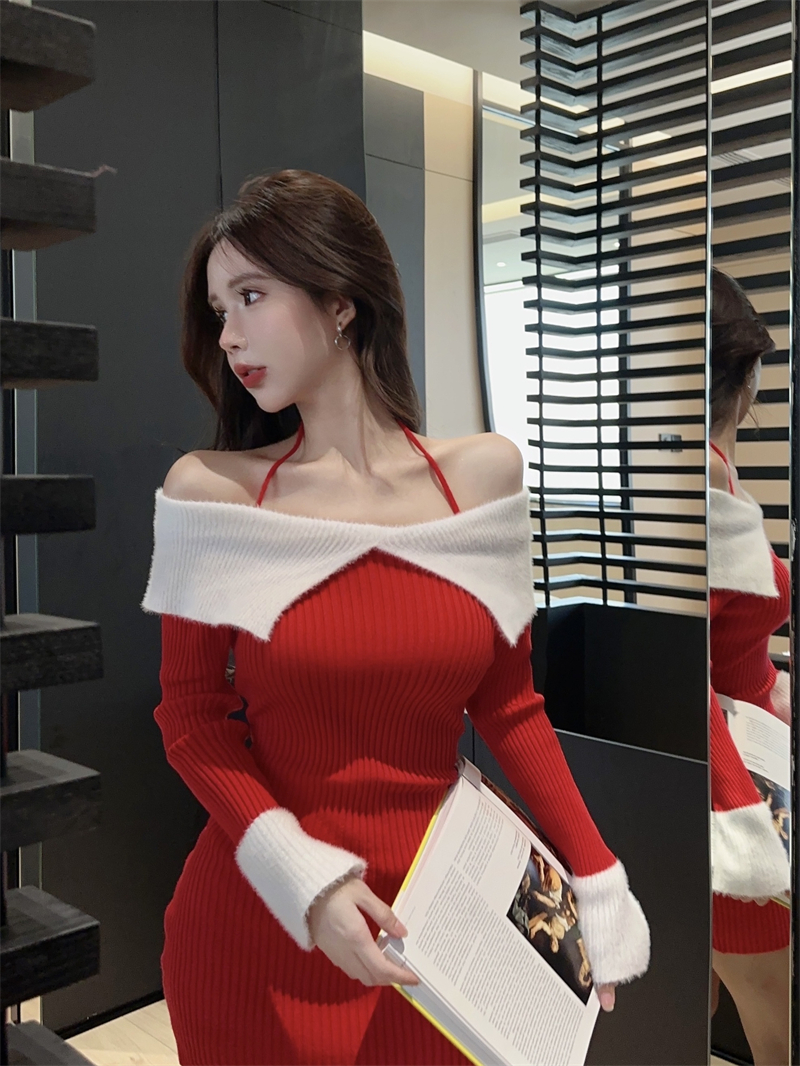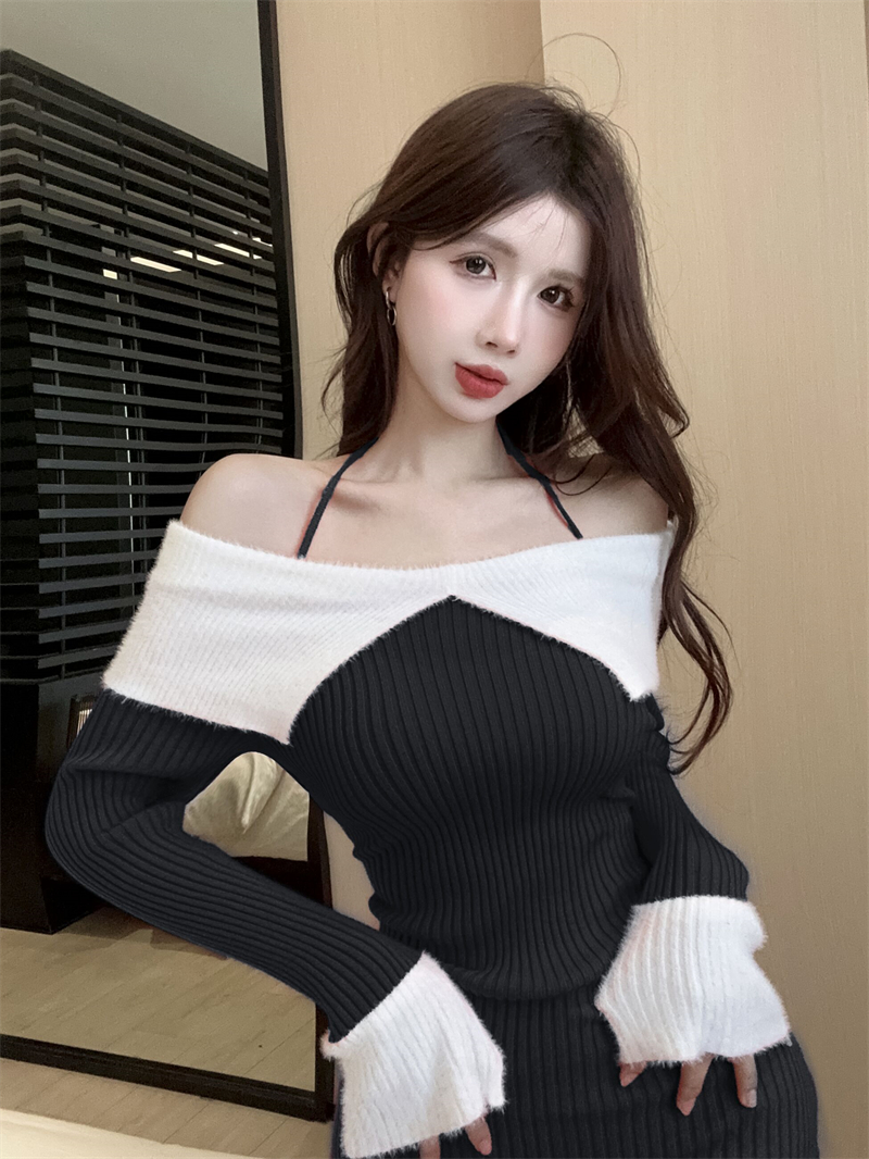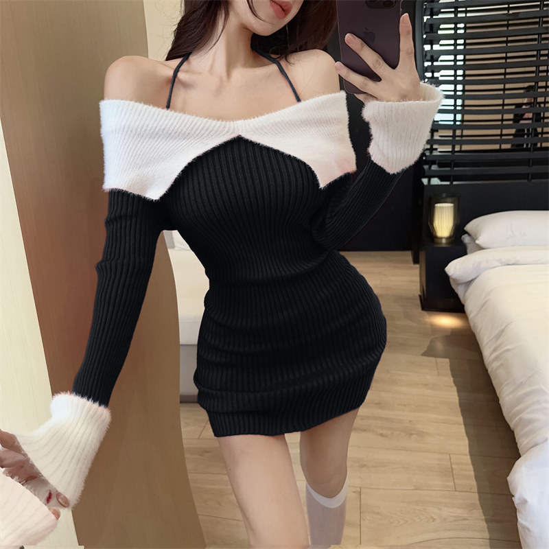 한국 스타일의 가을/겨울 오프숄더 컬러 블록 섹시 바디콘 홀터넥 슬림핏 플러터 슬리브 니트 드레스의 실제 사진입니다.