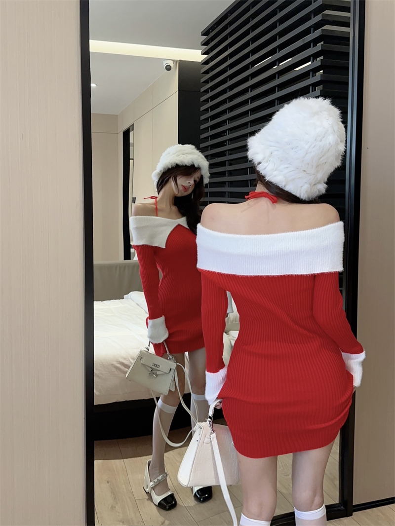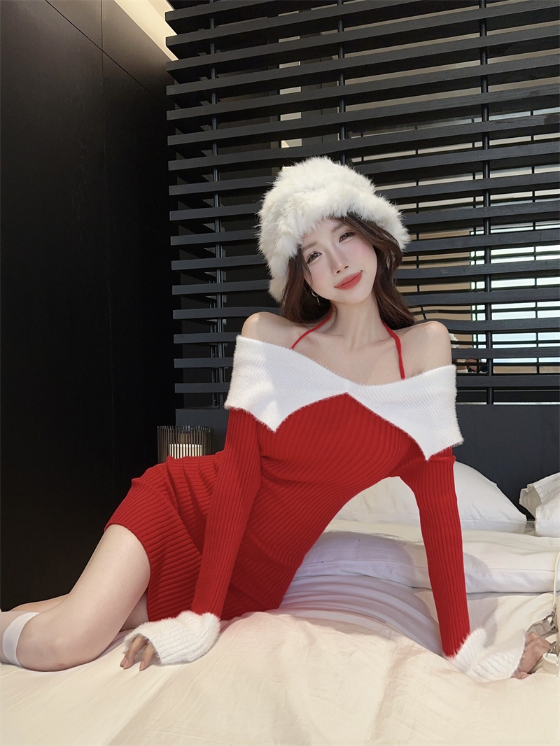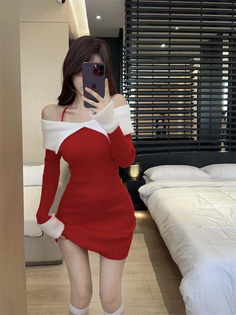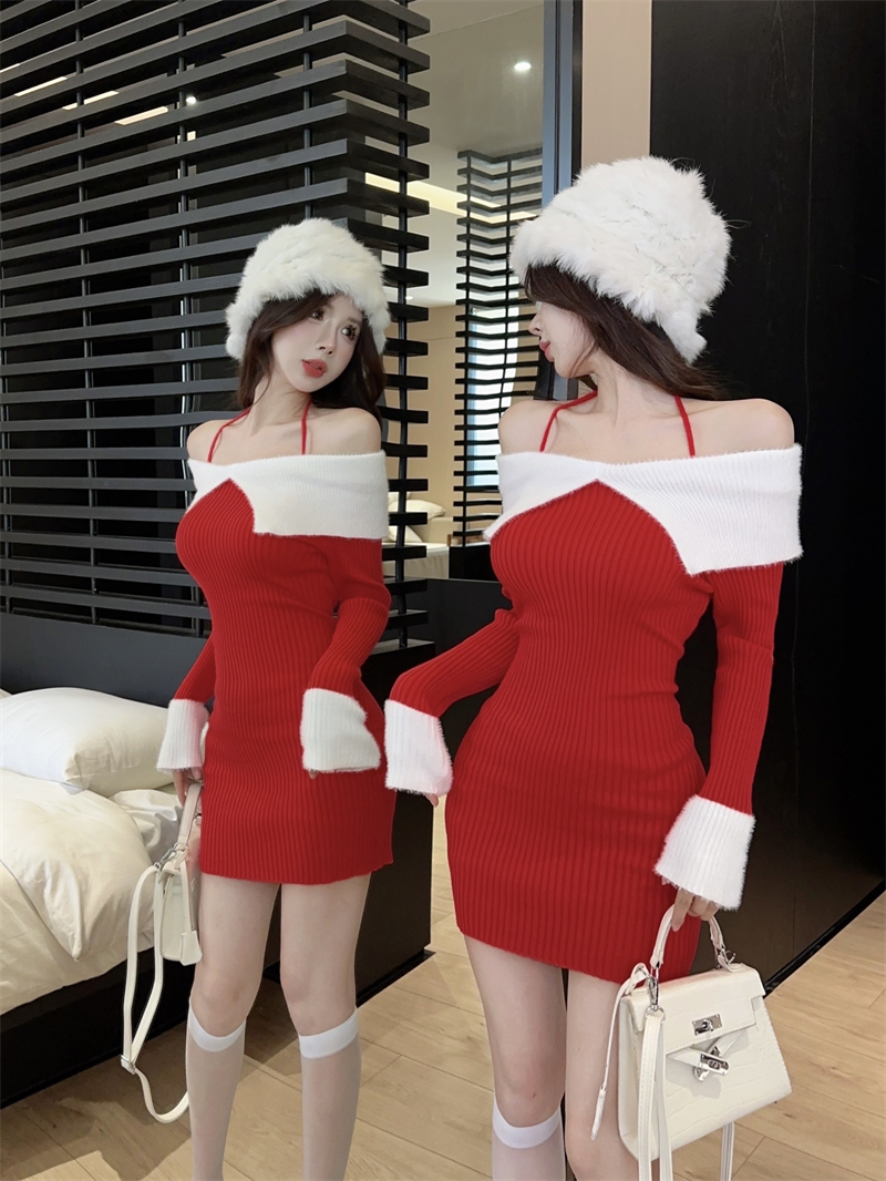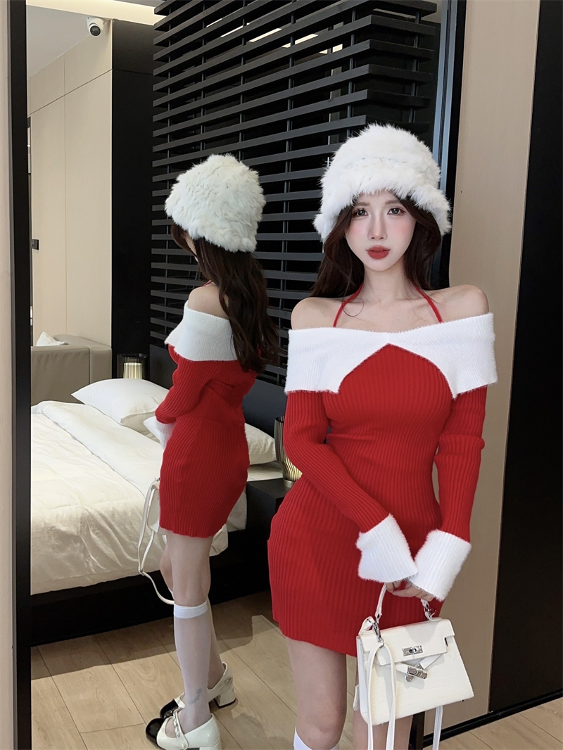 한국 스타일의 가을/겨울 오프숄더 컬러 블록 섹시 바디콘 홀터넥 슬림핏 플러터 슬리브 니트 드레스의 실제 사진입니다.