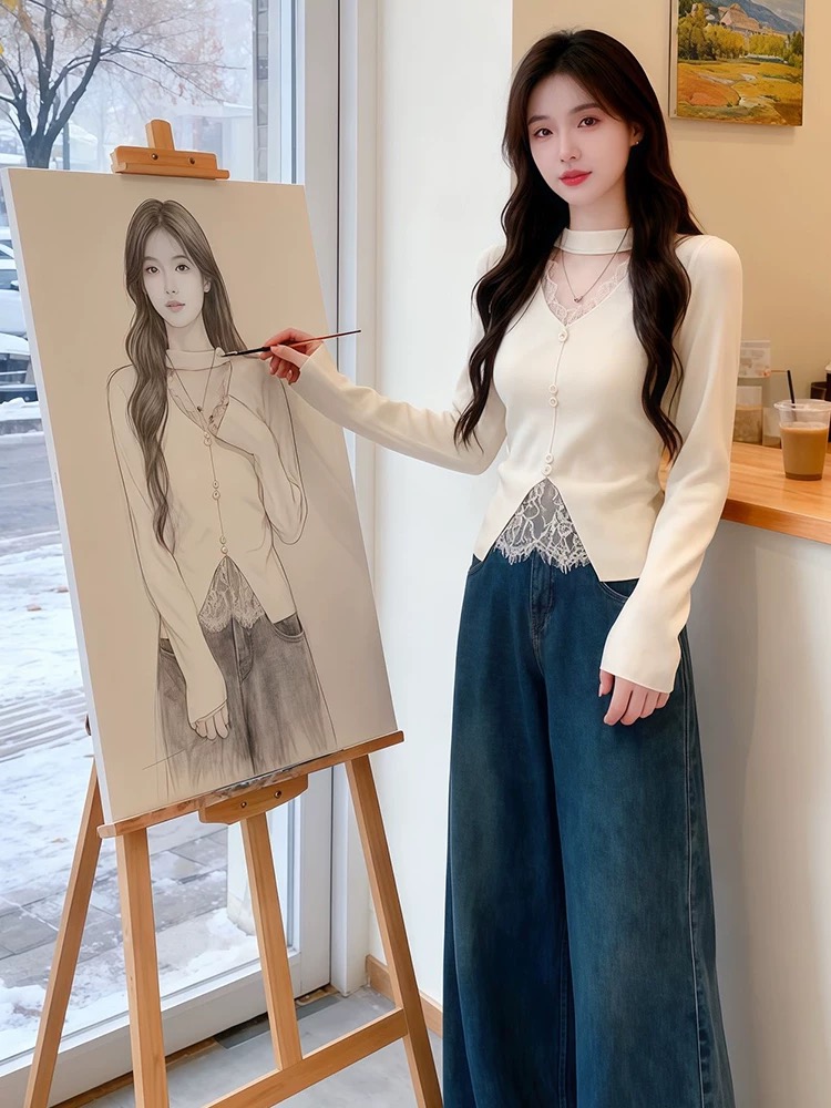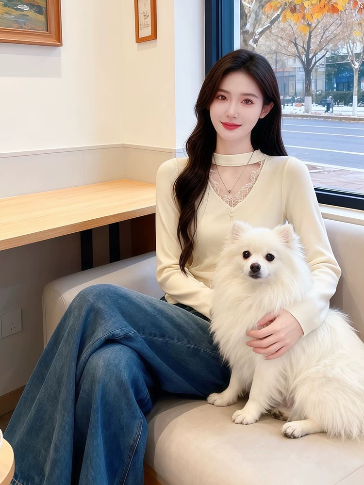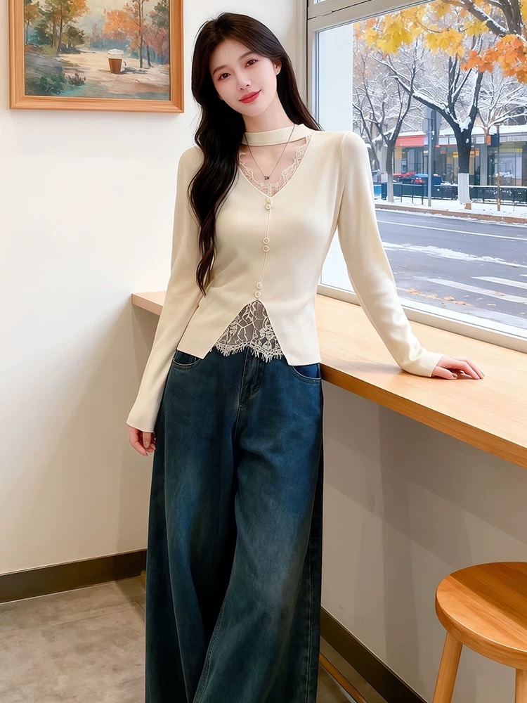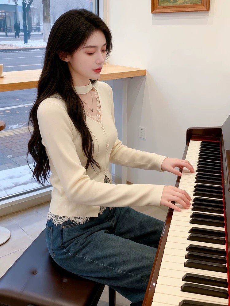 法式挂脖V领时尚毛针织衫女2025冬季新款蕾丝修身显瘦打底衫上衣