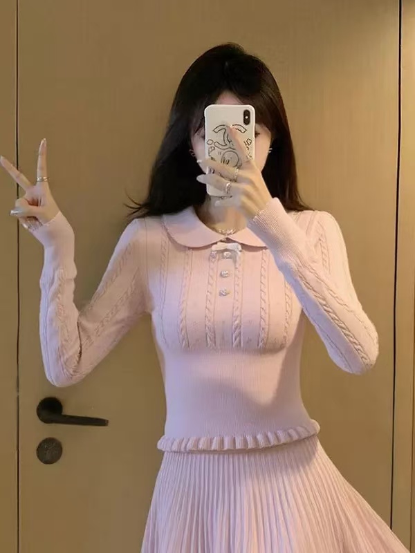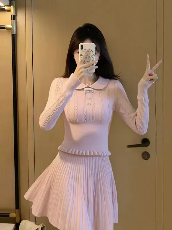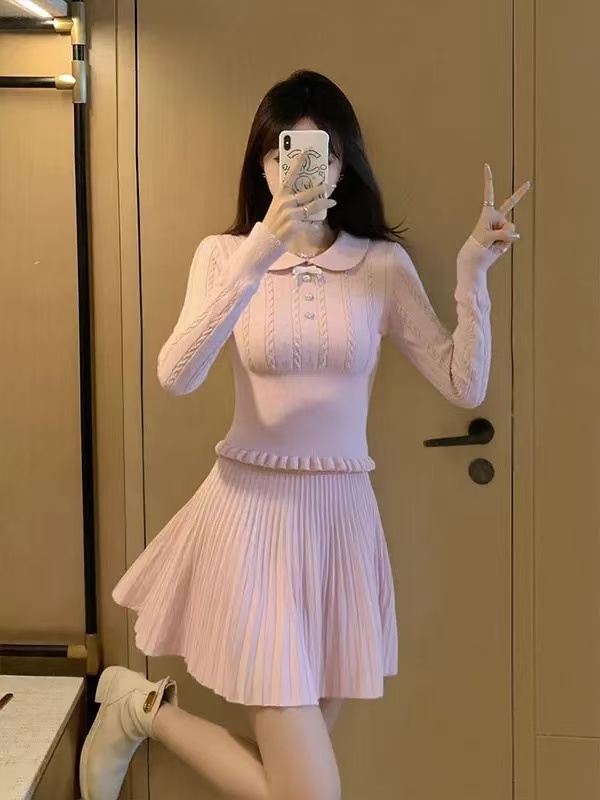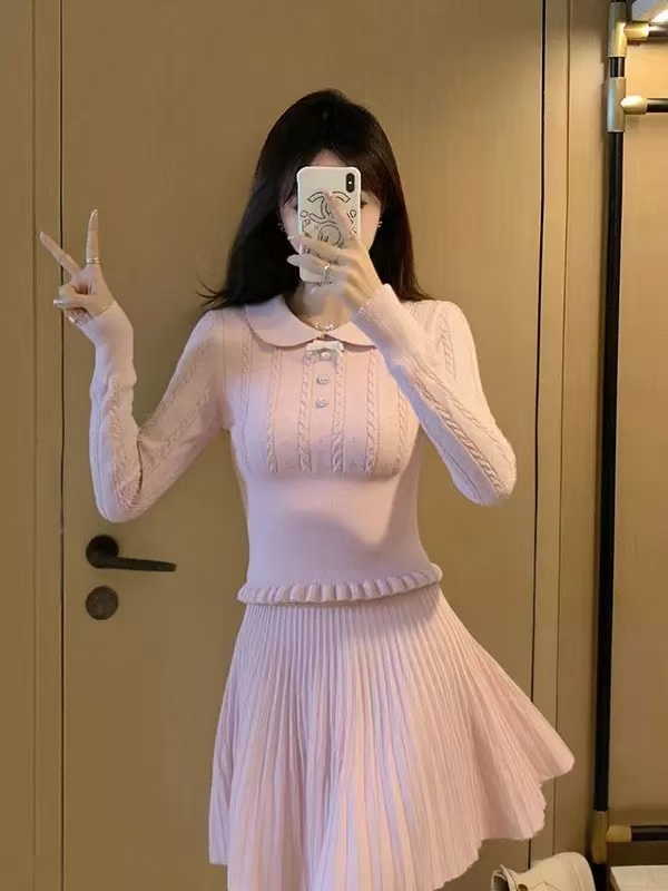 巨好看的粉色针织套装初冬小个子穿搭女2025新款上衣半身裙两件套