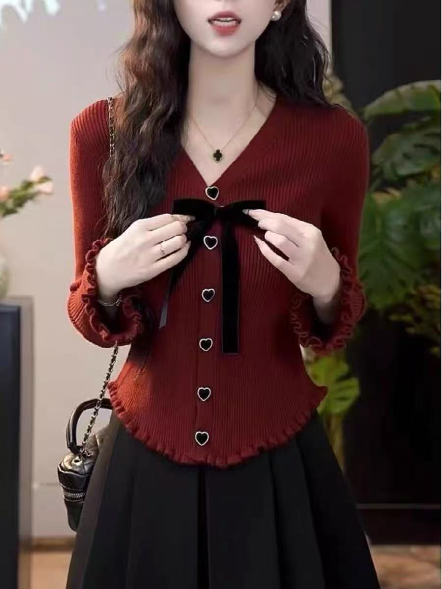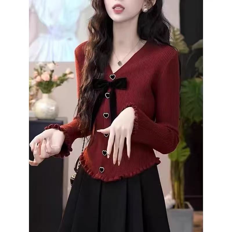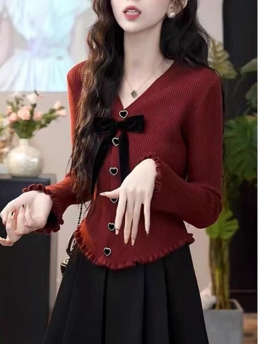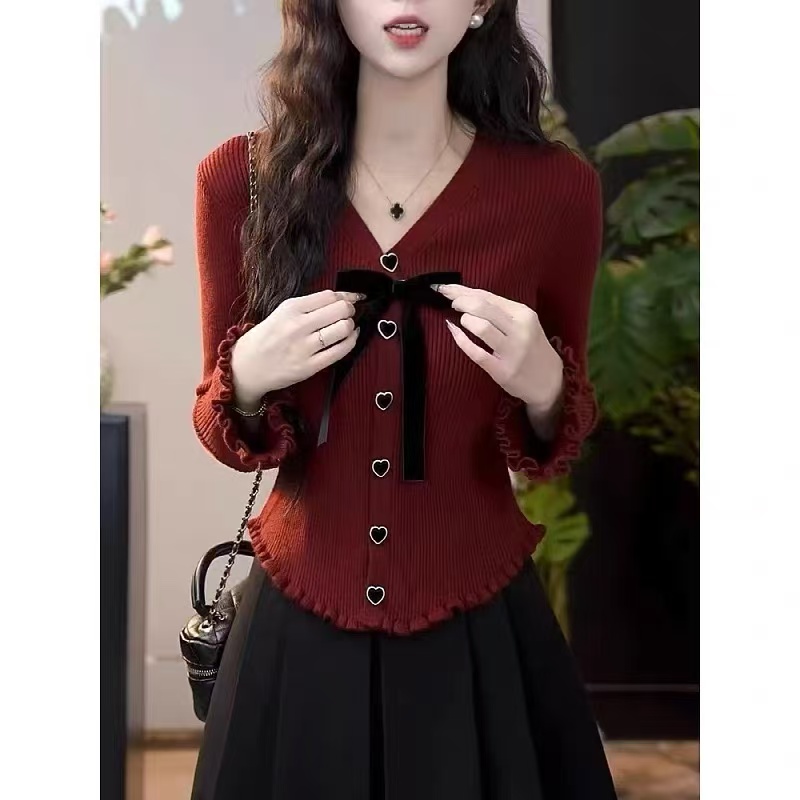圣诞节穿搭红色蝴蝶结木耳边毛衣女秋冬季修身内搭针织打底衫上衣