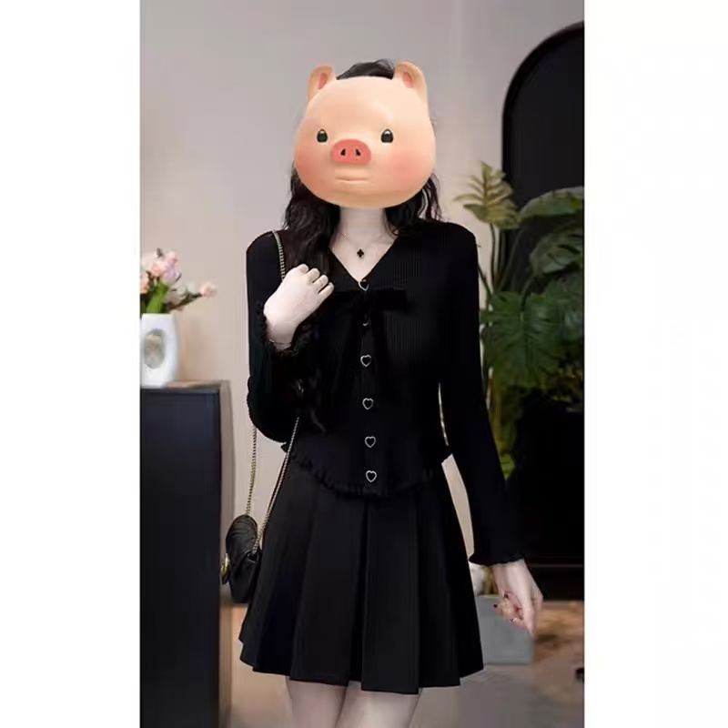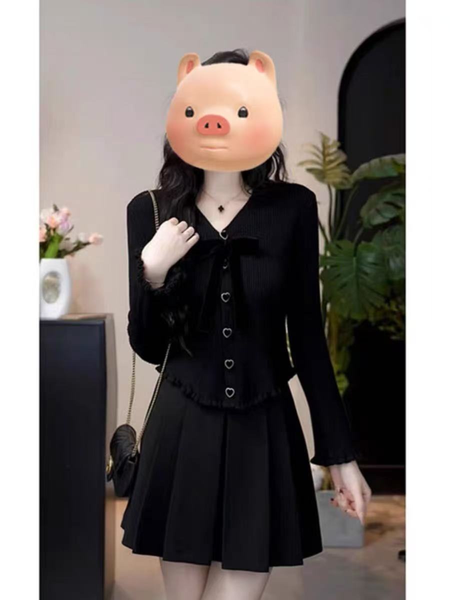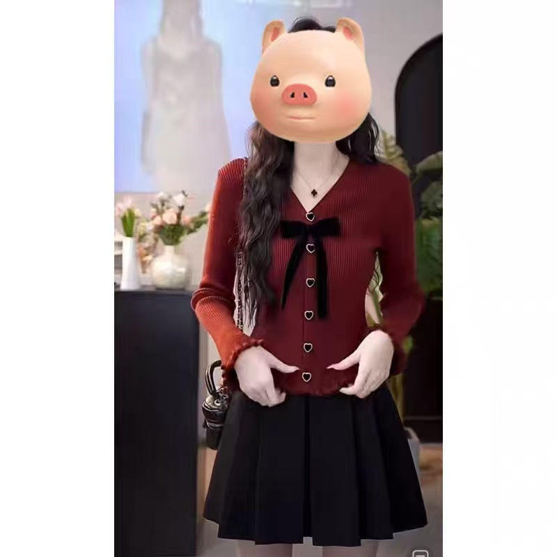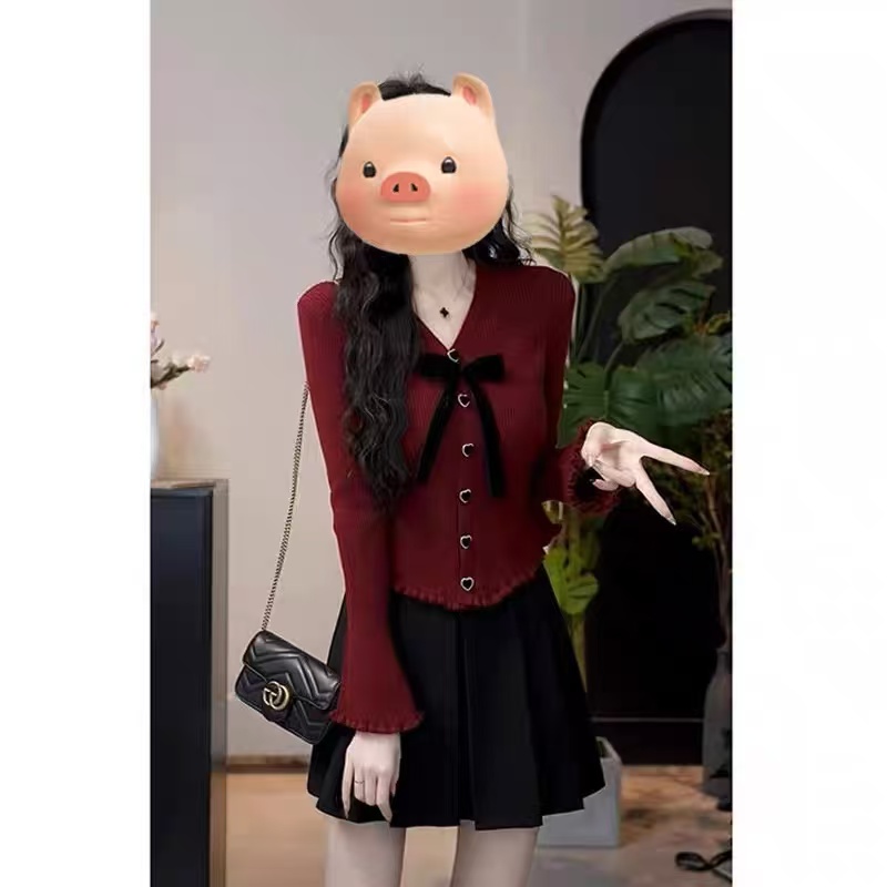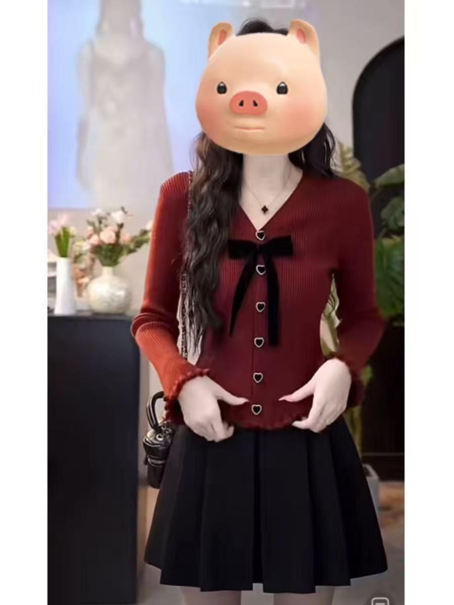 圣诞节穿搭红色蝴蝶结木耳边毛衣女秋冬季修身内搭针织打底衫上衣