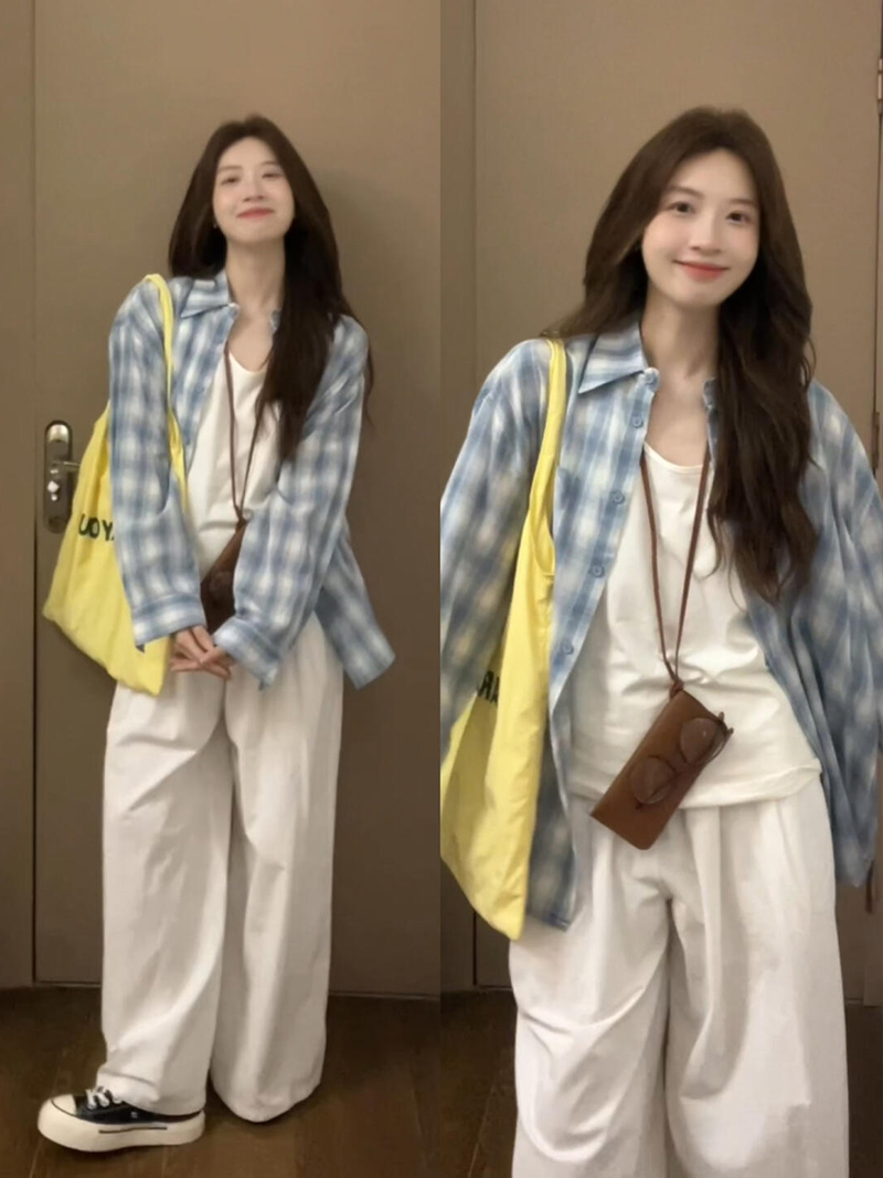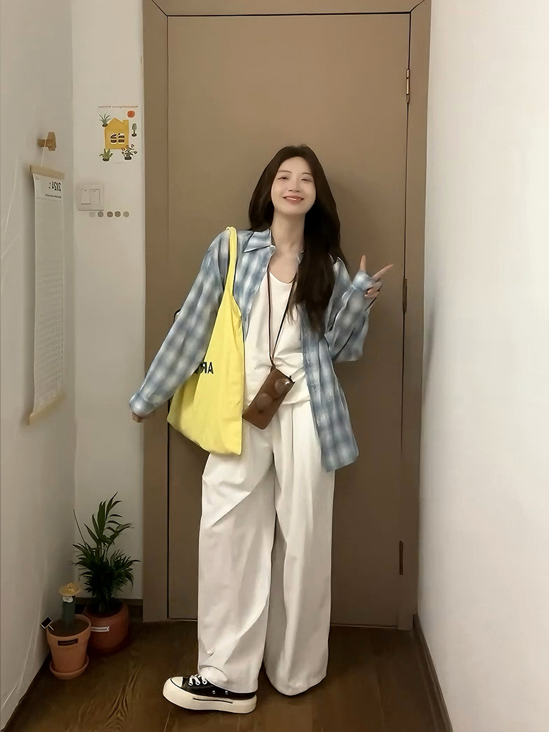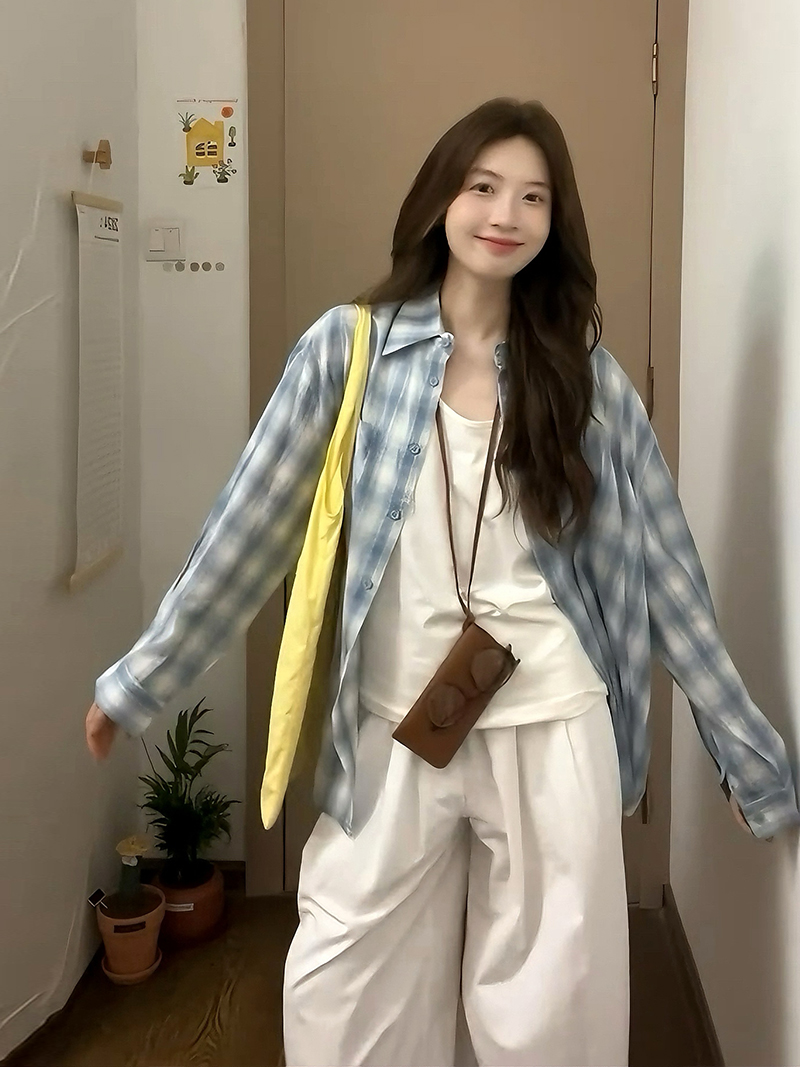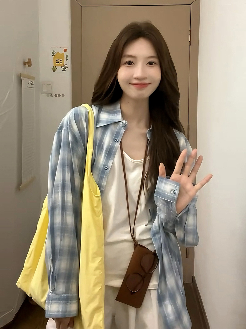 港风早春秋季内搭背心休闲宽松百搭长袖格纹衬衫上衣两件套