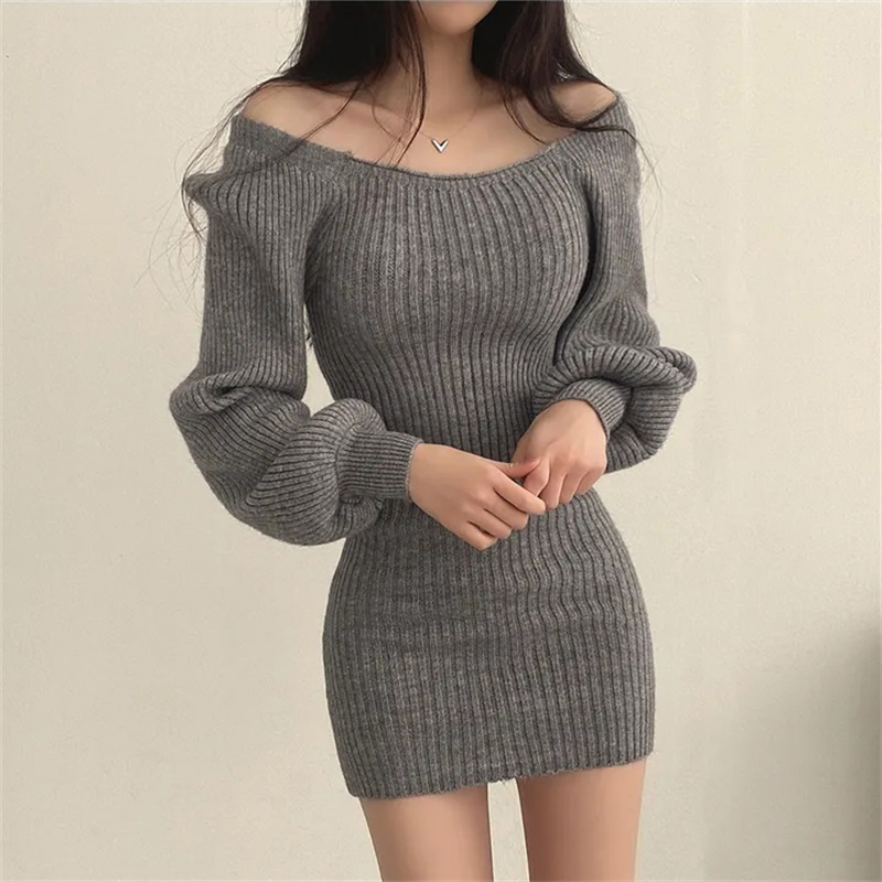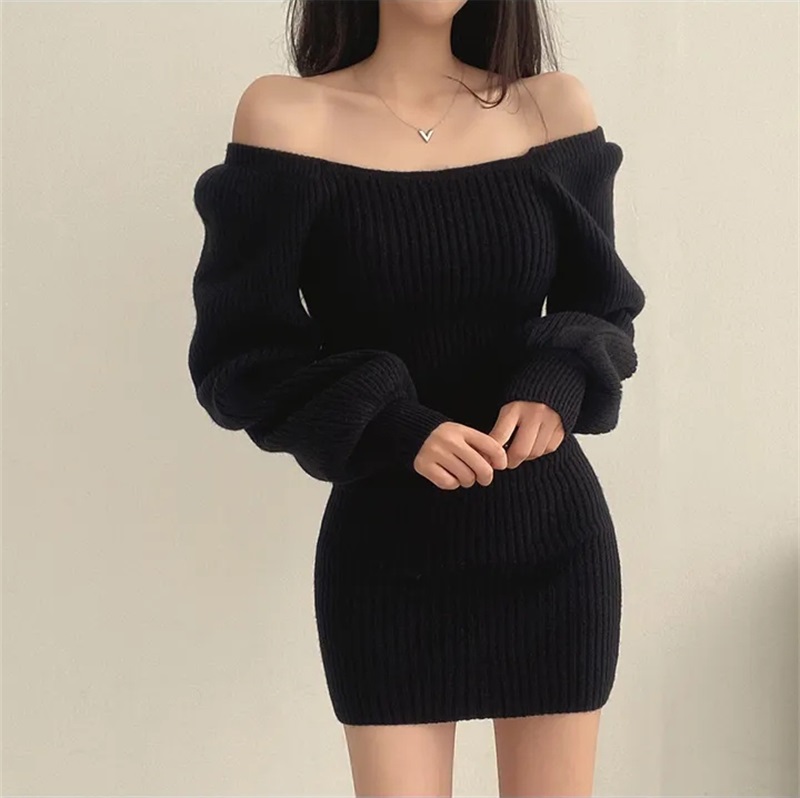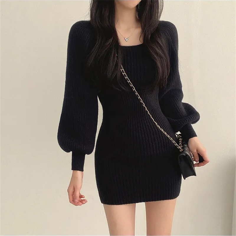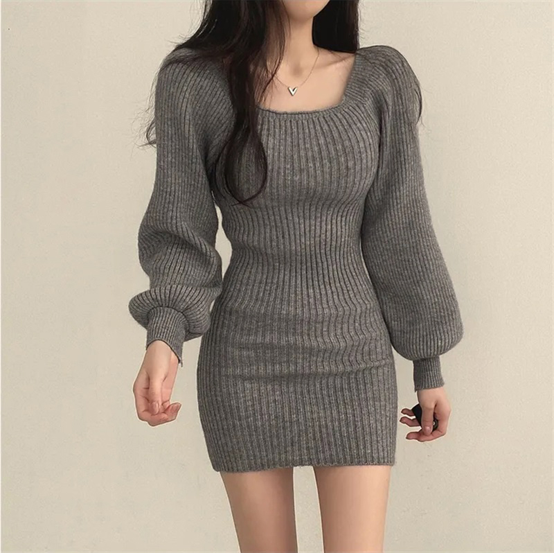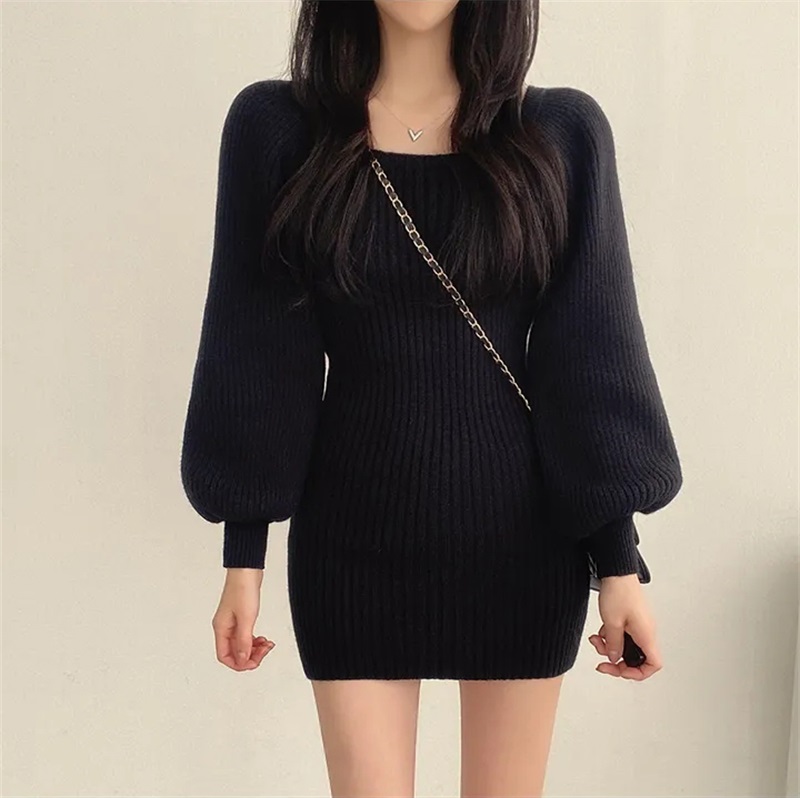 한국 스타일의 스퀘어넥 퍼프소매 넥라인, 섹시한 슬림 웨이스트 스웨터 드레스. 행사 전후 U자형 데이트에 적합합니다.
