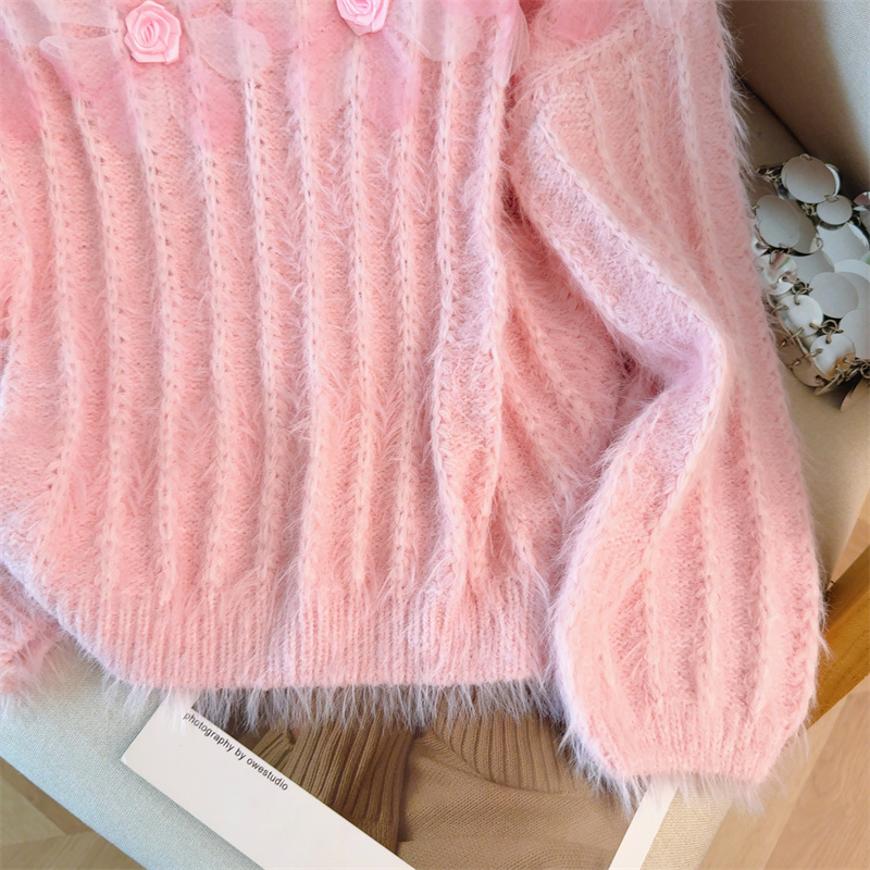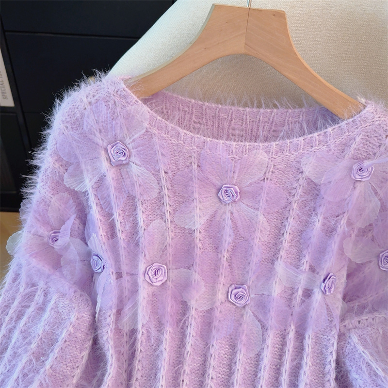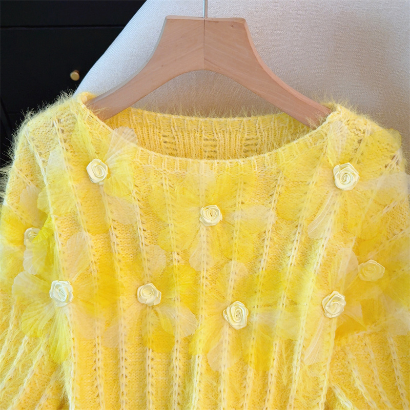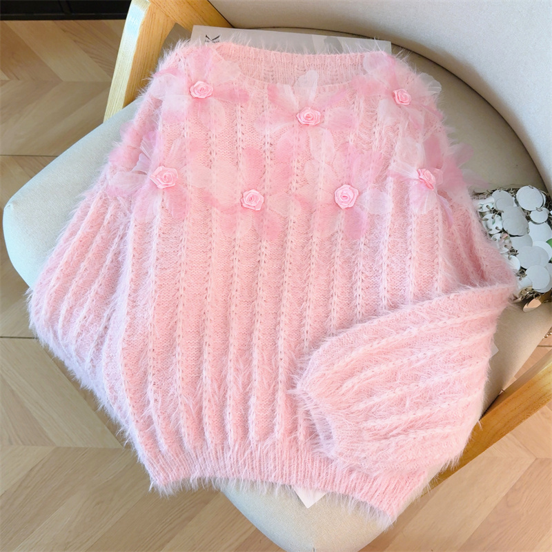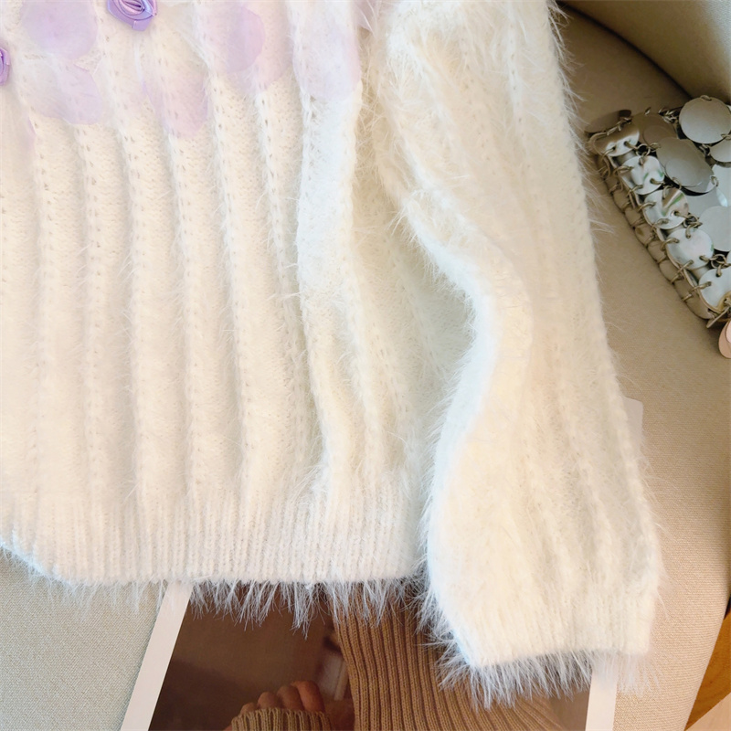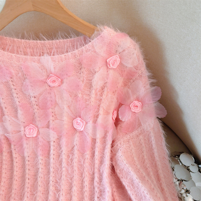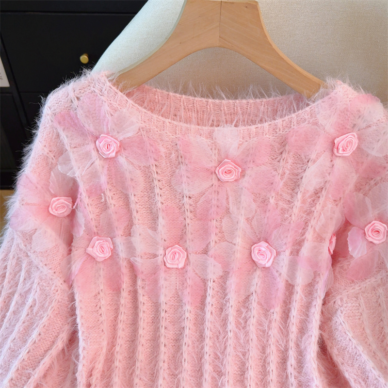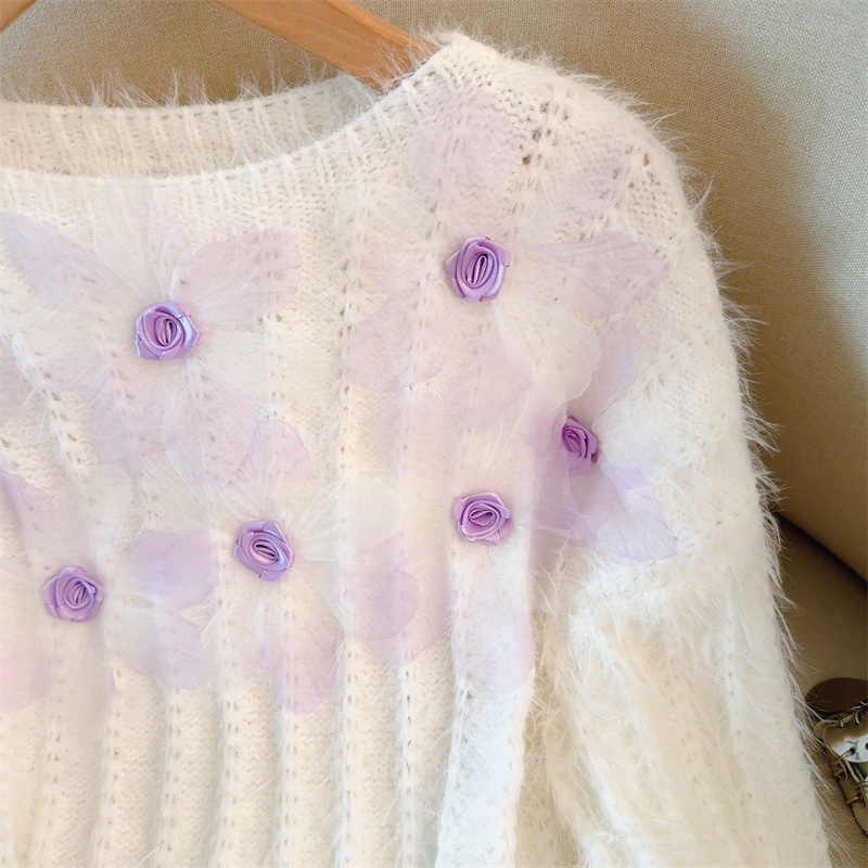 法式甜美重工钉珠花朵毛针织衫女2025年秋装新款宽松勾花镂空毛衣